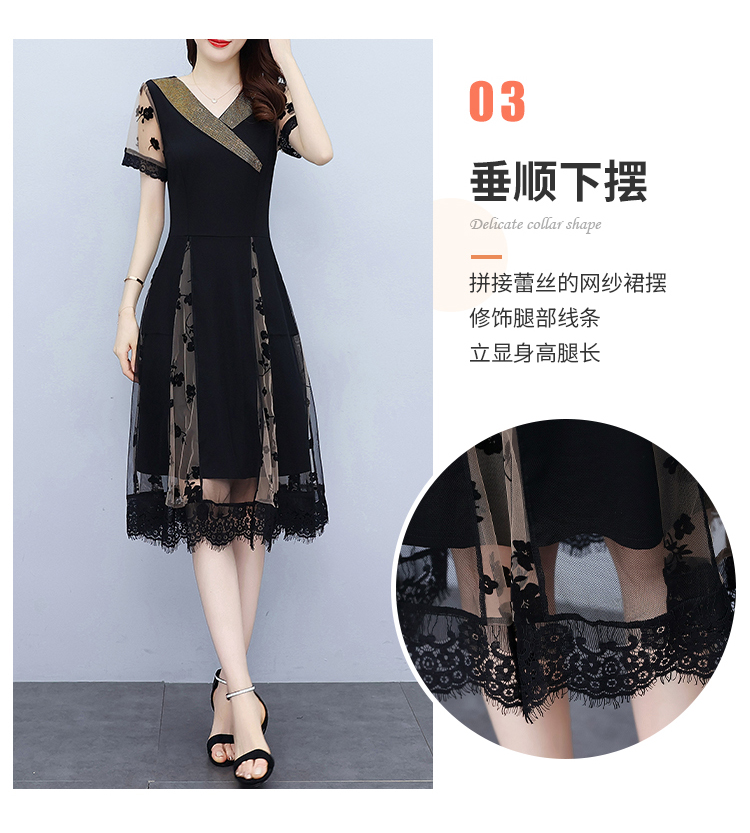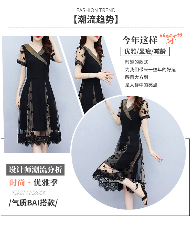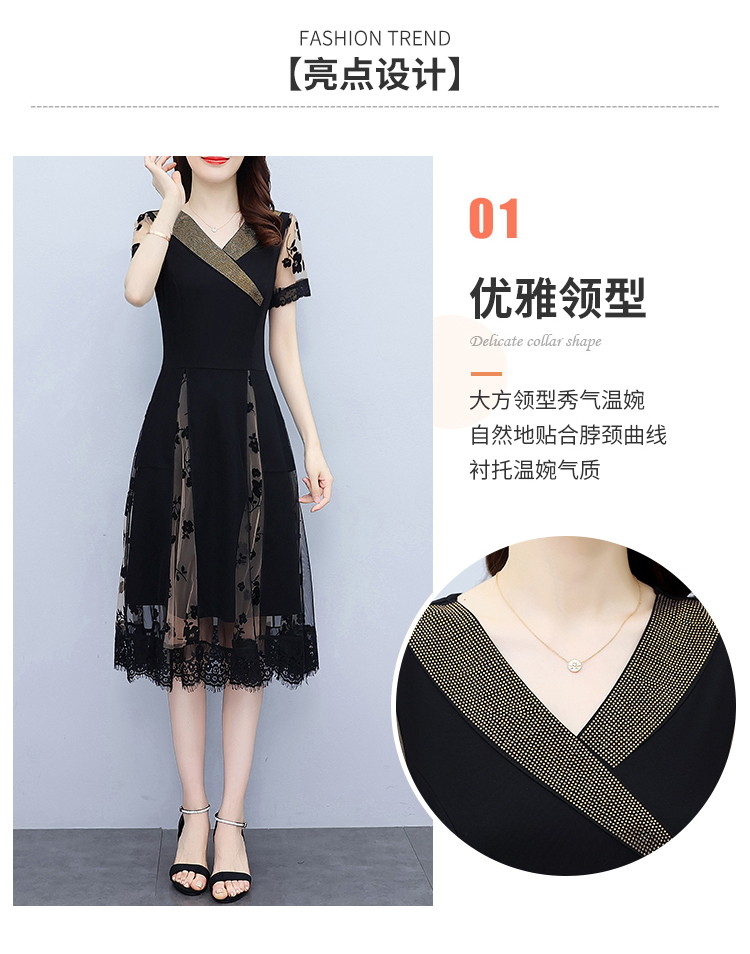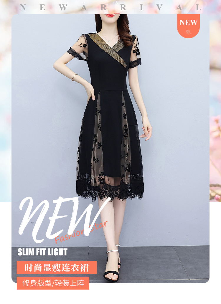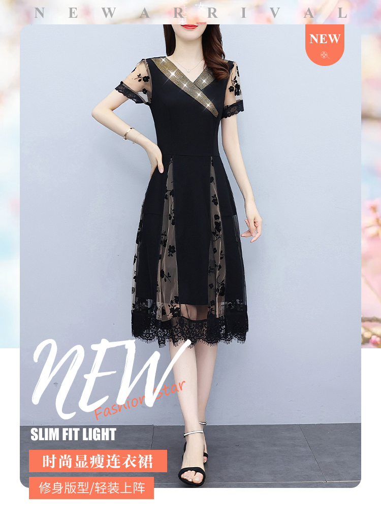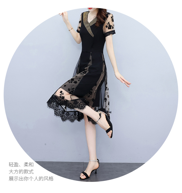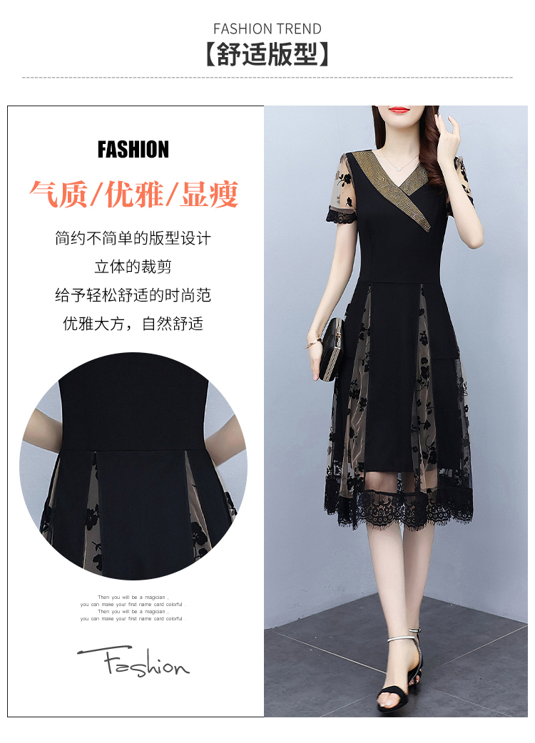 RY2372# 2026年夏装新款连衣裙大码收腰显瘦气质西装领网纱拼接大摆长裙