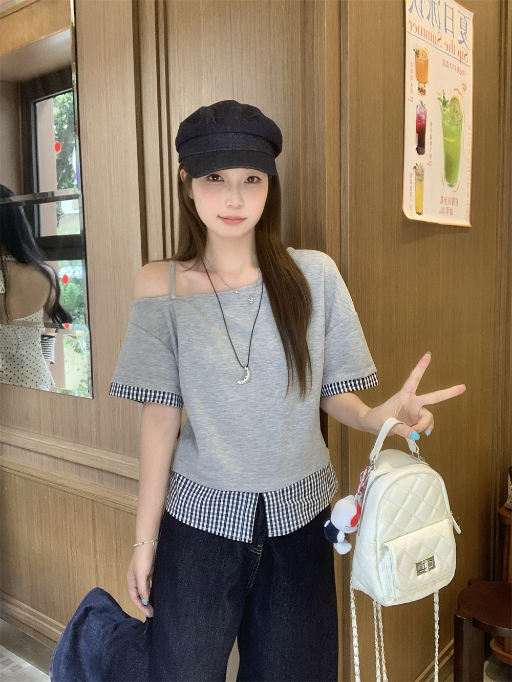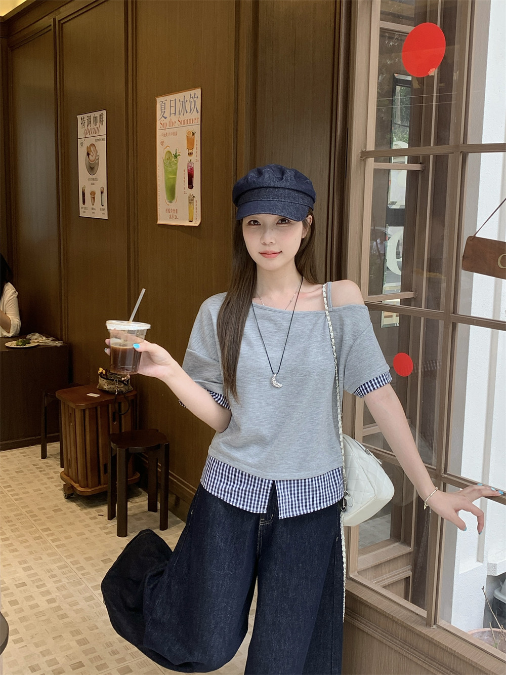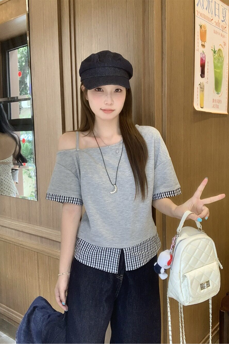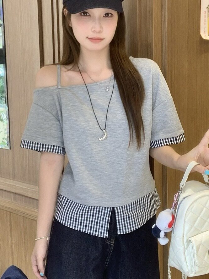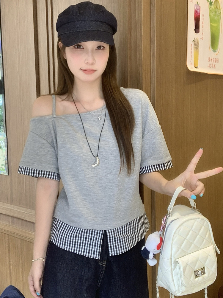 RY2375# 女装新款胖mm法式复古一字肩短袖T恤女夏格子拼接露肩上衣潮