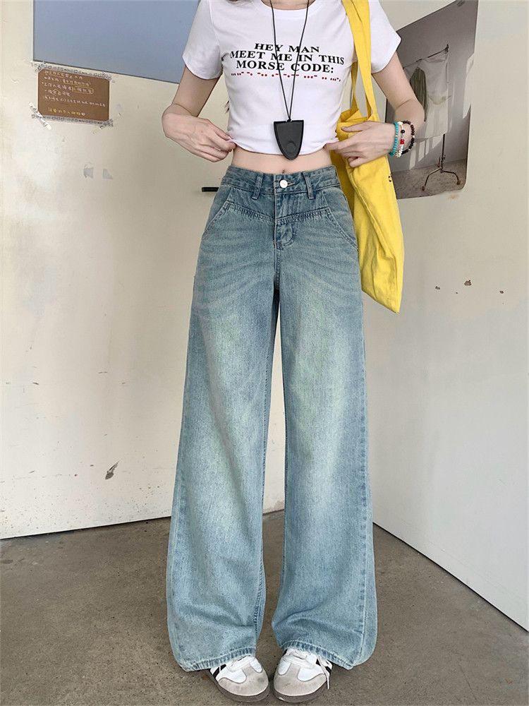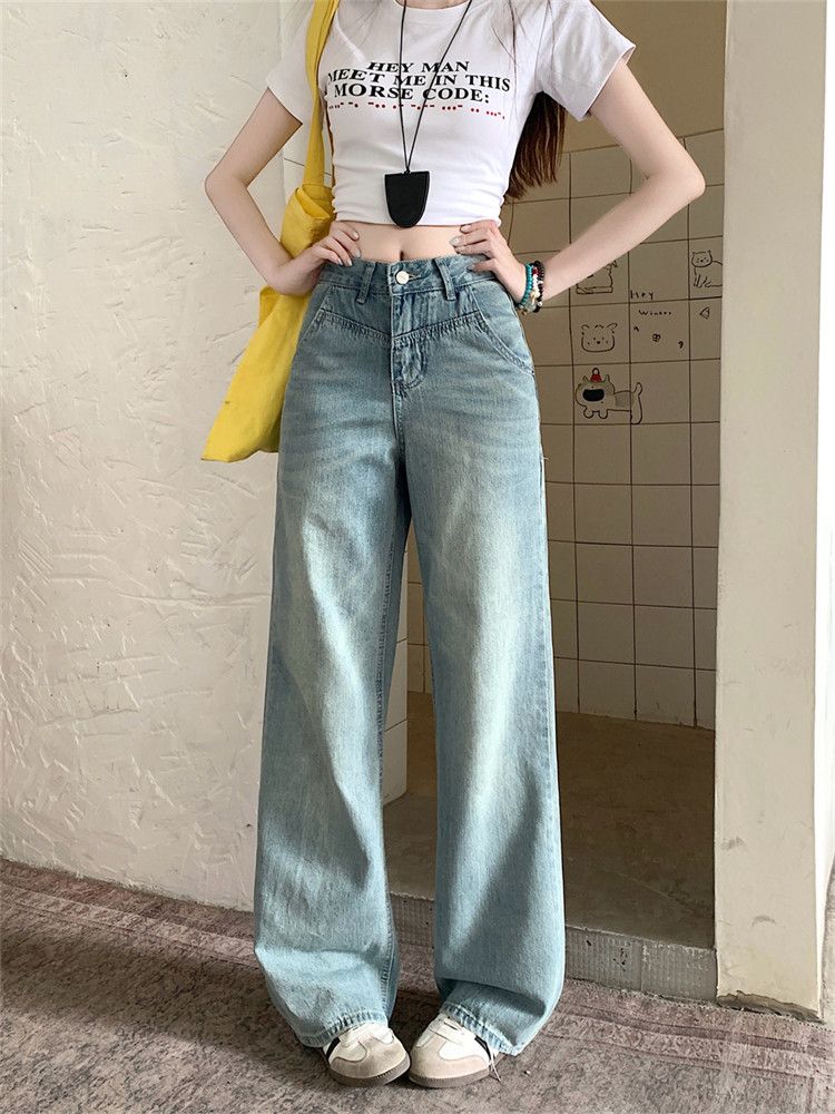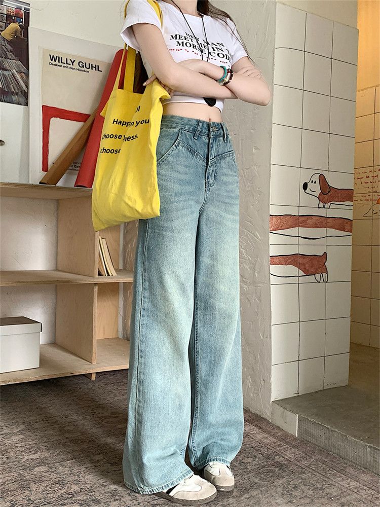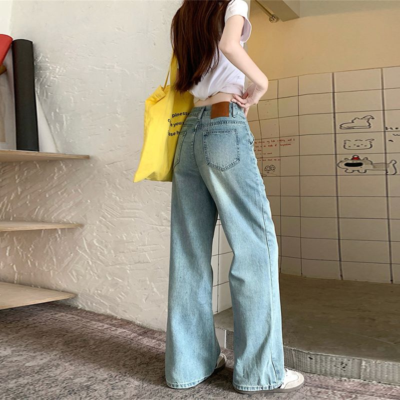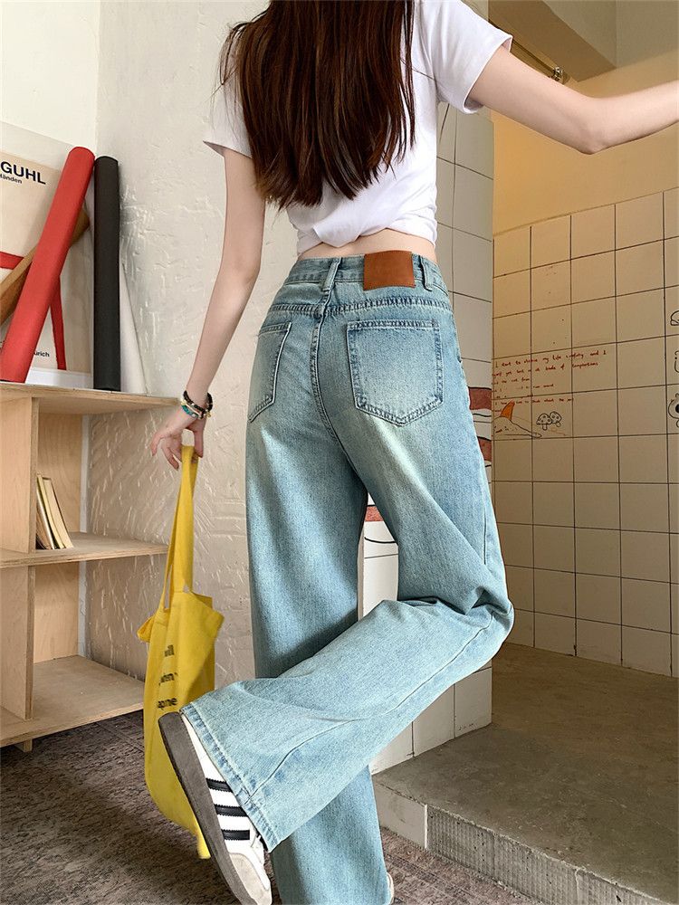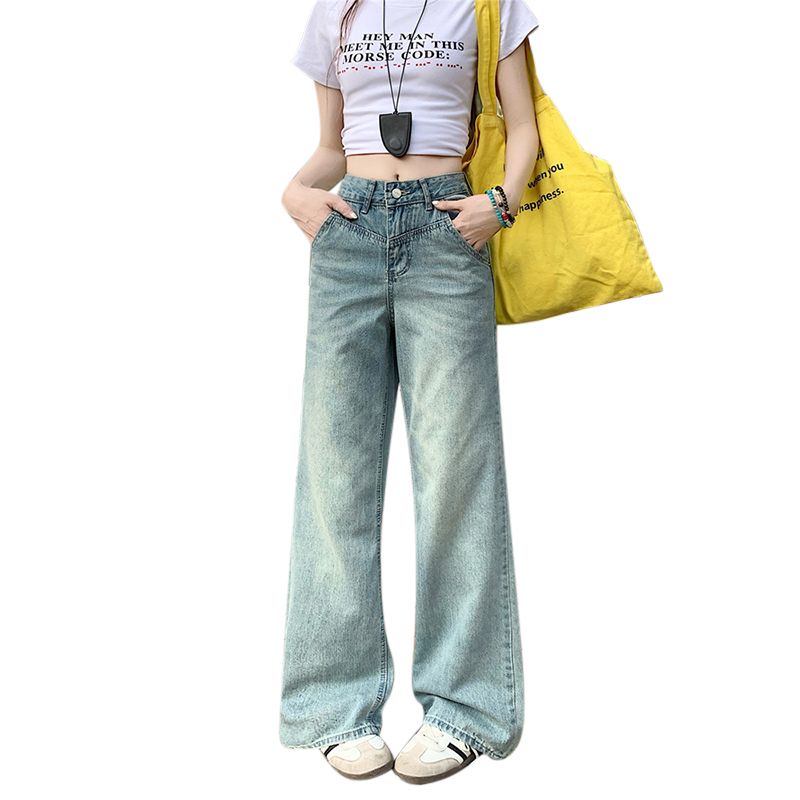 RY2378# 春夏新款浅色胖mm高级感宽松大码牛仔裤女高腰显瘦直筒阔腿拖地裤