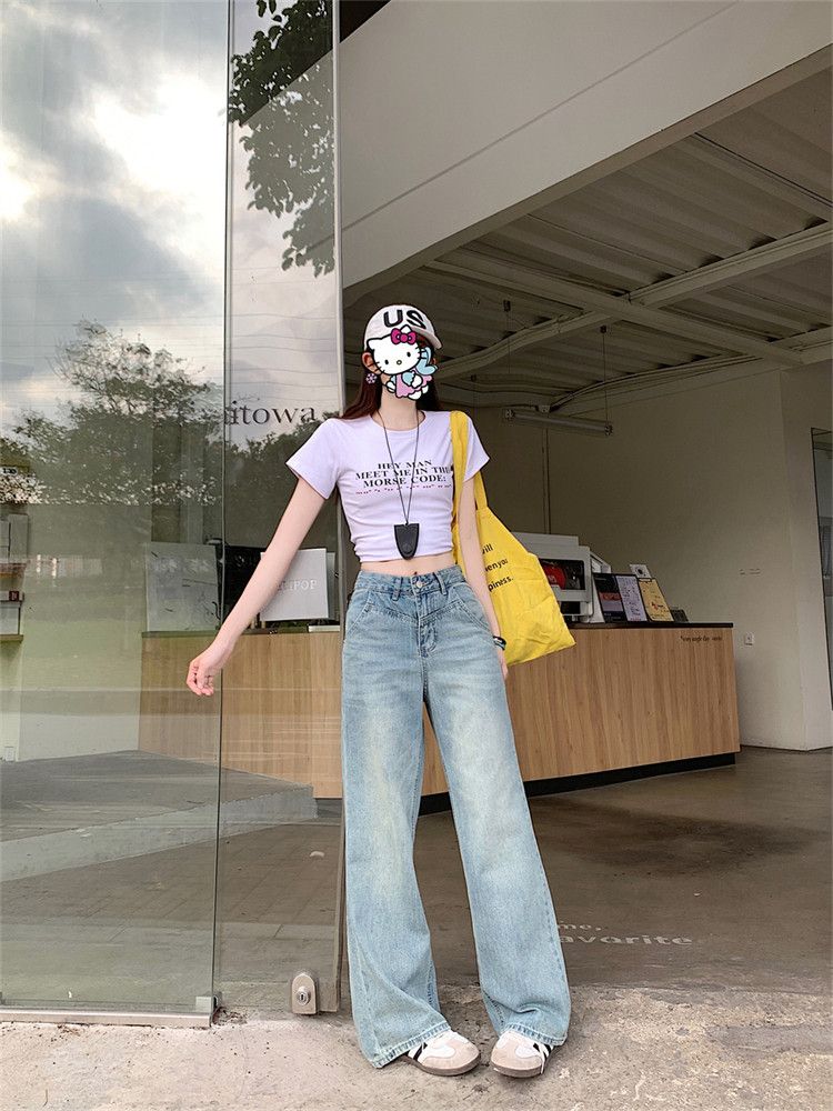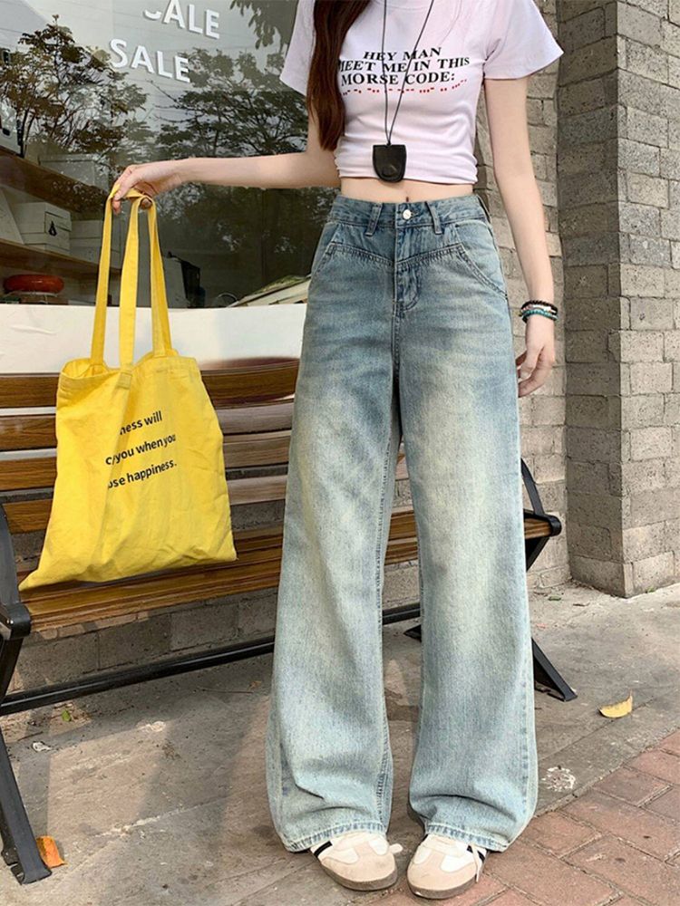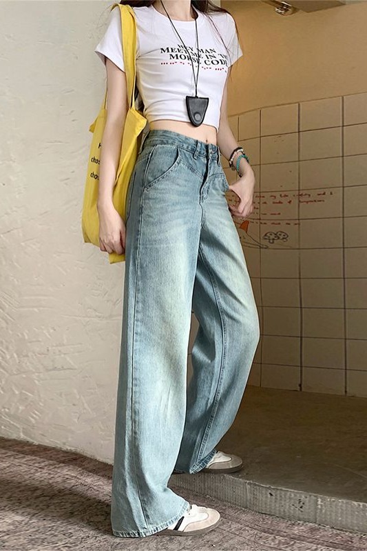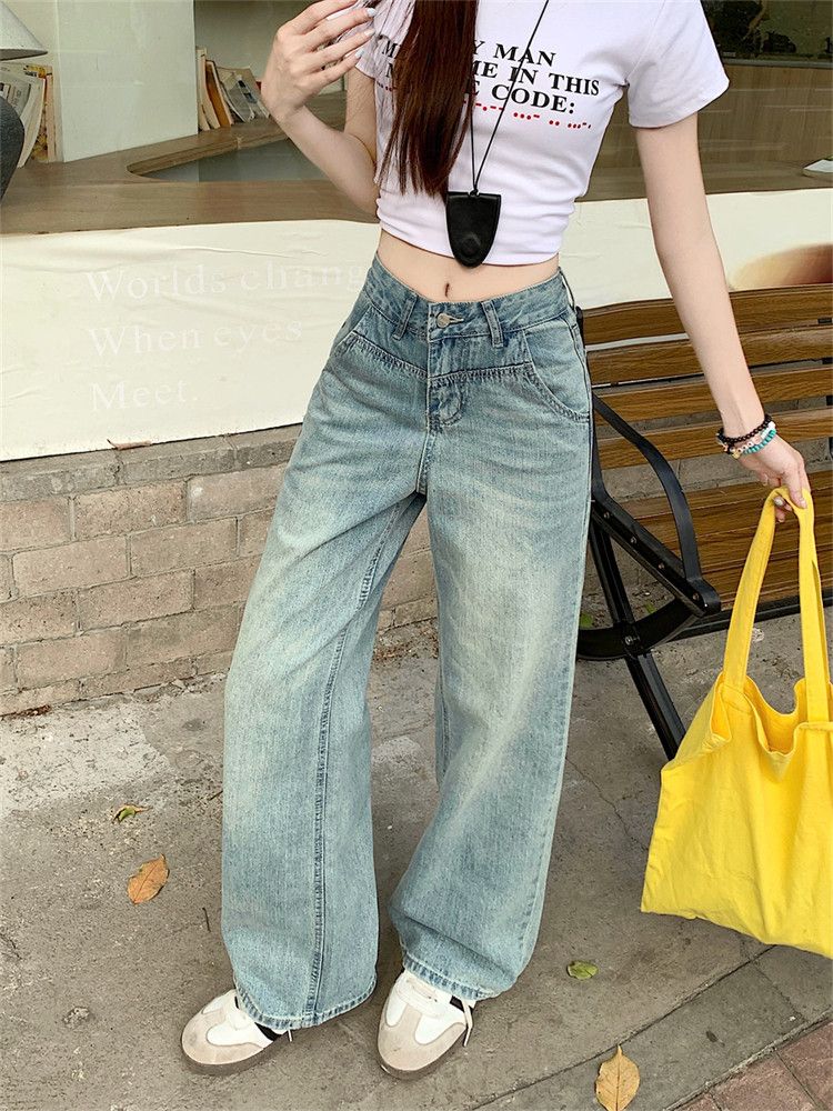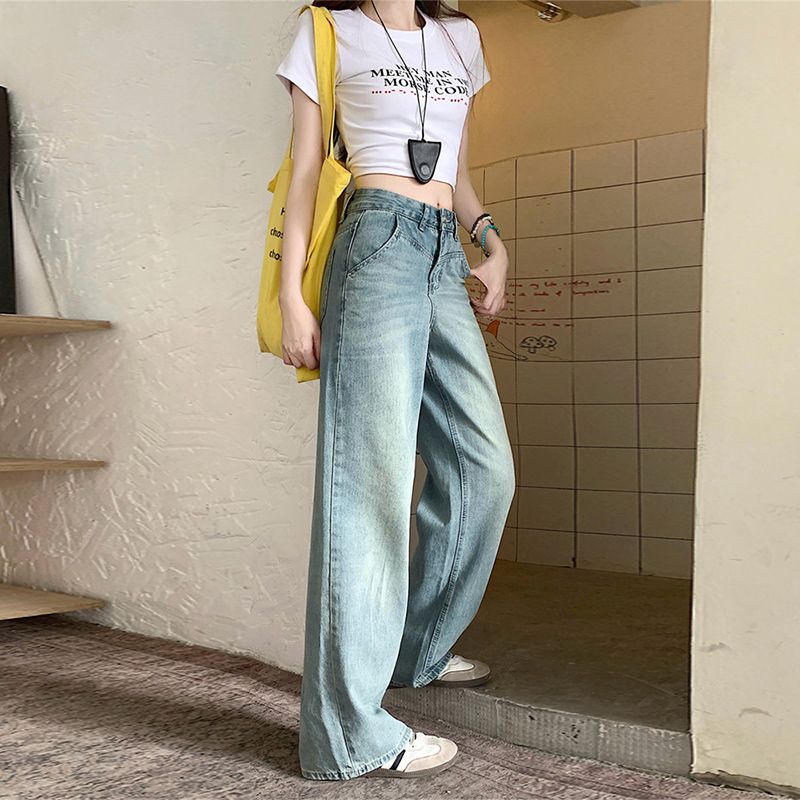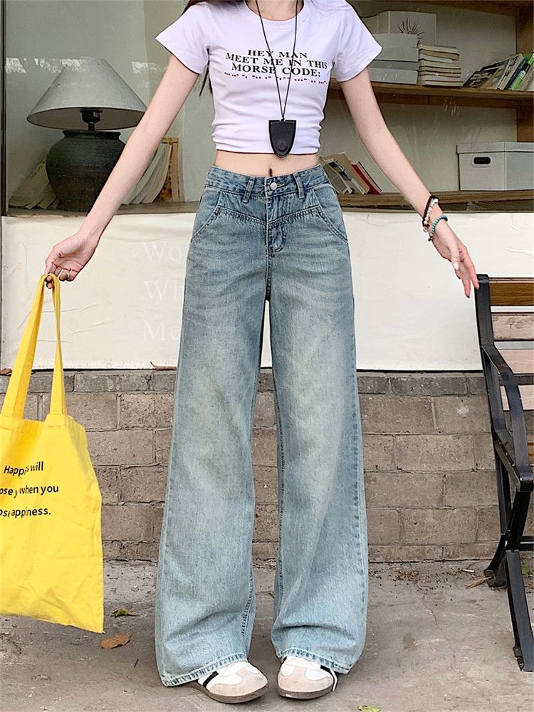 RY2378# 春夏新款浅色胖mm高级感宽松大码牛仔裤女高腰显瘦直筒阔腿拖地裤
