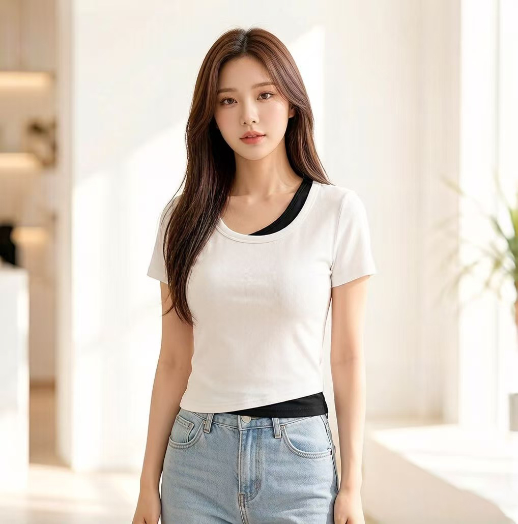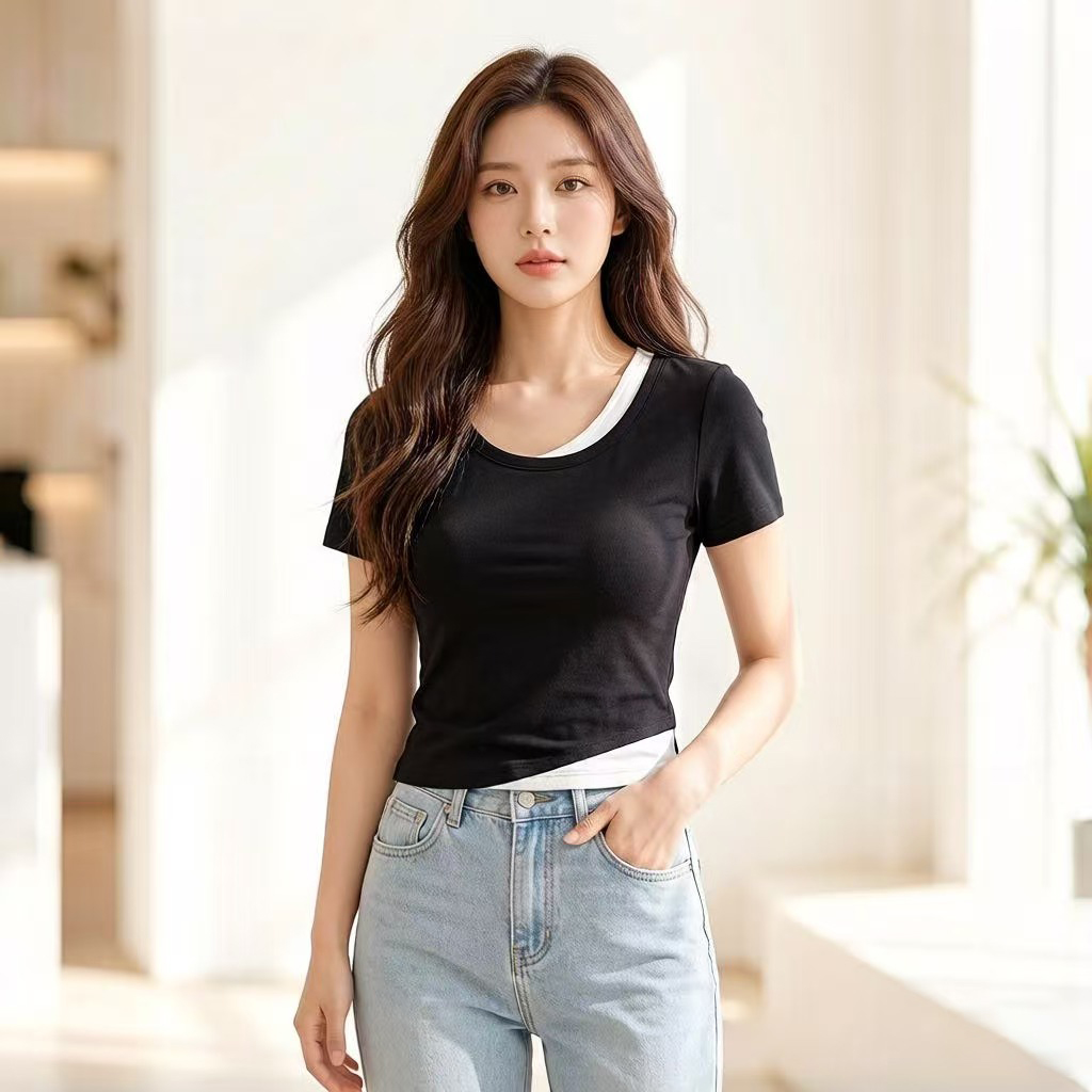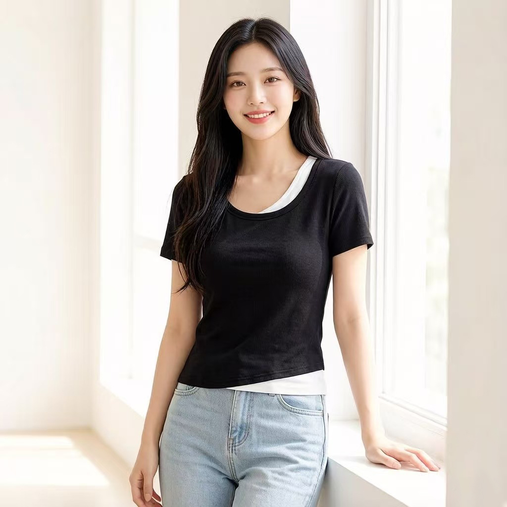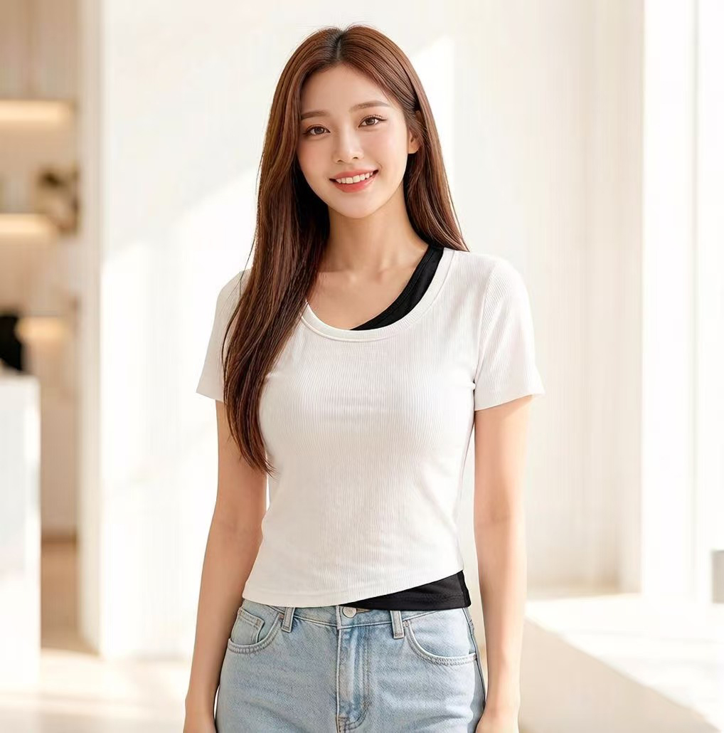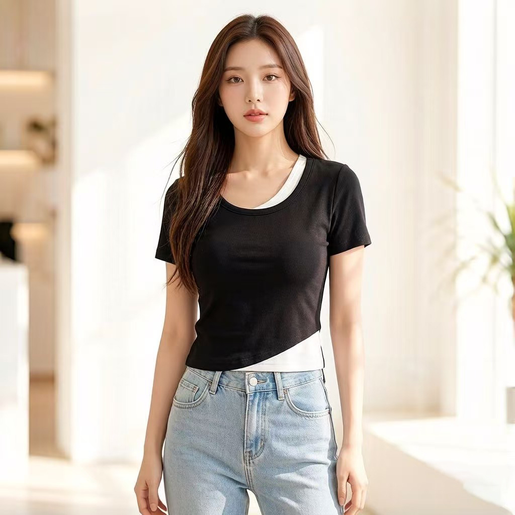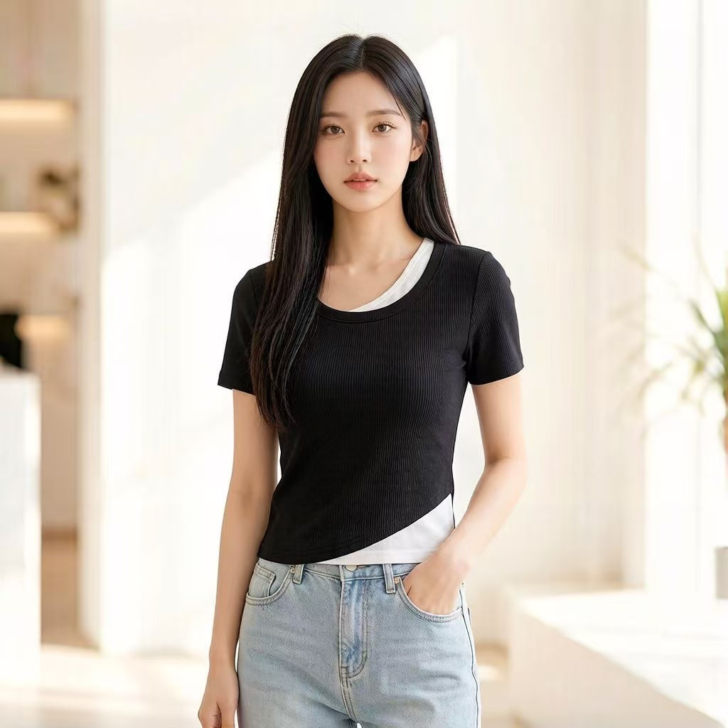 RY2381# 实拍纯棉短袖T恤女夏2026韩版新款撞色假两件百搭修身纯色上衣
