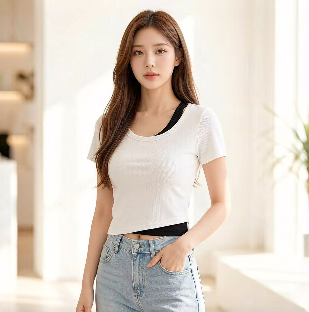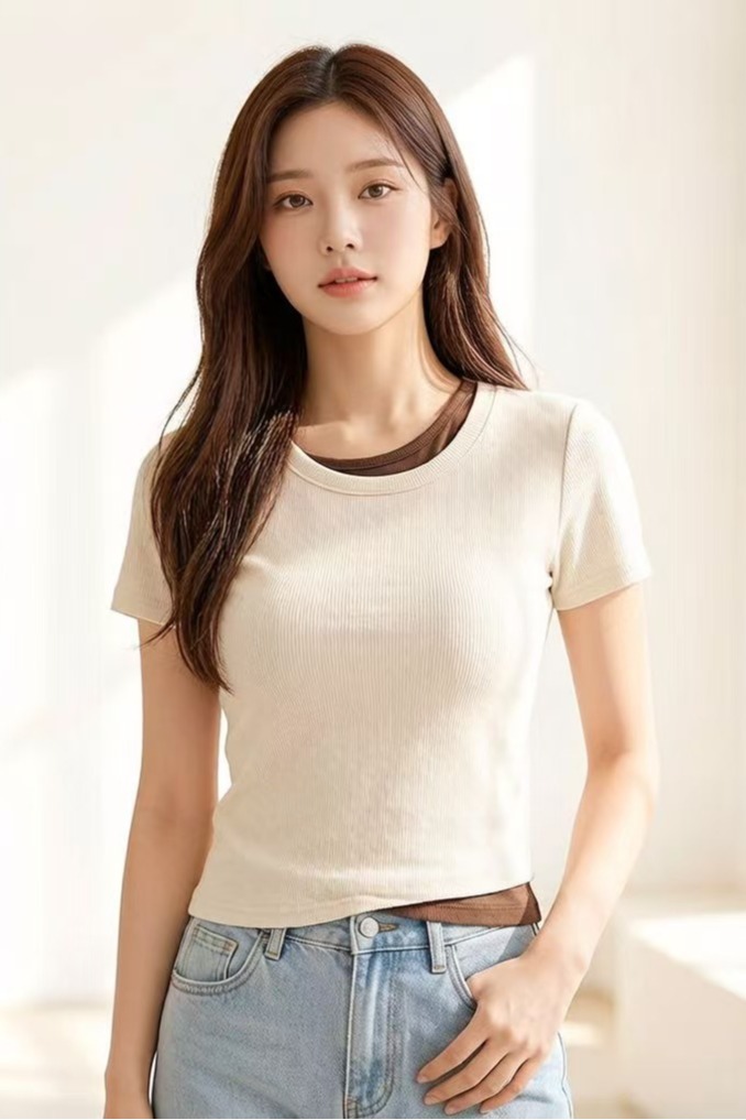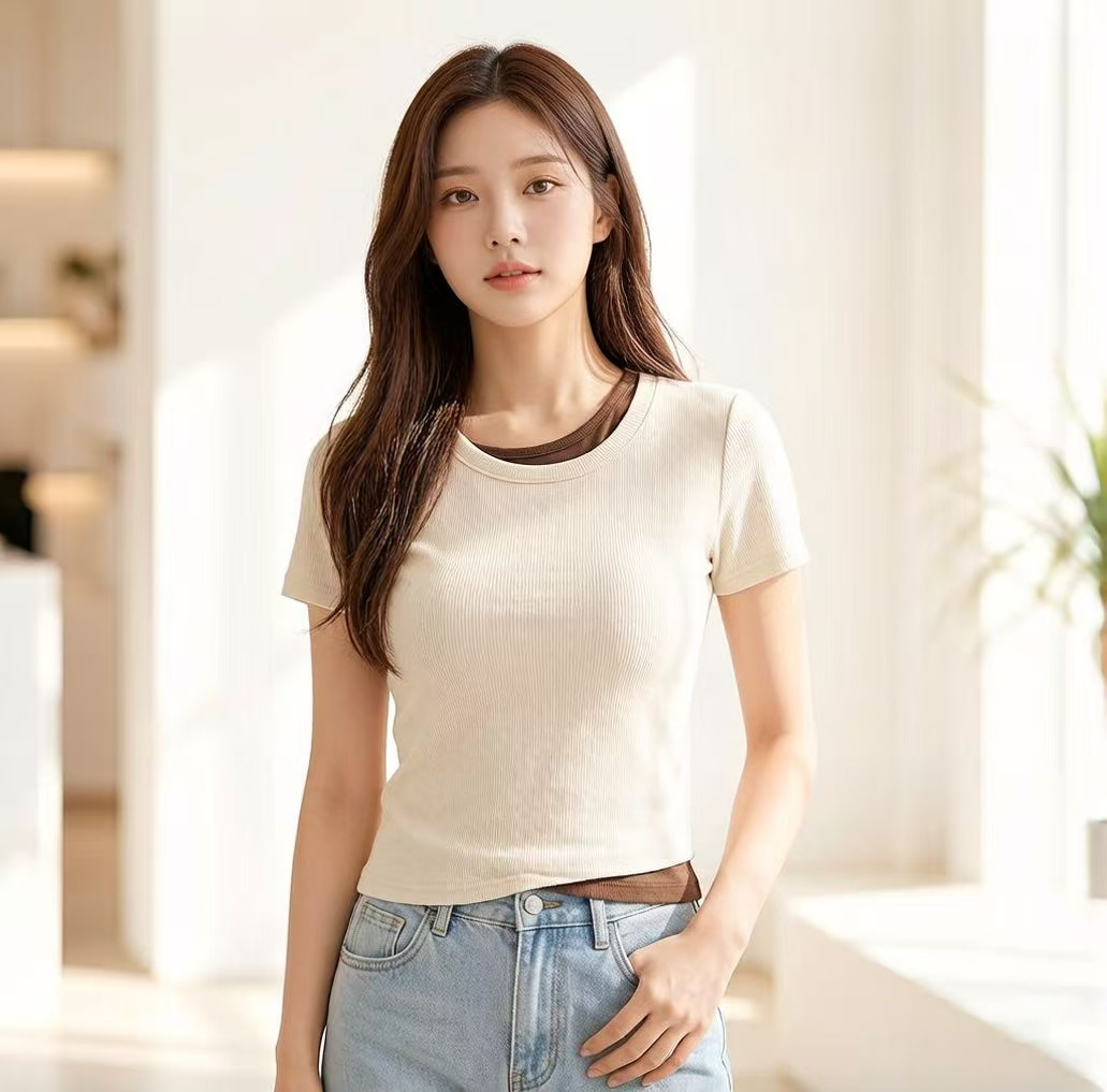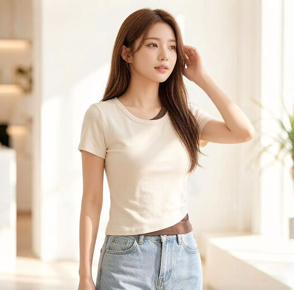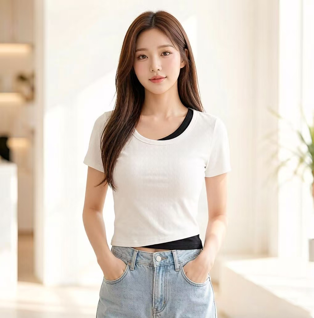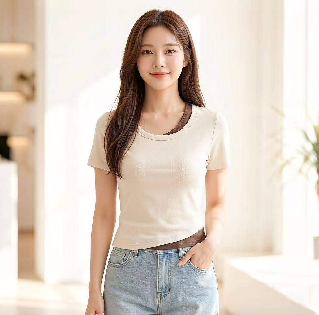 RY2381# 实拍纯棉短袖T恤女夏2026韩版新款撞色假两件百搭修身纯色上衣