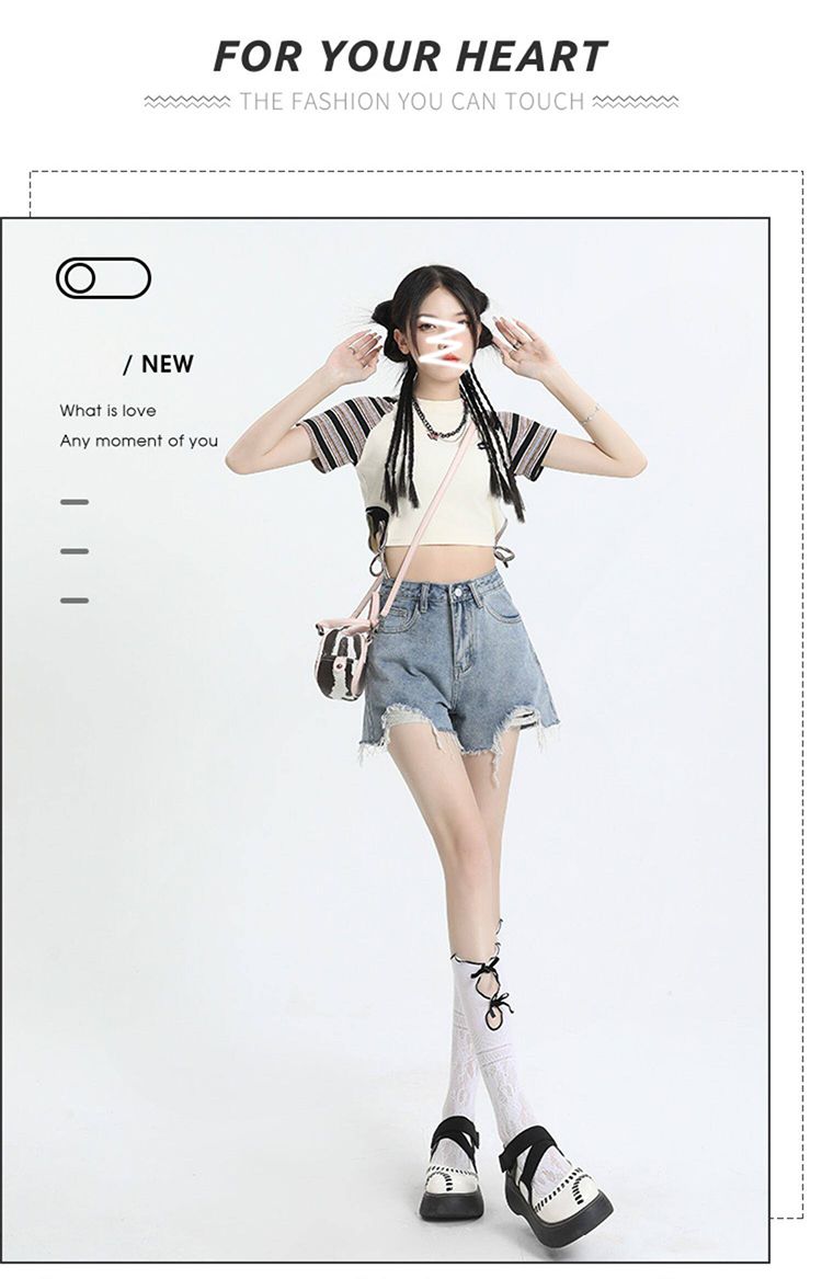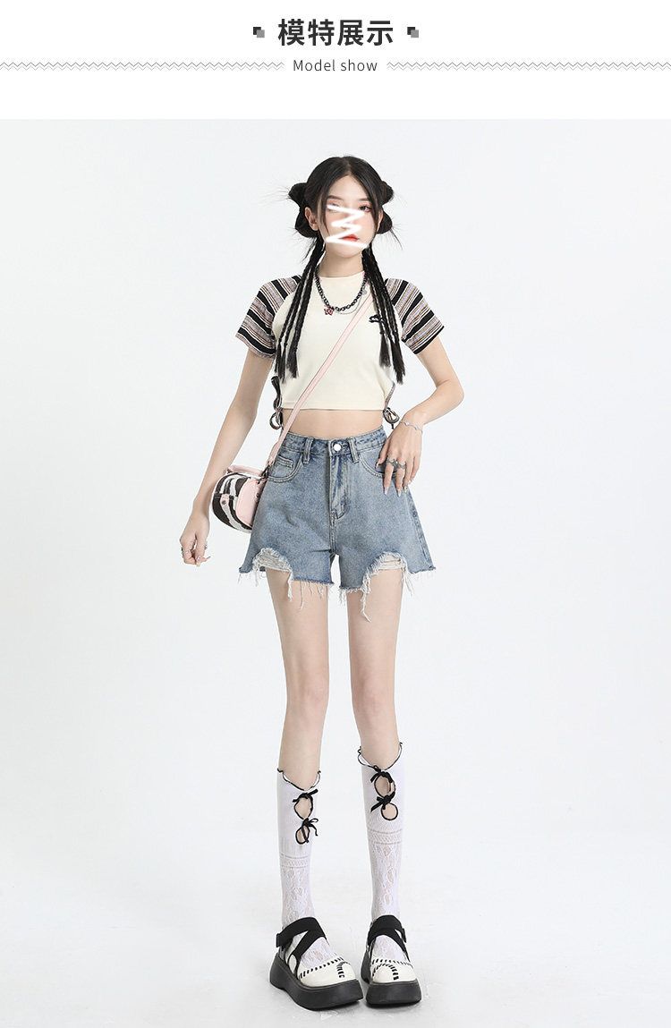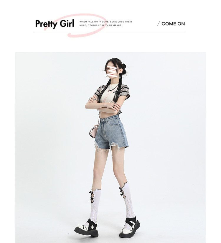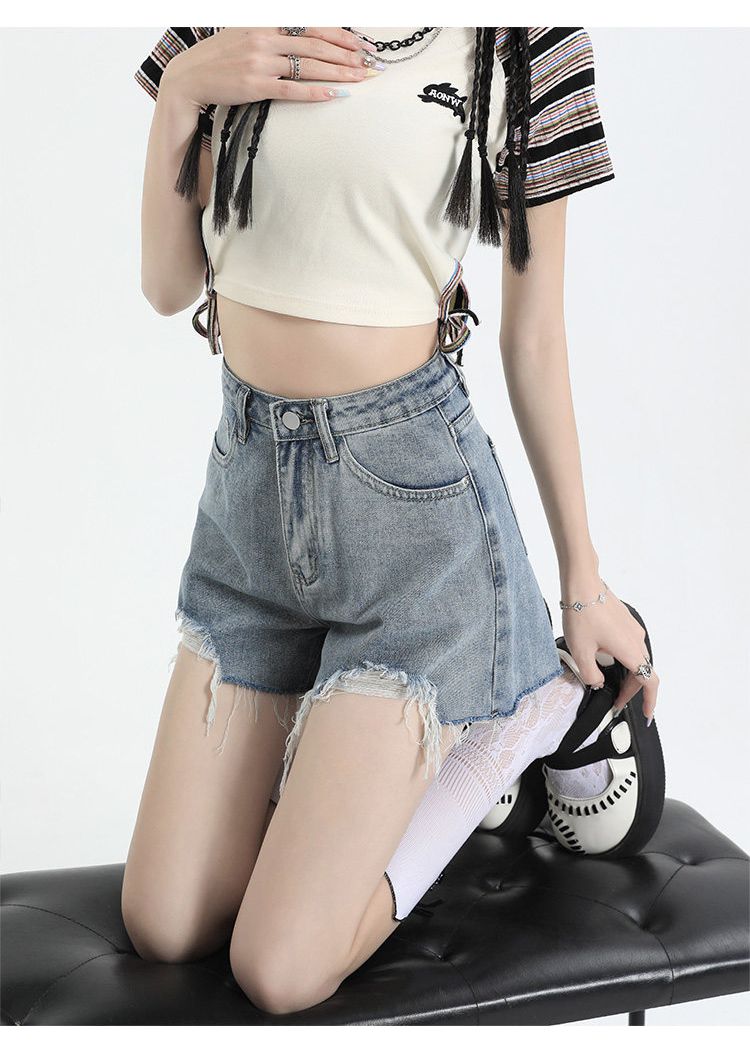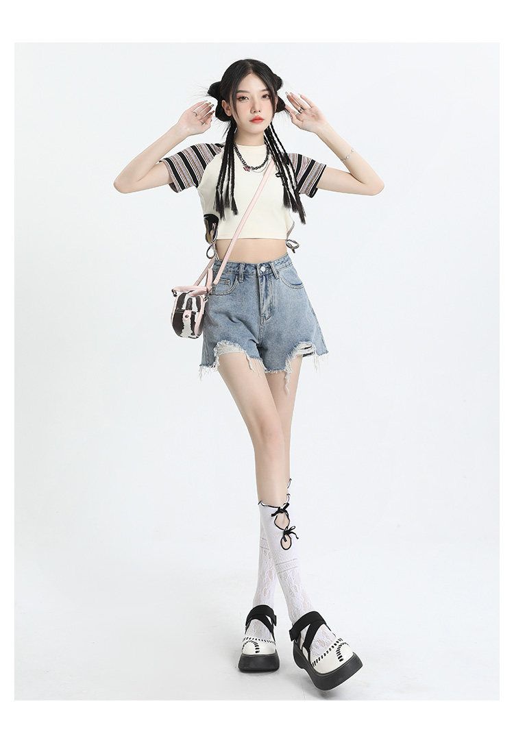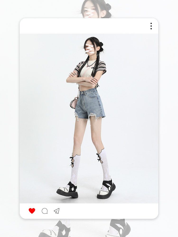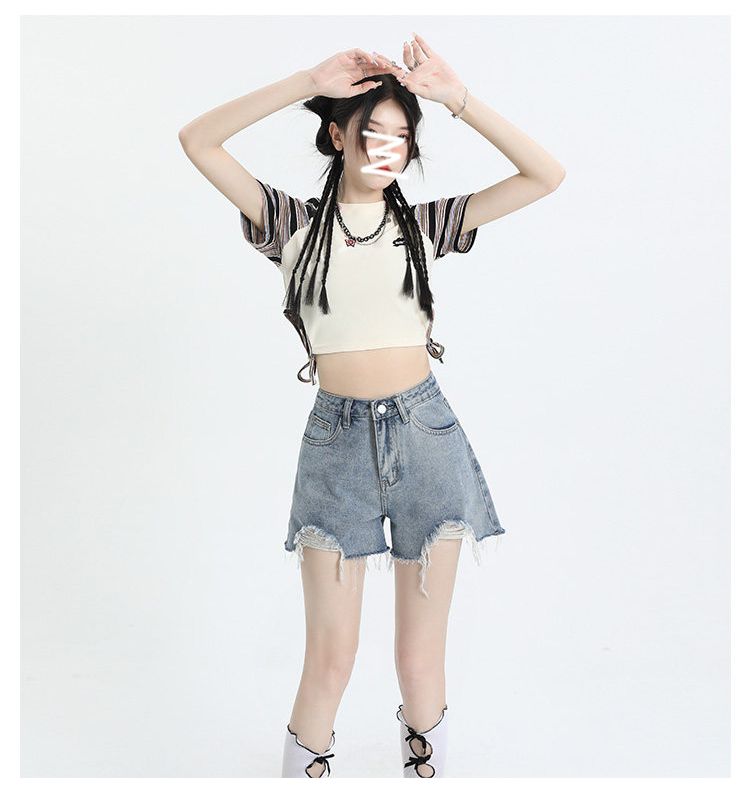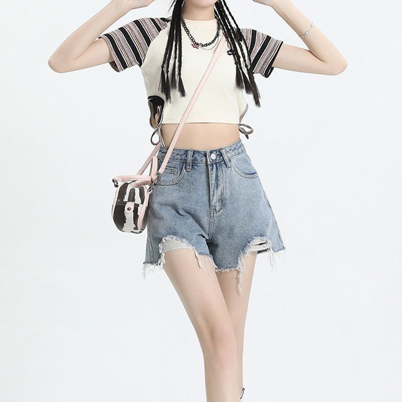 RY2399# 设计感绑带抽绳牛仔短裤女夏季新款款高腰显瘦辣妹弹力百搭热裤