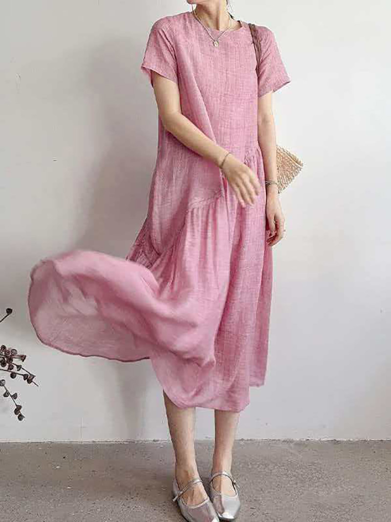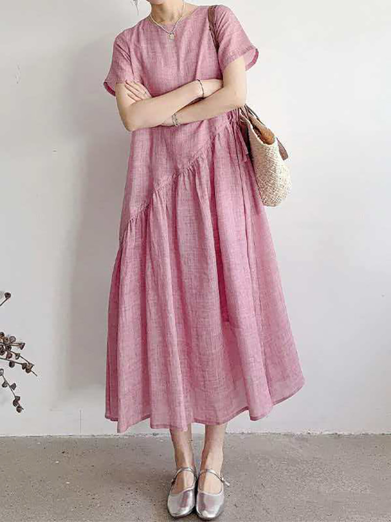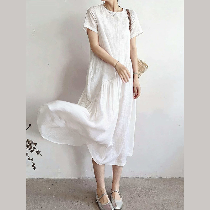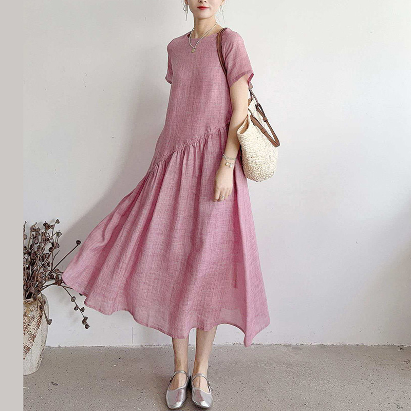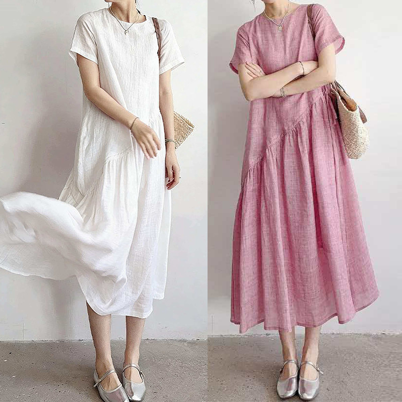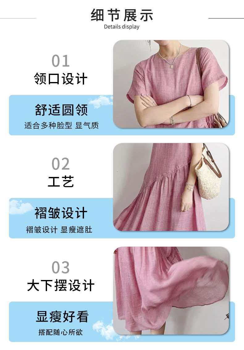 RY2409# 短袖亚麻连衣裙女2026夏季新款文艺范舒适休闲棉麻气质女神中长裙