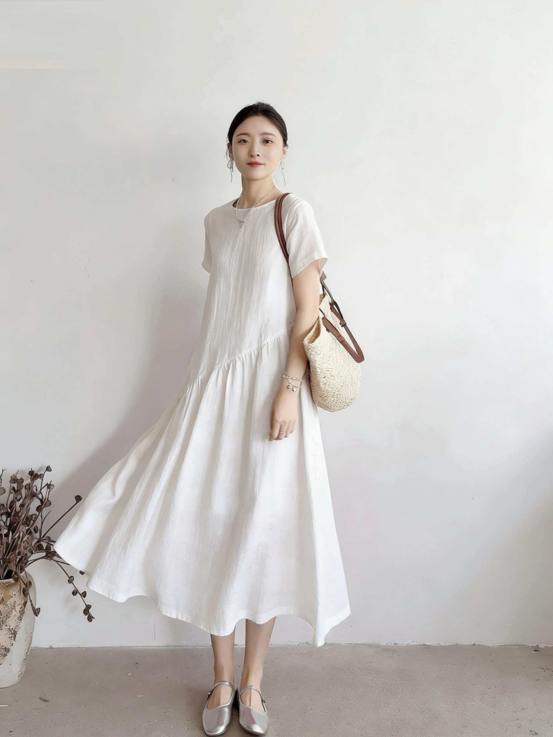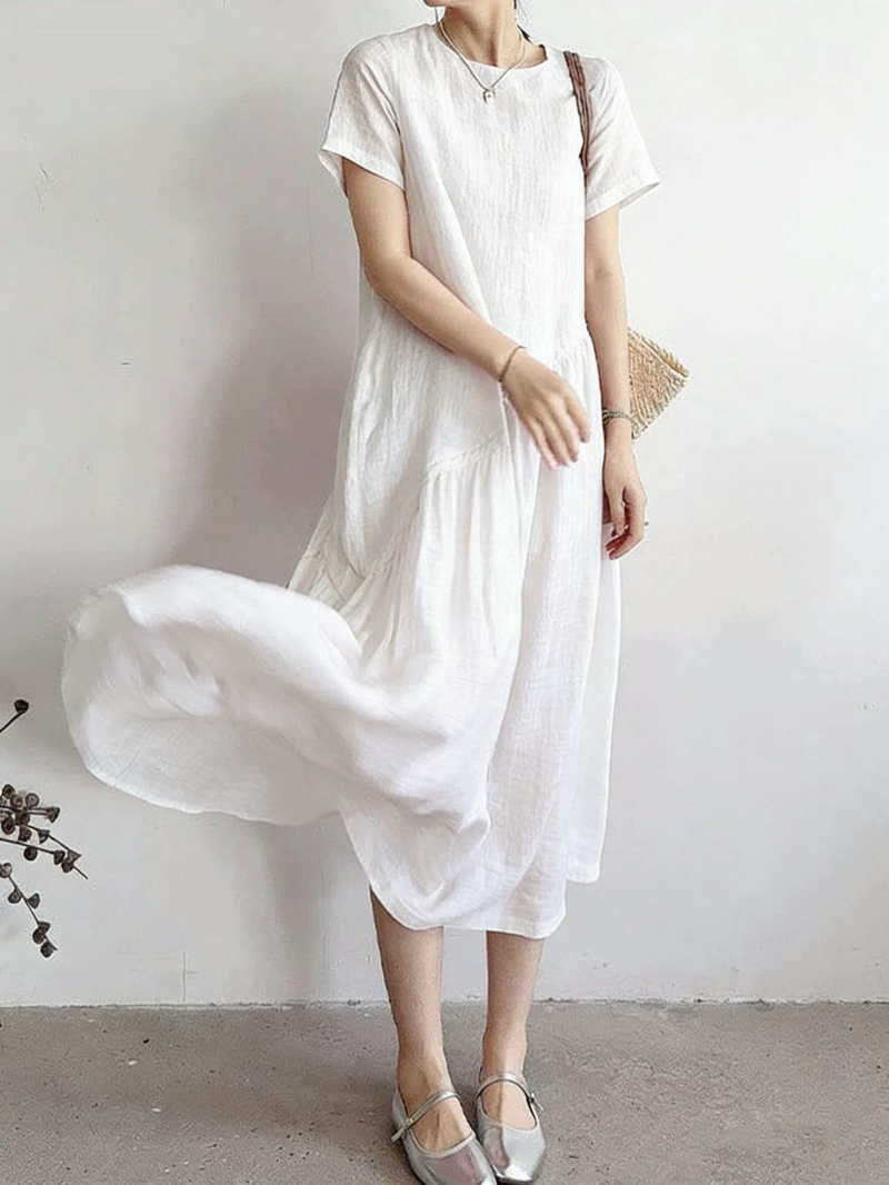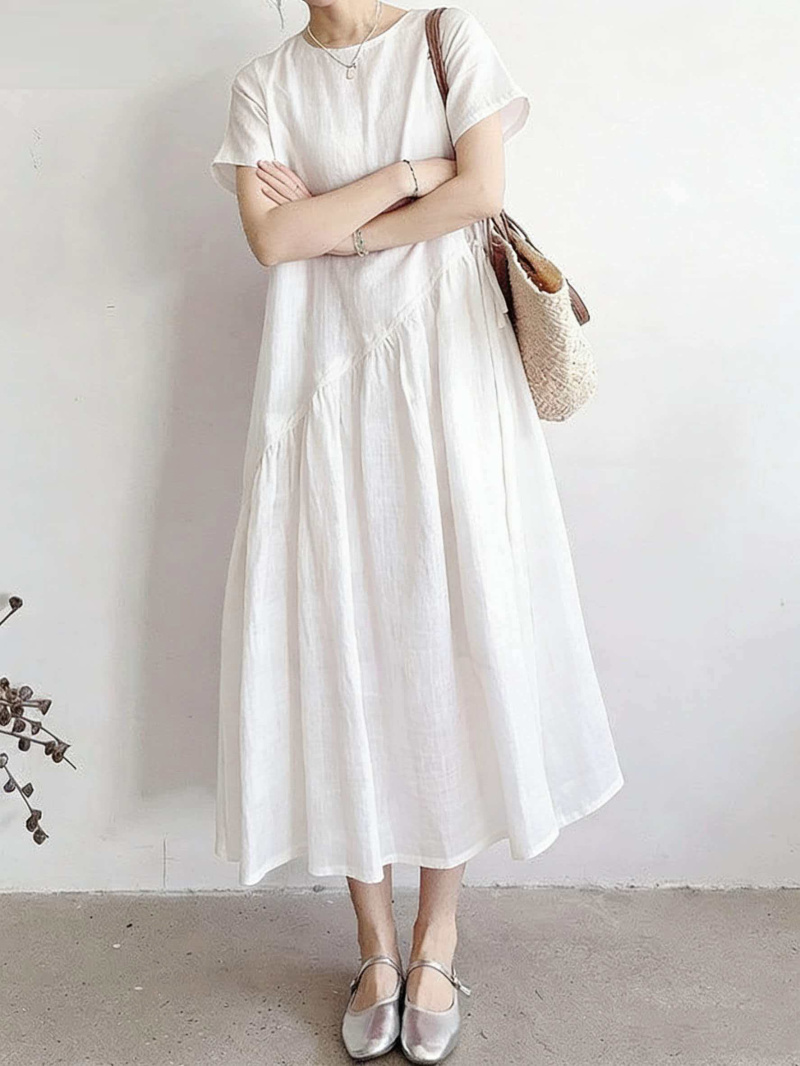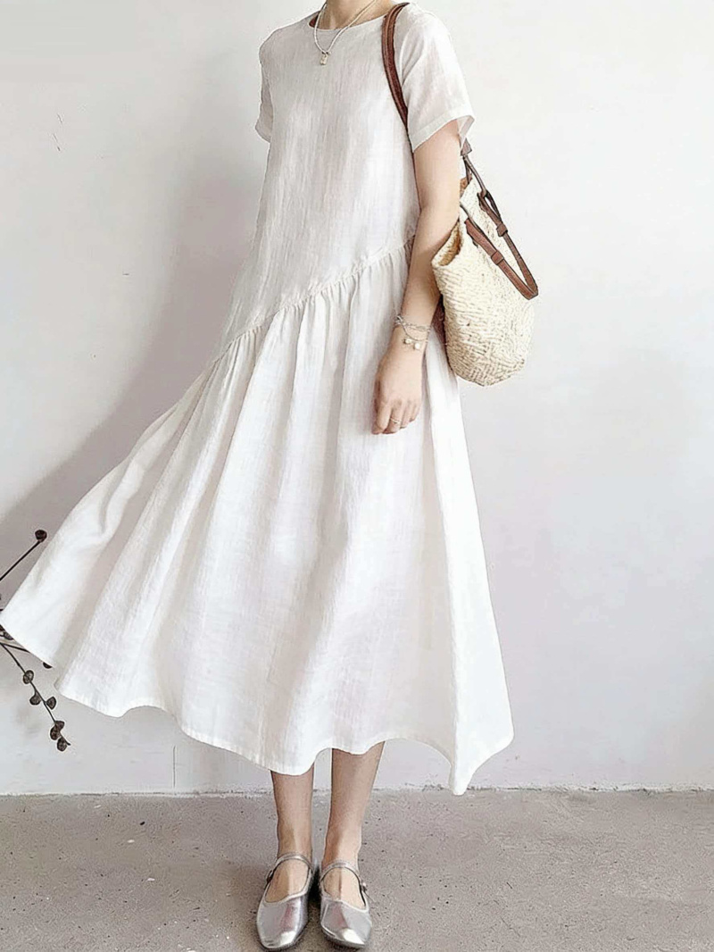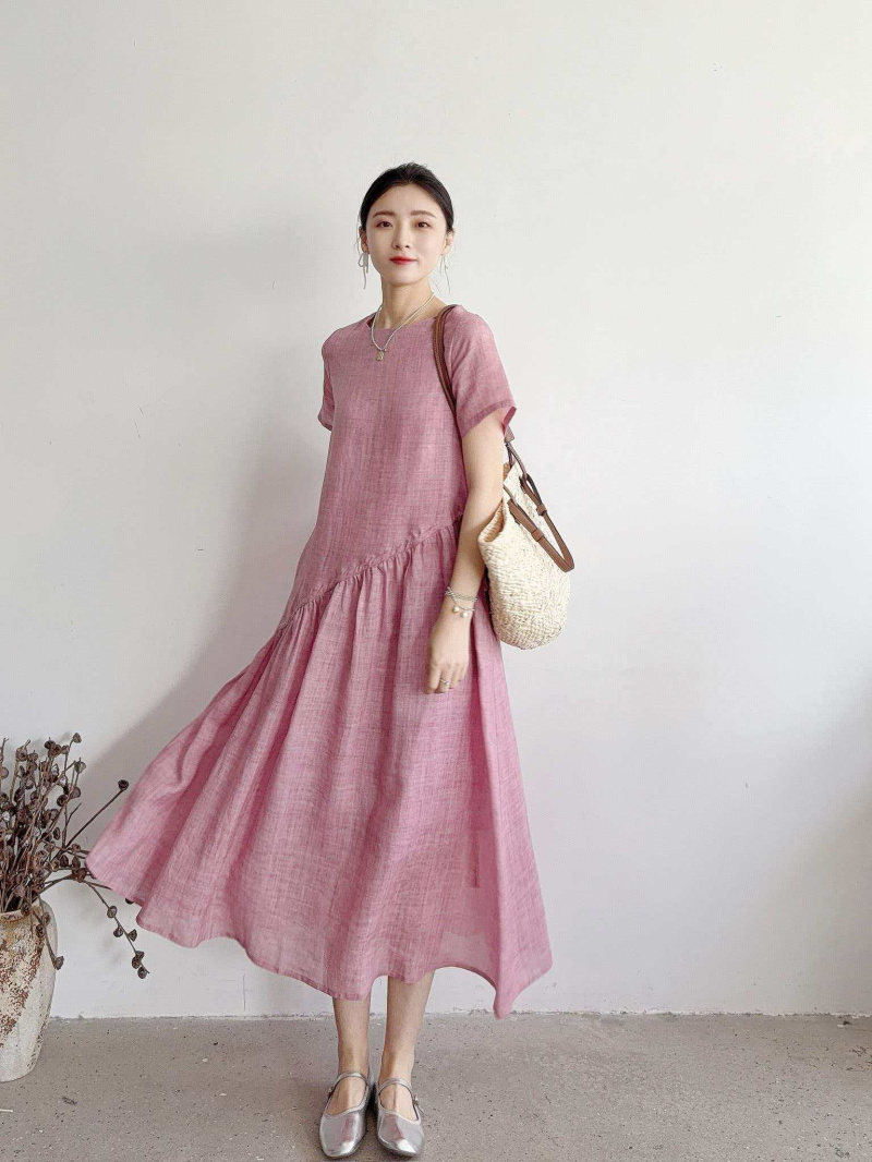 RY2409# 短袖亚麻连衣裙女2026夏季新款文艺范舒适休闲棉麻气质女神中长裙