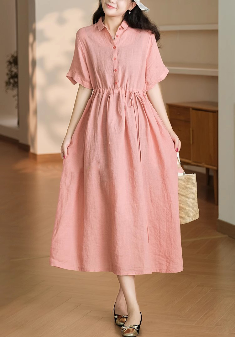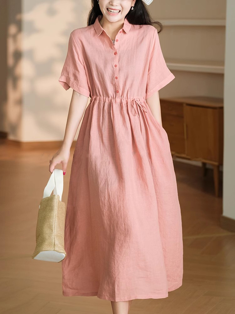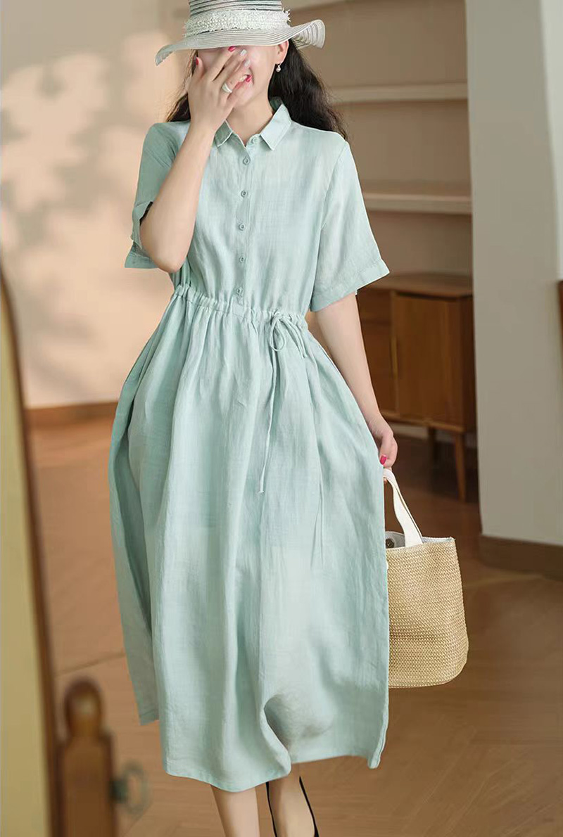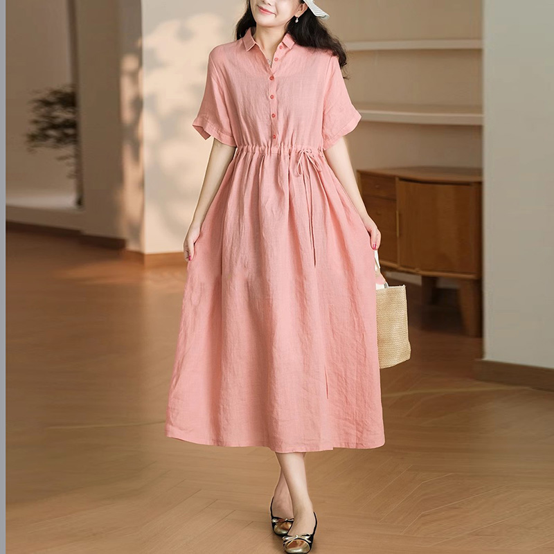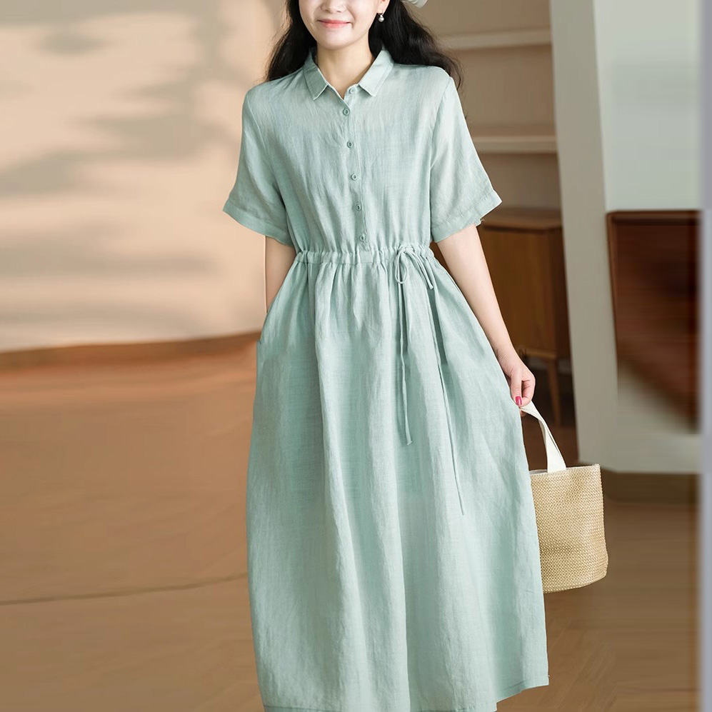 RY2410# 亚麻短袖连衣裙2026夏季文艺范宽松显瘦中长裙时尚棉麻裙子
