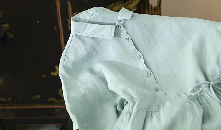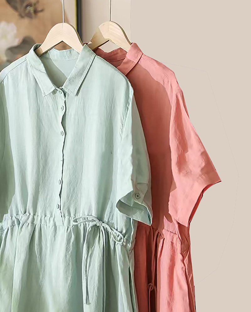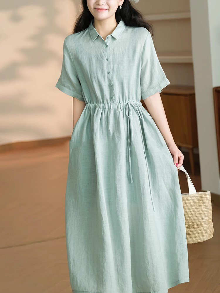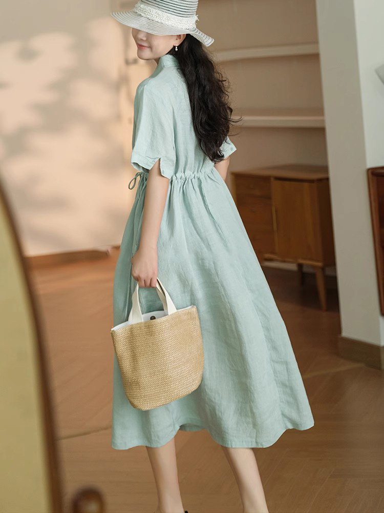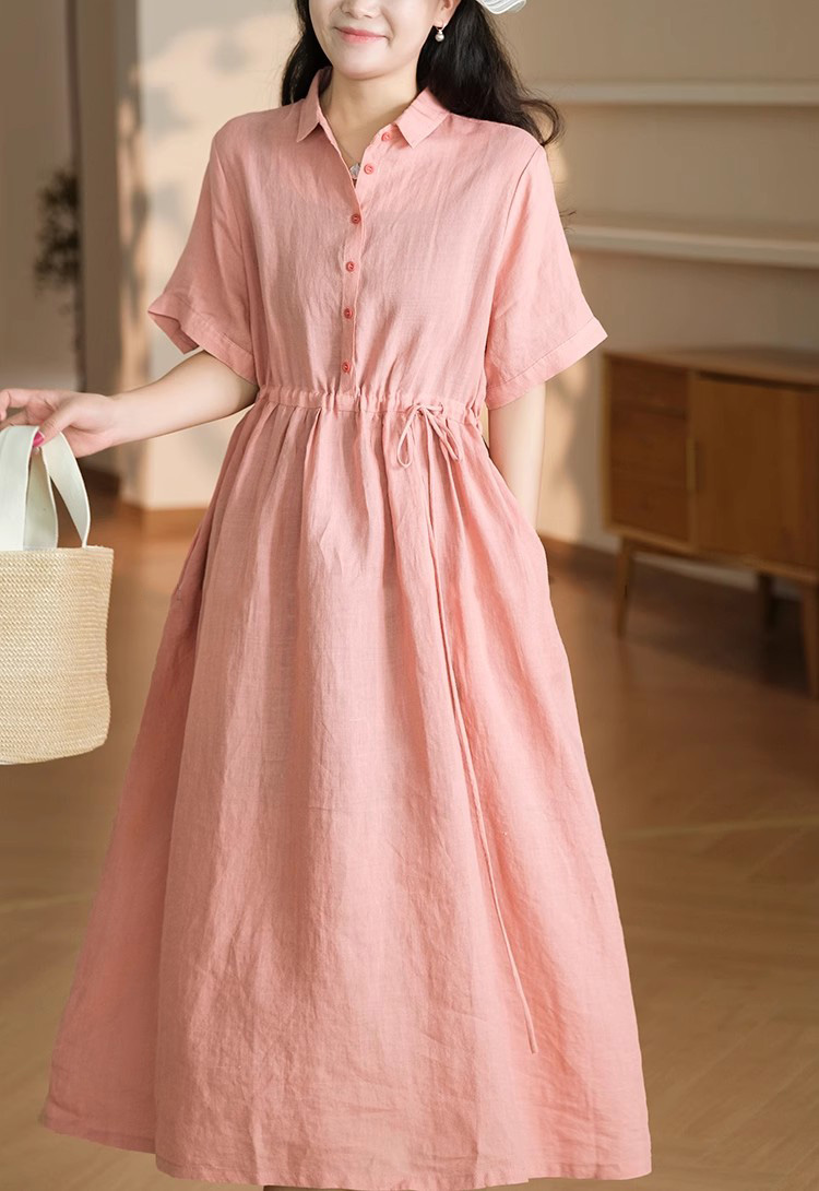 RY2410# 亚麻短袖连衣裙2026夏季文艺范宽松显瘦中长裙时尚棉麻裙子