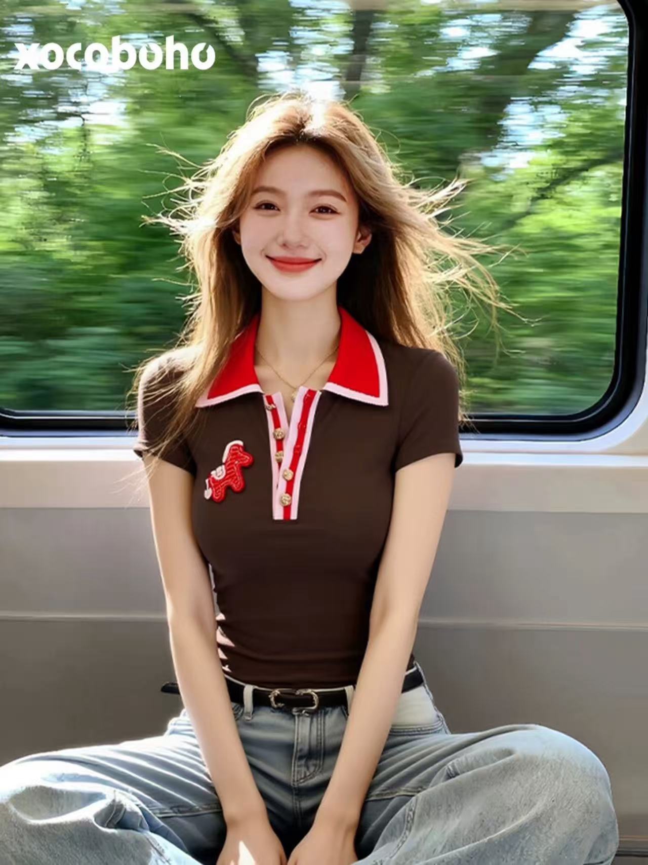 RY2416# 2026夏季独特超好看单穿上衣小众不撞款Polo领咖色短袖t恤打底衫