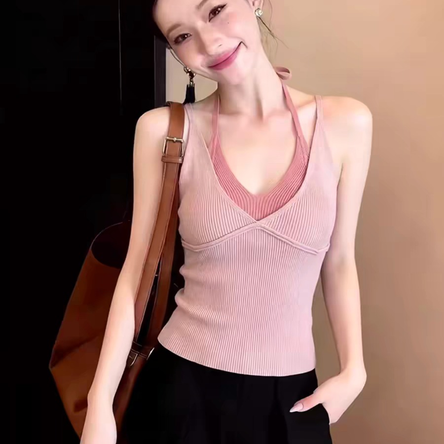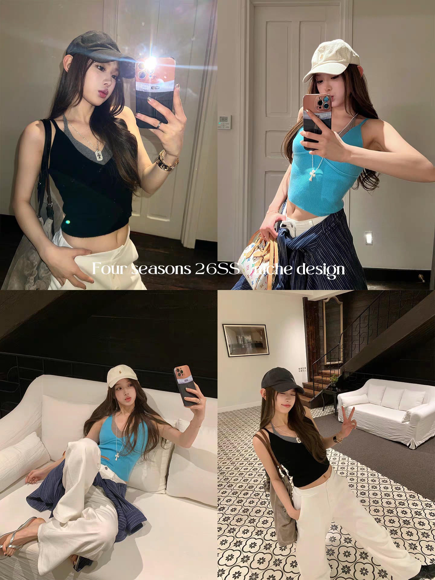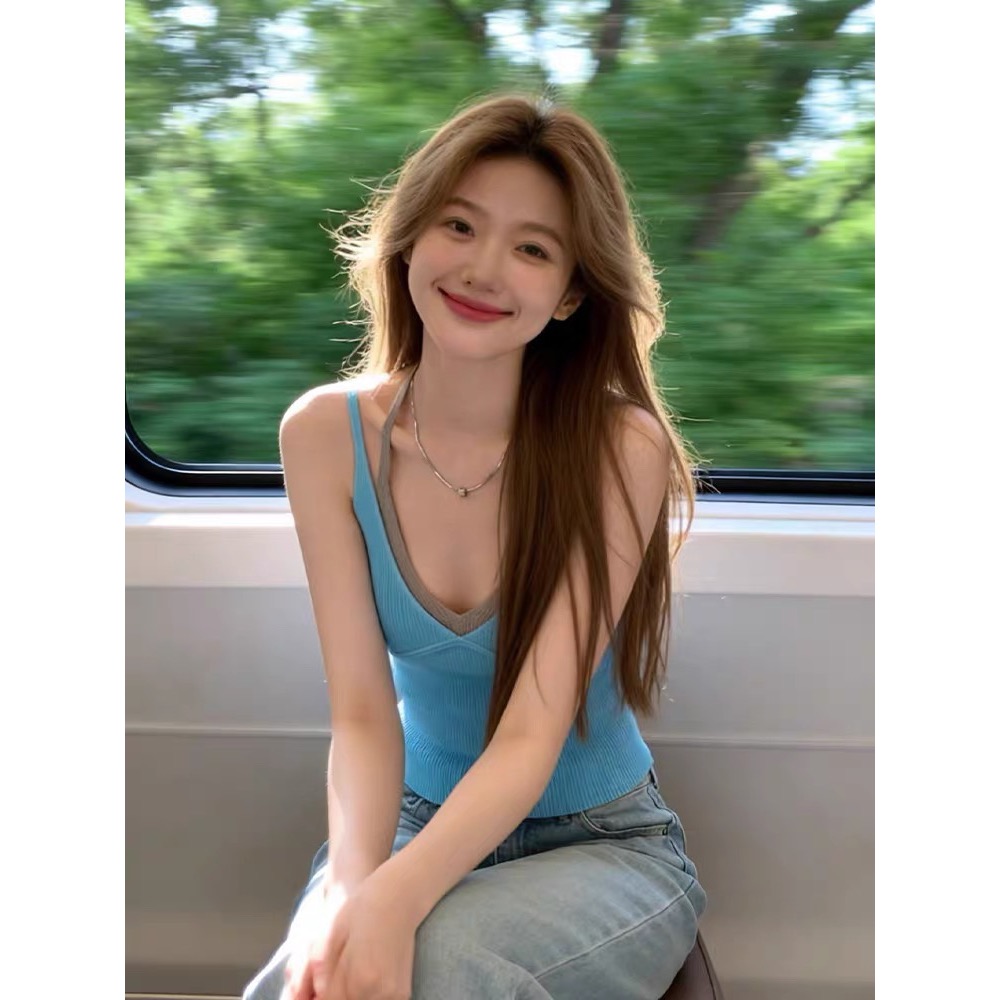 RY2417# 今年春季新款藏青色菱格V领细肩带吊带背心女风时尚显瘦上衣潮