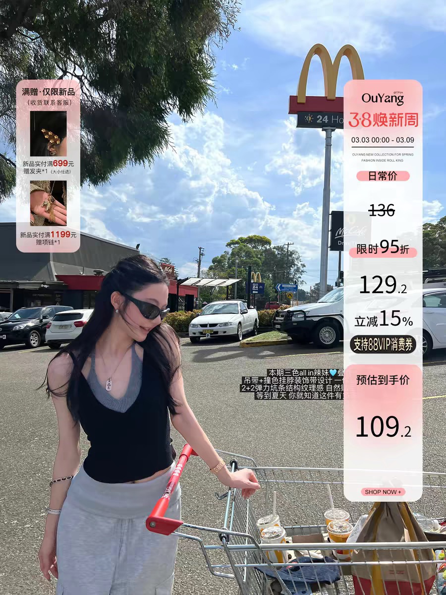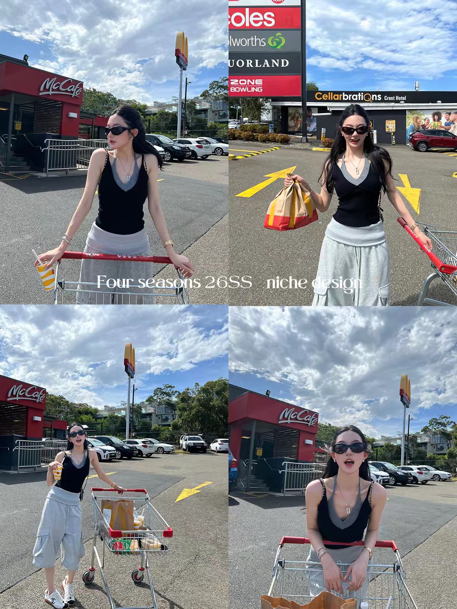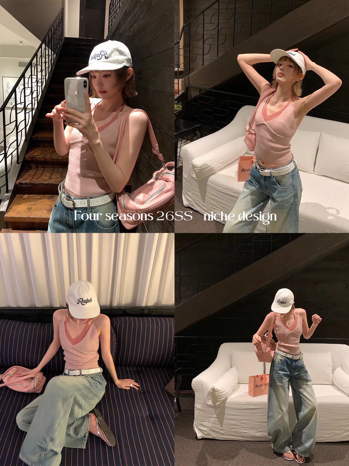RY2417# 今年春季新款藏青色菱格V领细肩带吊带背心女风时尚显瘦上衣潮