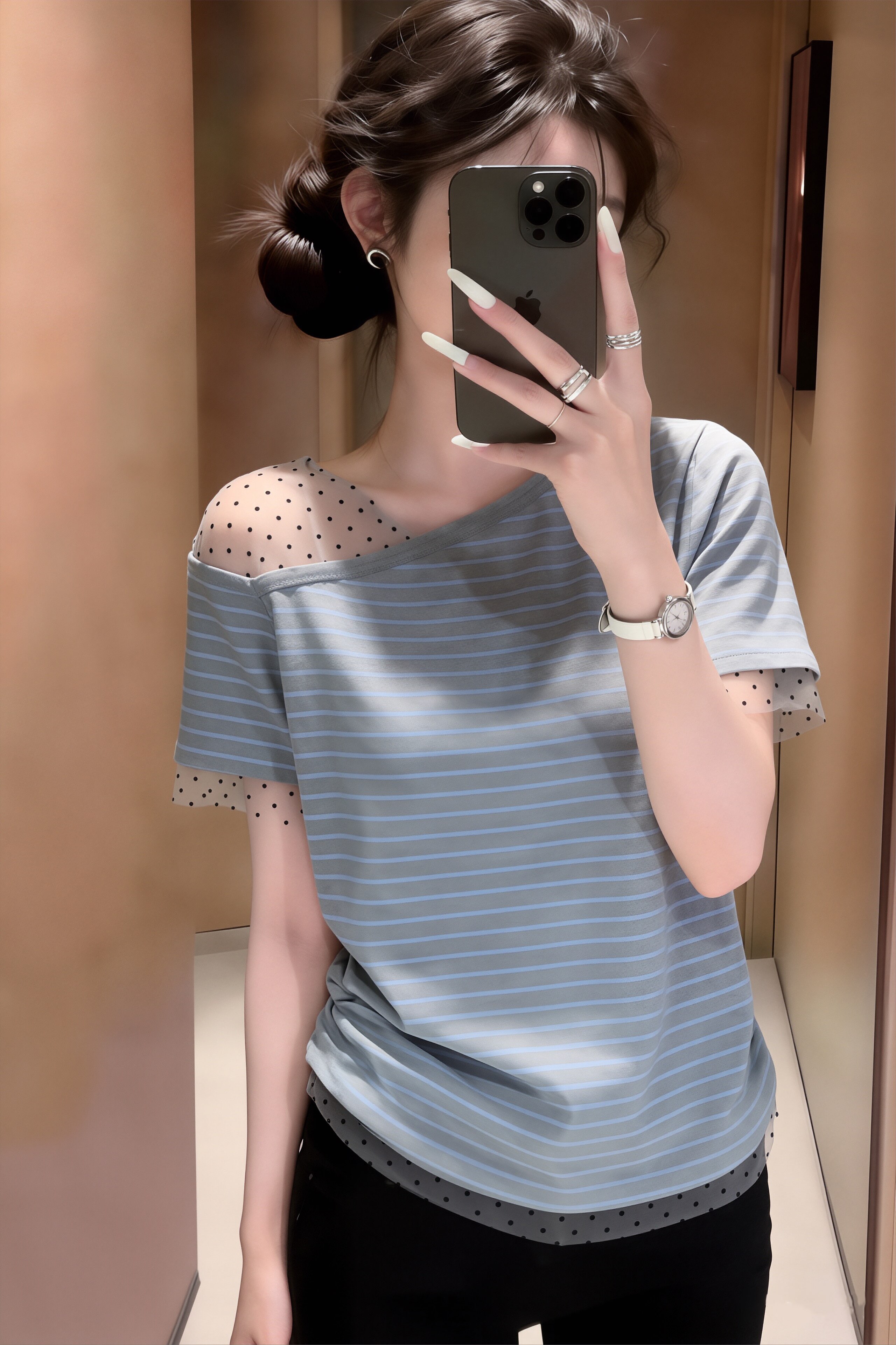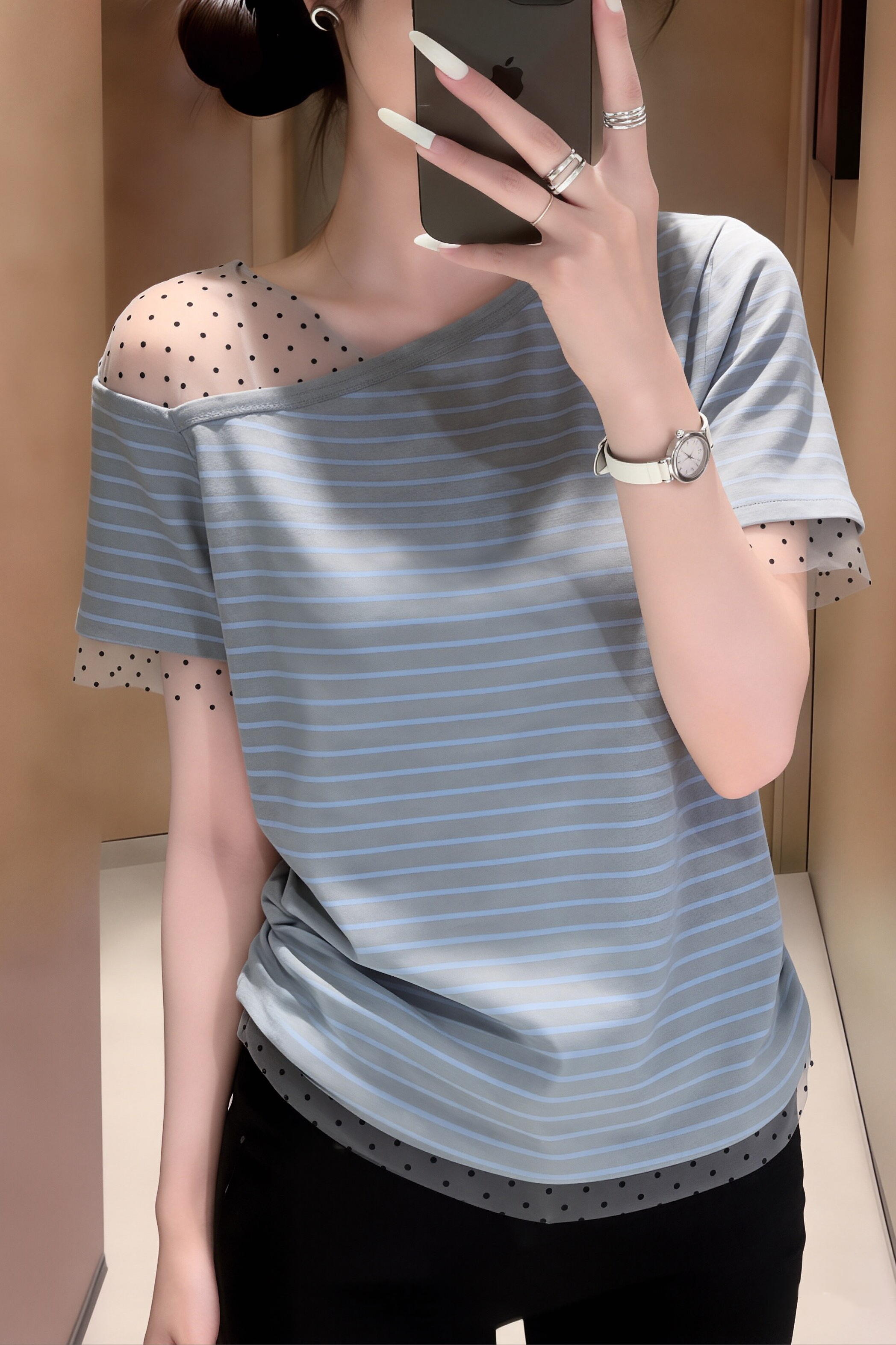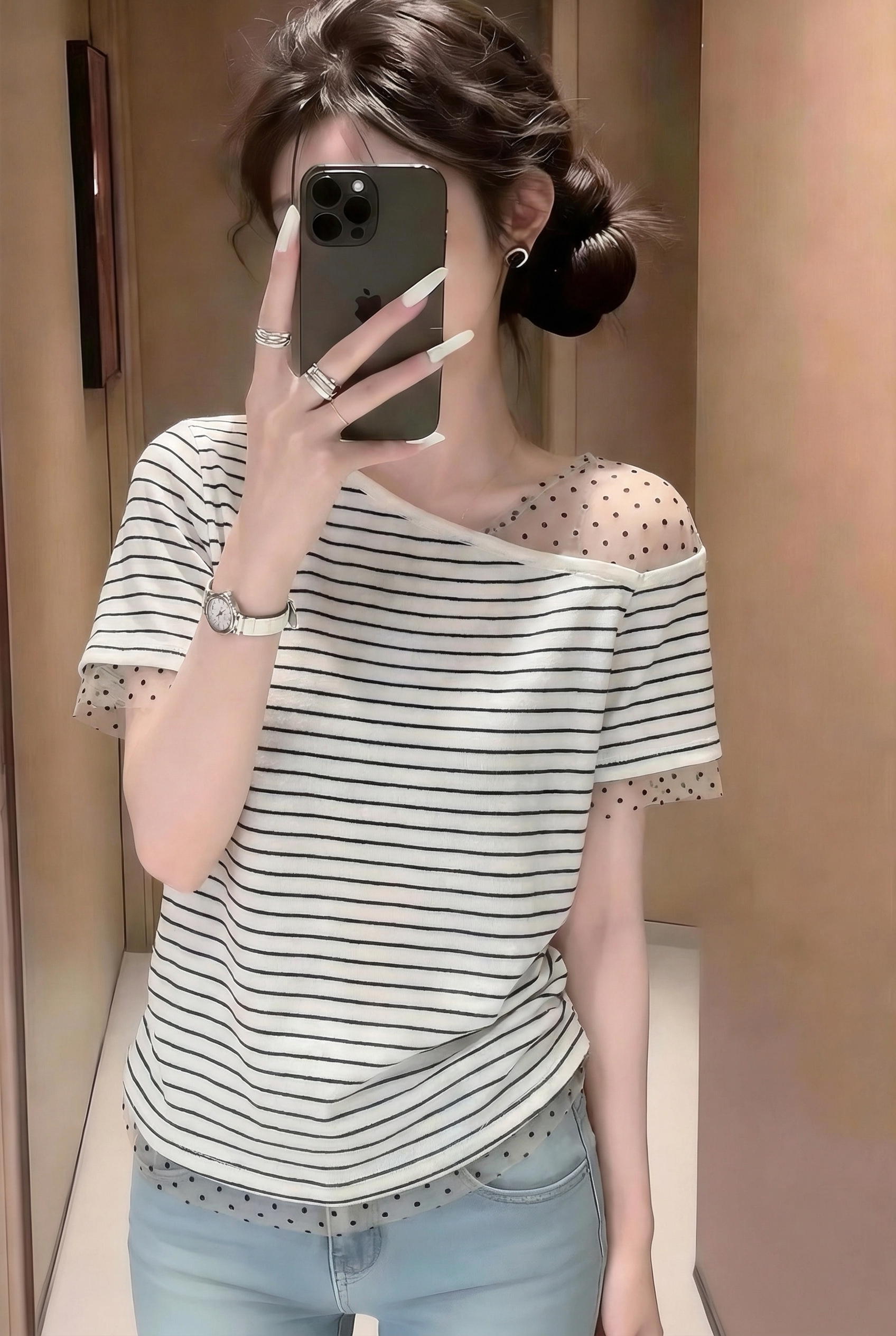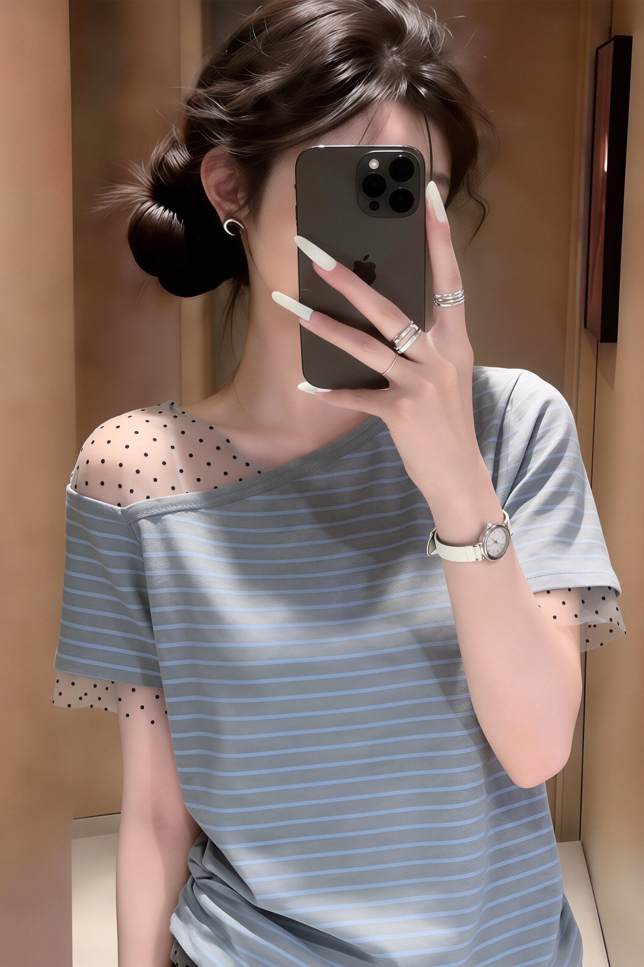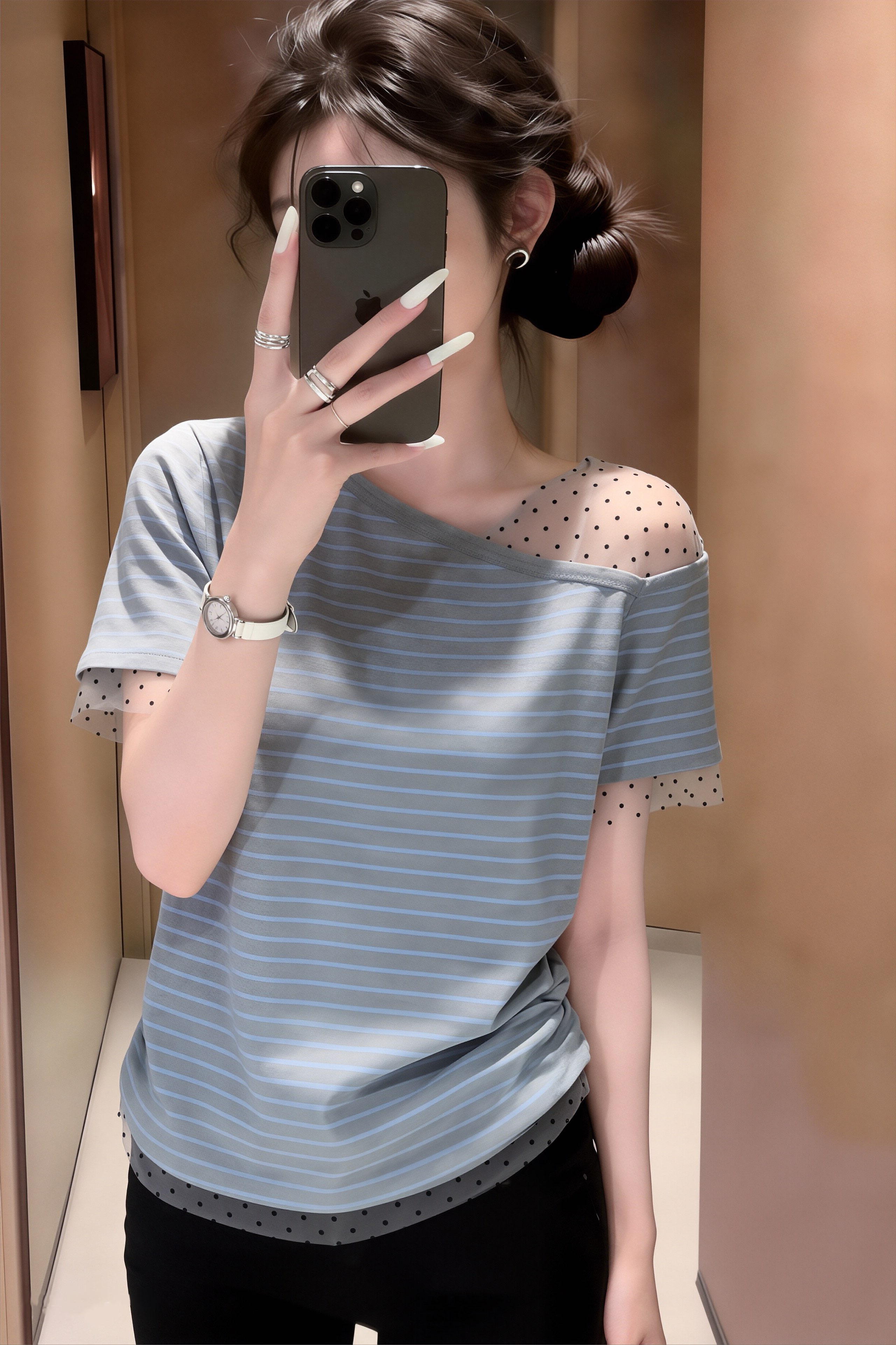RY2419# 实拍新款韩版时尚气质春夏减龄显瘦修身百搭洋气斜肩短袖上衣