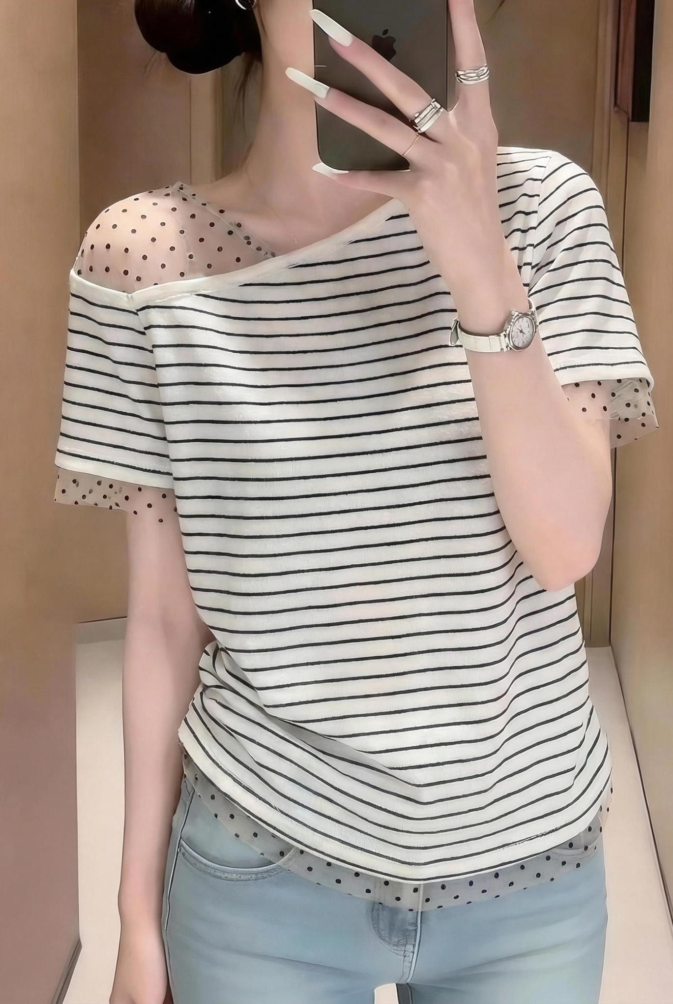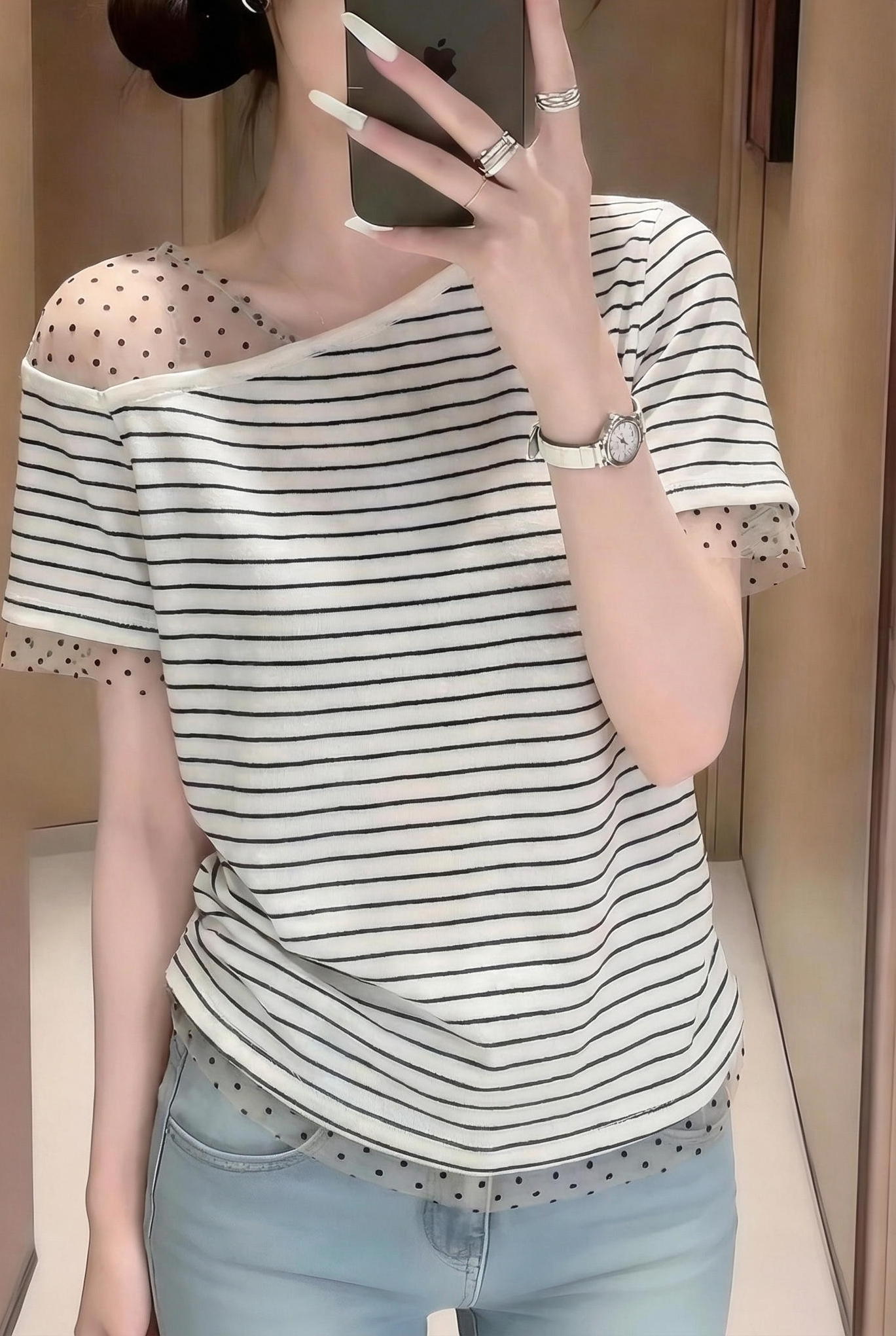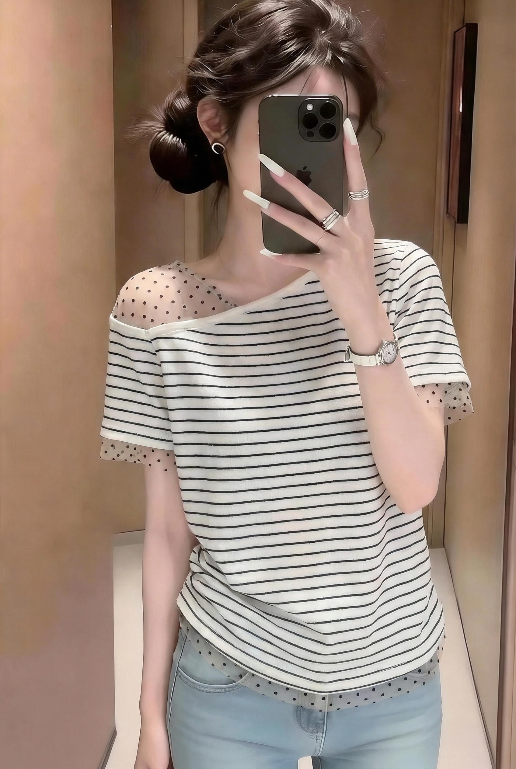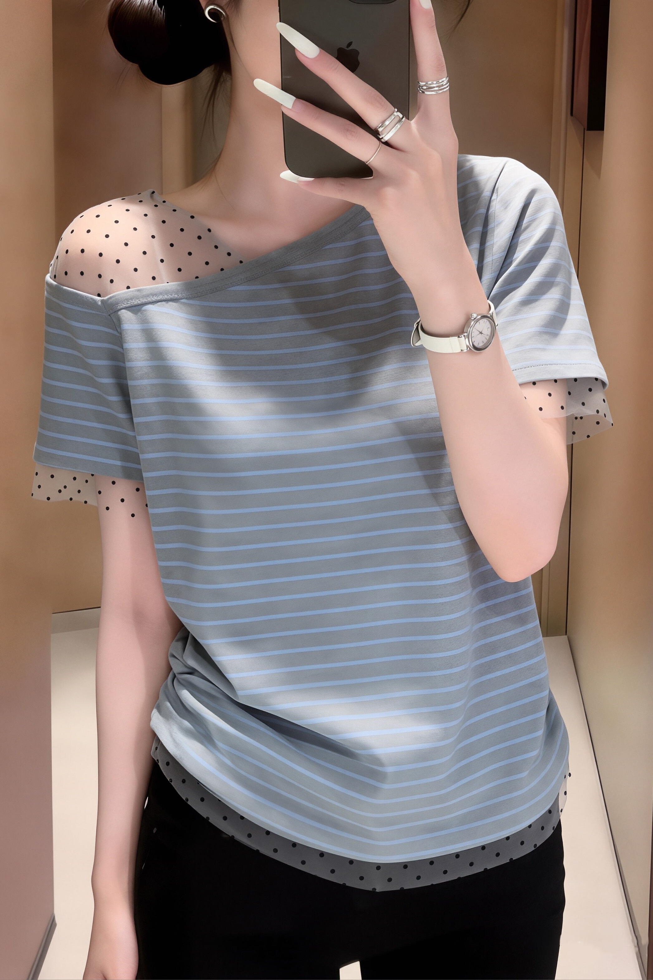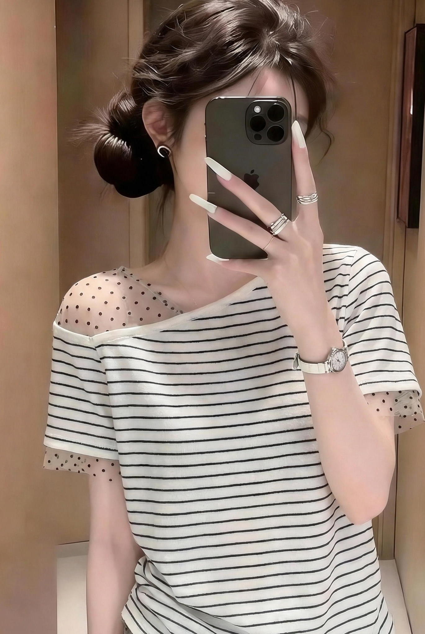 RY2419# 实拍新款韩版时尚气质春夏减龄显瘦修身百搭洋气斜肩短袖上衣