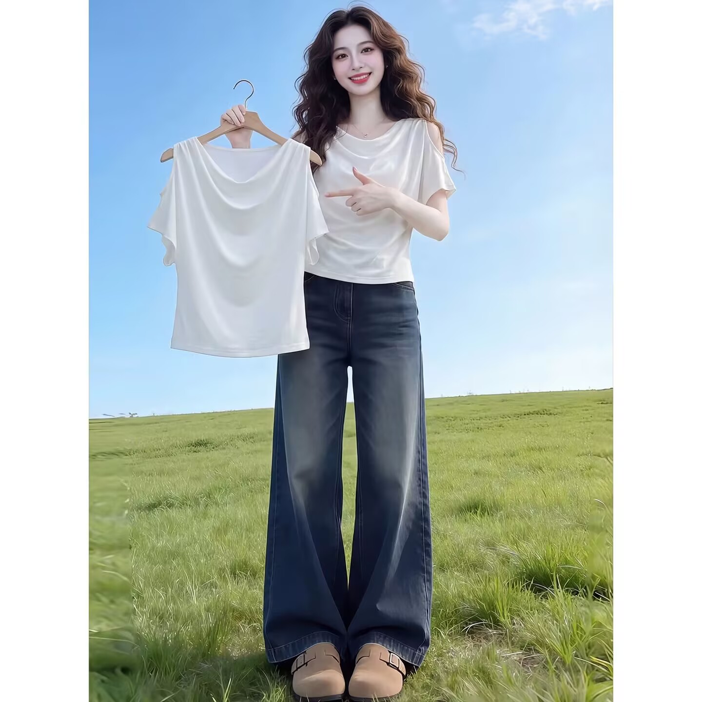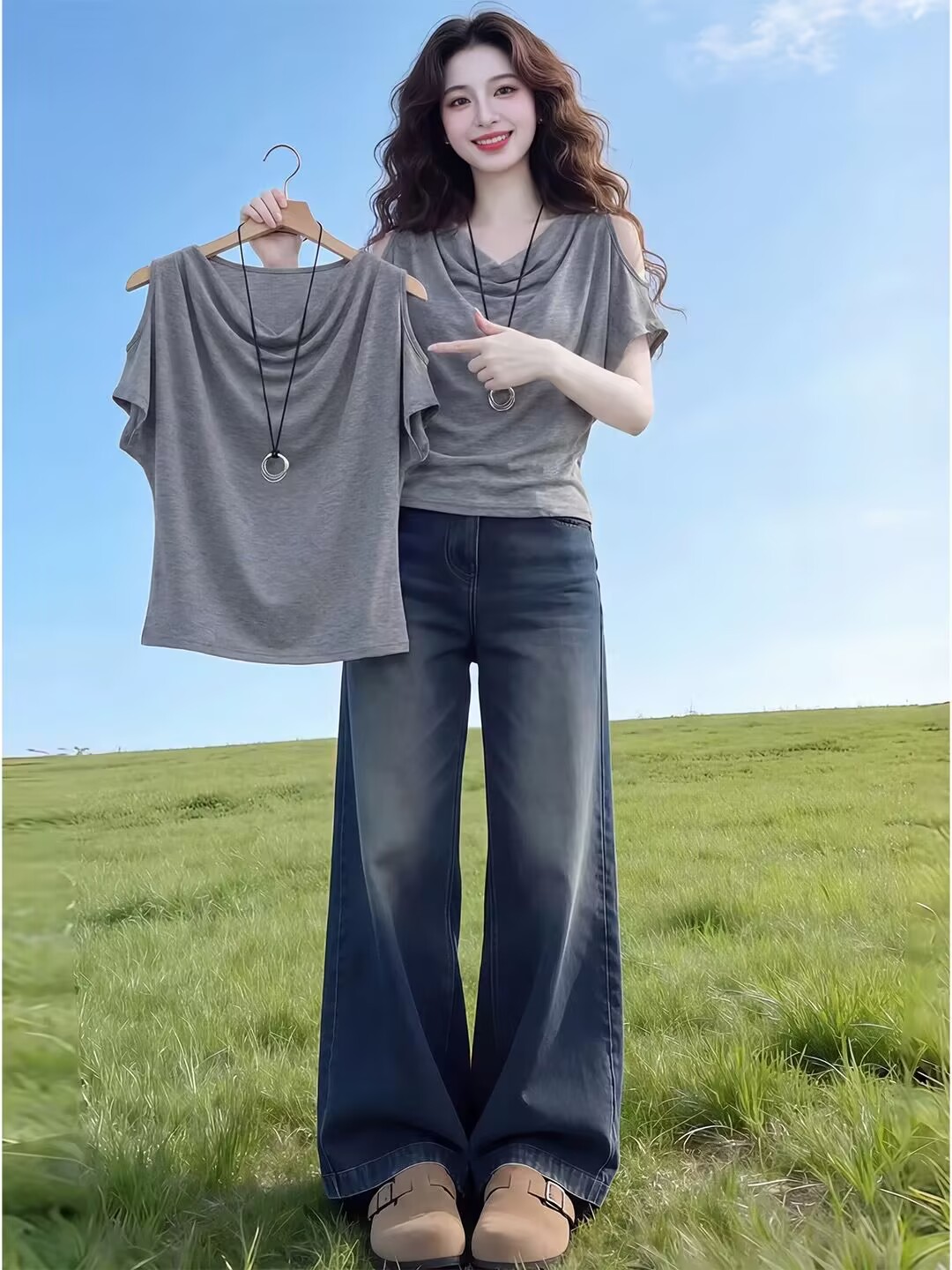 RY2422# 实拍~ 2026夏季新款美式露肩荡领宽松遮肉短袖蝙蝠衫上衣T恤