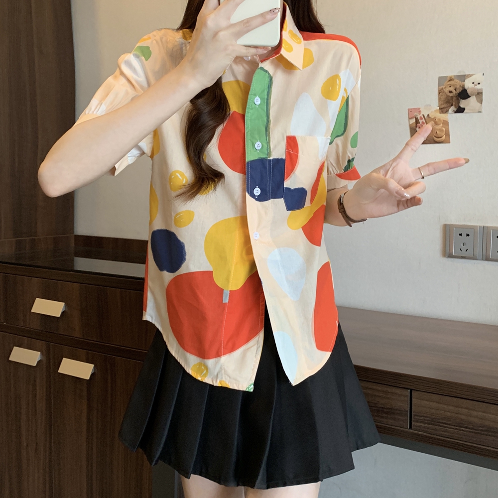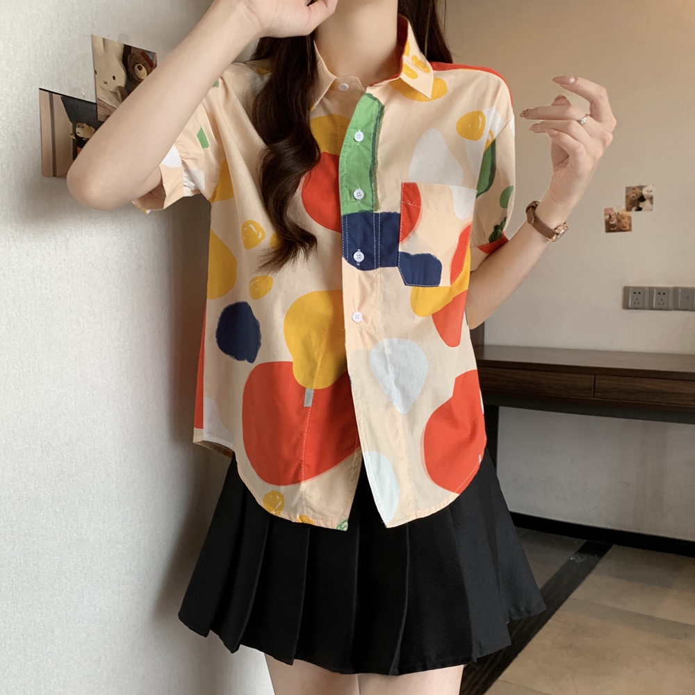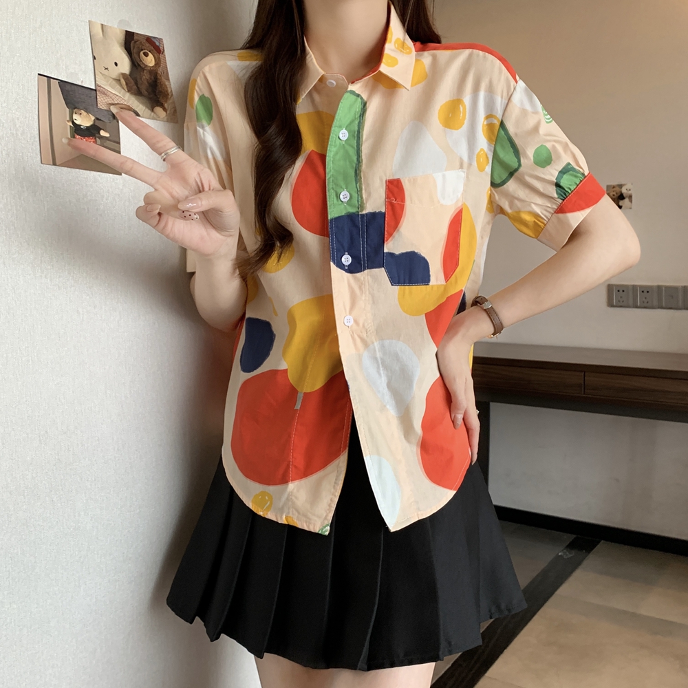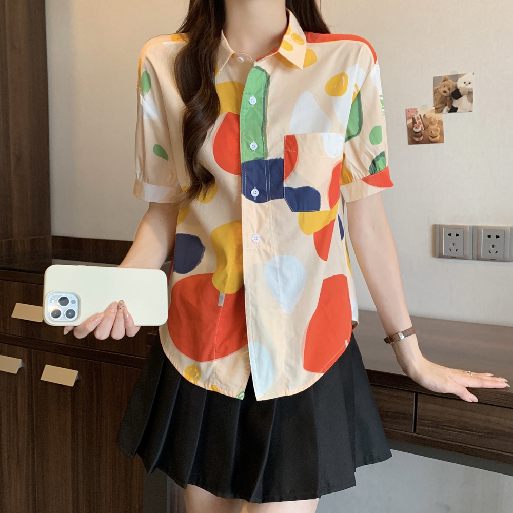 RY2429# 实拍夏装新款大码女装通勤翻领彩绘涂鸦高端棉衬衫上衣M-4XL200斤