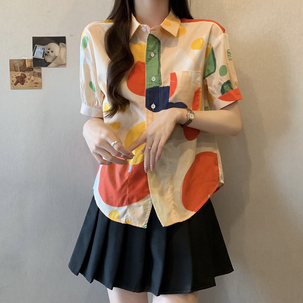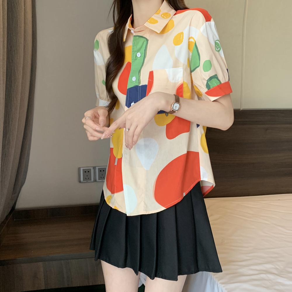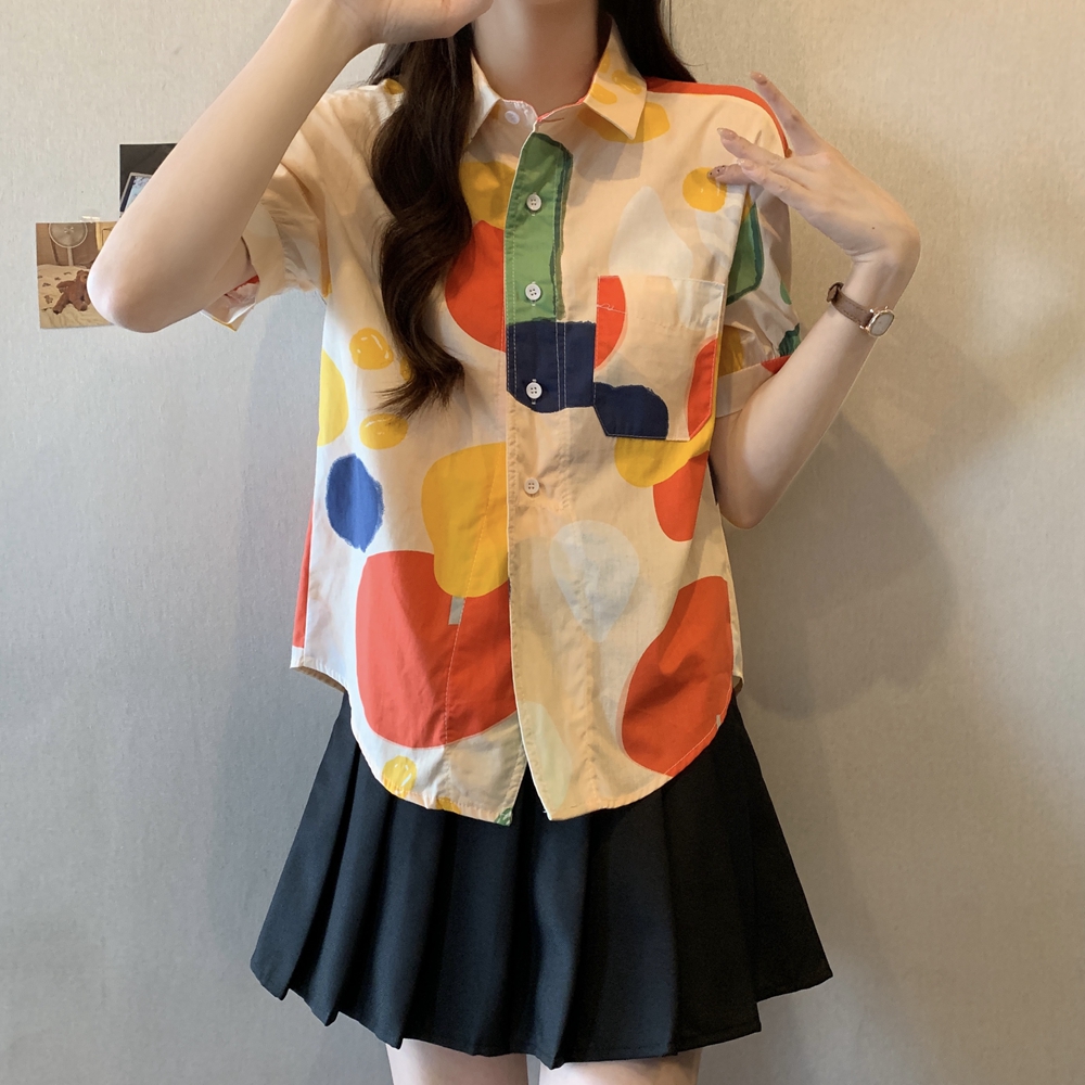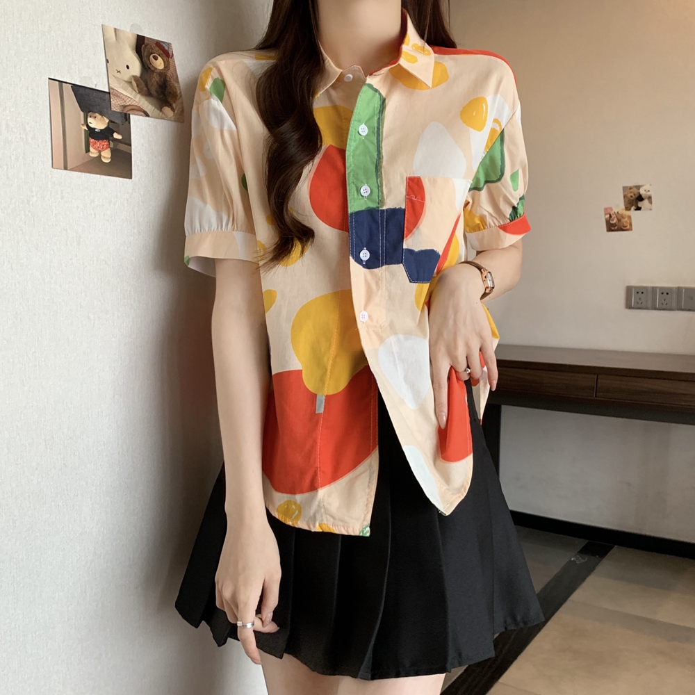 RY2429# 实拍夏装新款大码女装通勤翻领彩绘涂鸦高端棉衬衫上衣M-4XL200斤