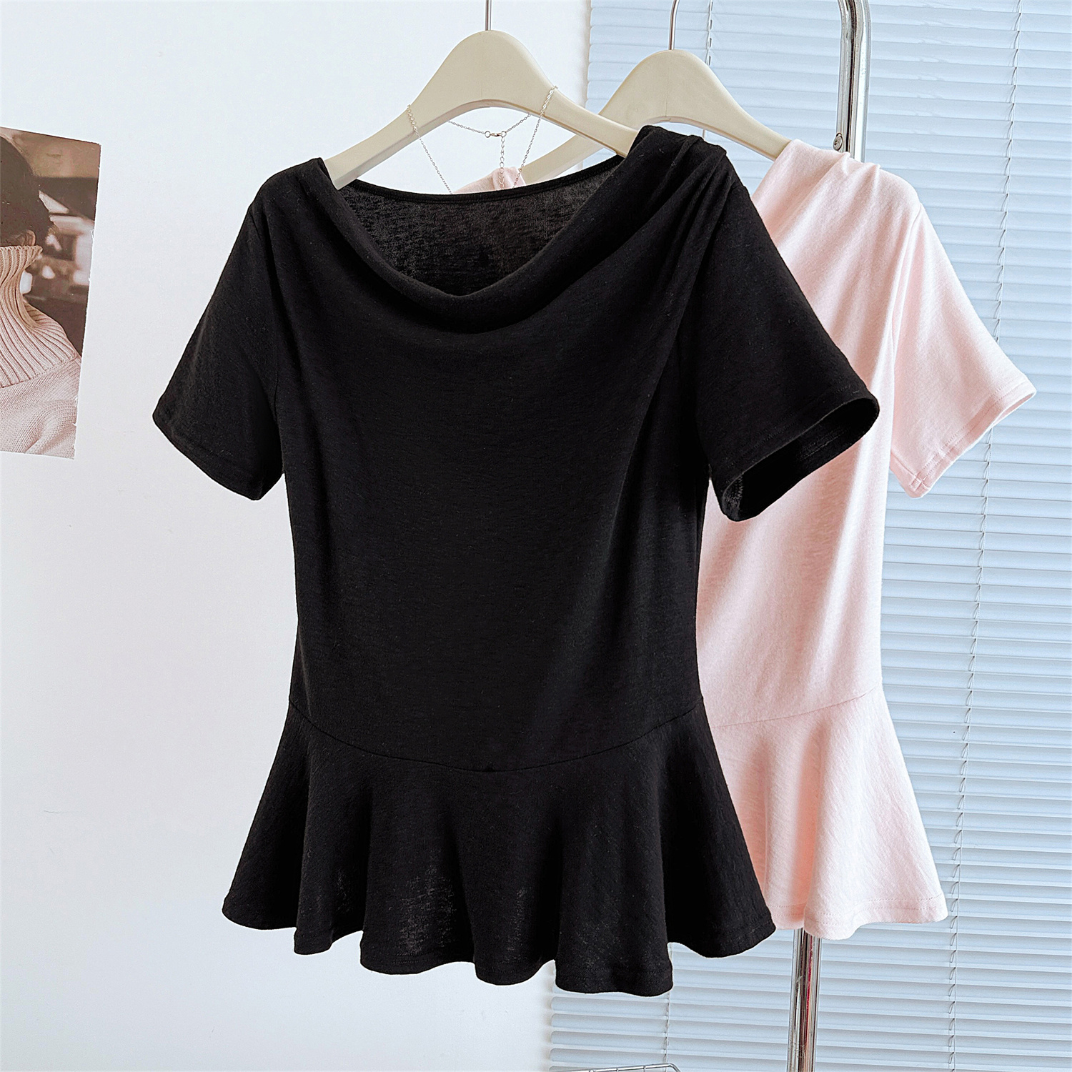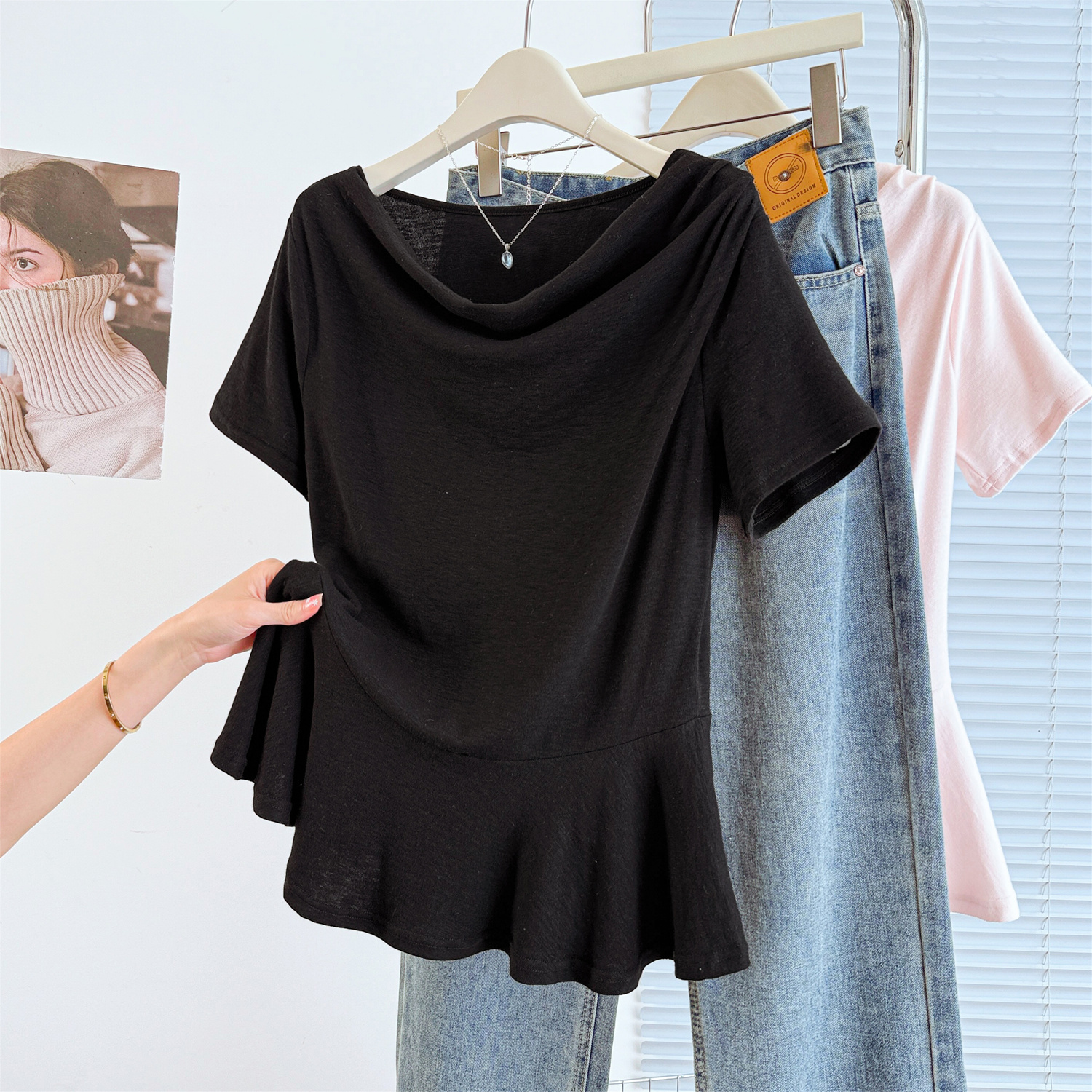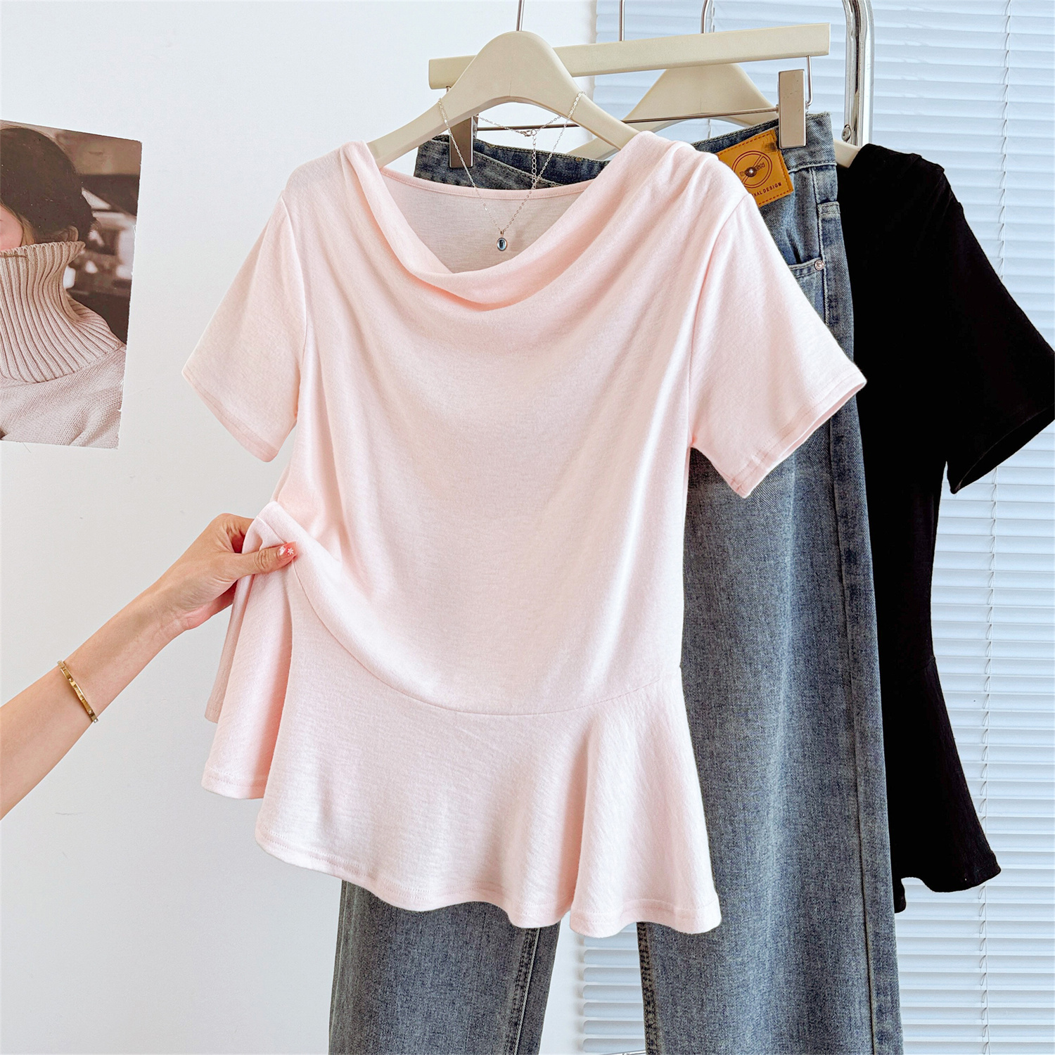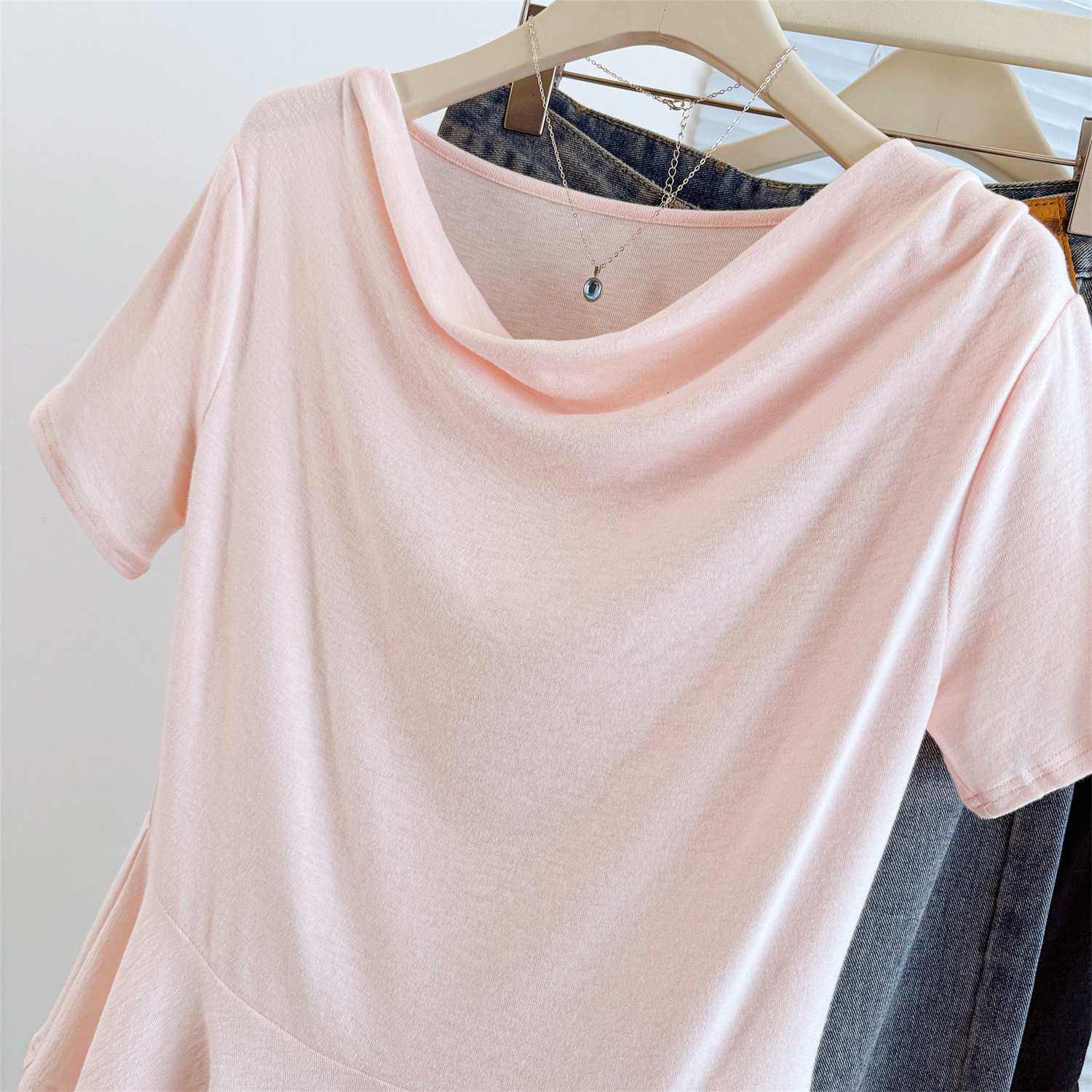 RY2455# 实拍大码女装夏季新不规则荡领气质甜美显瘦百搭短袖上衣