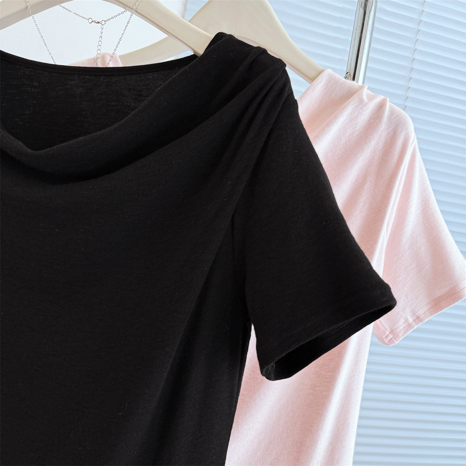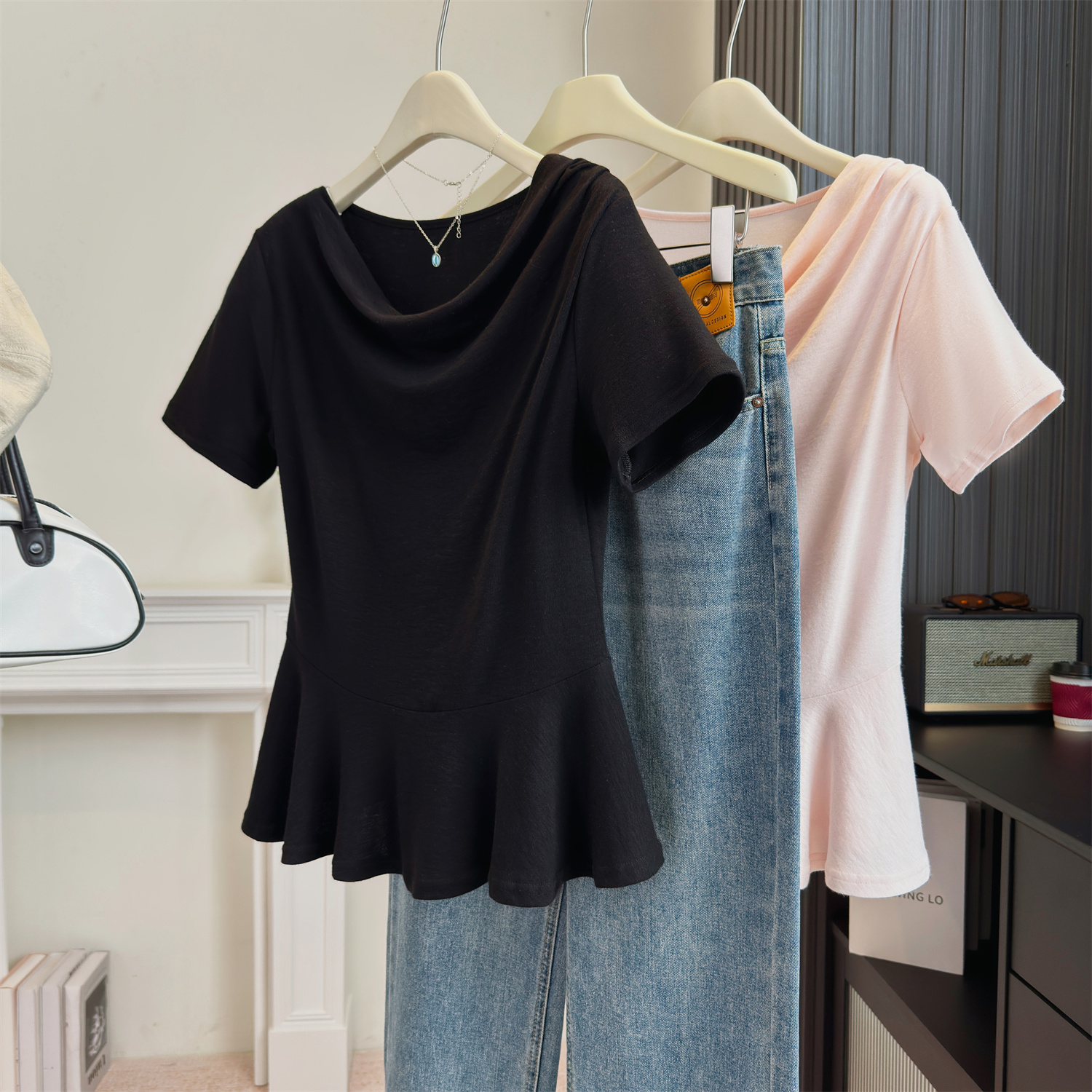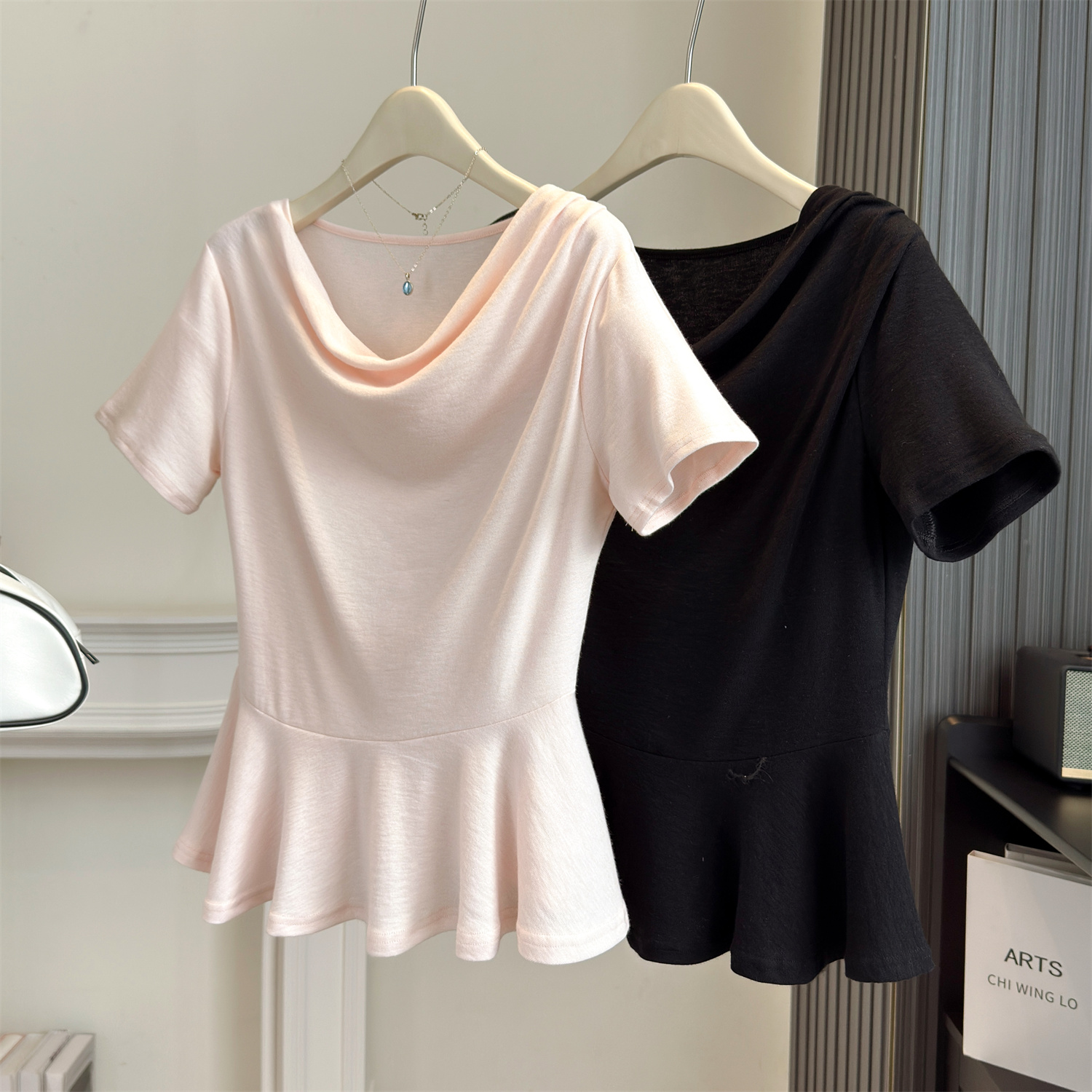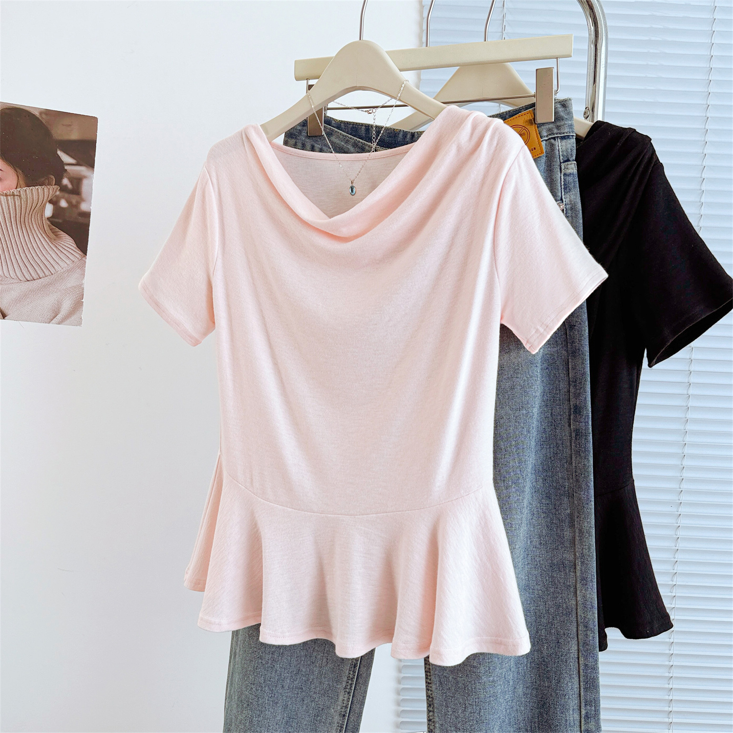 RY2455# 实拍大码女装夏季新不规则荡领气质甜美显瘦百搭短袖上衣