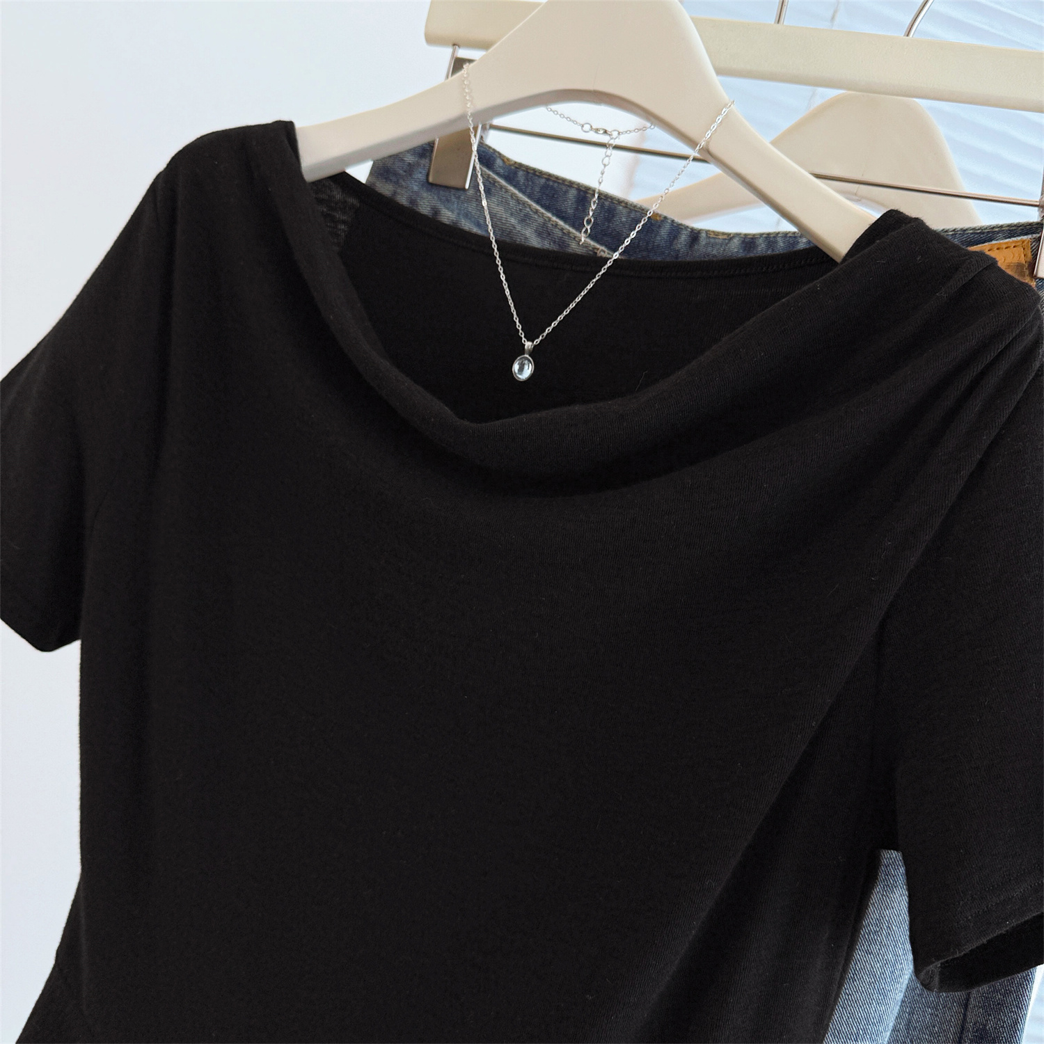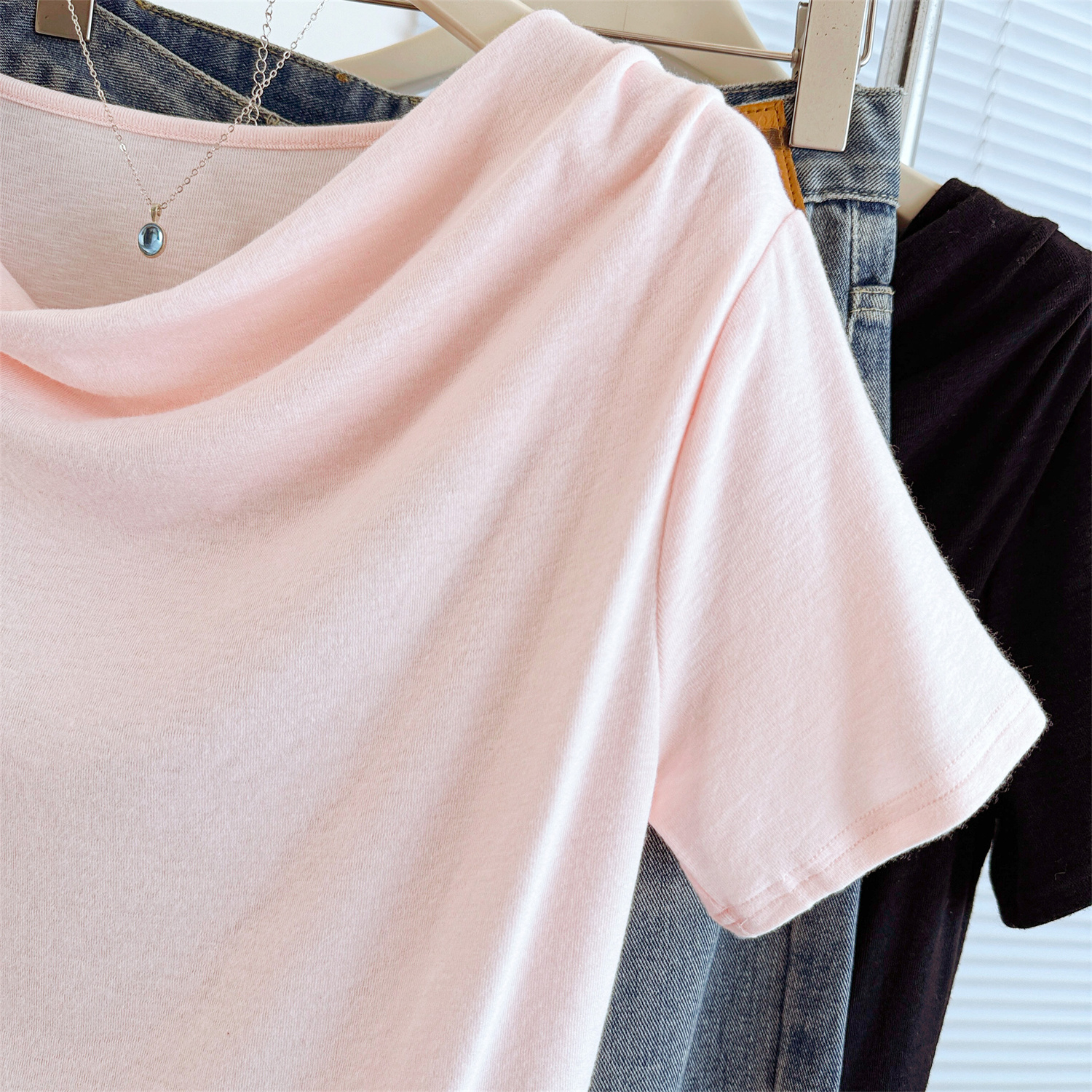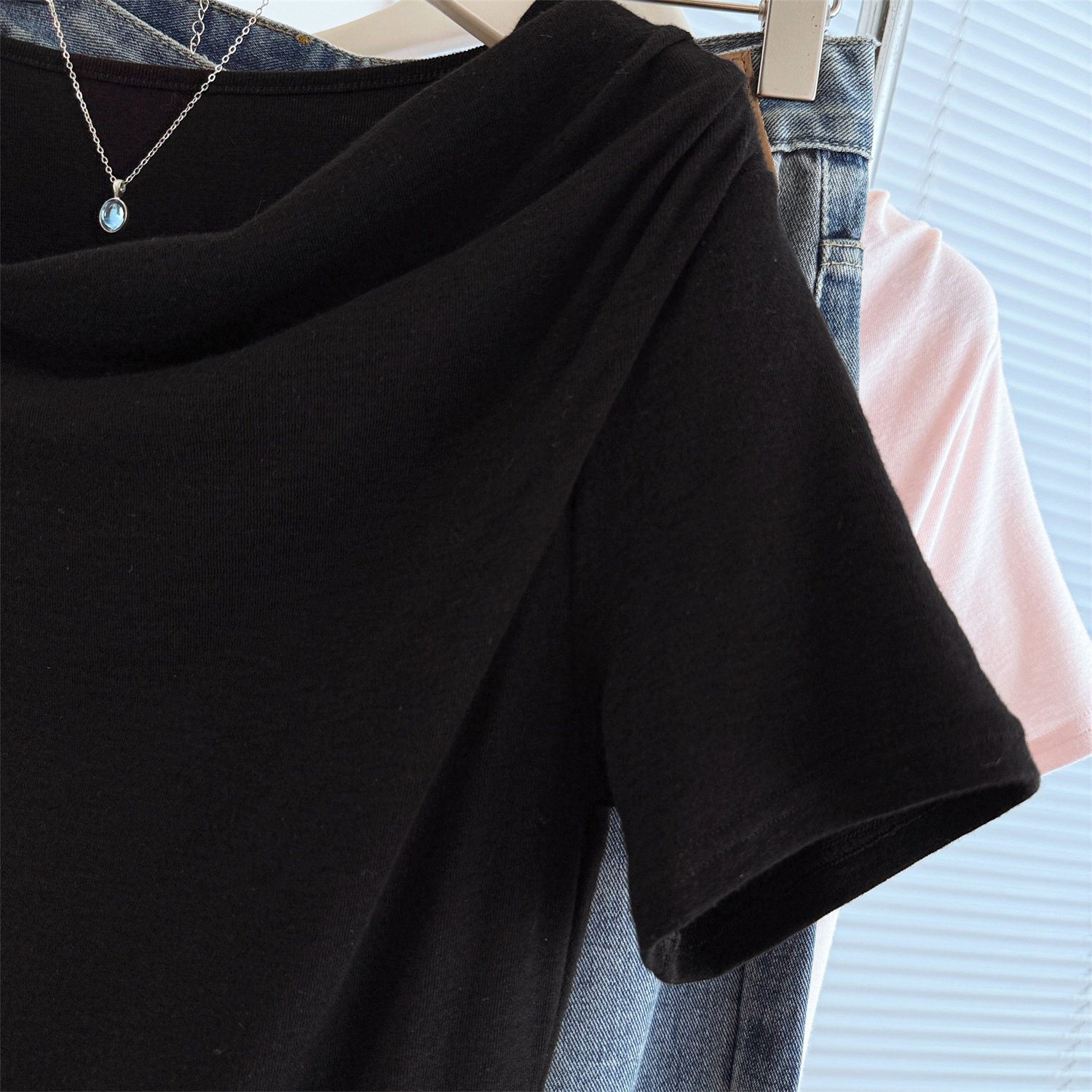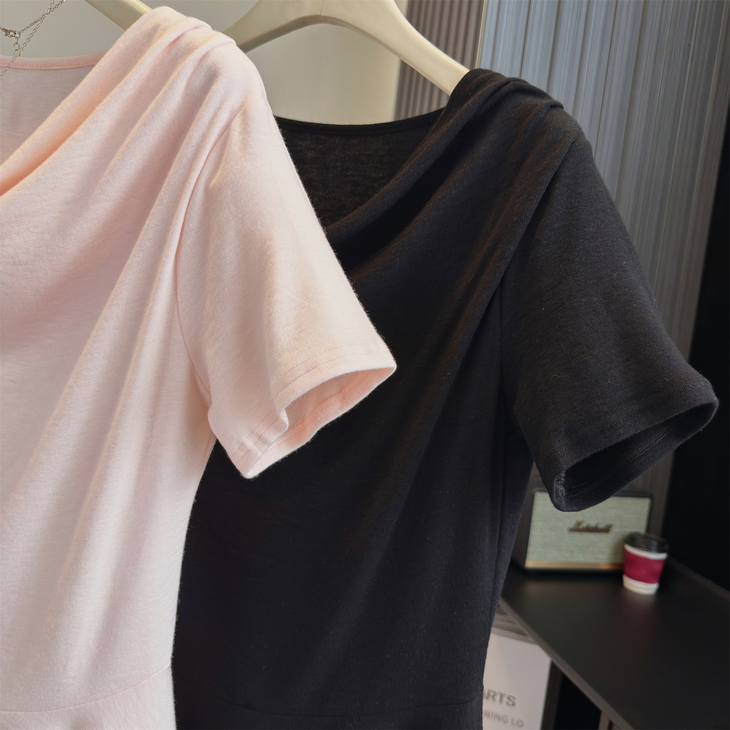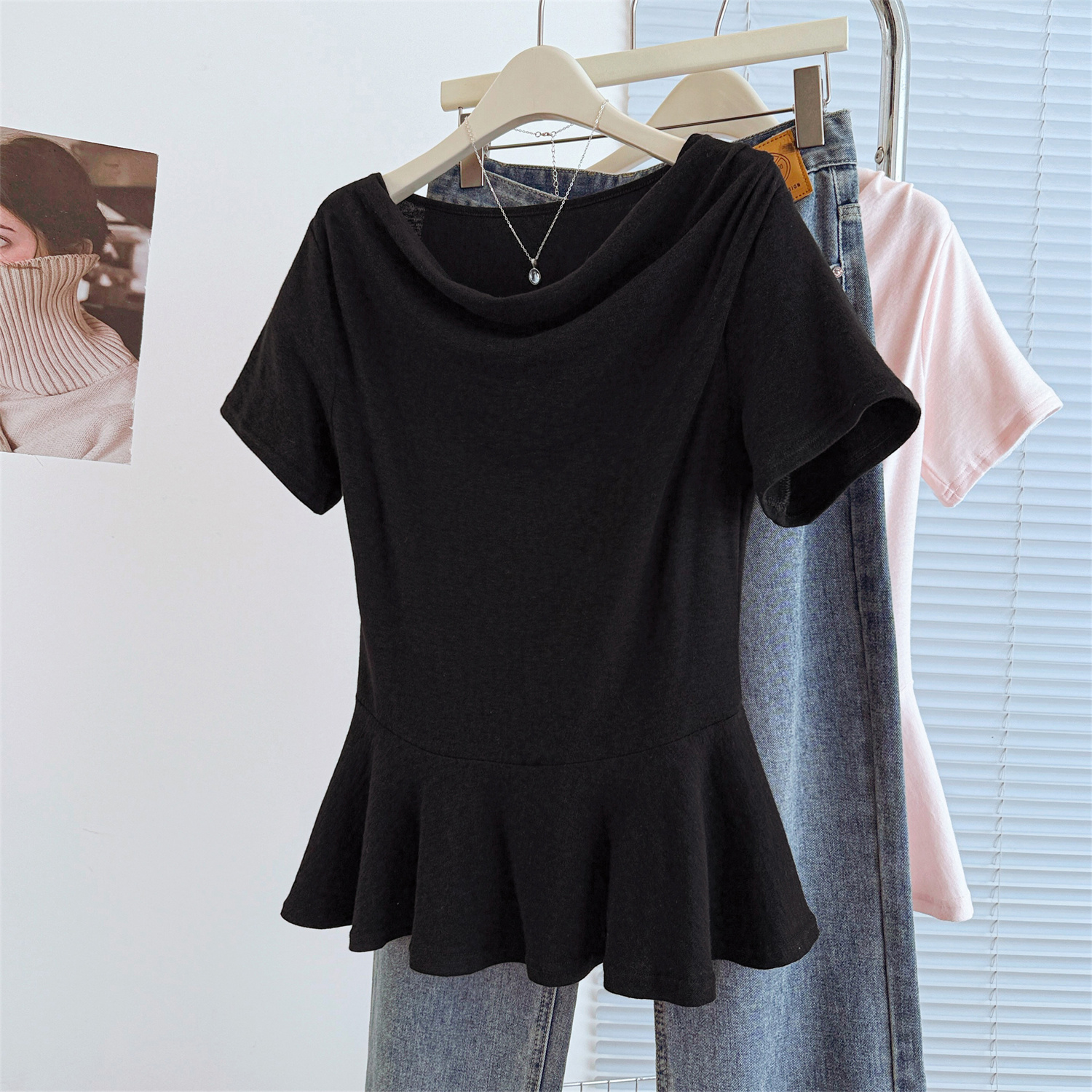 RY2455# 实拍大码女装夏季新不规则荡领气质甜美显瘦百搭短袖上衣
