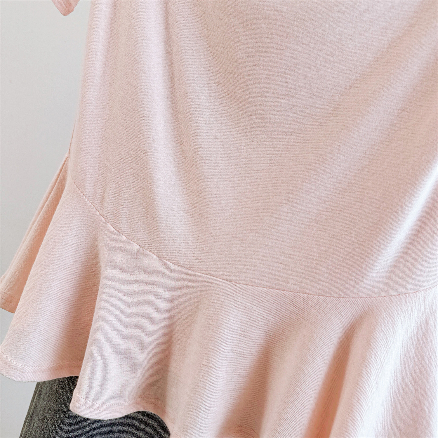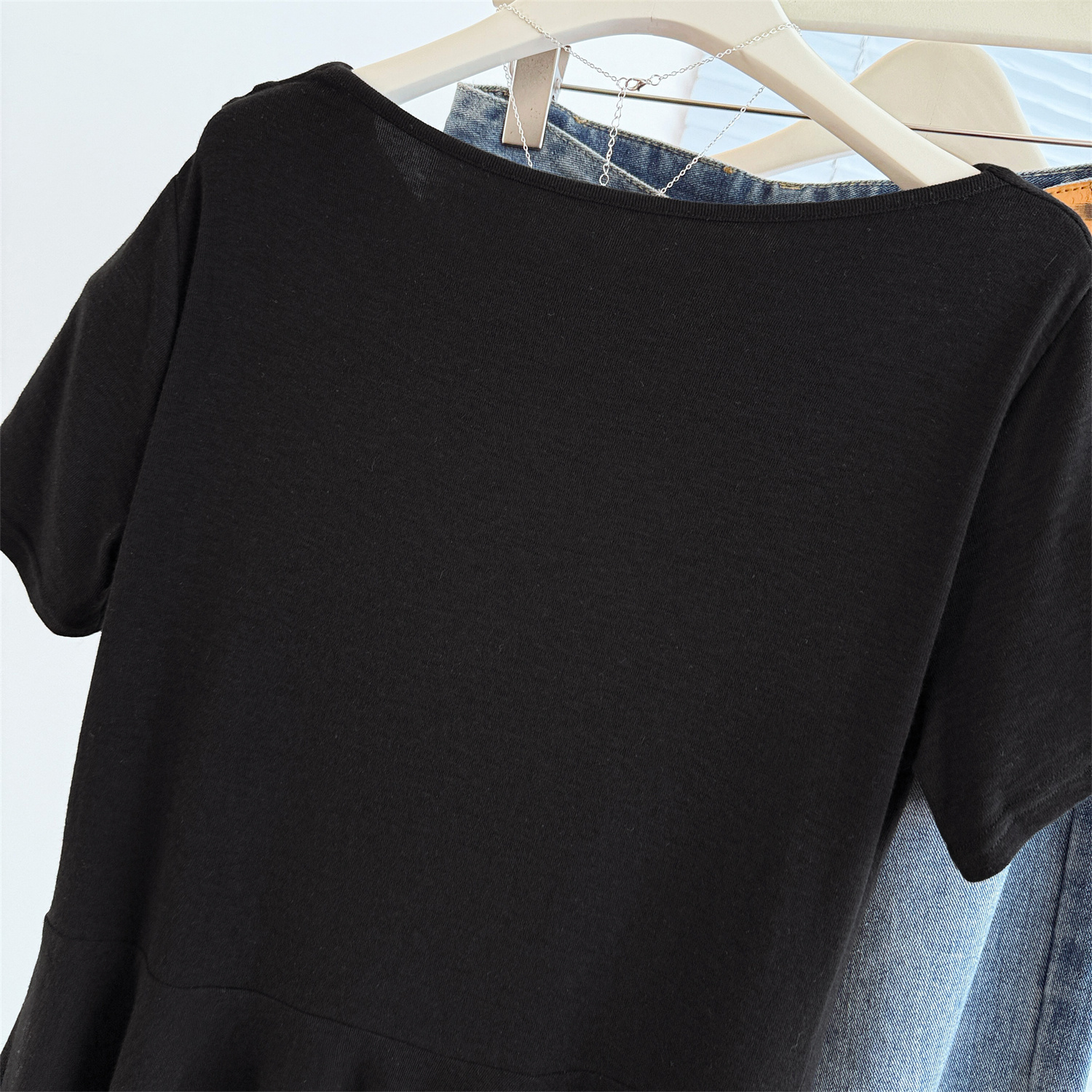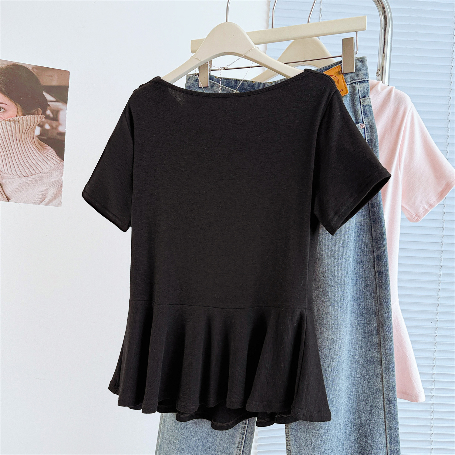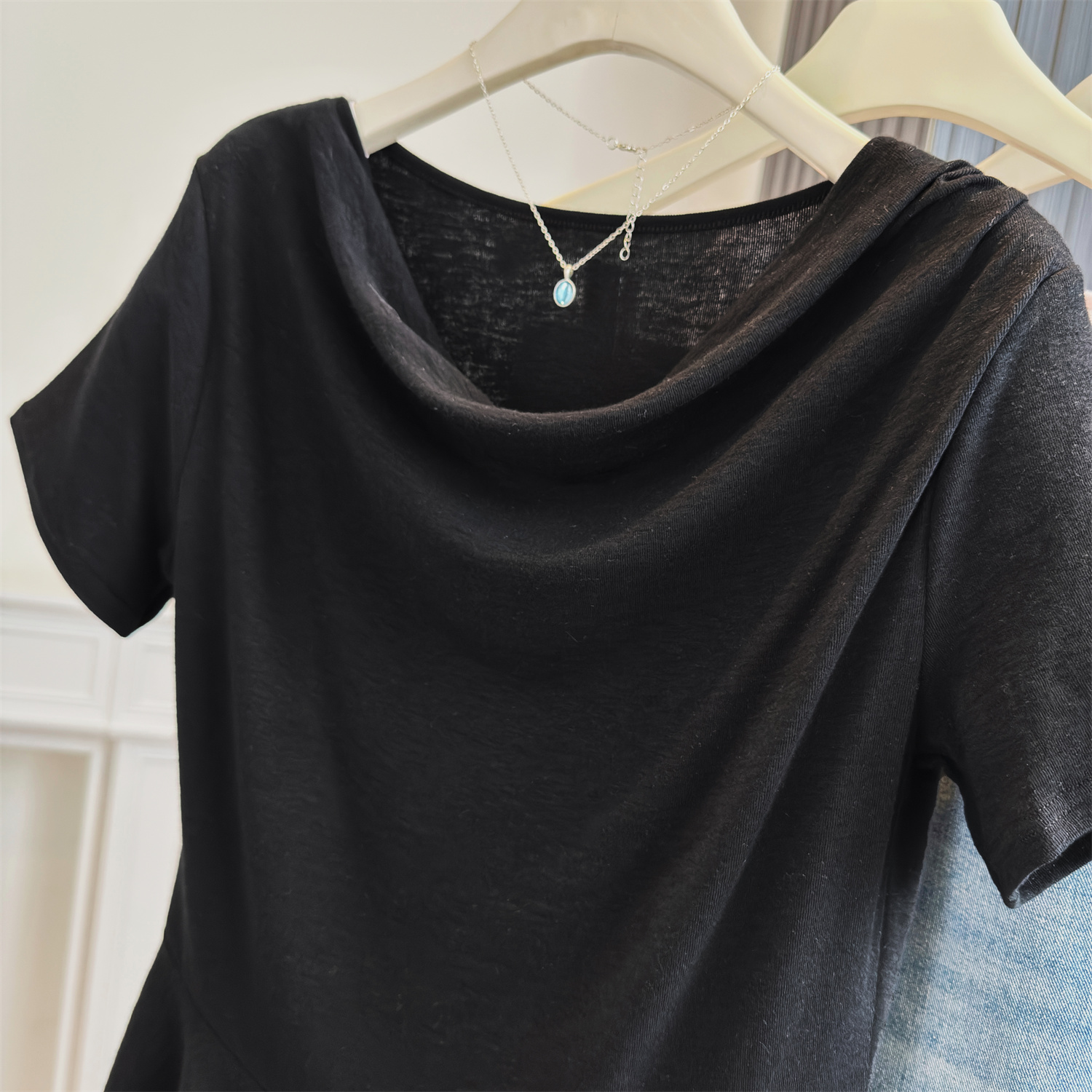 RY2455# 实拍大码女装夏季新不规则荡领气质甜美显瘦百搭短袖上衣