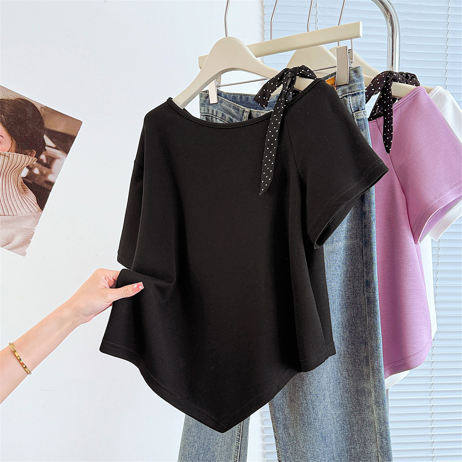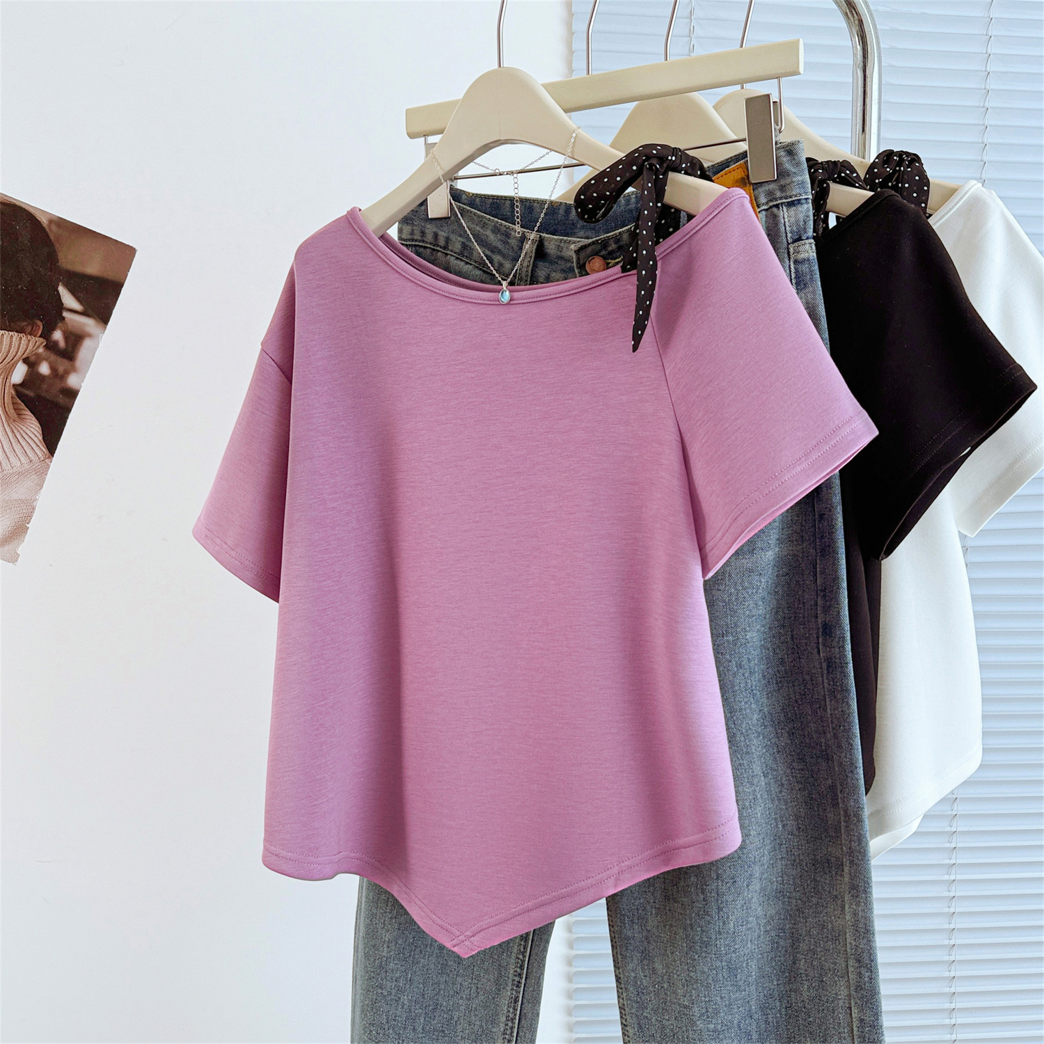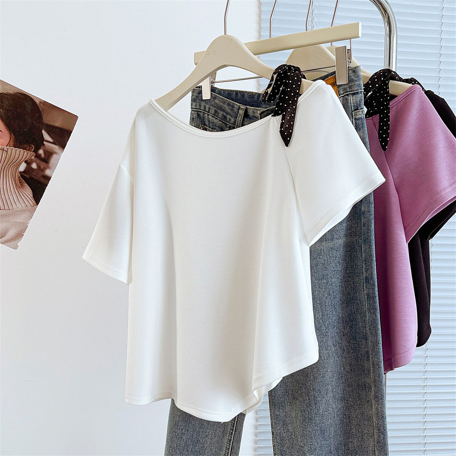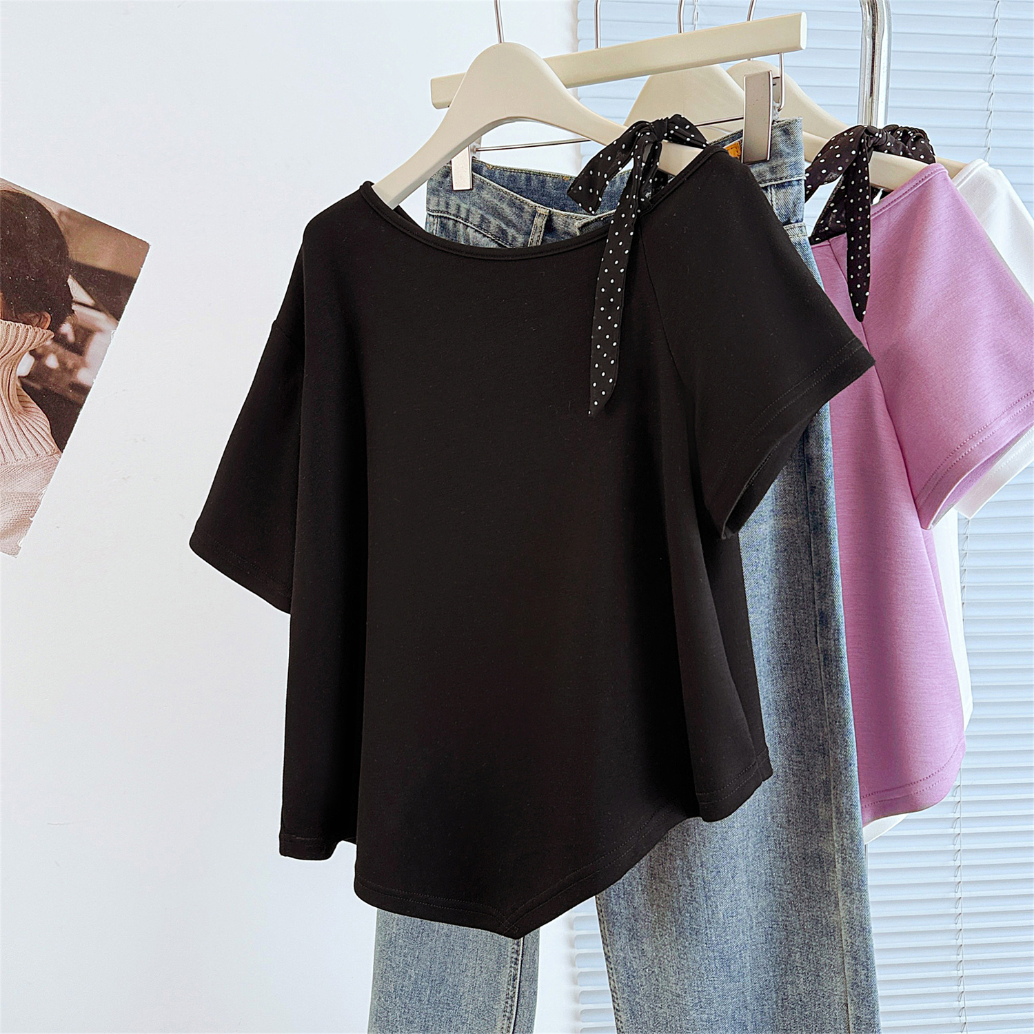 RY2456# 实拍大码女韩版高级感潮流斜肩绑带不规则下摆设计感显瘦宽松上衣