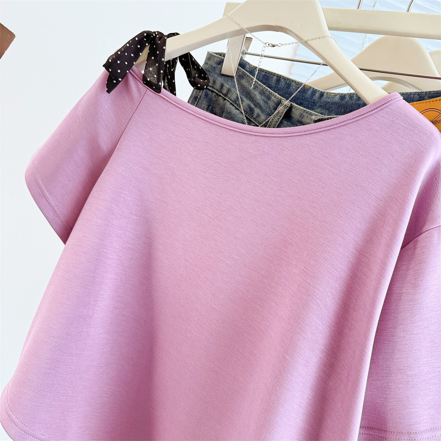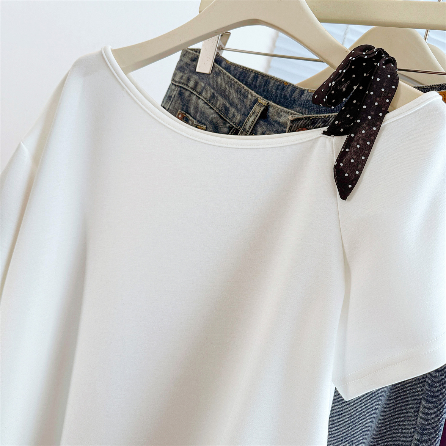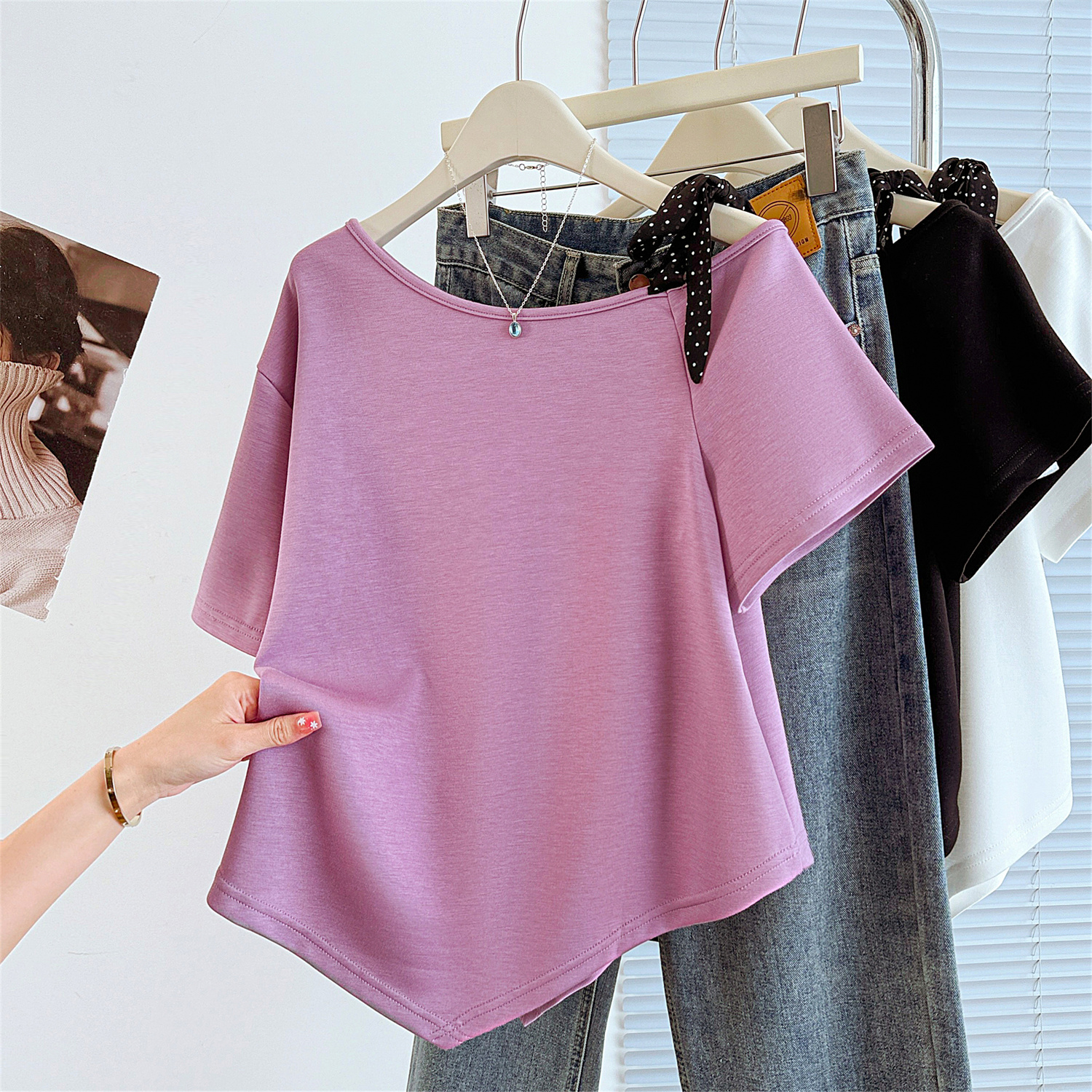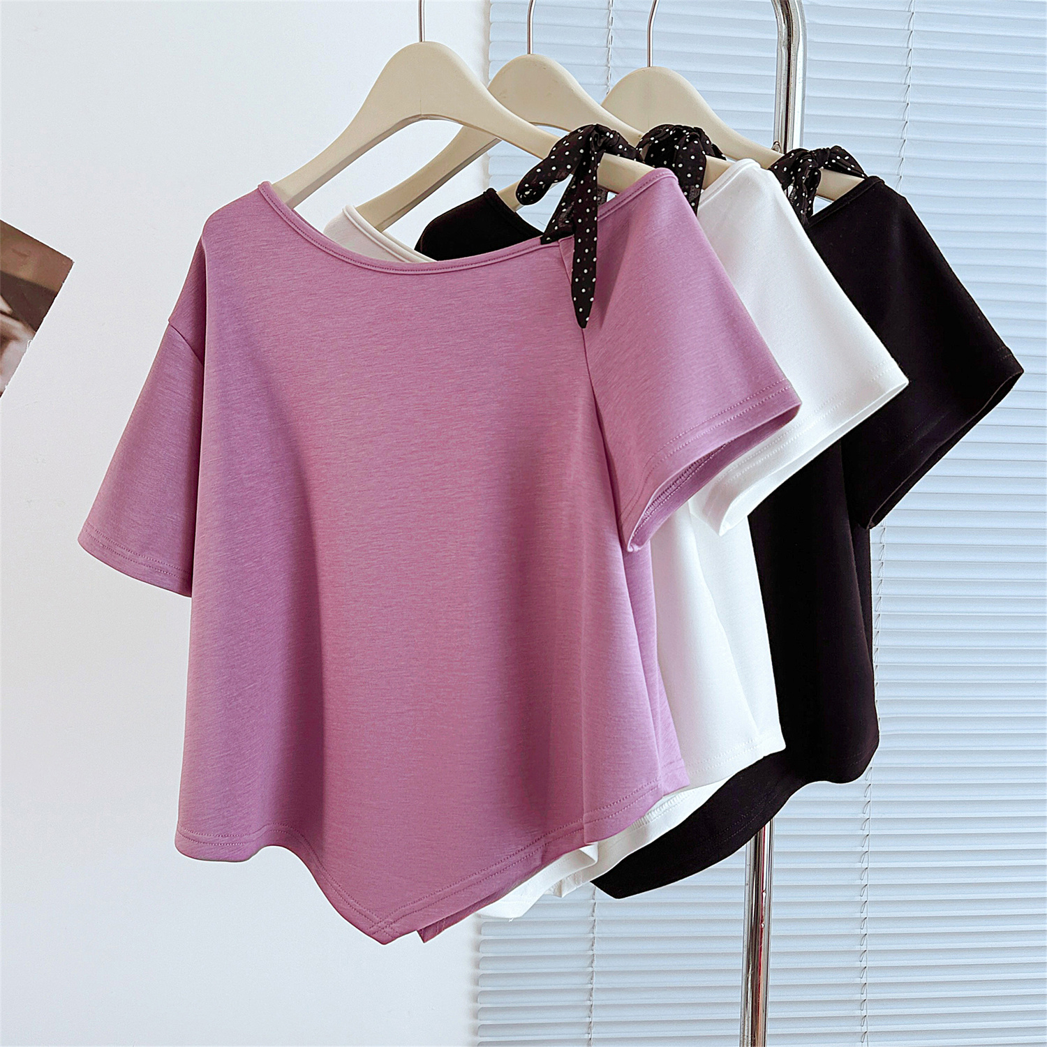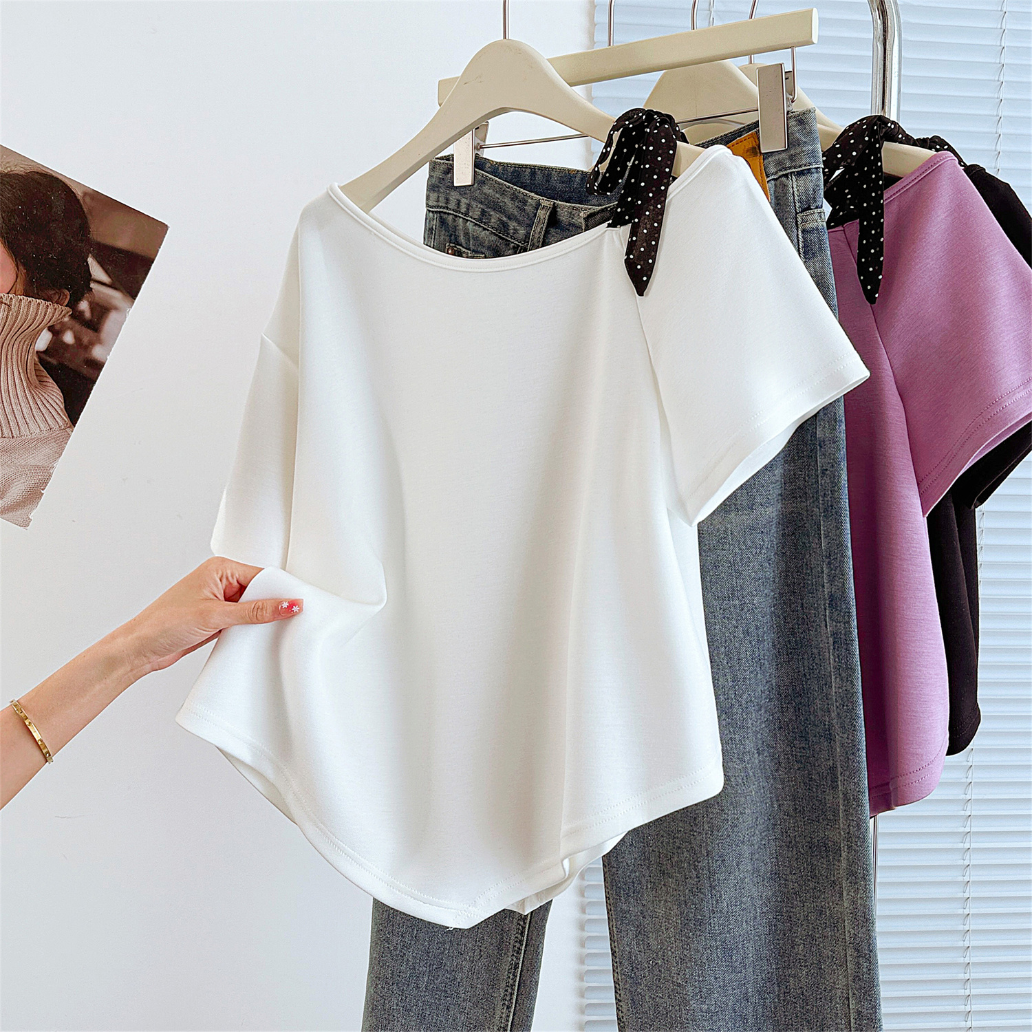 RY2456# 实拍大码女韩版高级感潮流斜肩绑带不规则下摆设计感显瘦宽松上衣