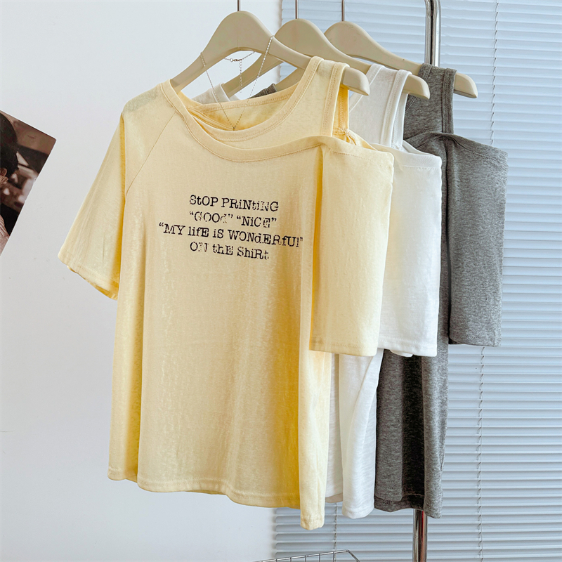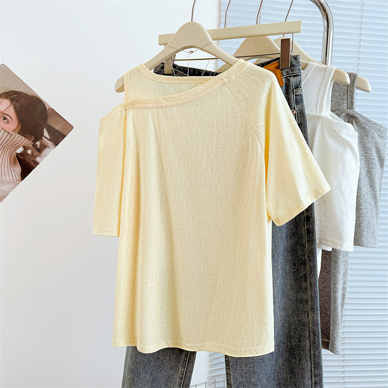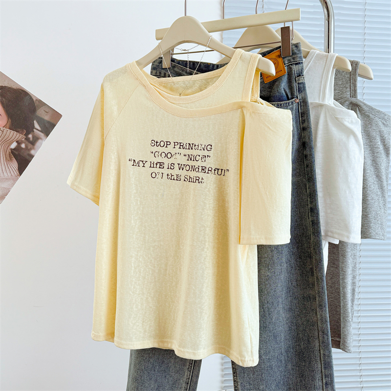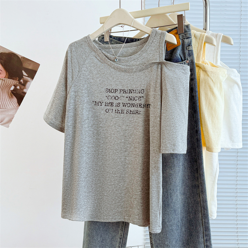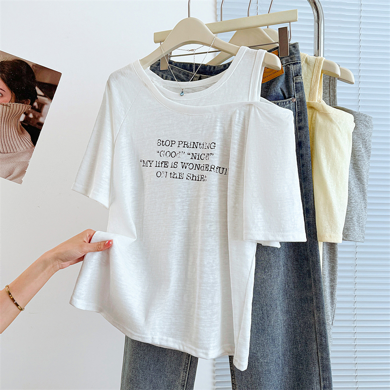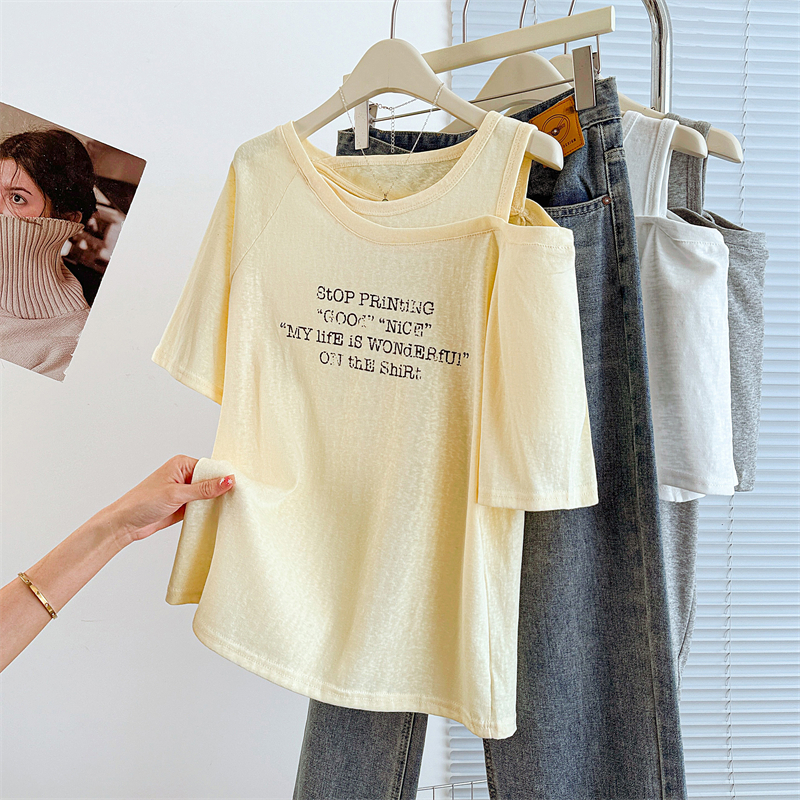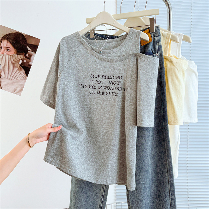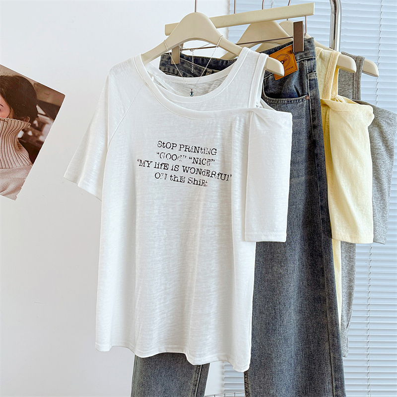 RY2459# 实拍大码女装夏季新款露肩设计字母百搭针织棉T宽松显瘦休闲上衣
