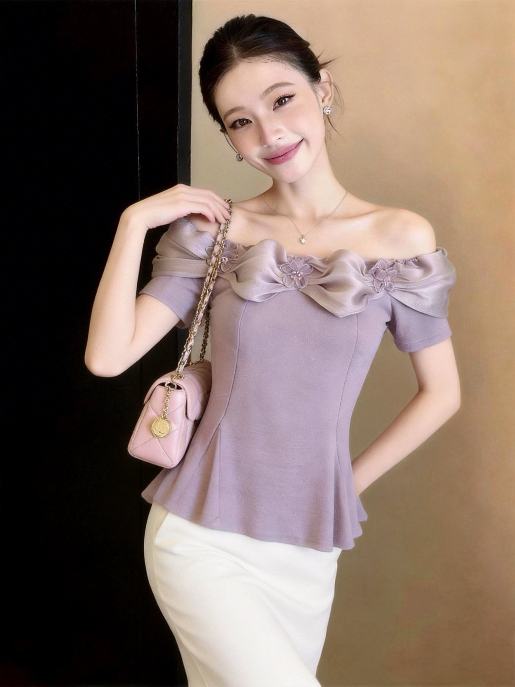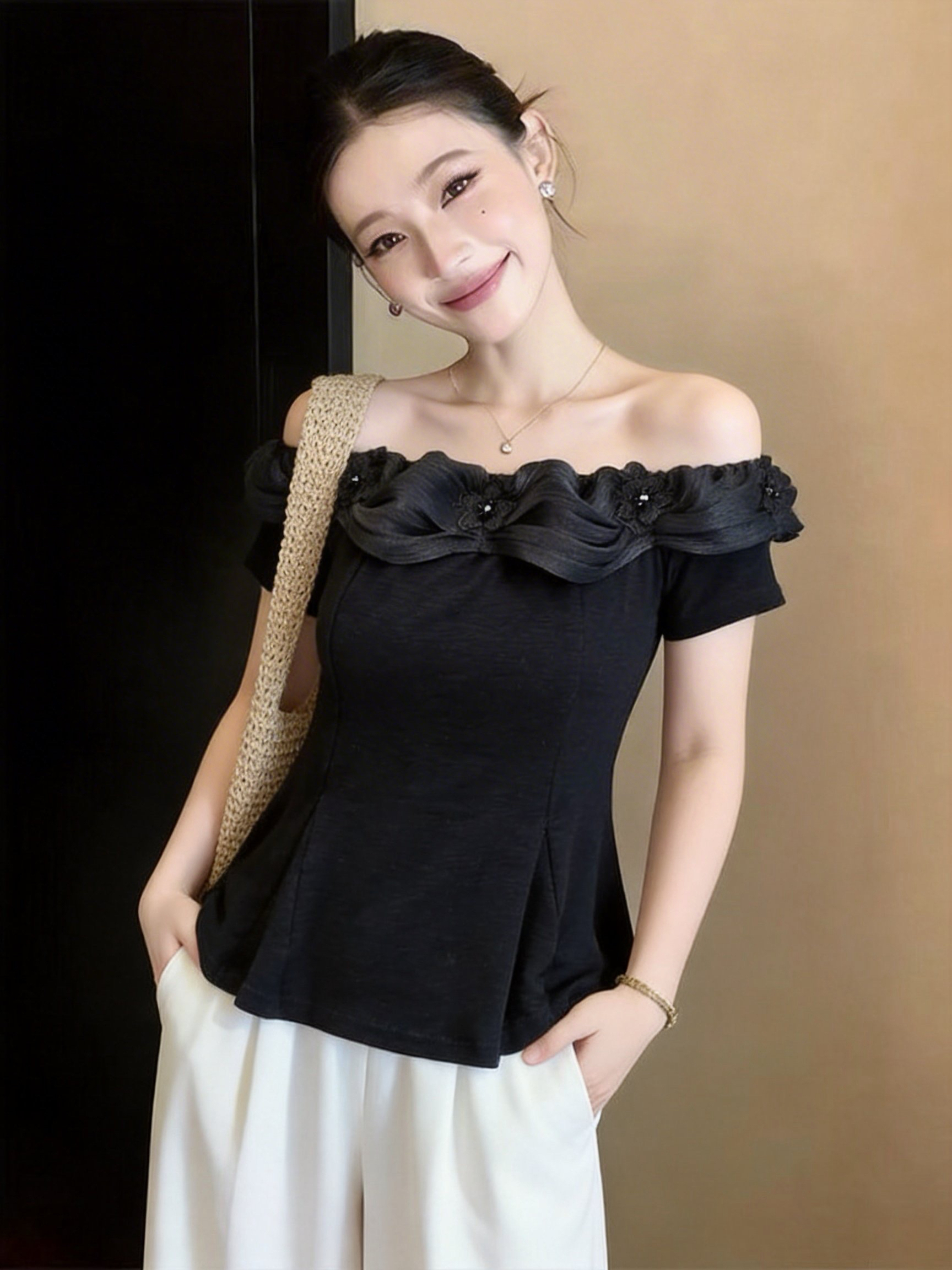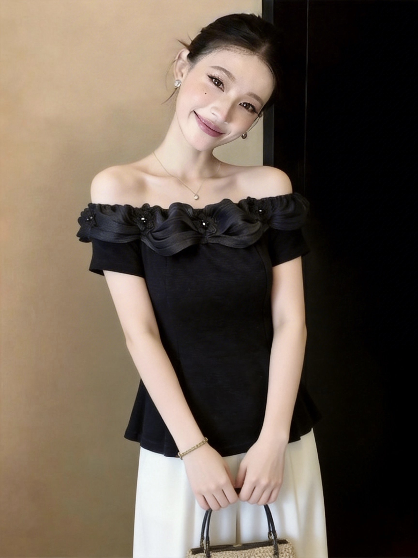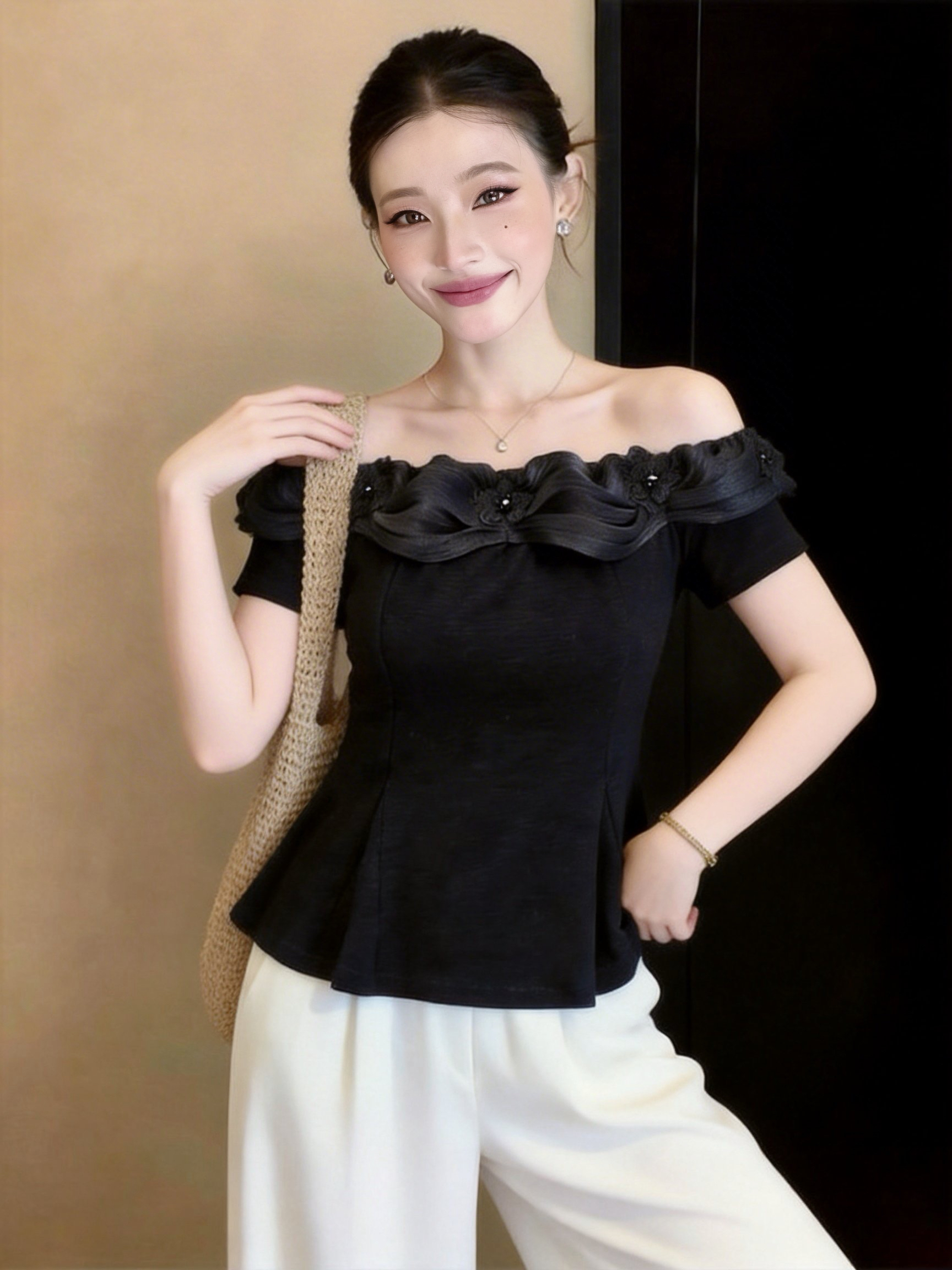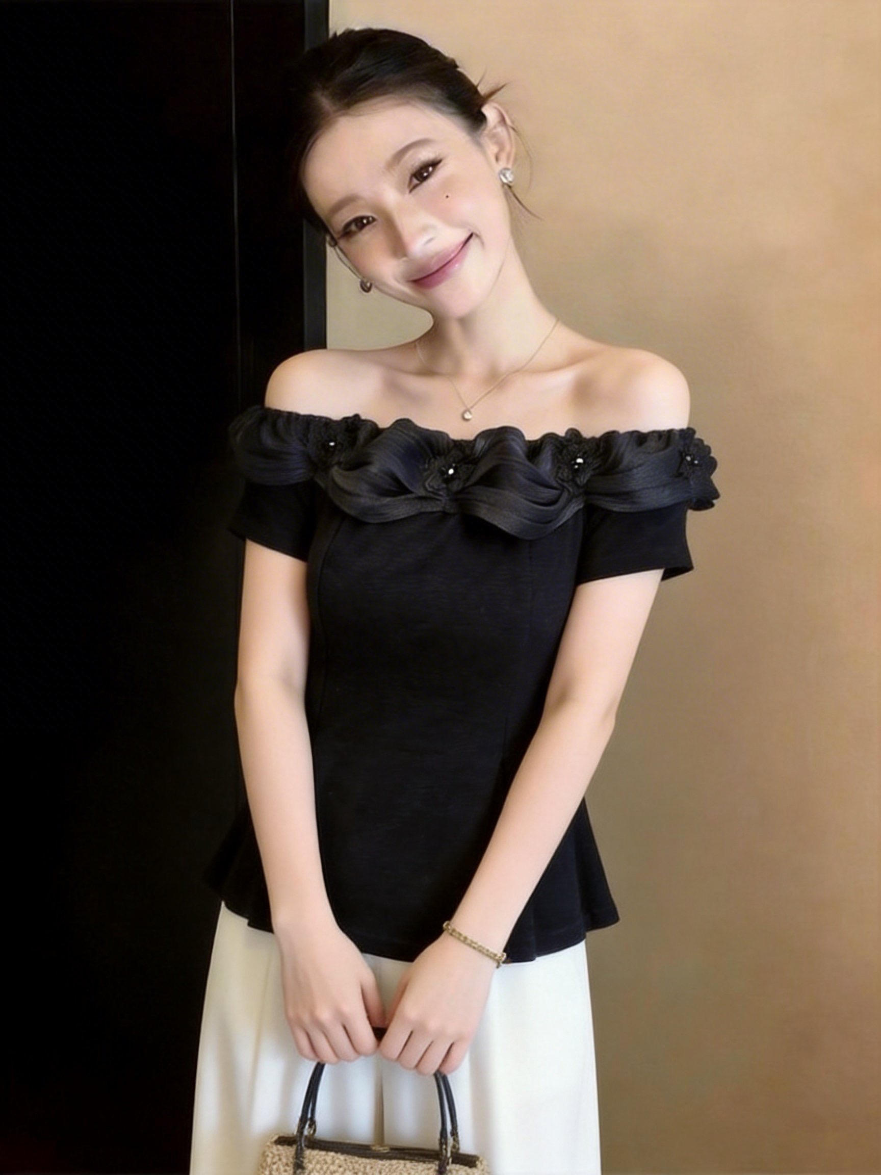 RY2460# 实拍大码女装夏新款名媛风时尚一字肩琉璃珠光纱重工珠花高端上衣