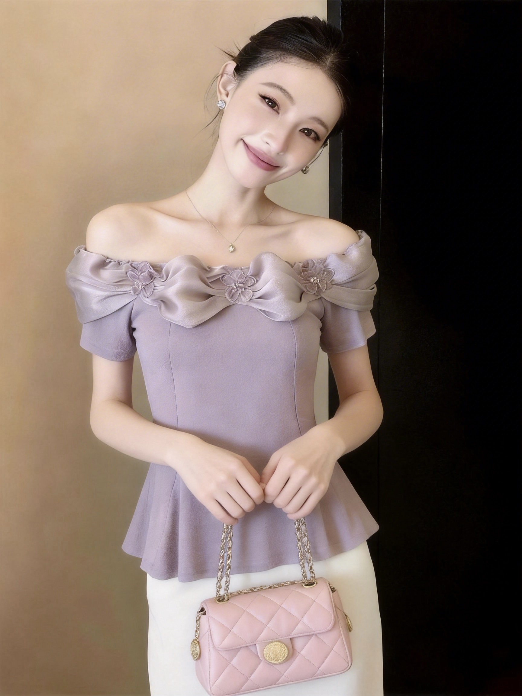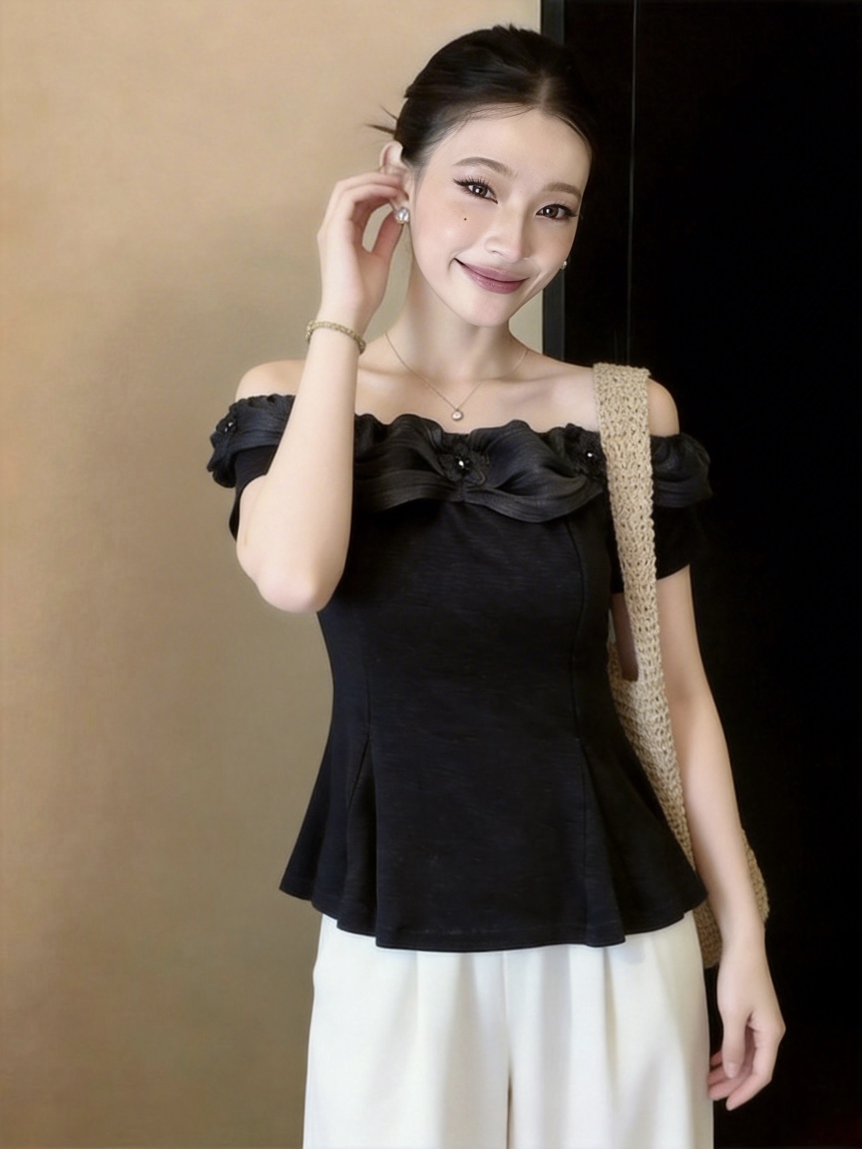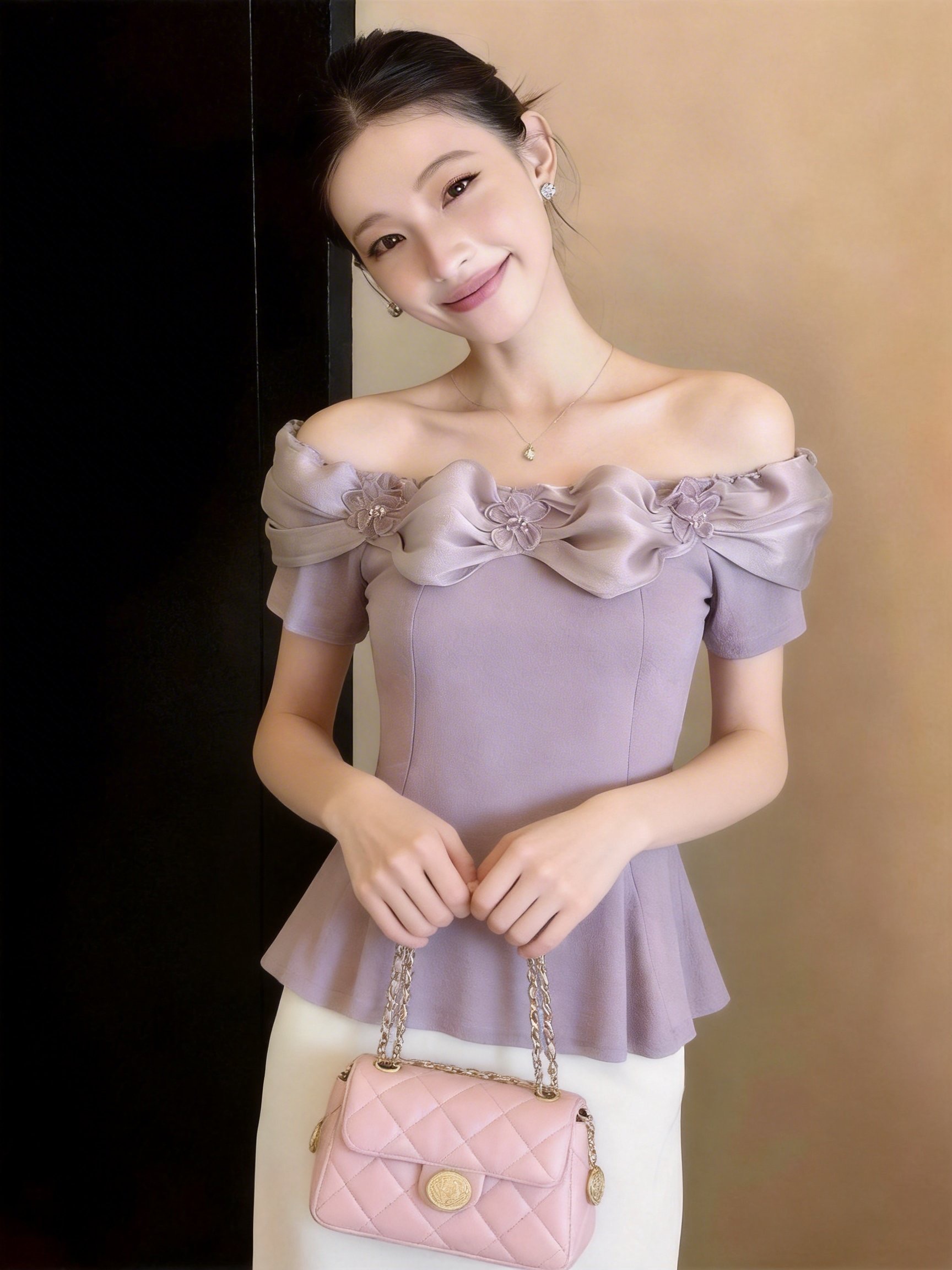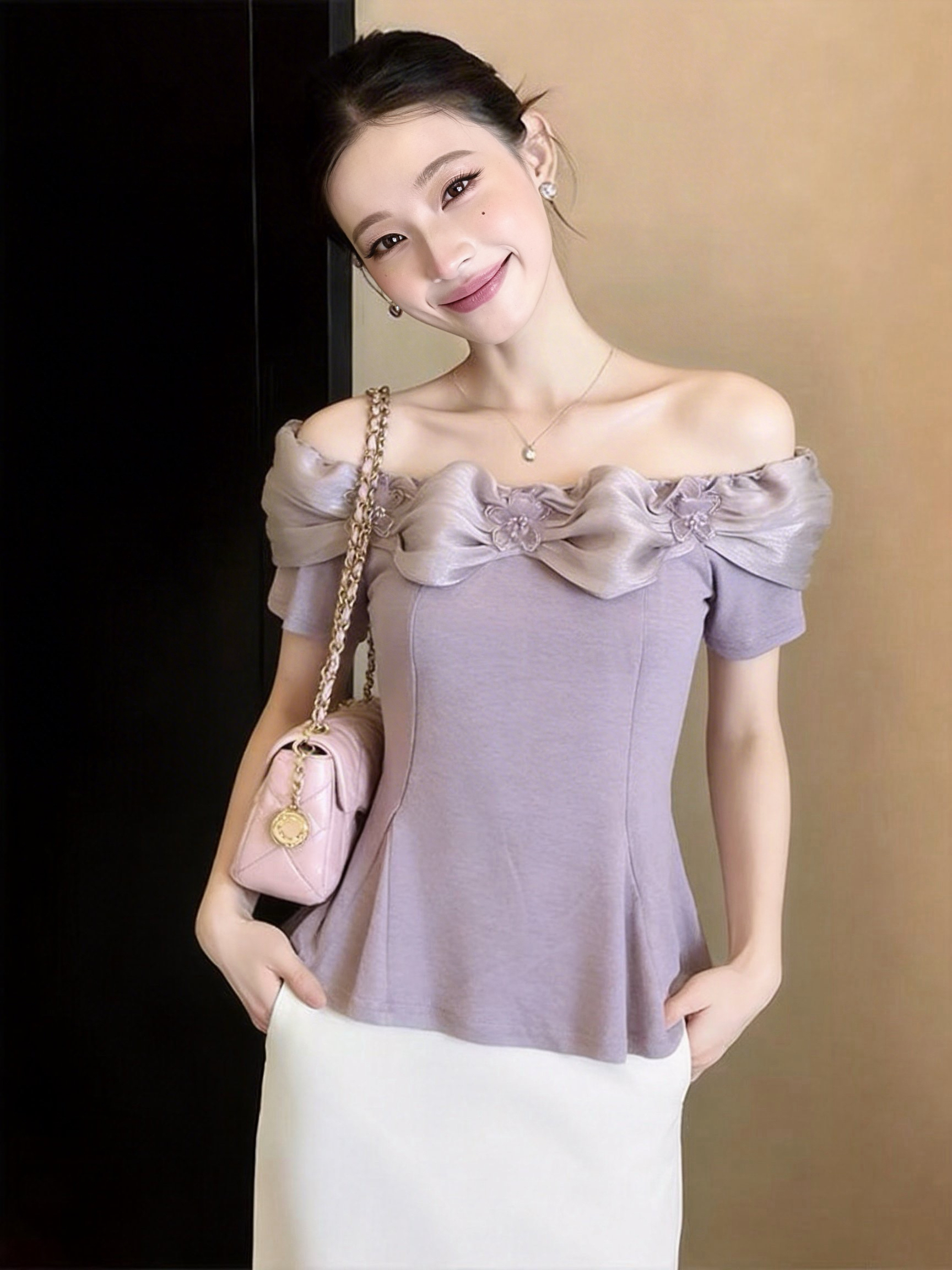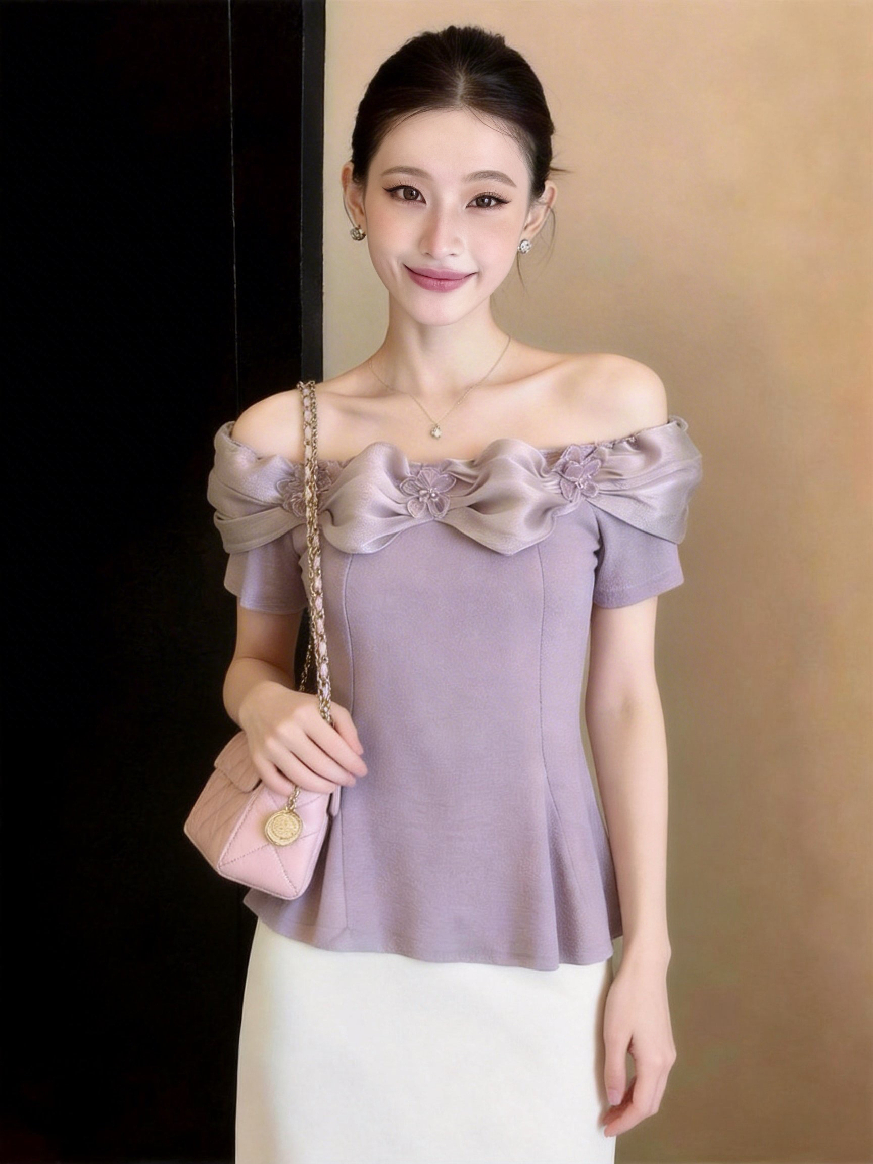 RY2460# 实拍大码女装夏新款名媛风时尚一字肩琉璃珠光纱重工珠花高端上衣
