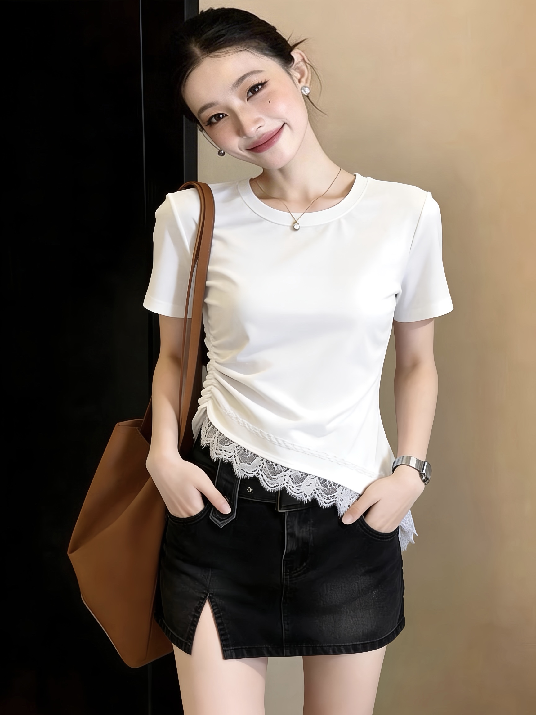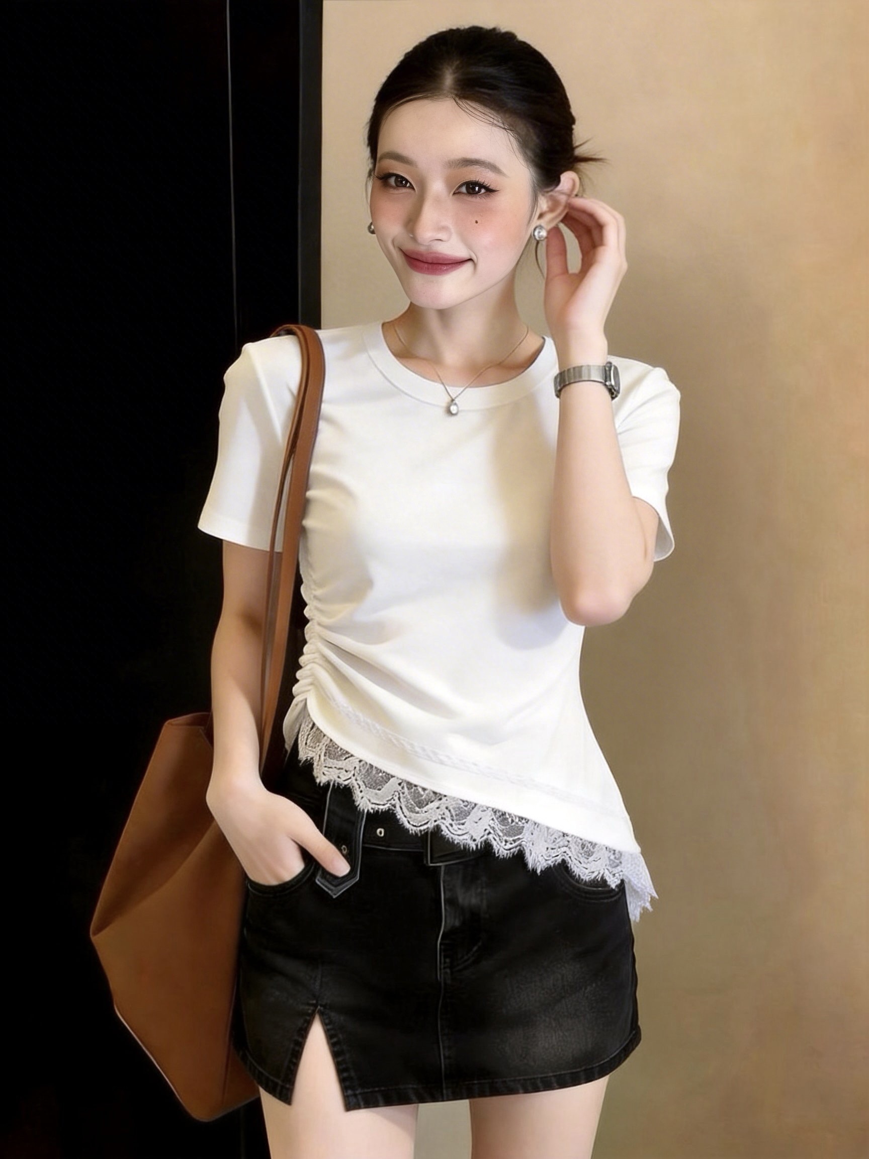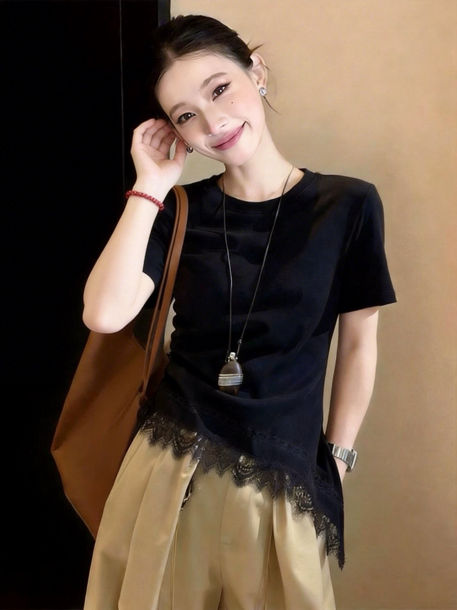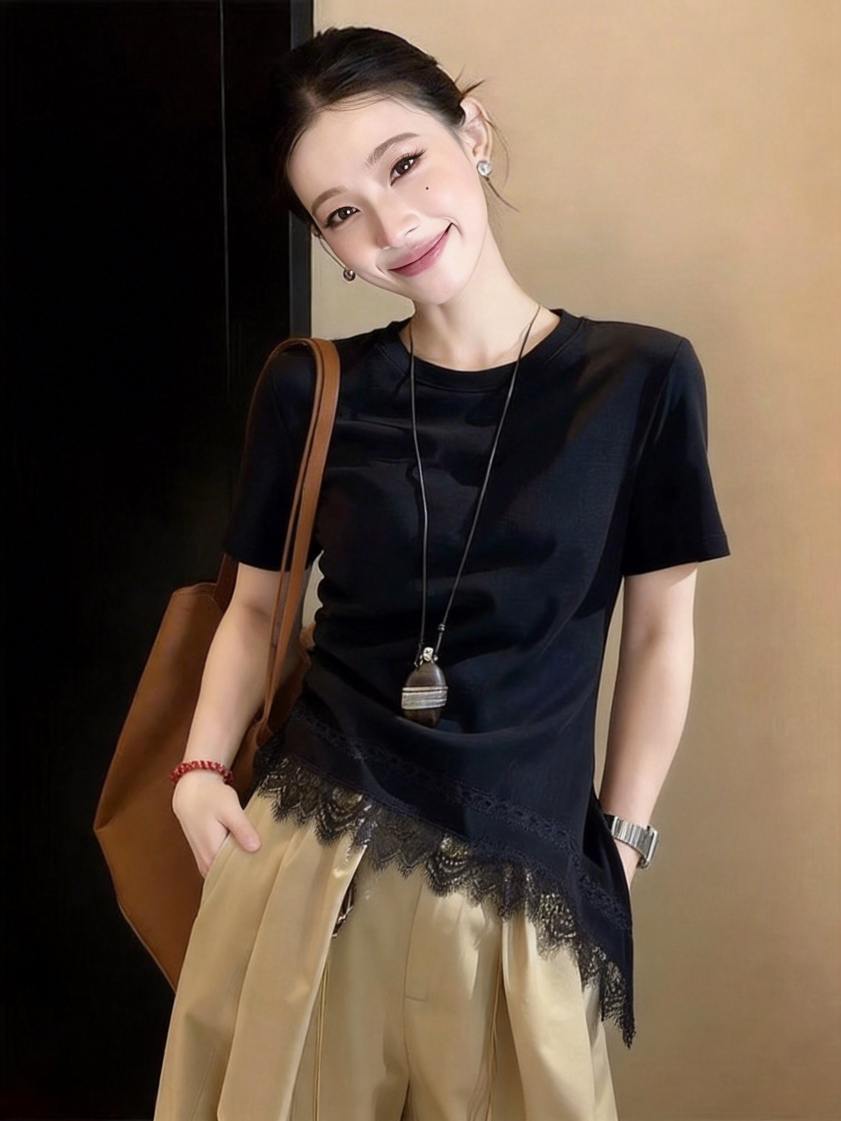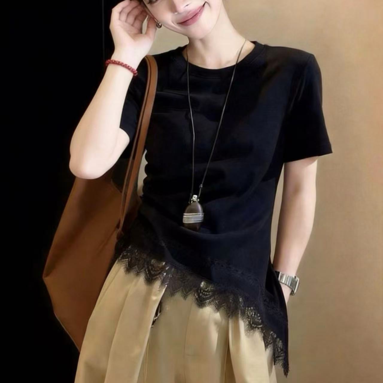 RY2467# 实拍大码2026春夏新款洋气显瘦蕾丝花边拼接斜边下摆正肩短袖T恤