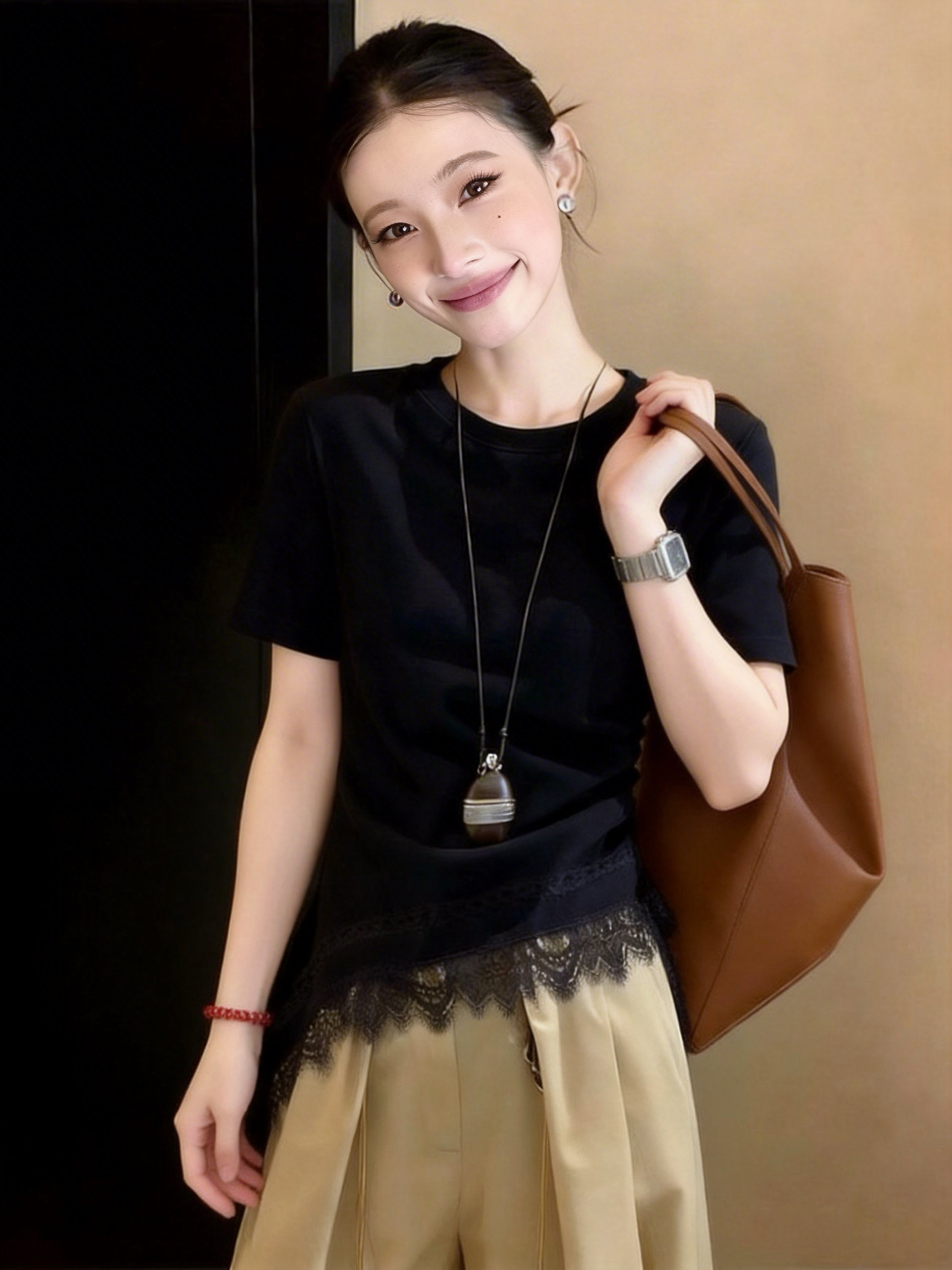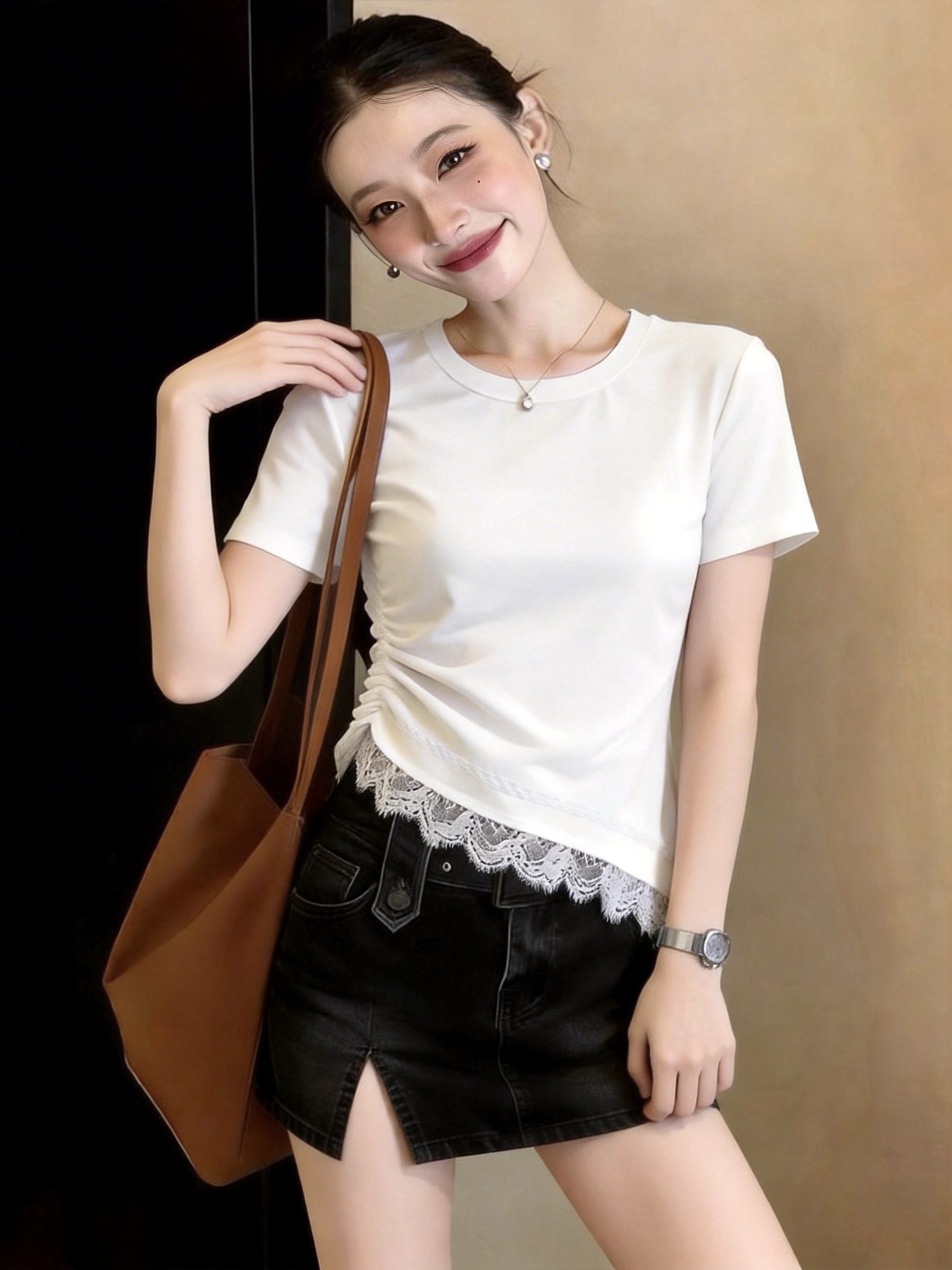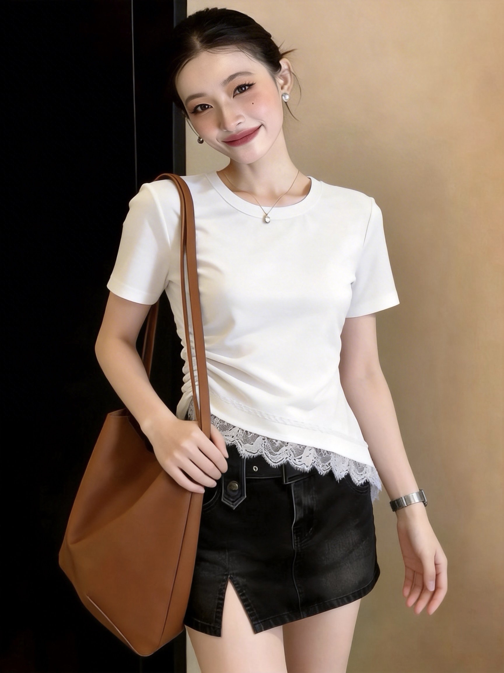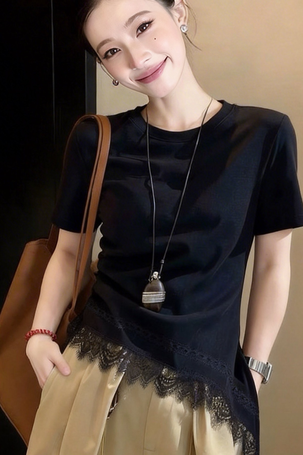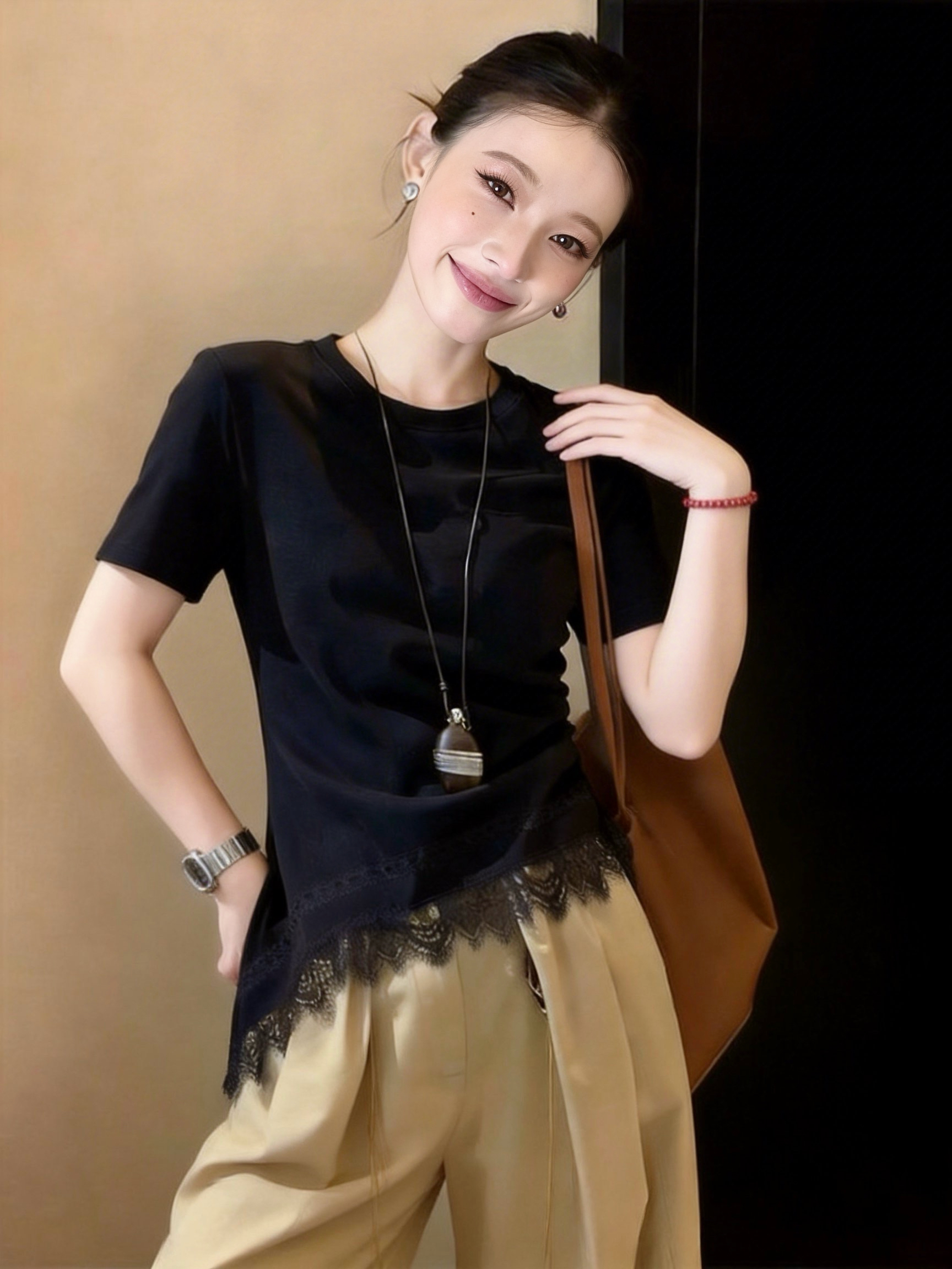 RY2467# 实拍大码2026春夏新款洋气显瘦蕾丝花边拼接斜边下摆正肩短袖T恤