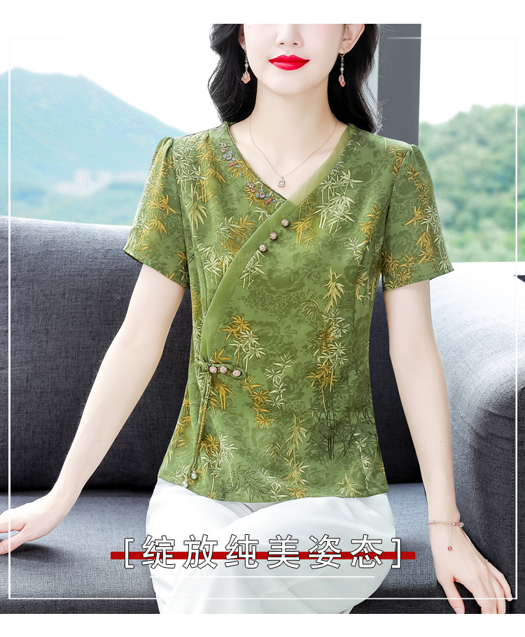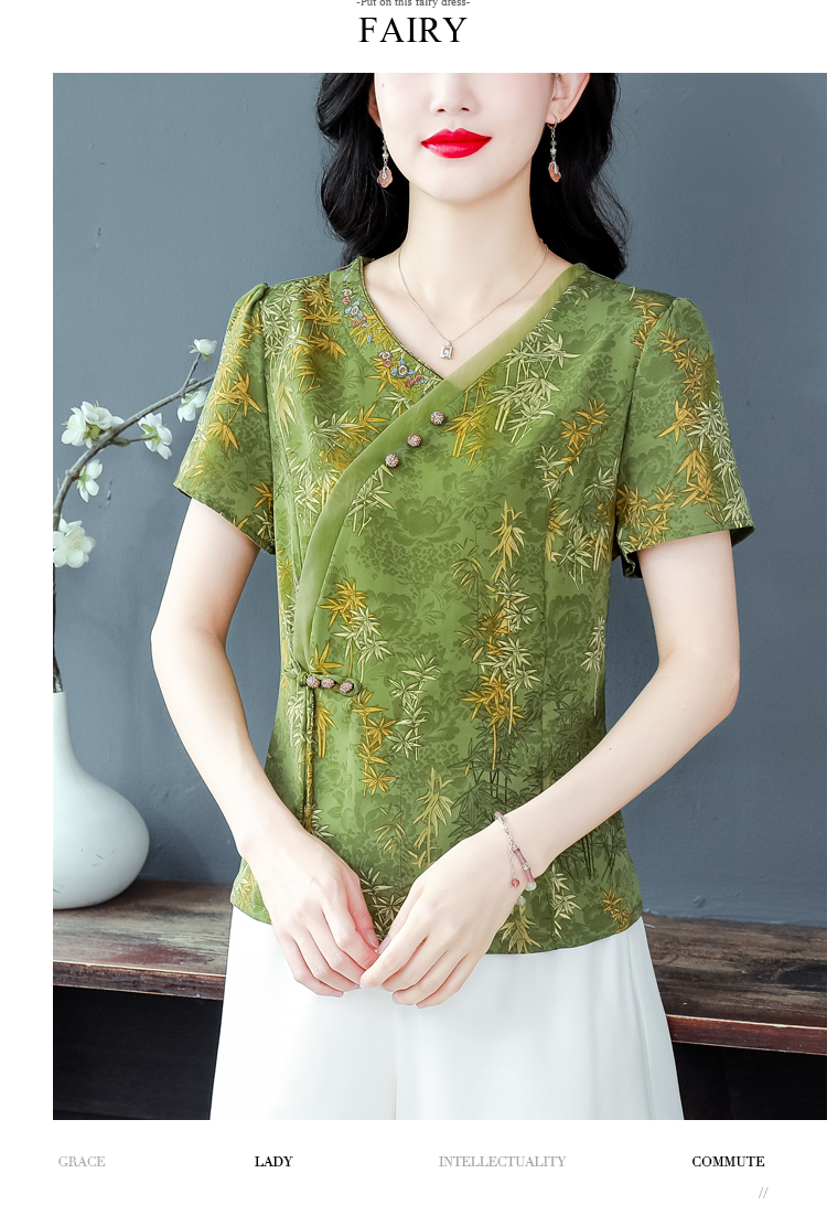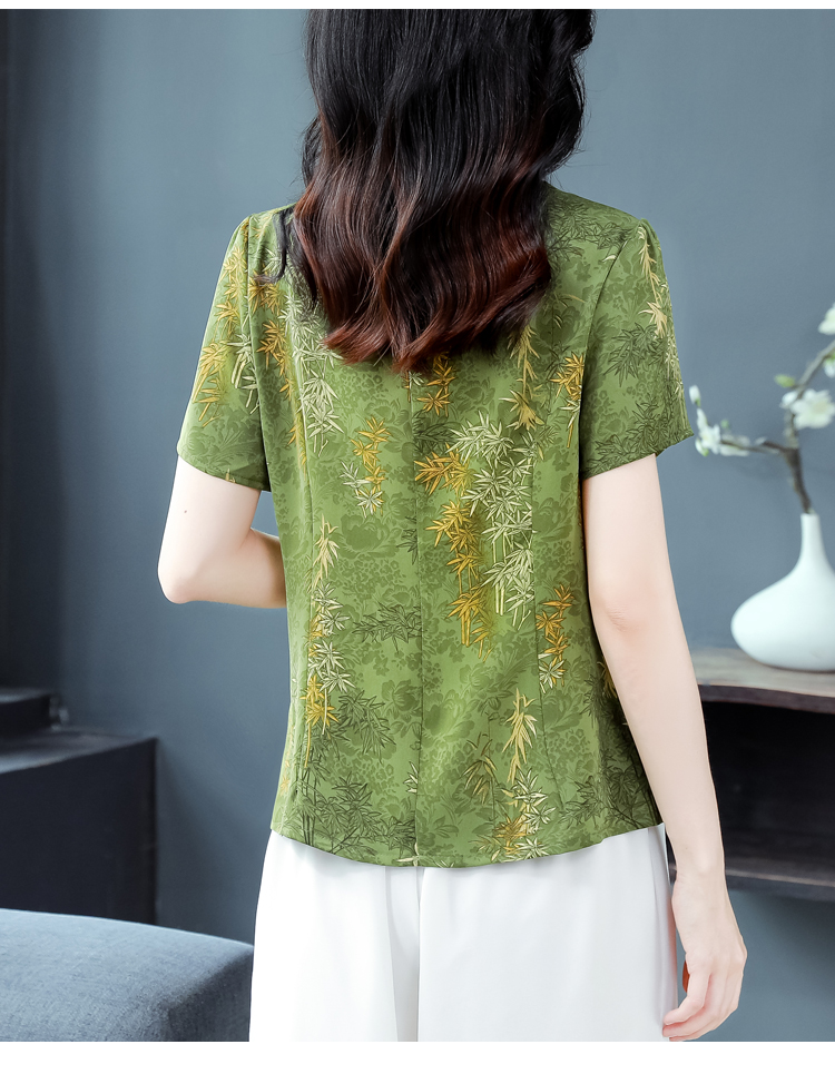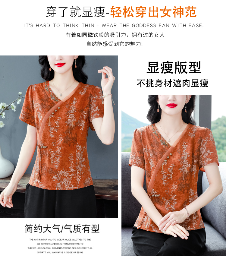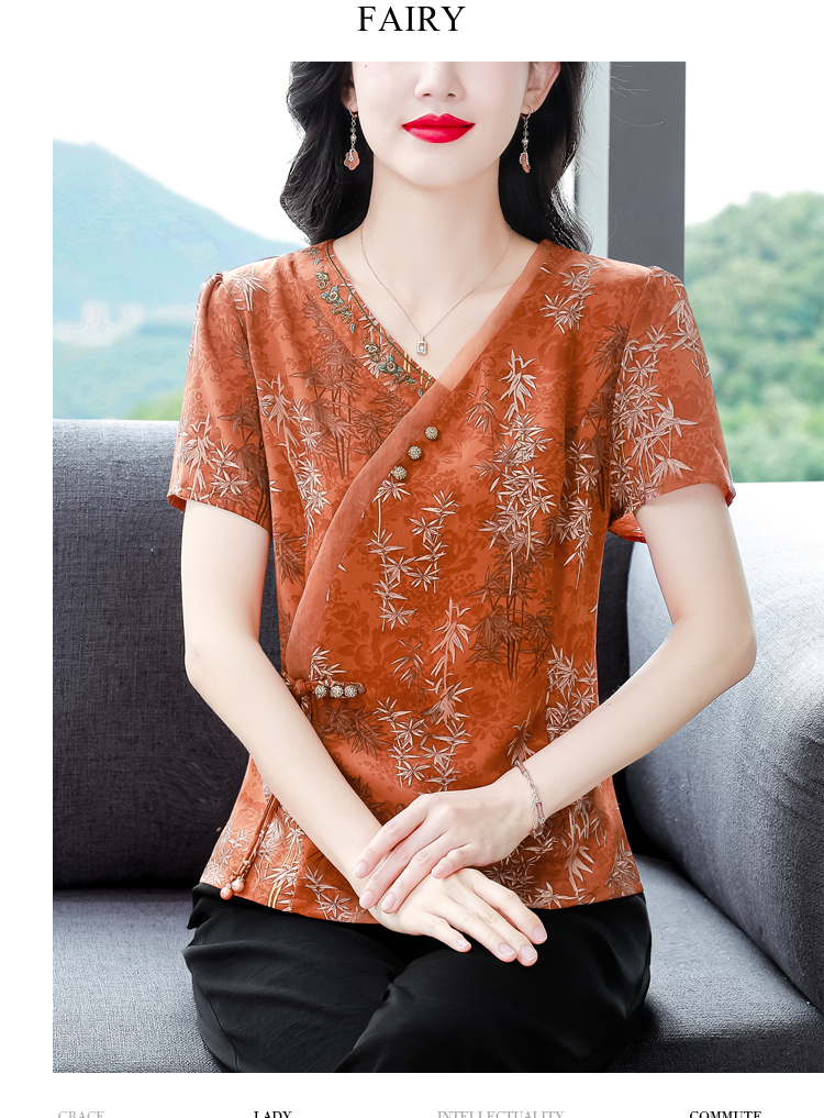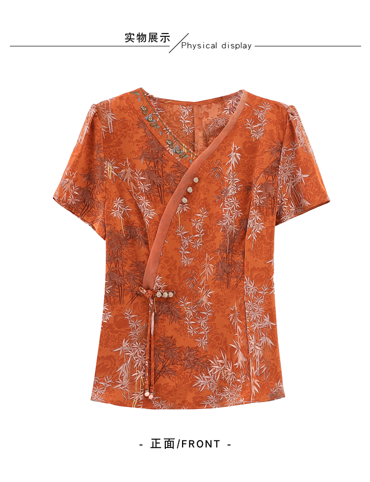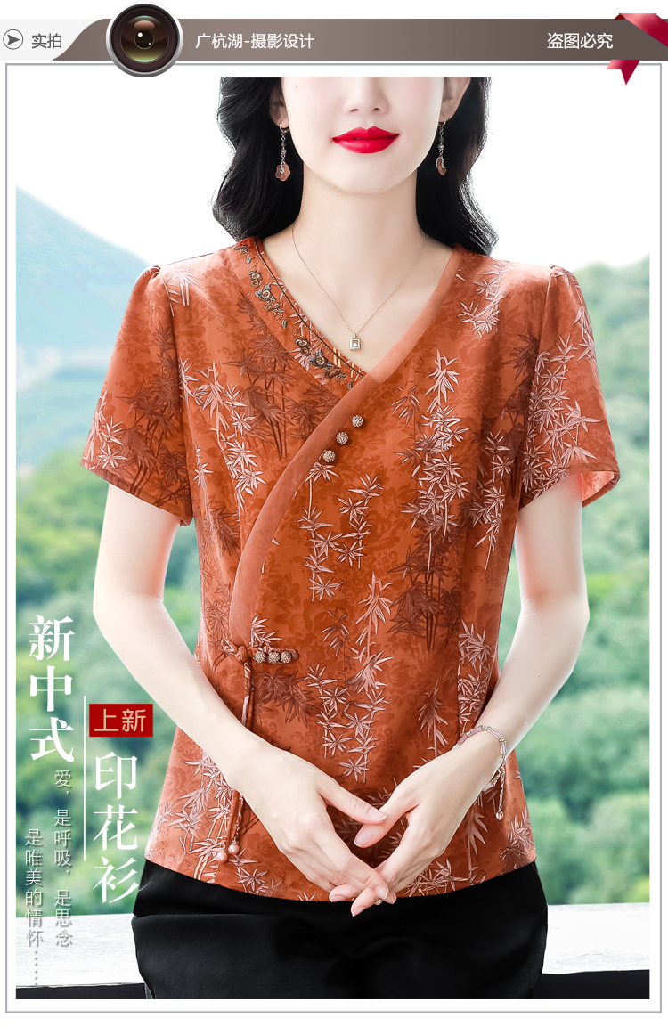 RY2475# 夏季复古国风短袖翻领印花宽松显瘦修身大码上衣女