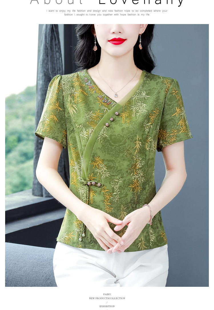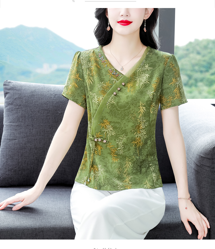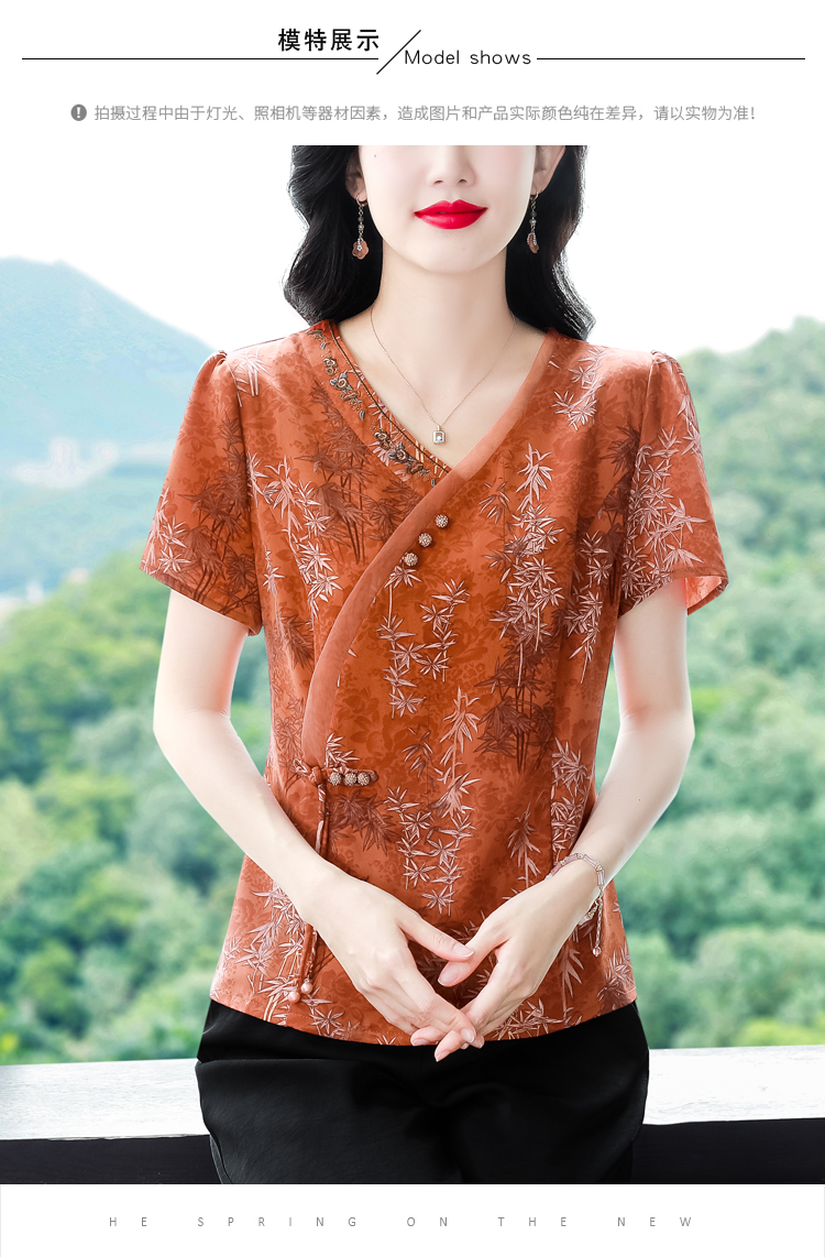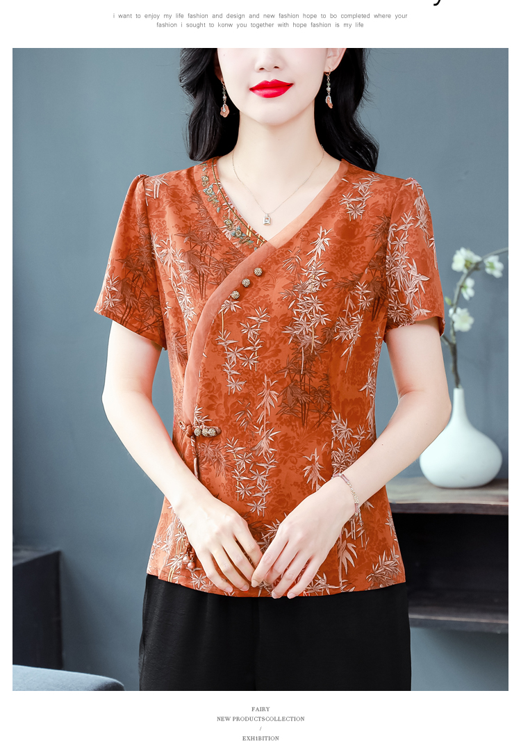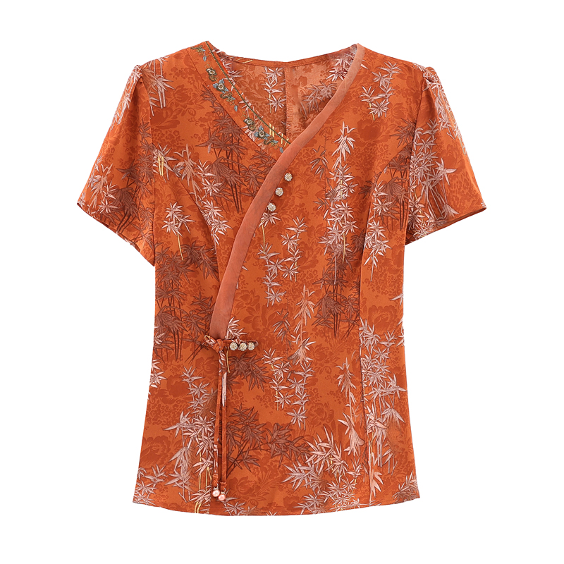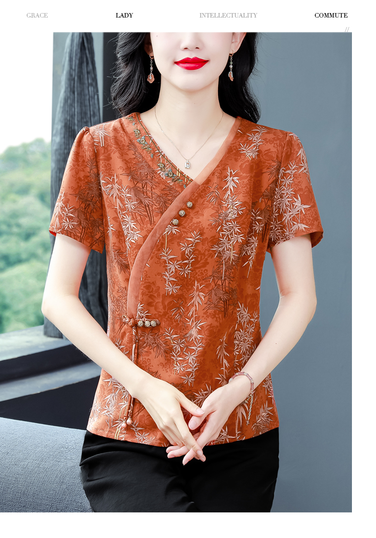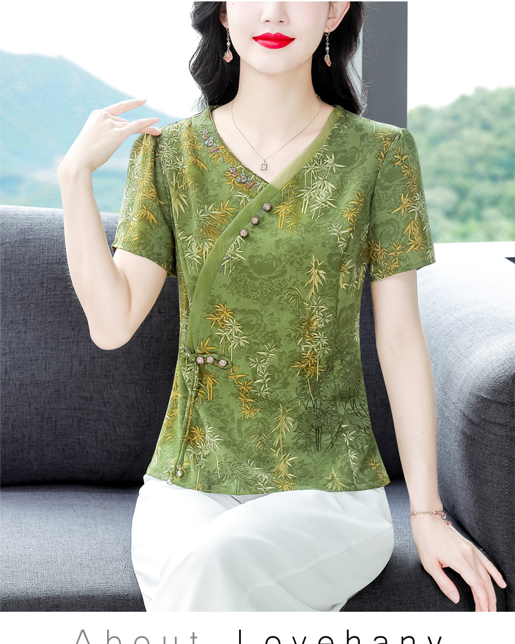 RY2475# 夏季复古国风短袖翻领印花宽松显瘦修身大码上衣女