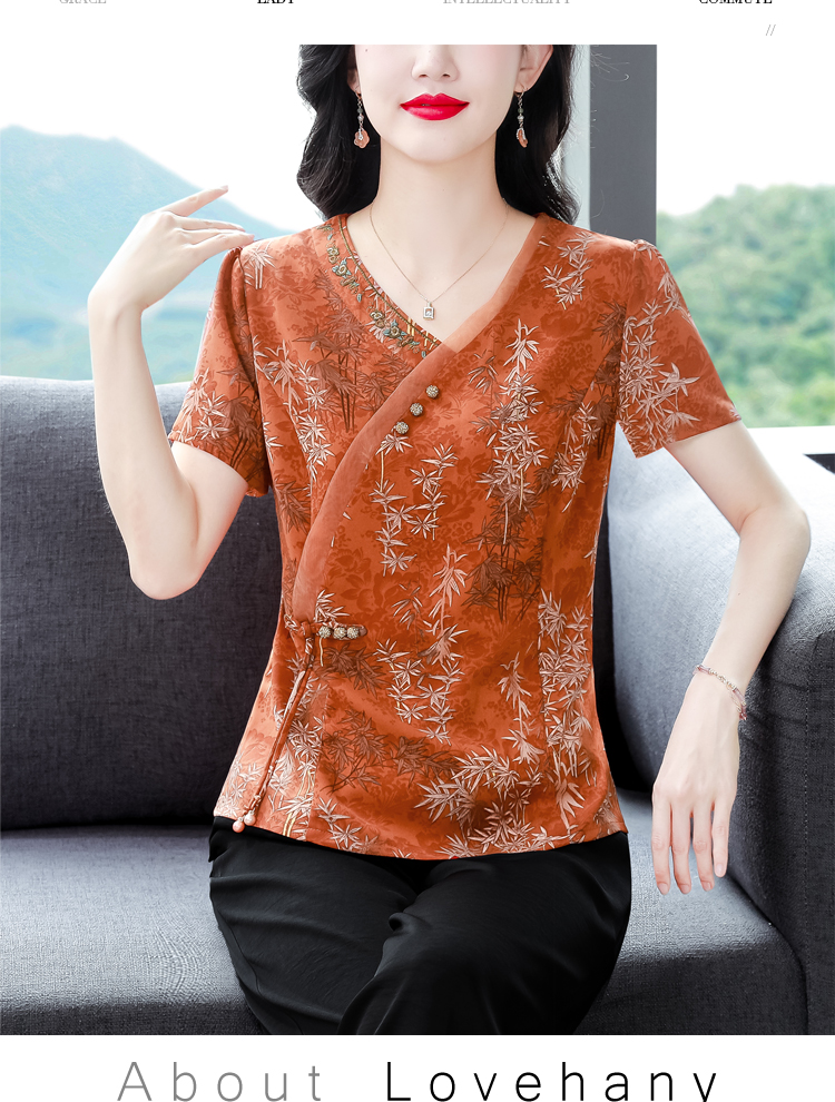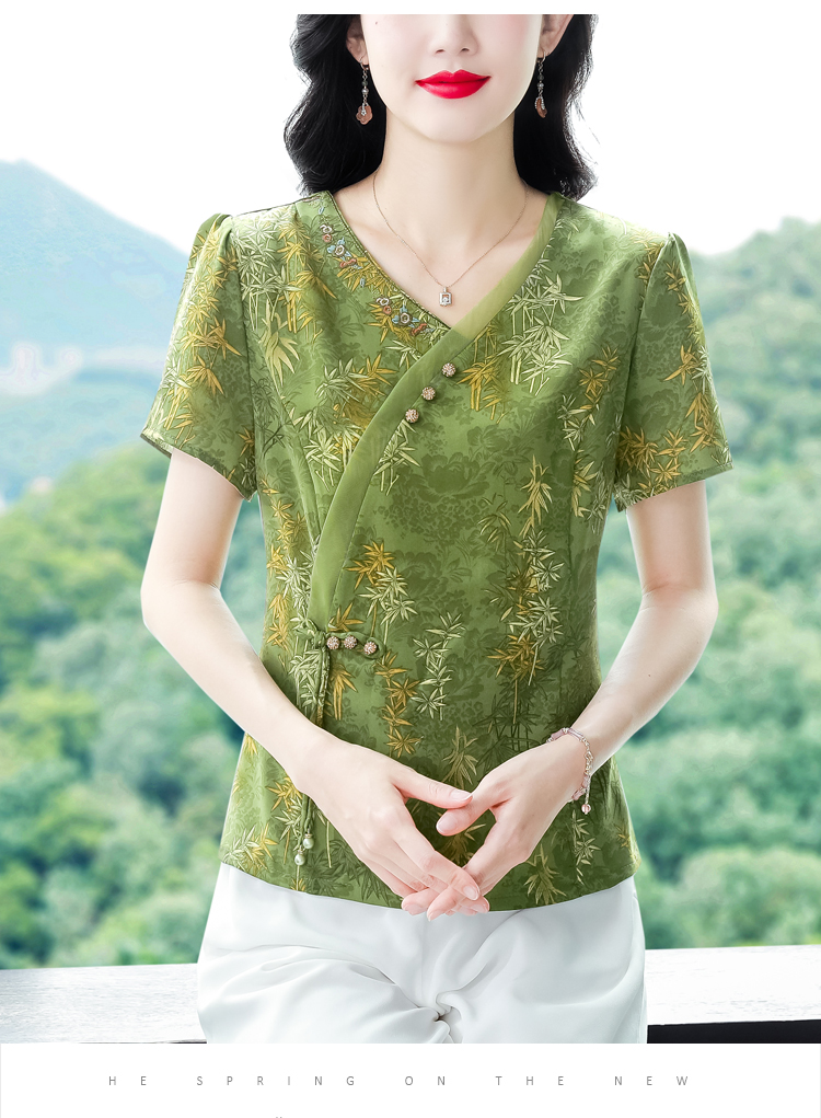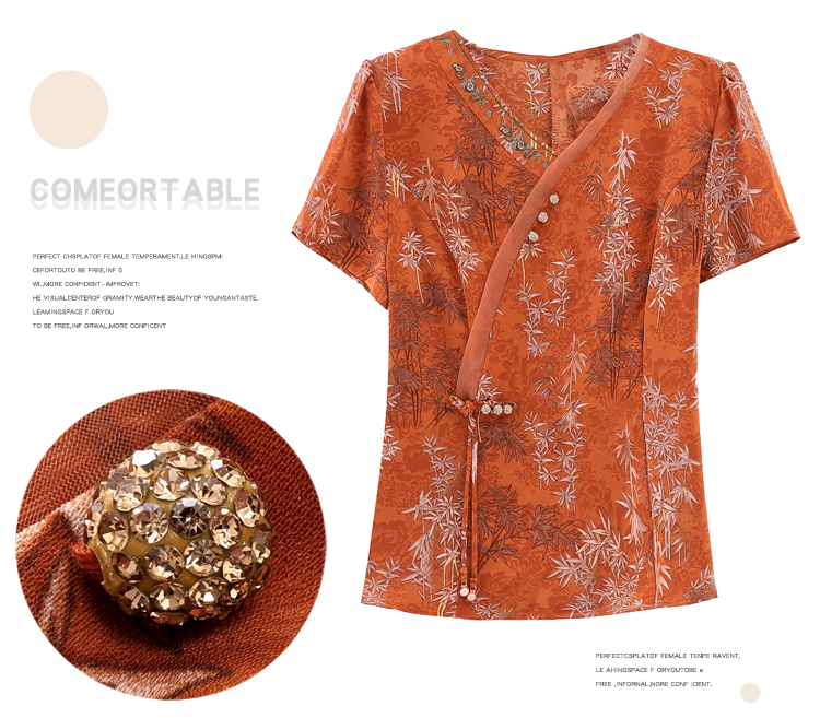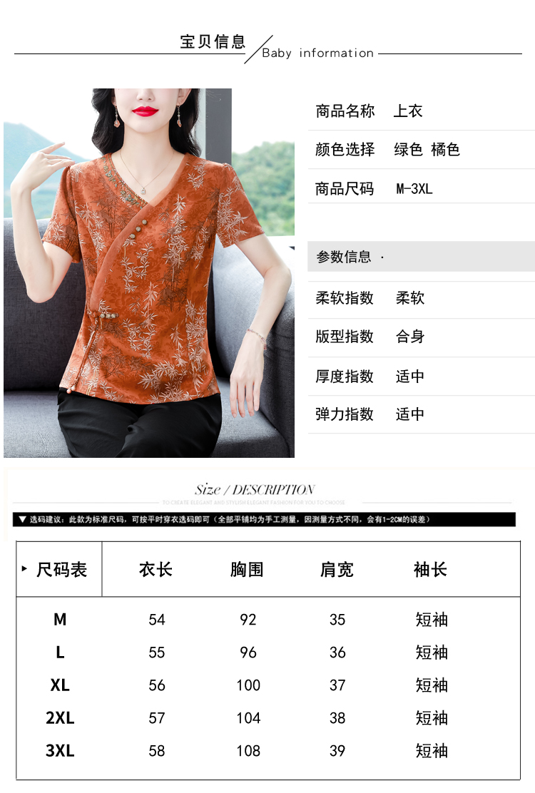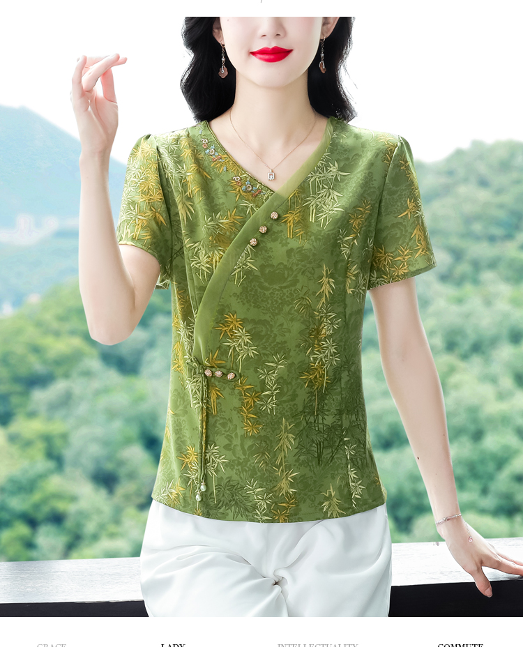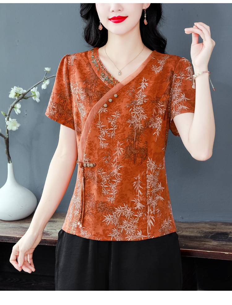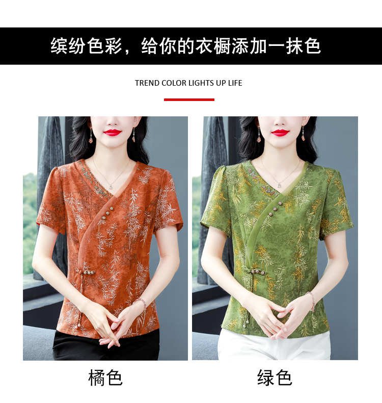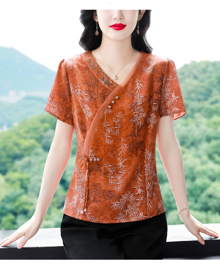 RY2475# 夏季复古国风短袖翻领印花宽松显瘦修身大码上衣女