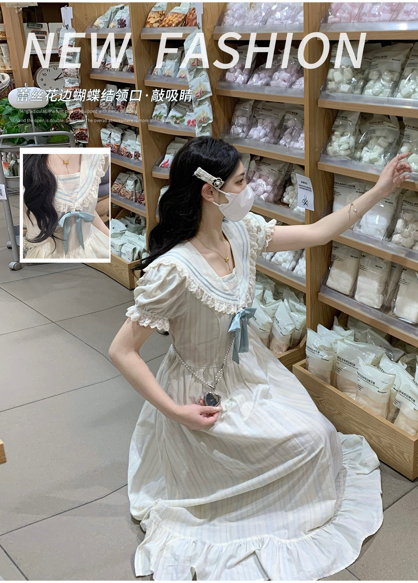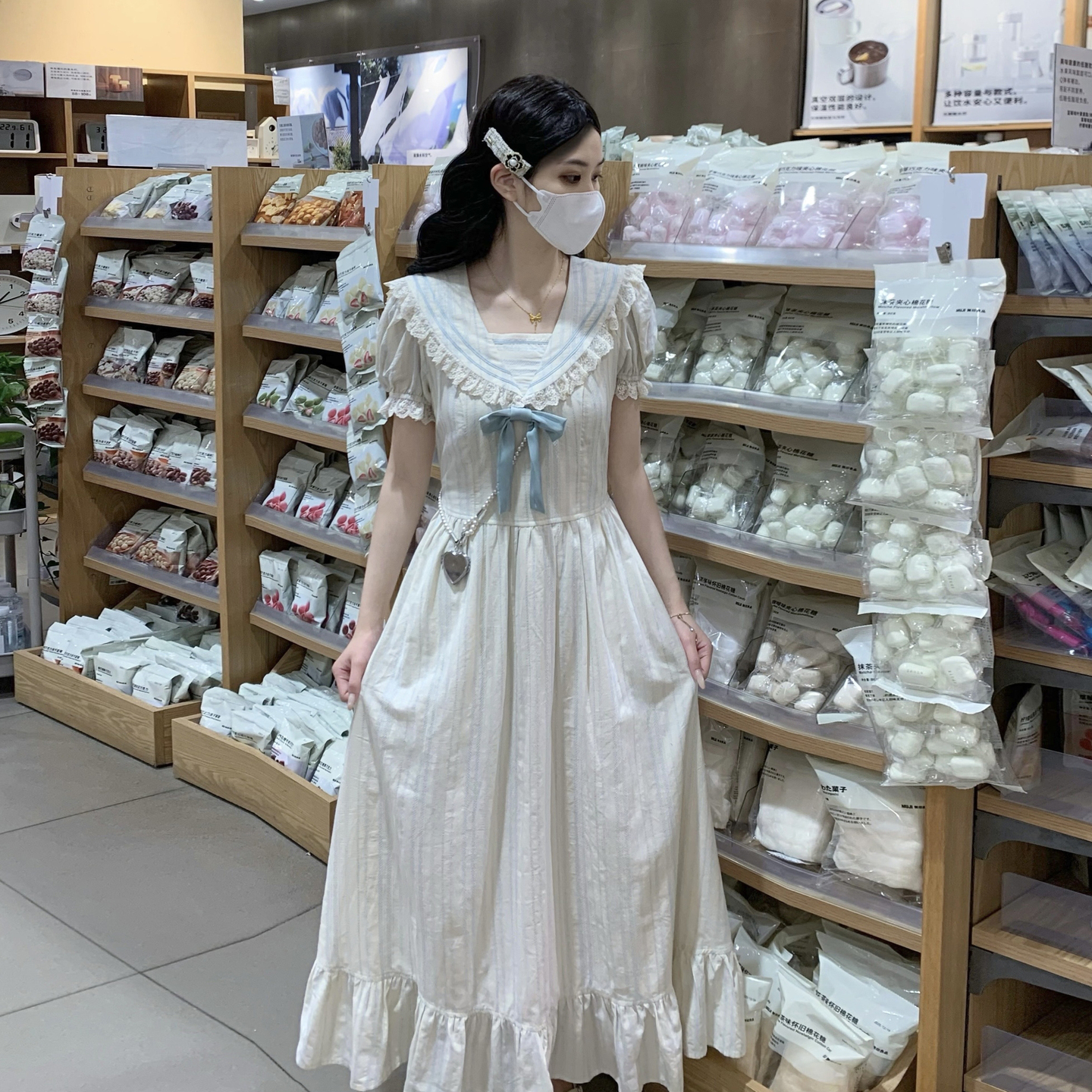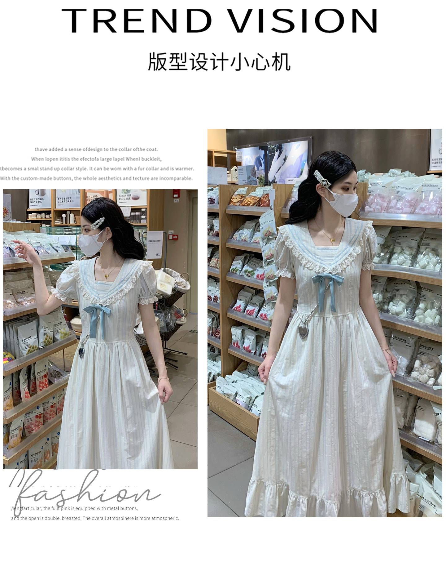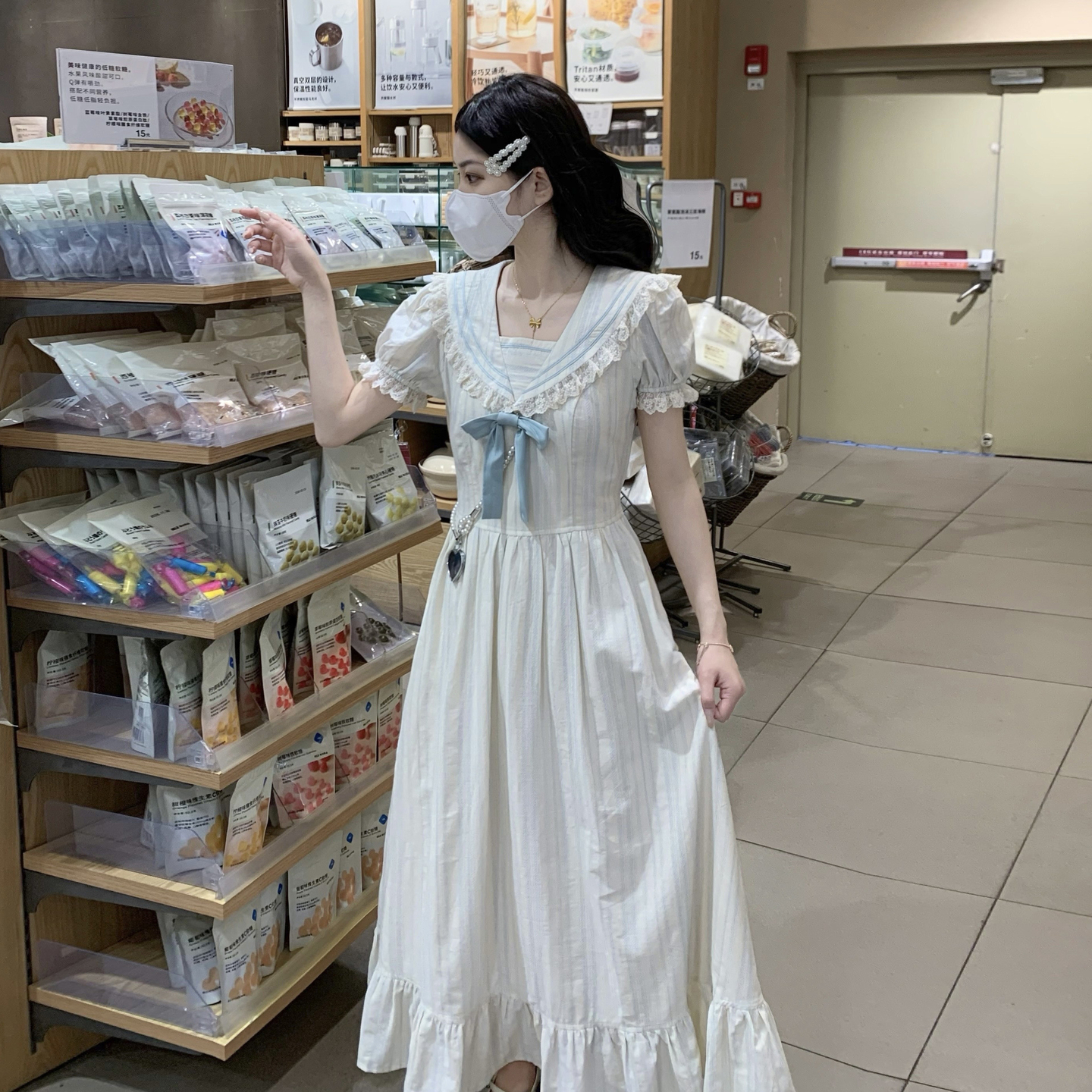 RY2493# 实拍晴空诗行 法式复古少女风夏连衣裙女海军领蕾丝漂亮长裙