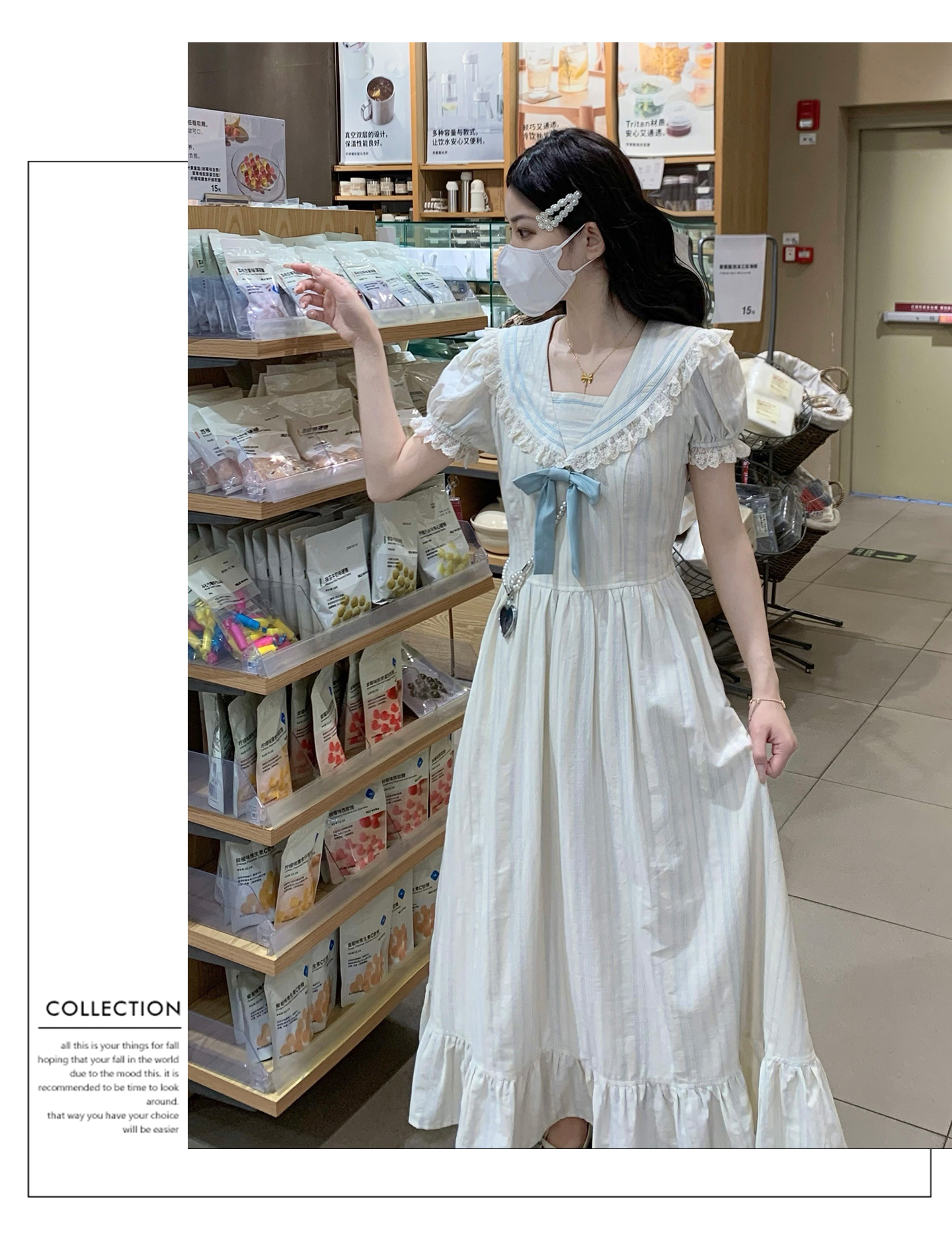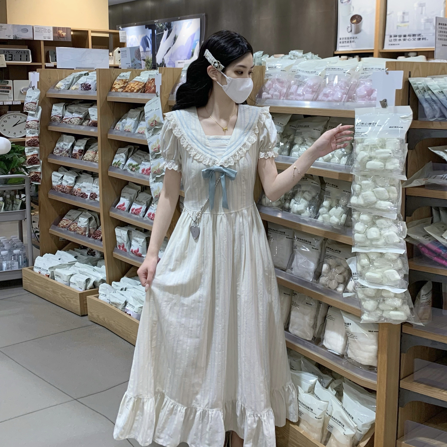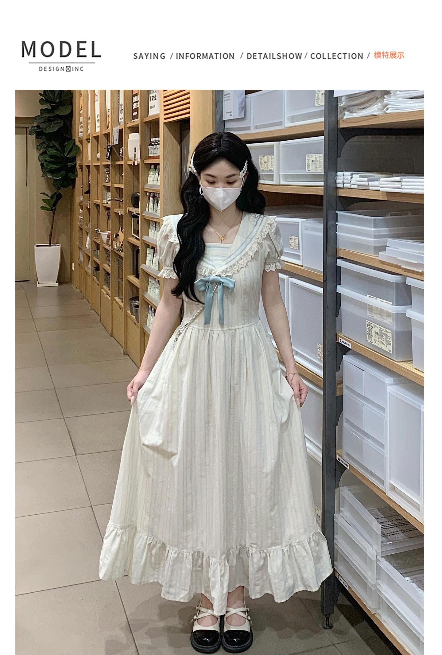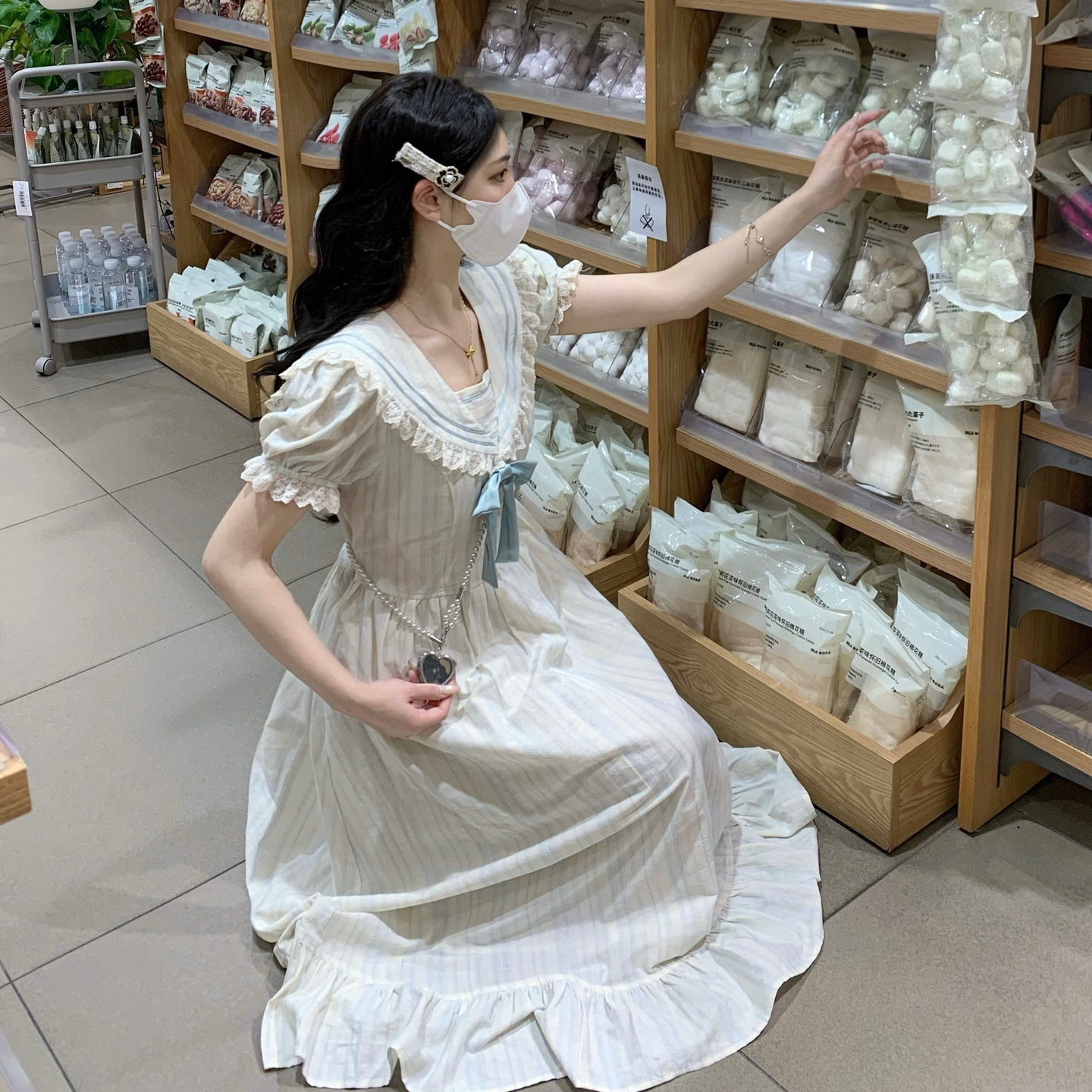 RY2493# 实拍晴空诗行 法式复古少女风夏连衣裙女海军领蕾丝漂亮长裙