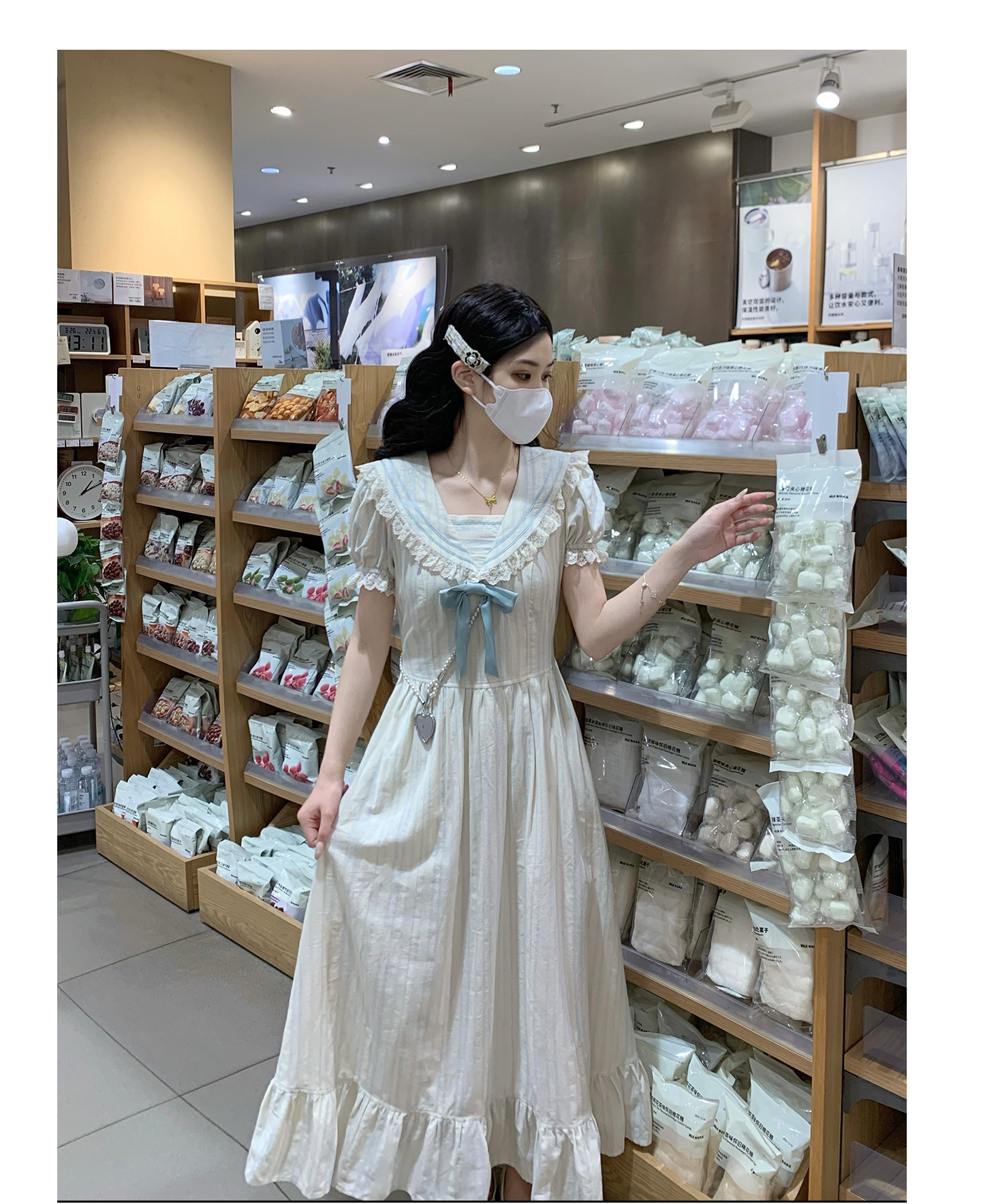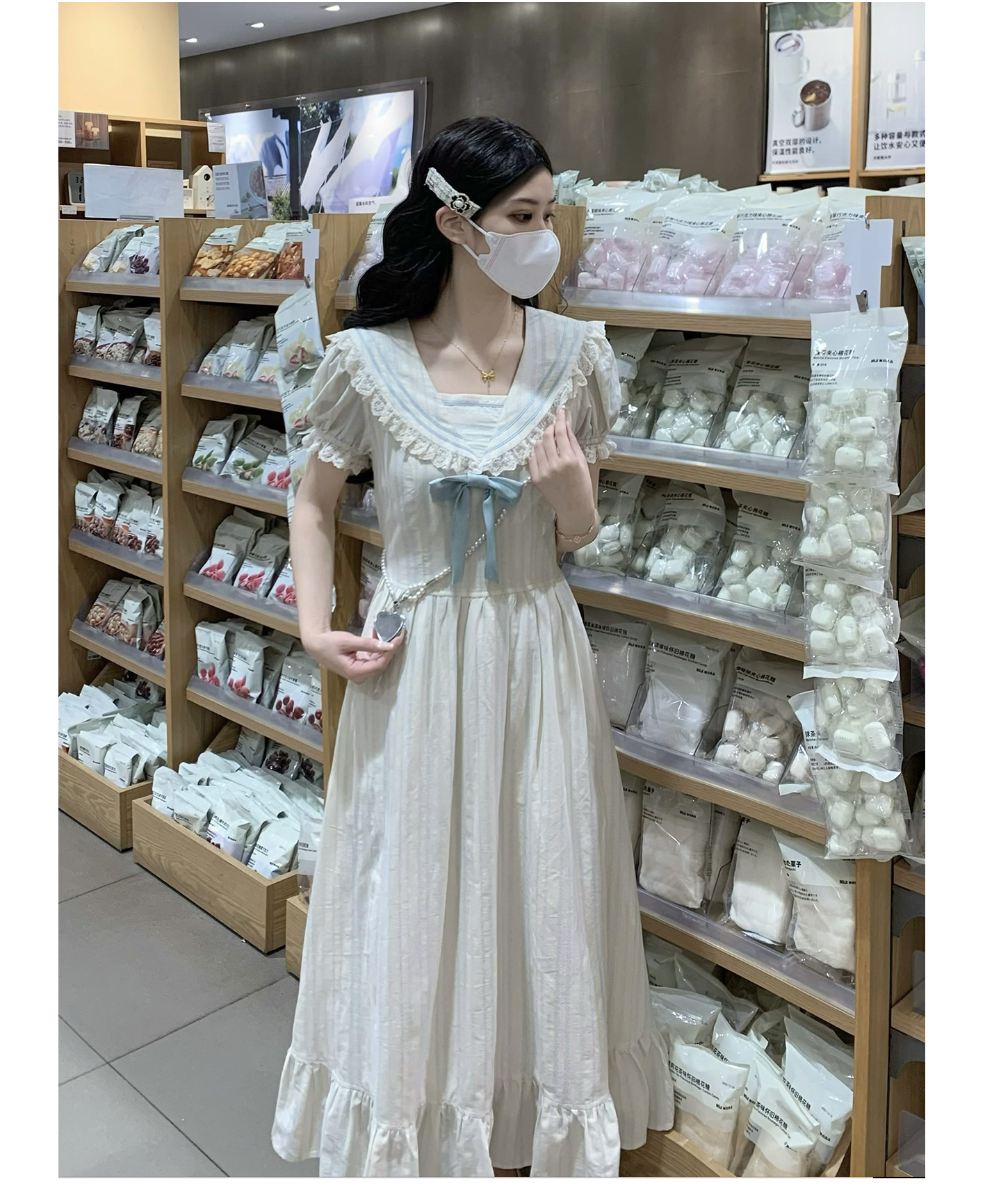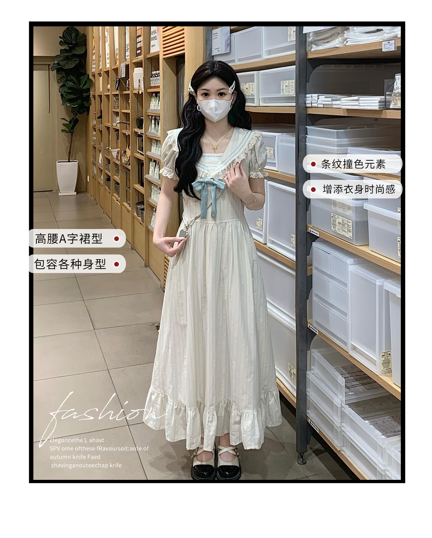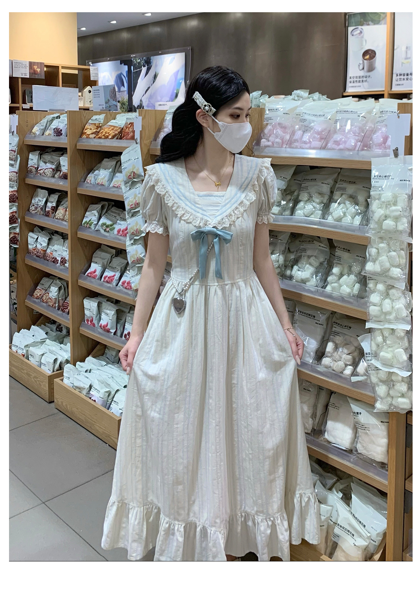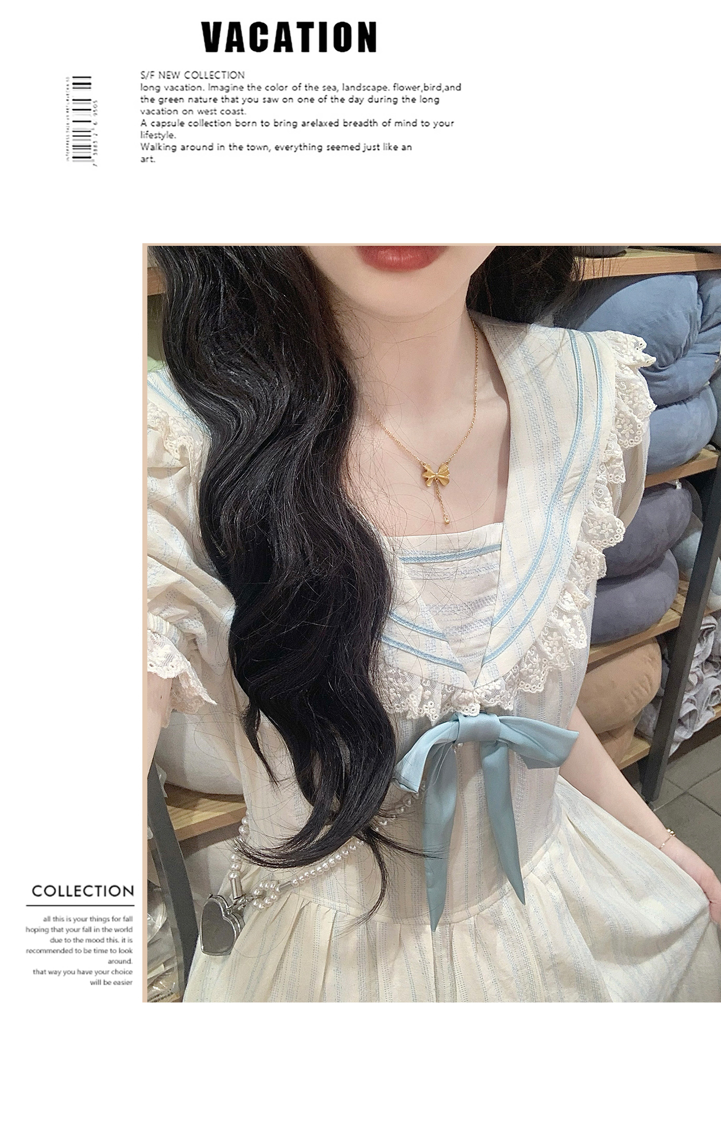 RY2493# 实拍晴空诗行 法式复古少女风夏连衣裙女海军领蕾丝漂亮长裙