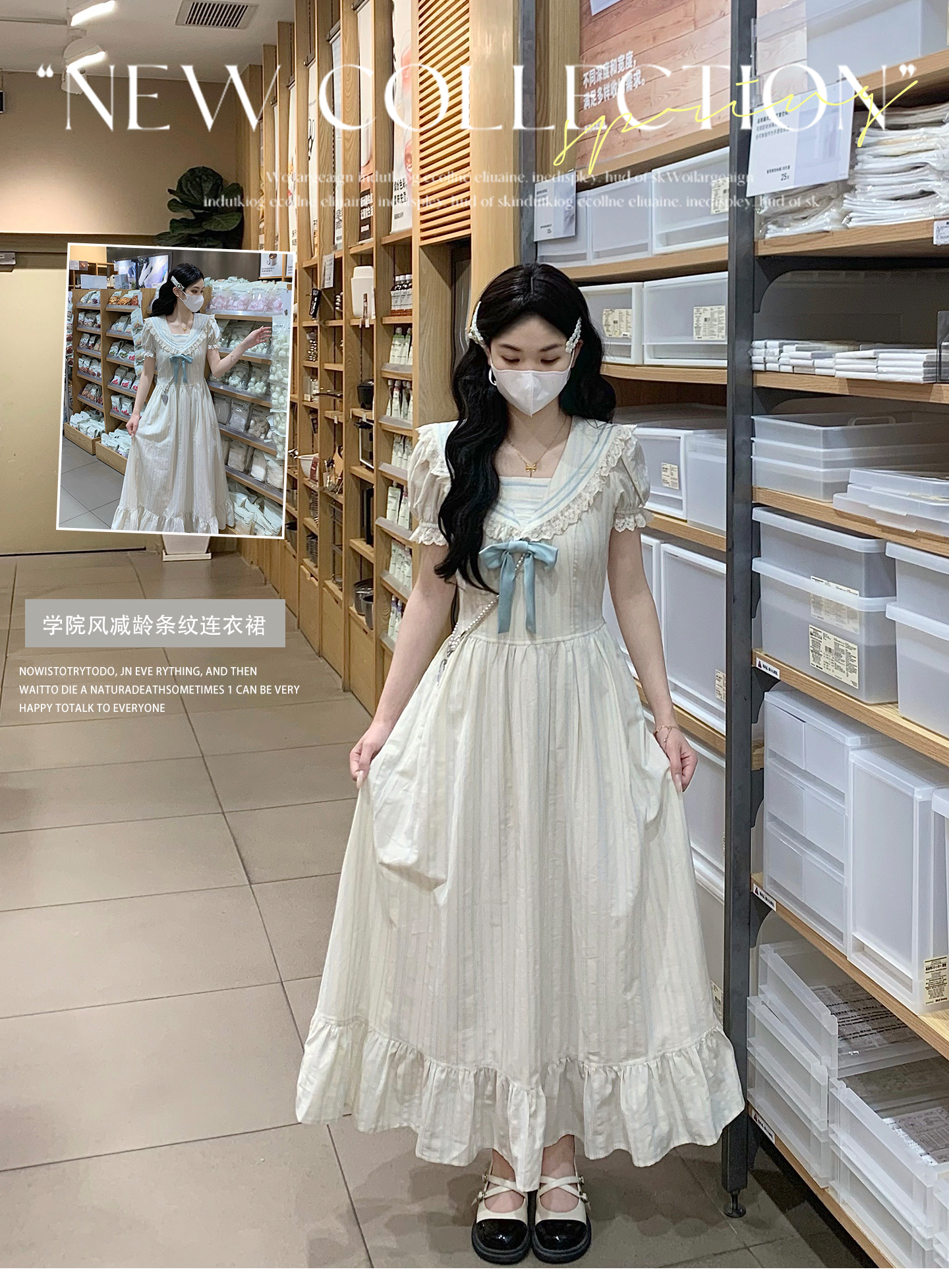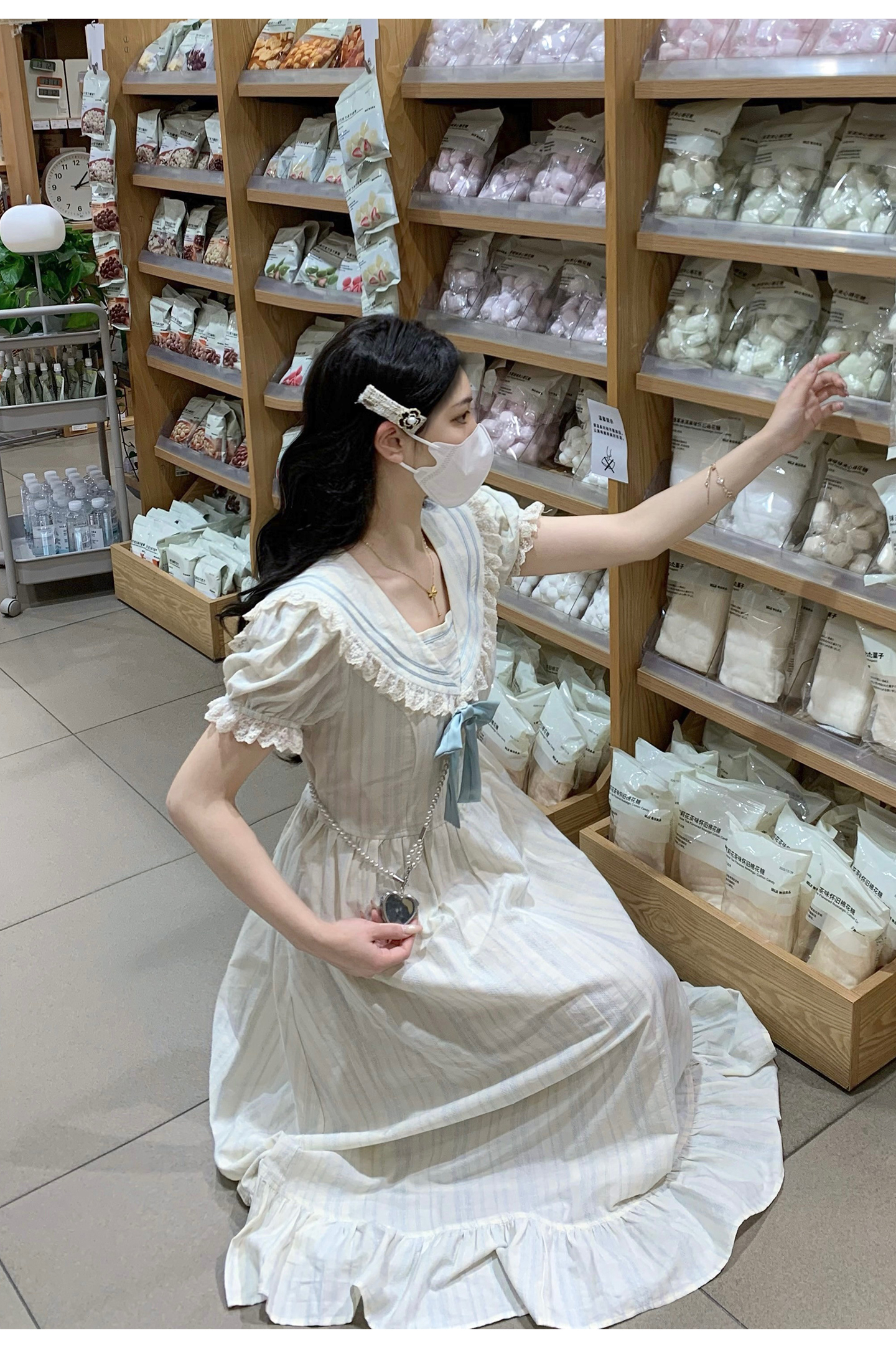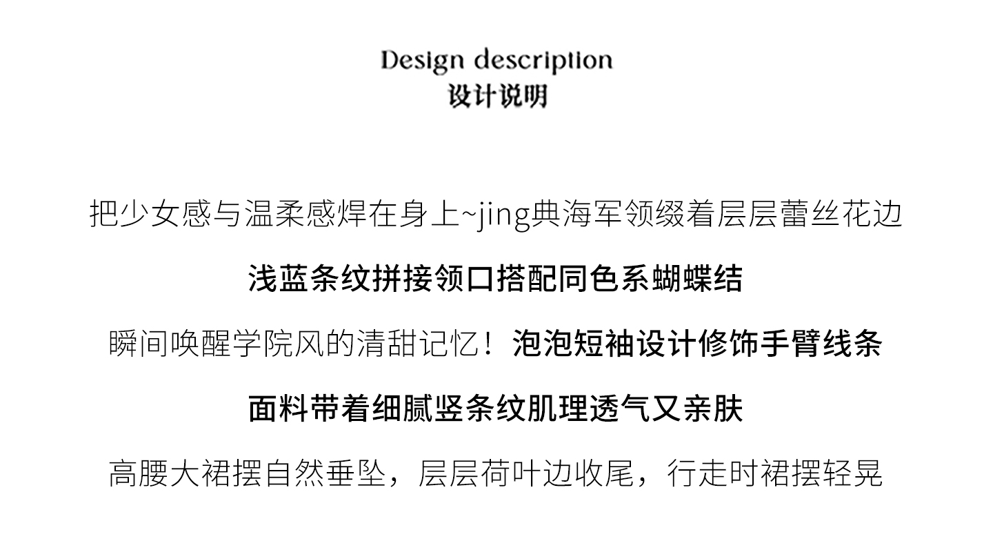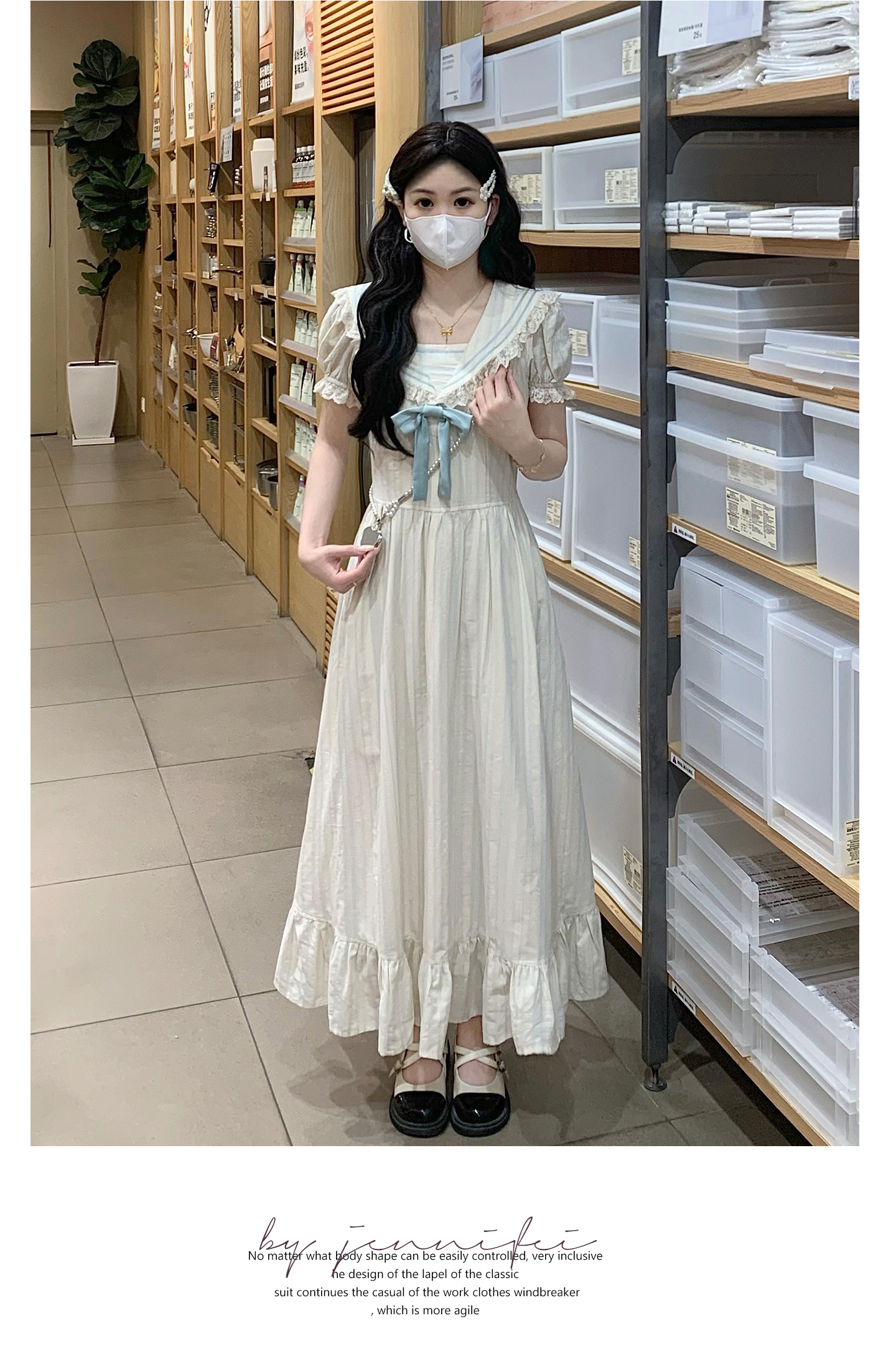 RY2493# 实拍晴空诗行 法式复古少女风夏连衣裙女海军领蕾丝漂亮长裙