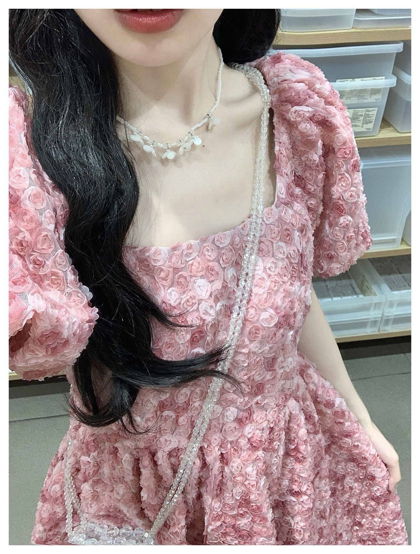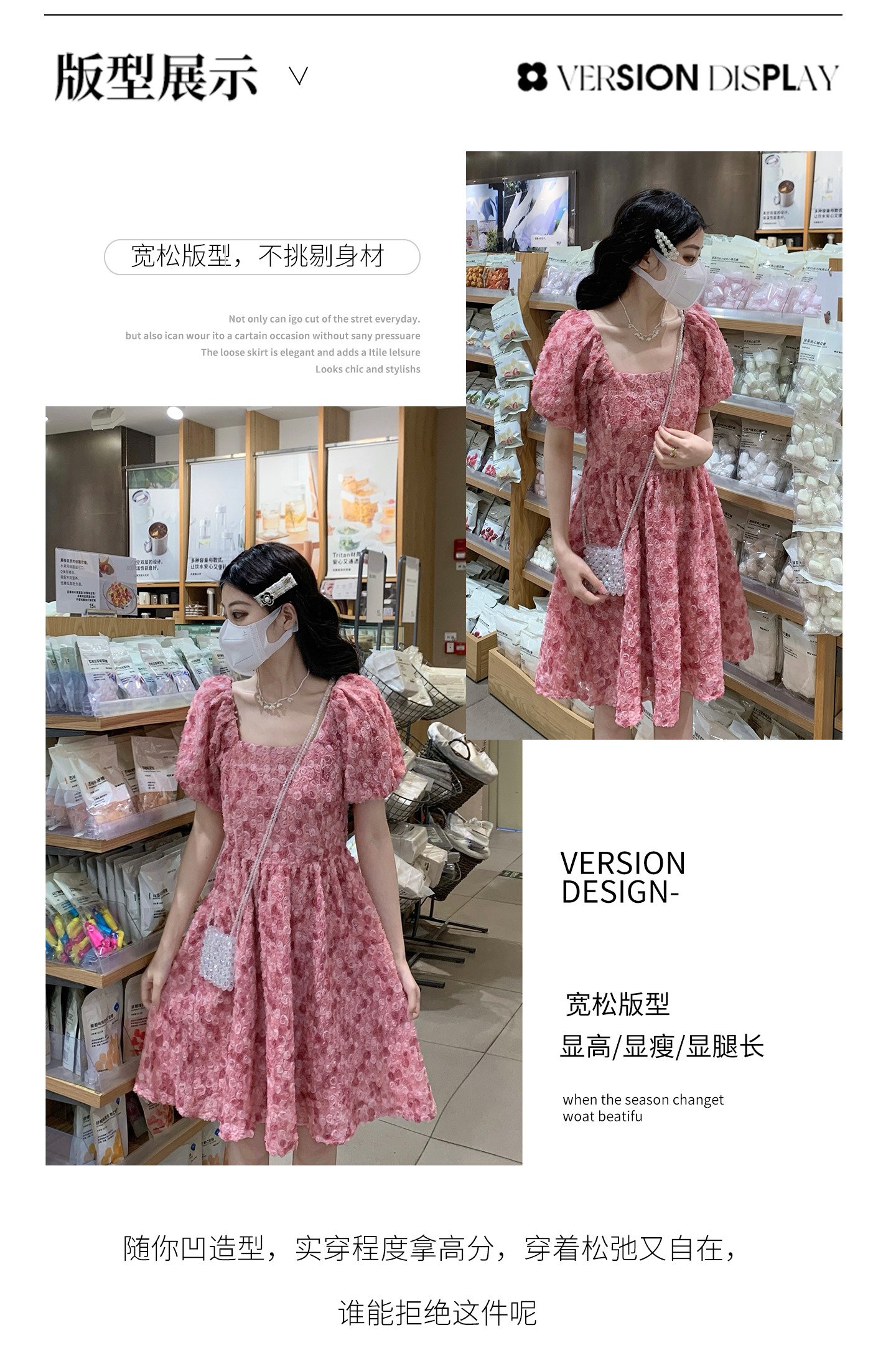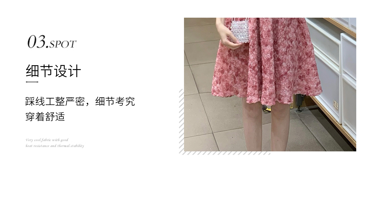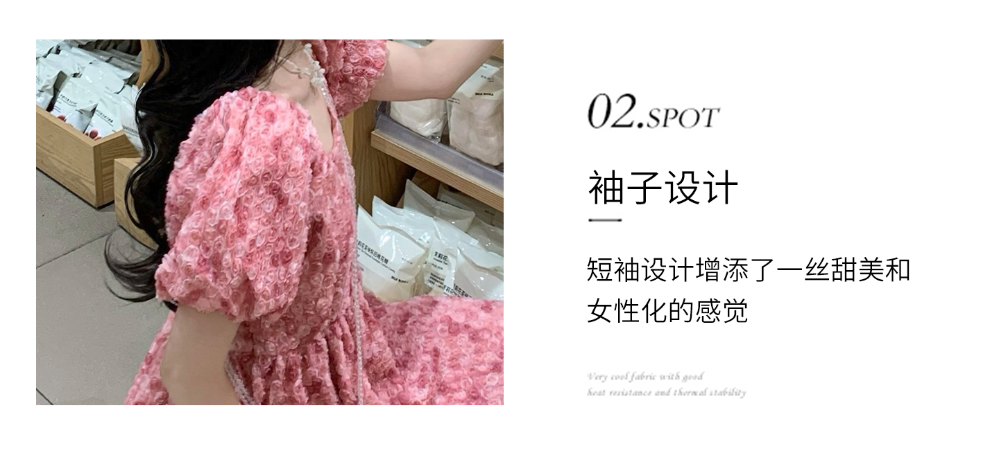 RY2494# 连衣裙女夏设计感玫瑰花方领温柔风法式收腰粉色仙女中长裙