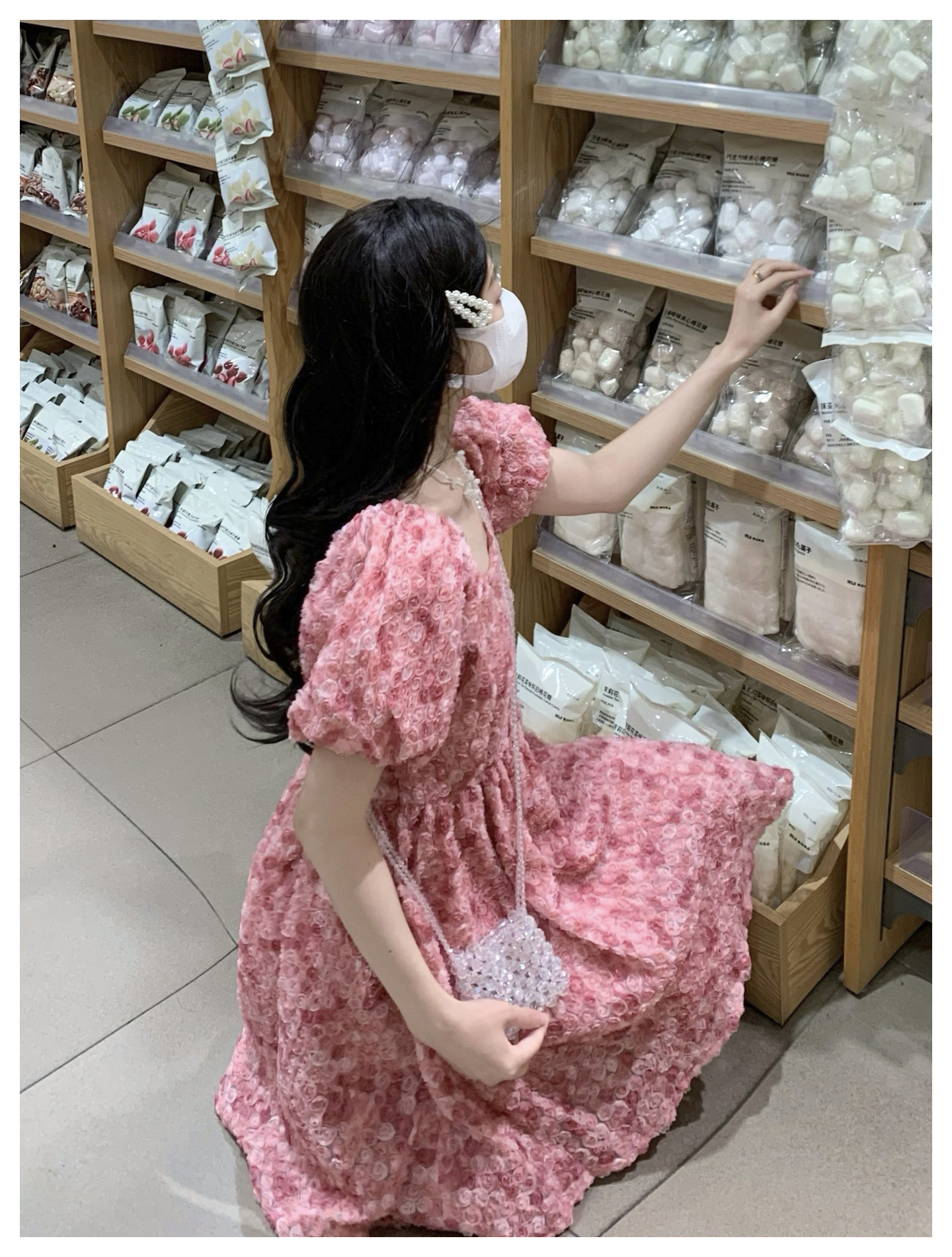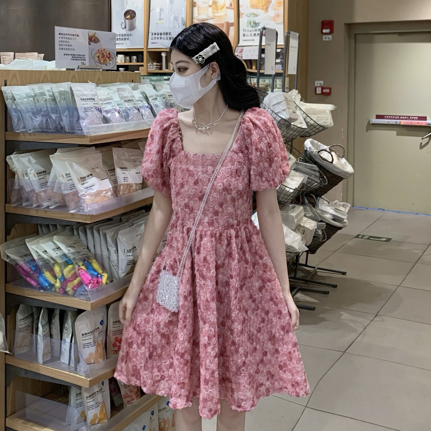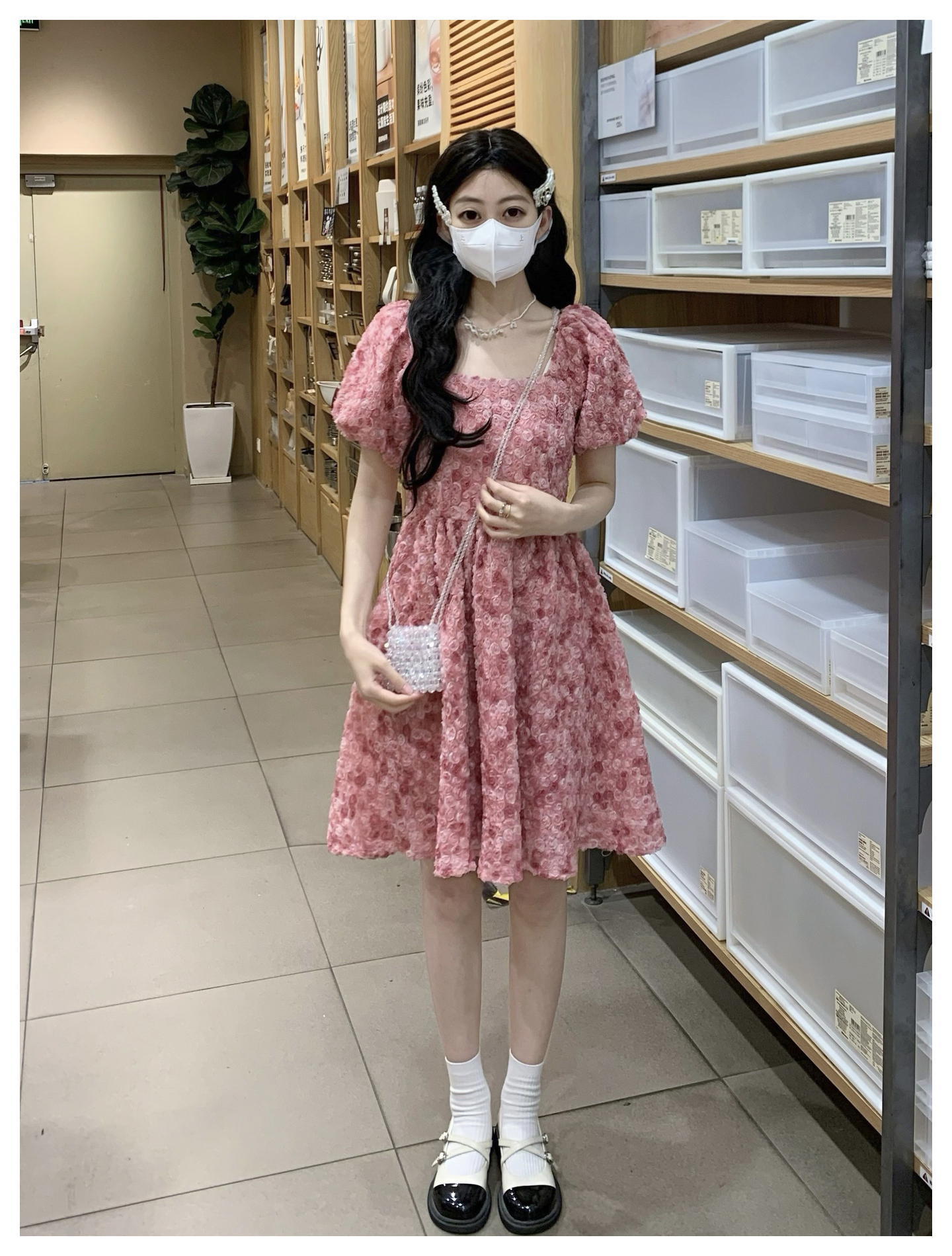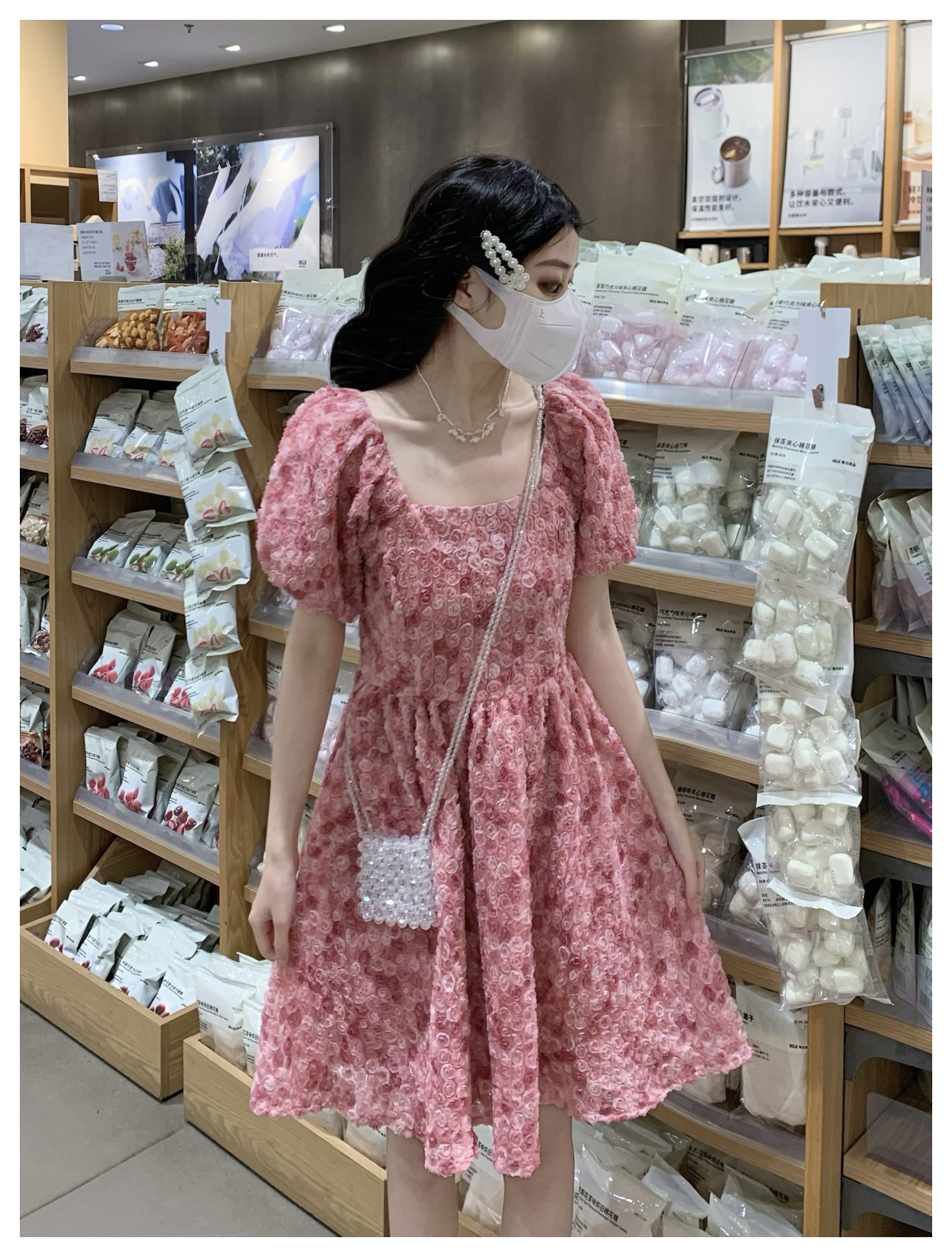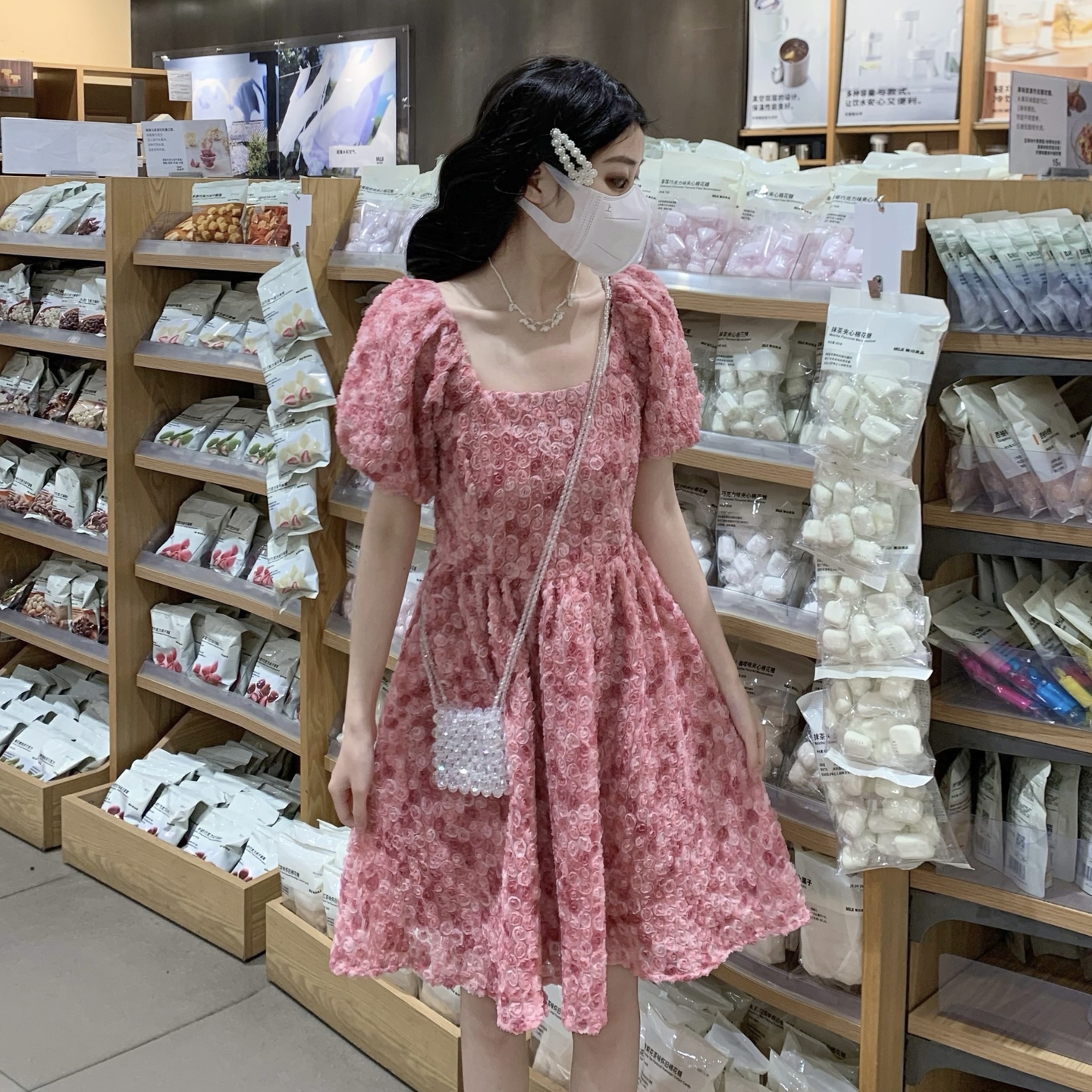 RY2494# 连衣裙女夏设计感玫瑰花方领温柔风法式收腰粉色仙女中长裙