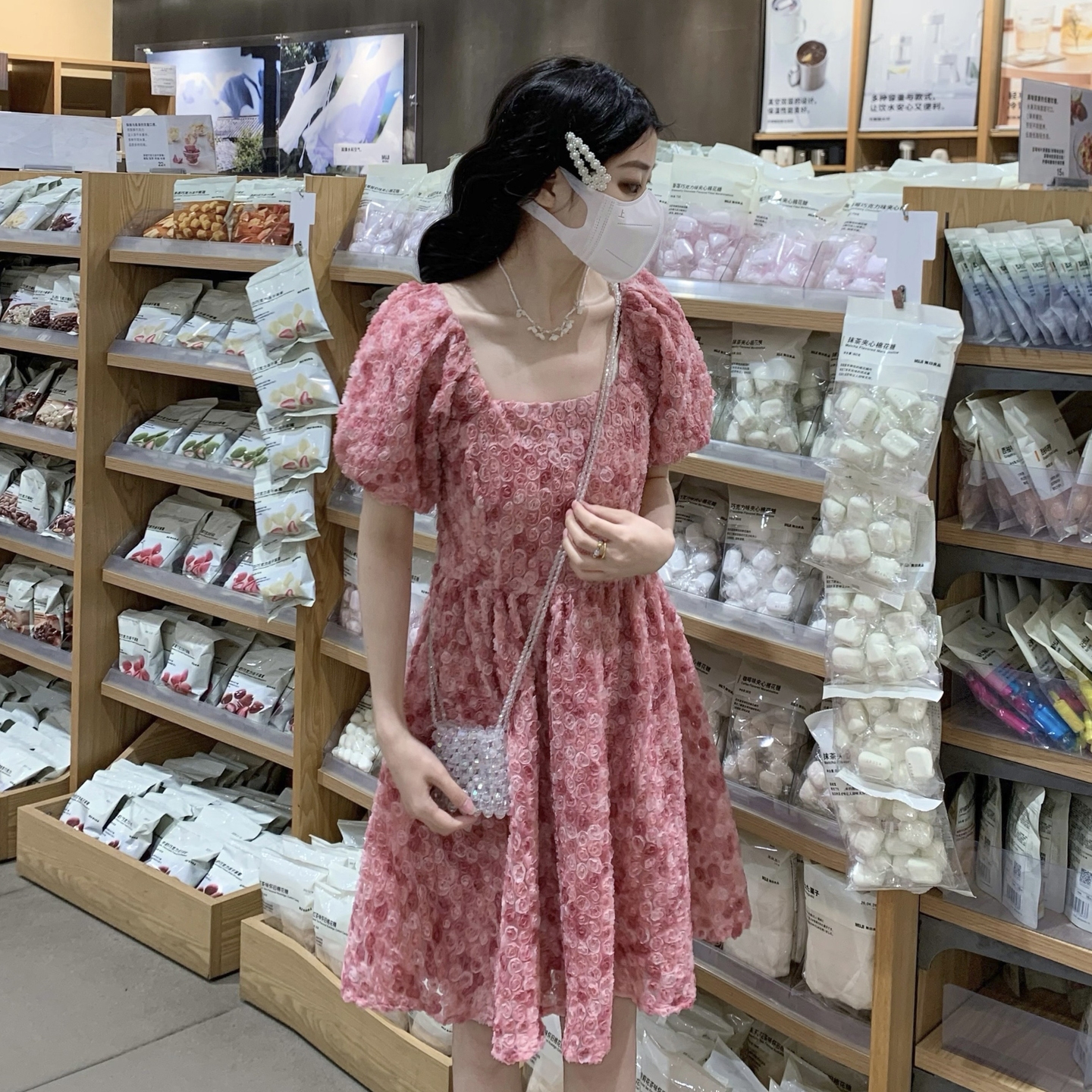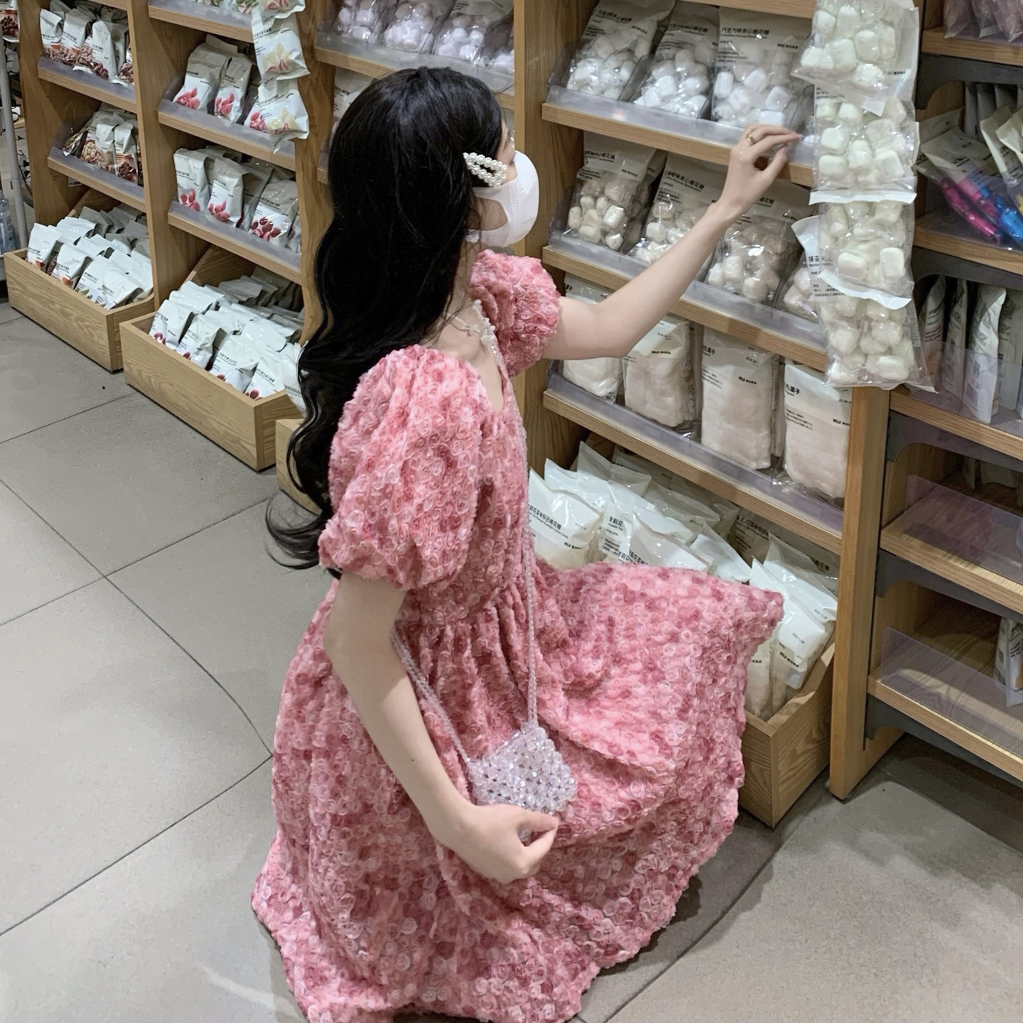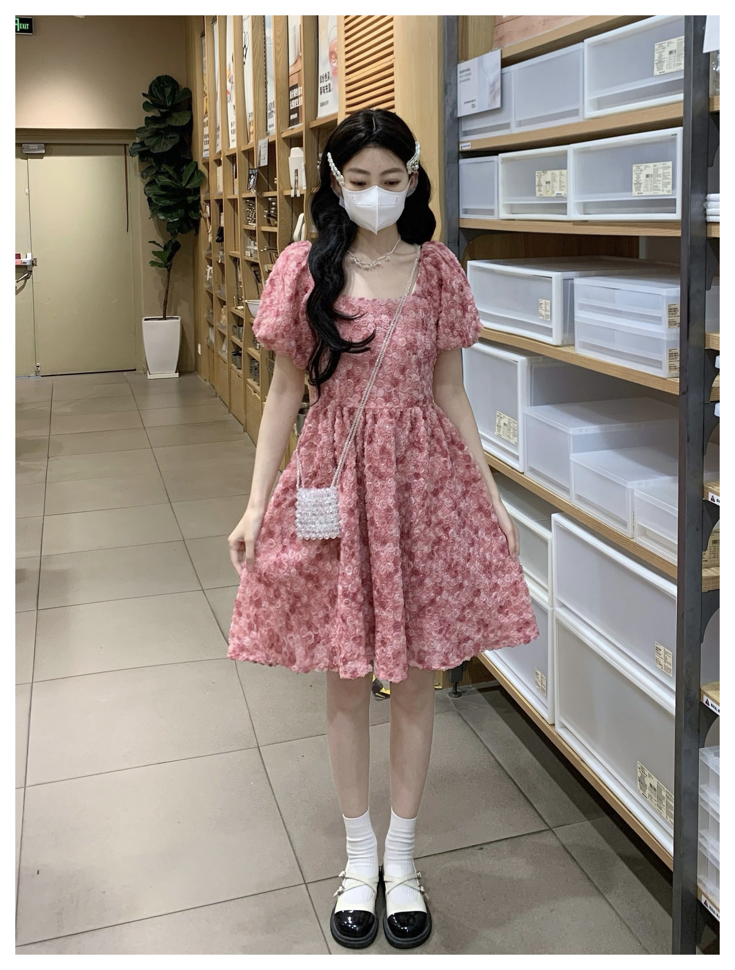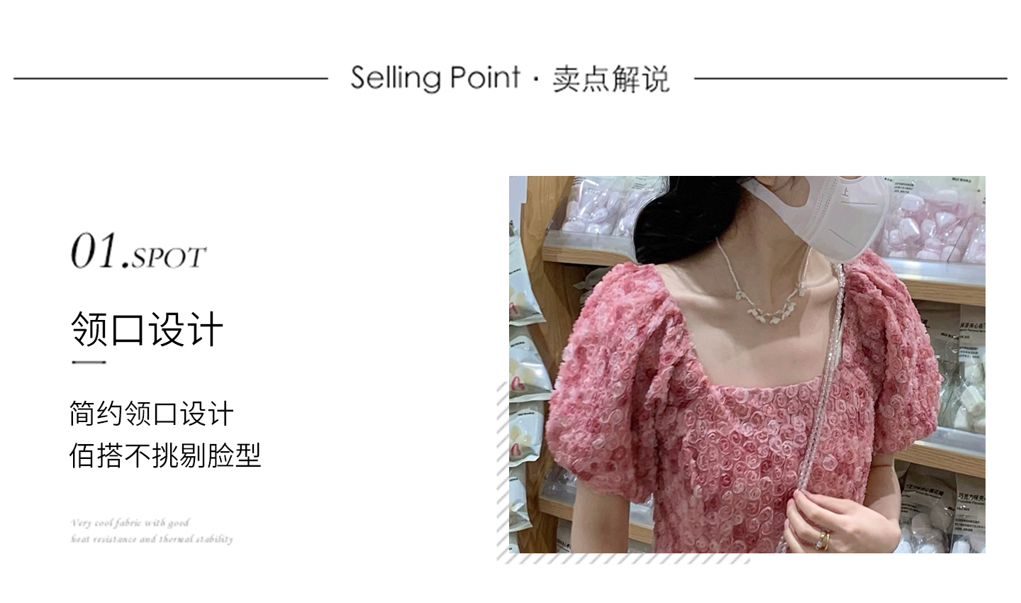 RY2494# 连衣裙女夏设计感玫瑰花方领温柔风法式收腰粉色仙女中长裙
