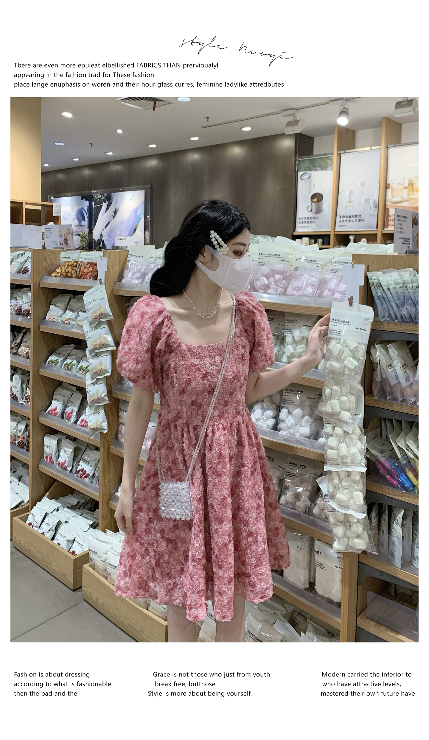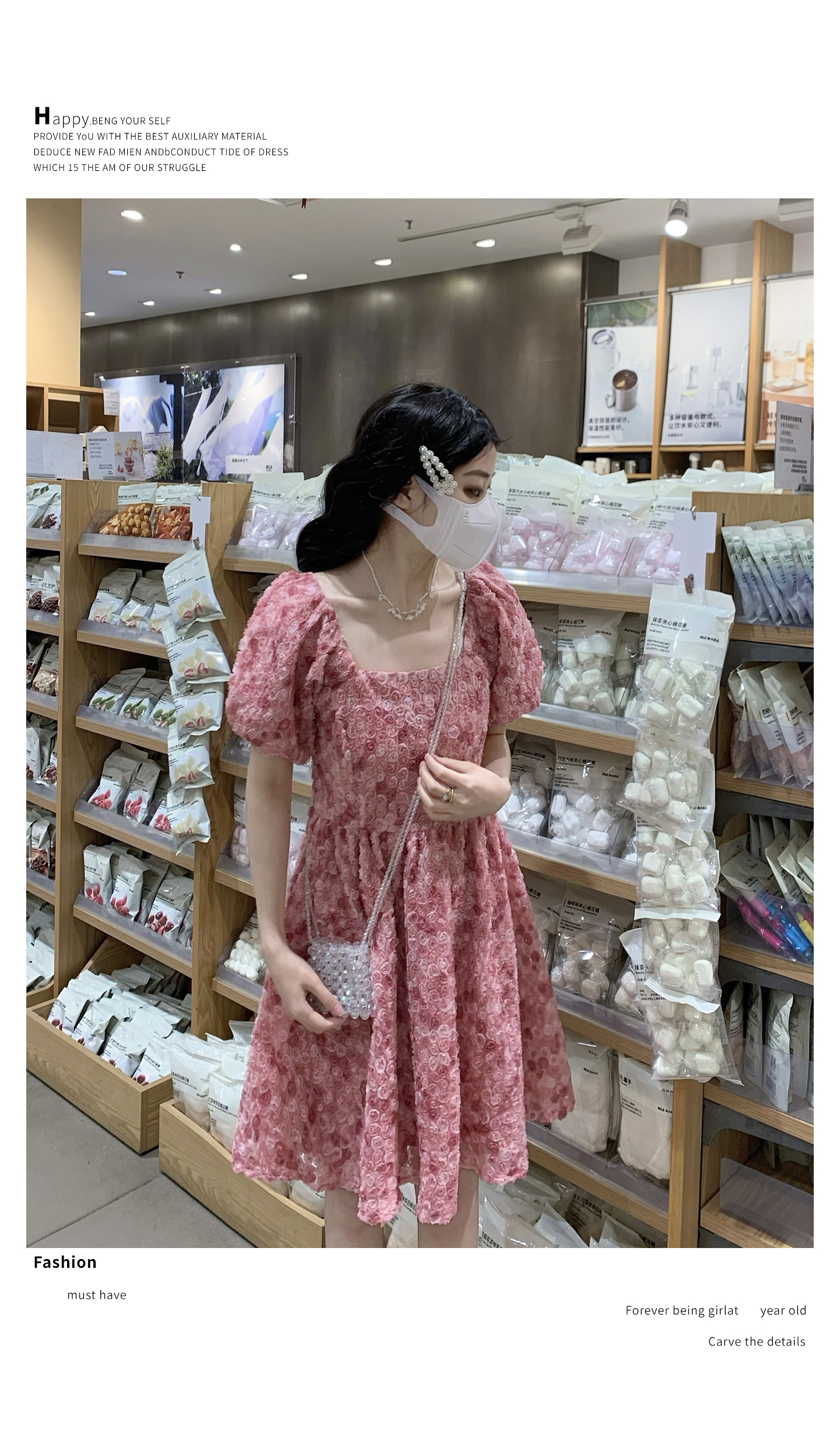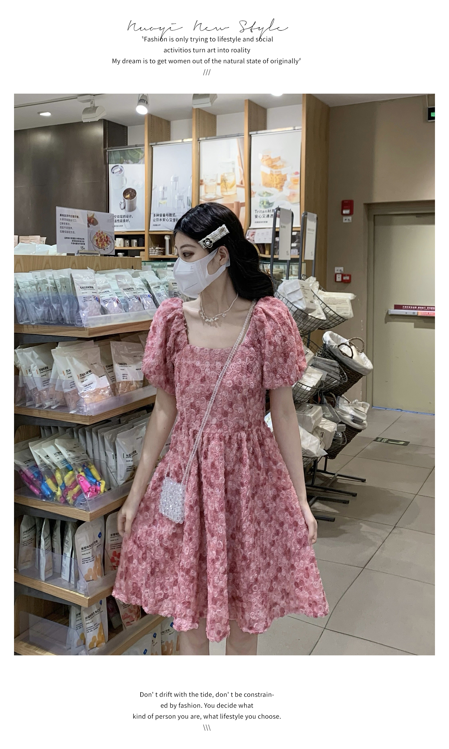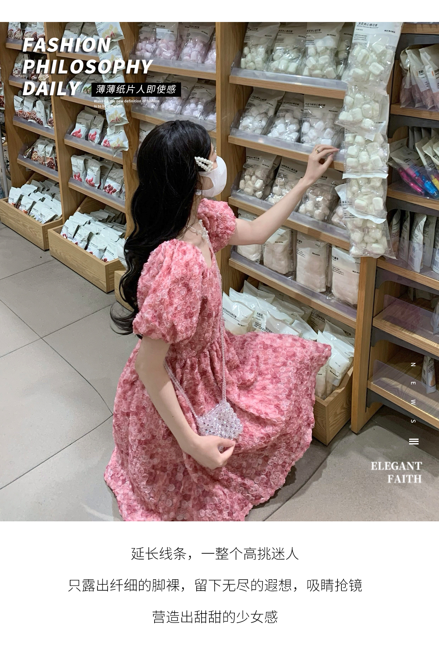 RY2494# 连衣裙女夏设计感玫瑰花方领温柔风法式收腰粉色仙女中长裙