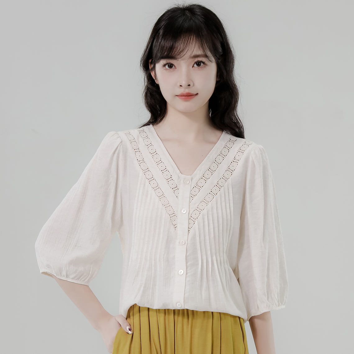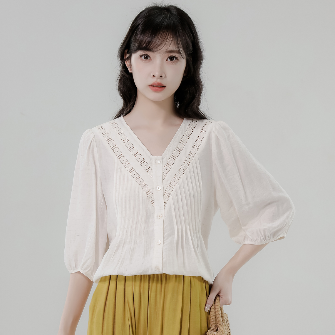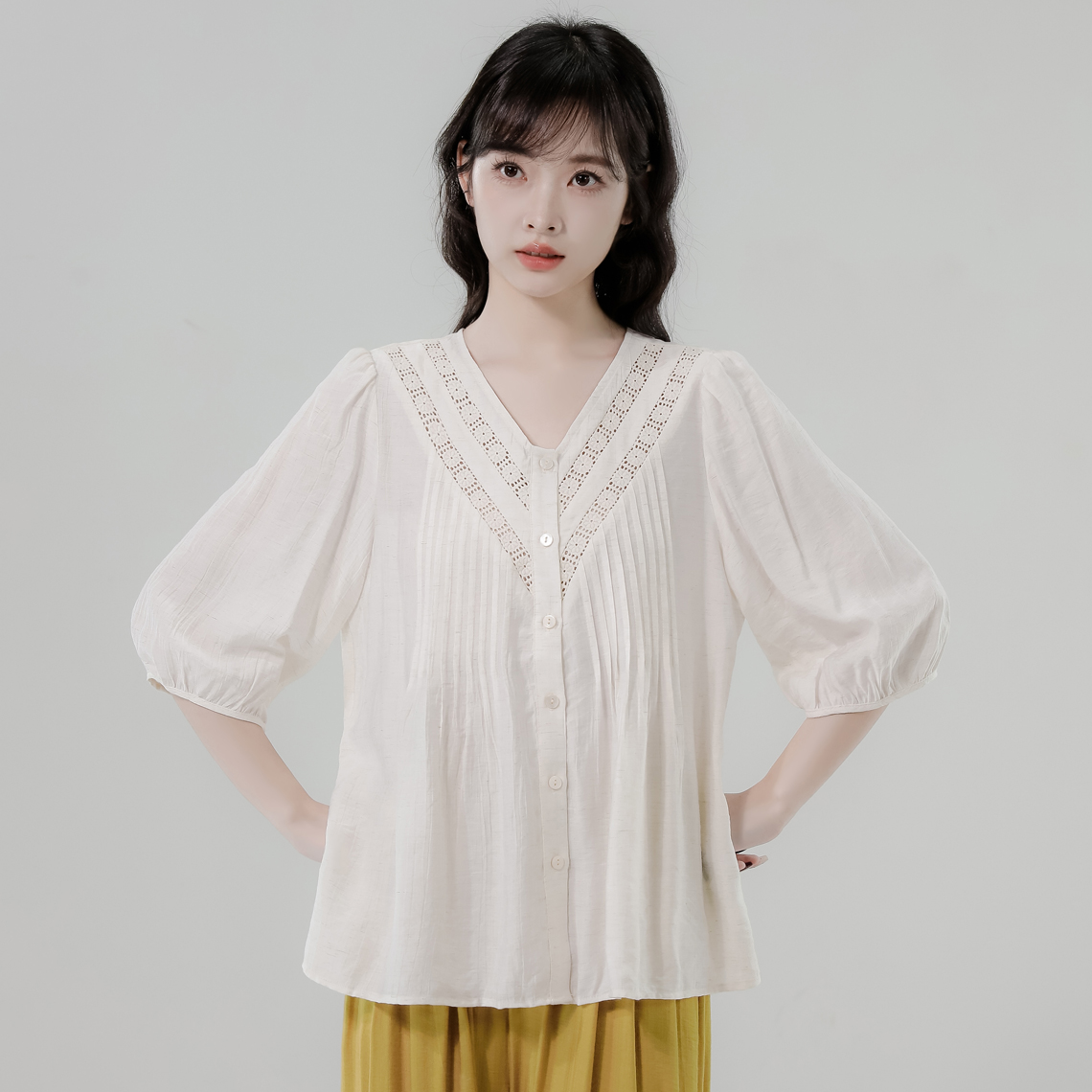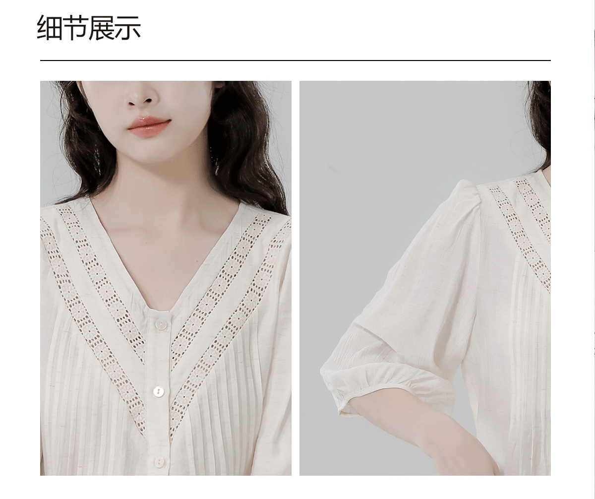 RY2496# 白色娃娃衫上衣女2026夏季新款含亚麻小衫淡人轻薄款v领衬衫