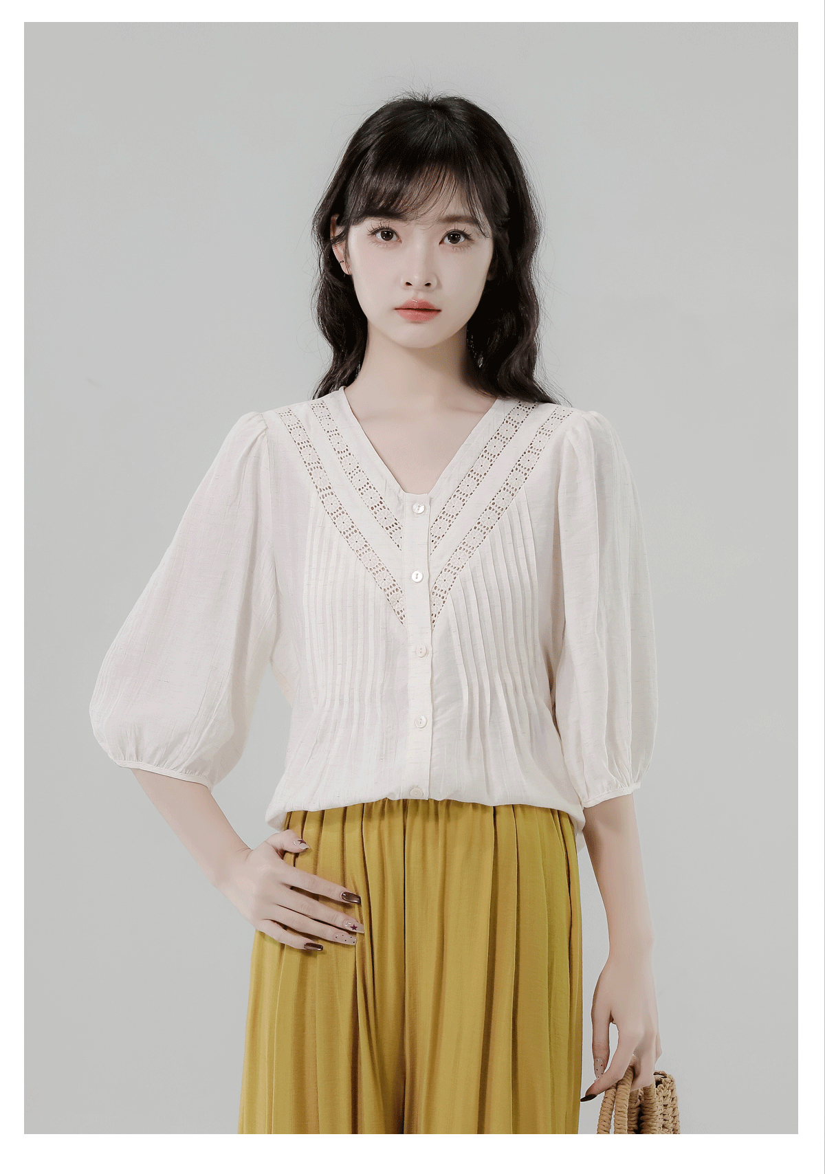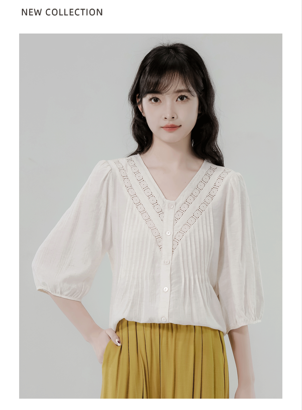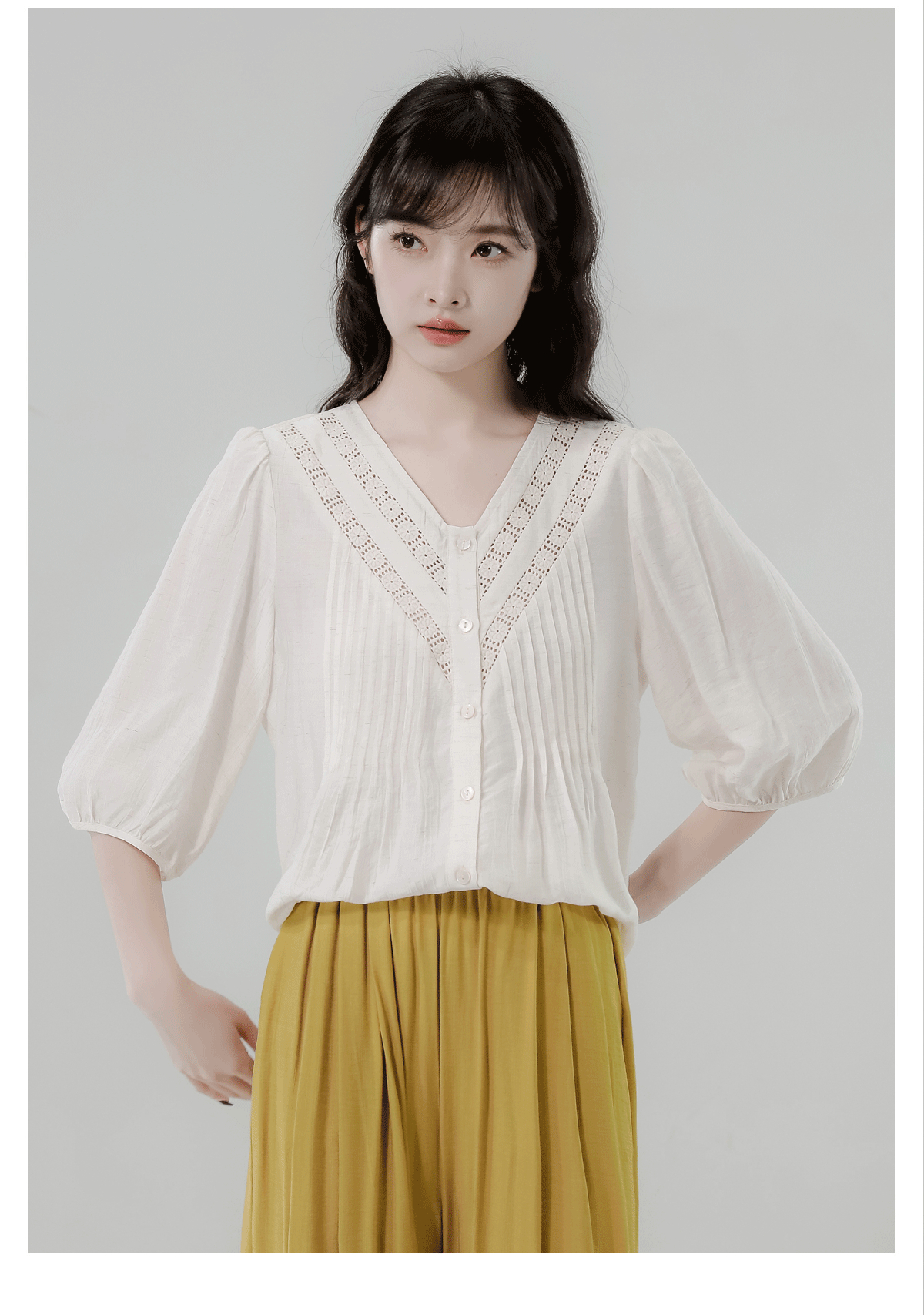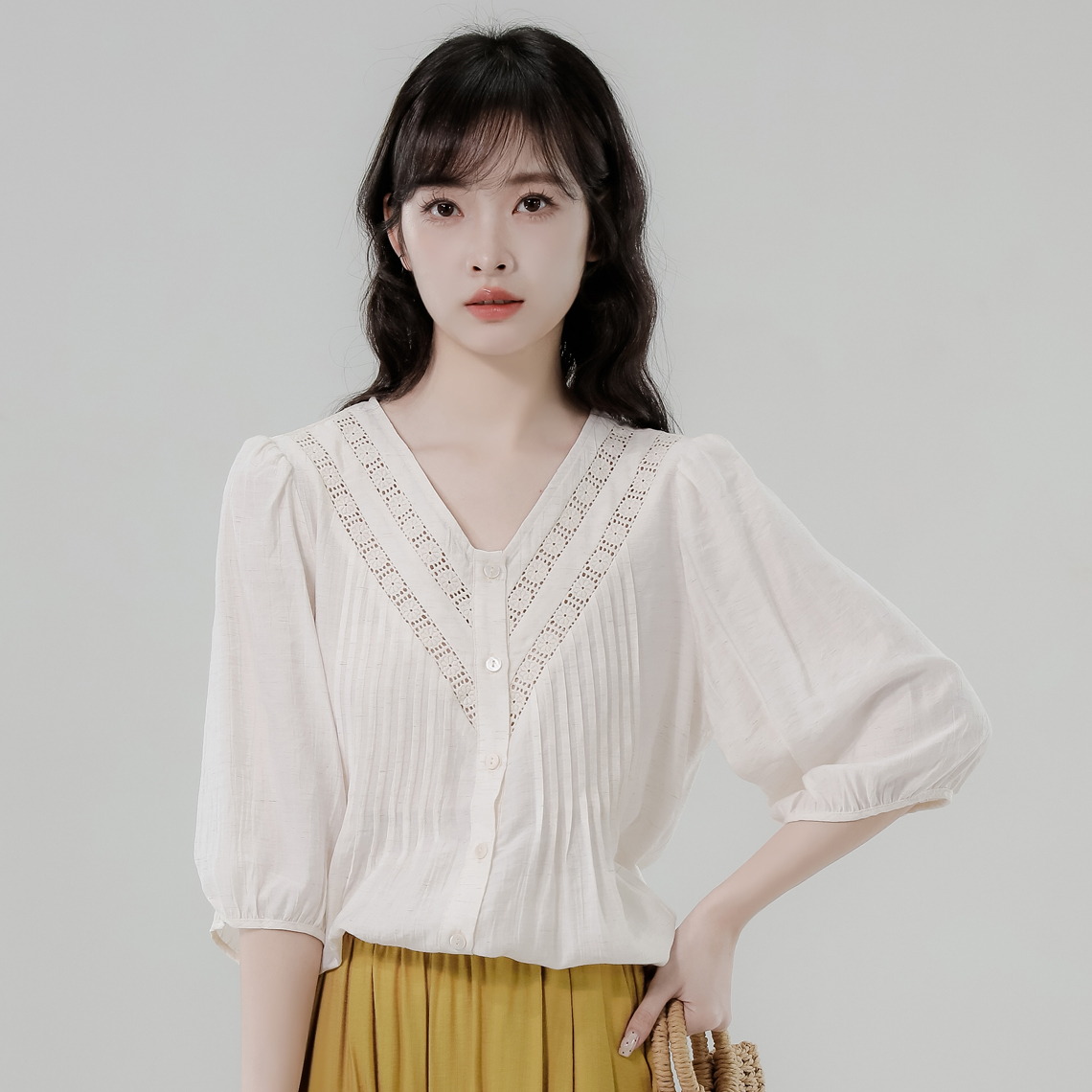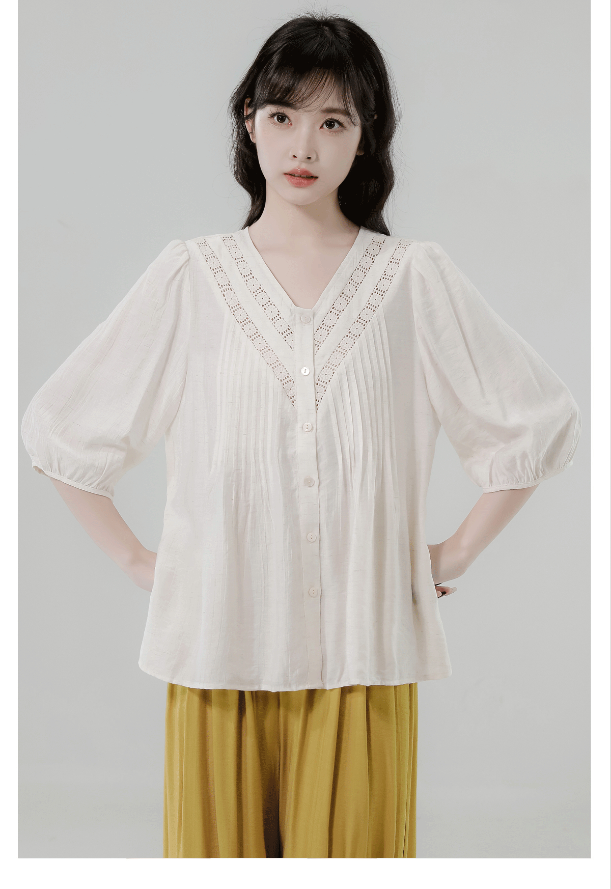 RY2496# 白色娃娃衫上衣女2026夏季新款含亚麻小衫淡人轻薄款v领衬衫