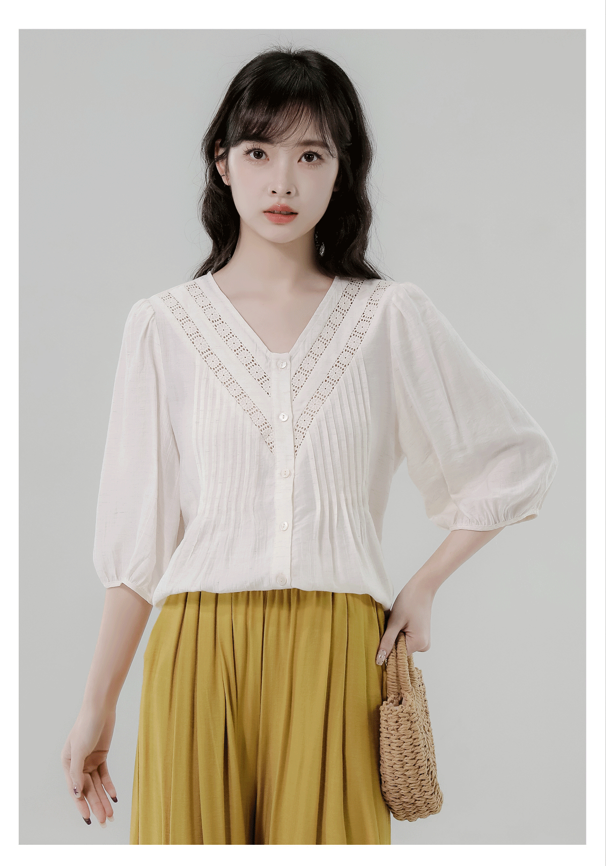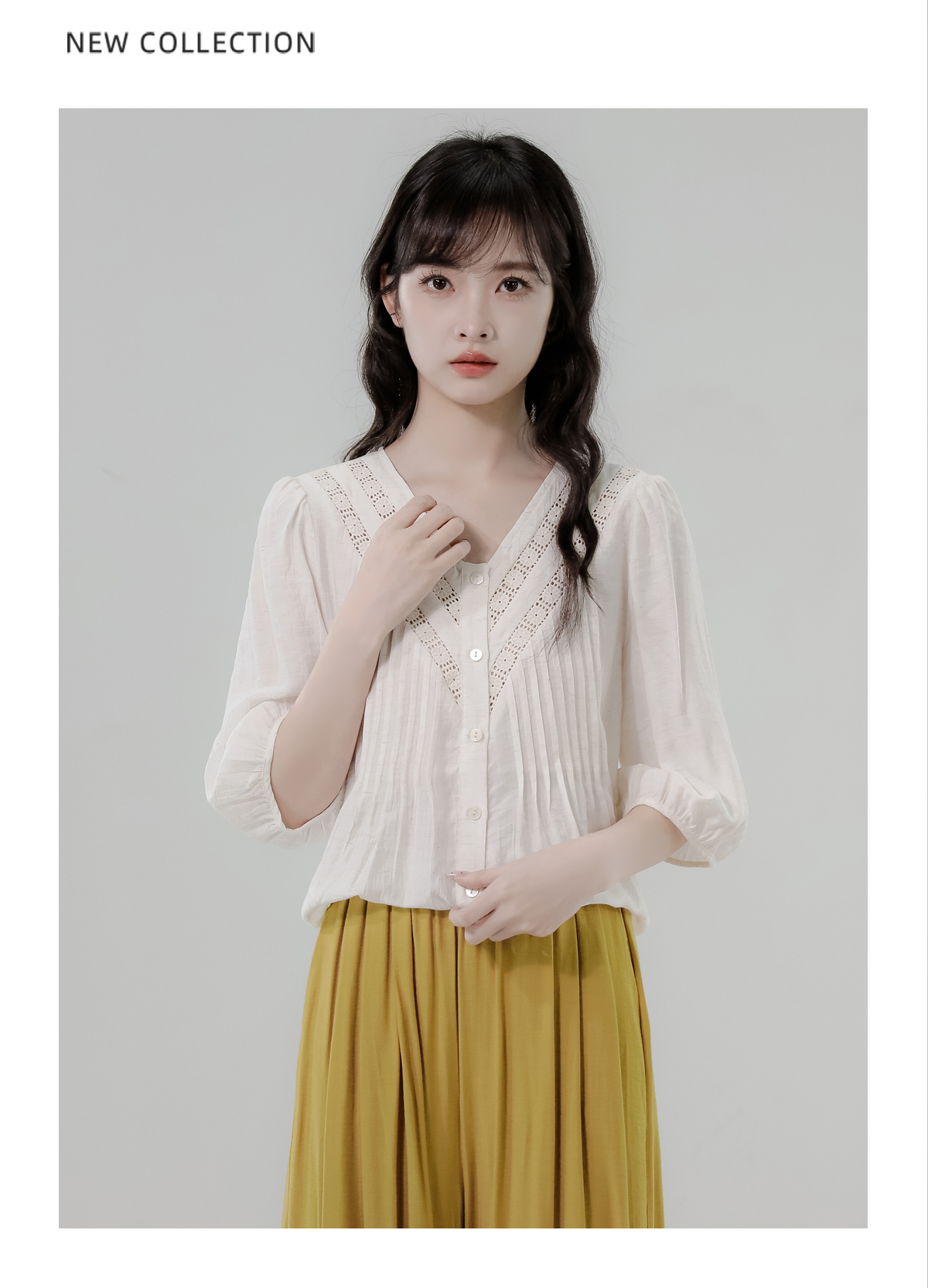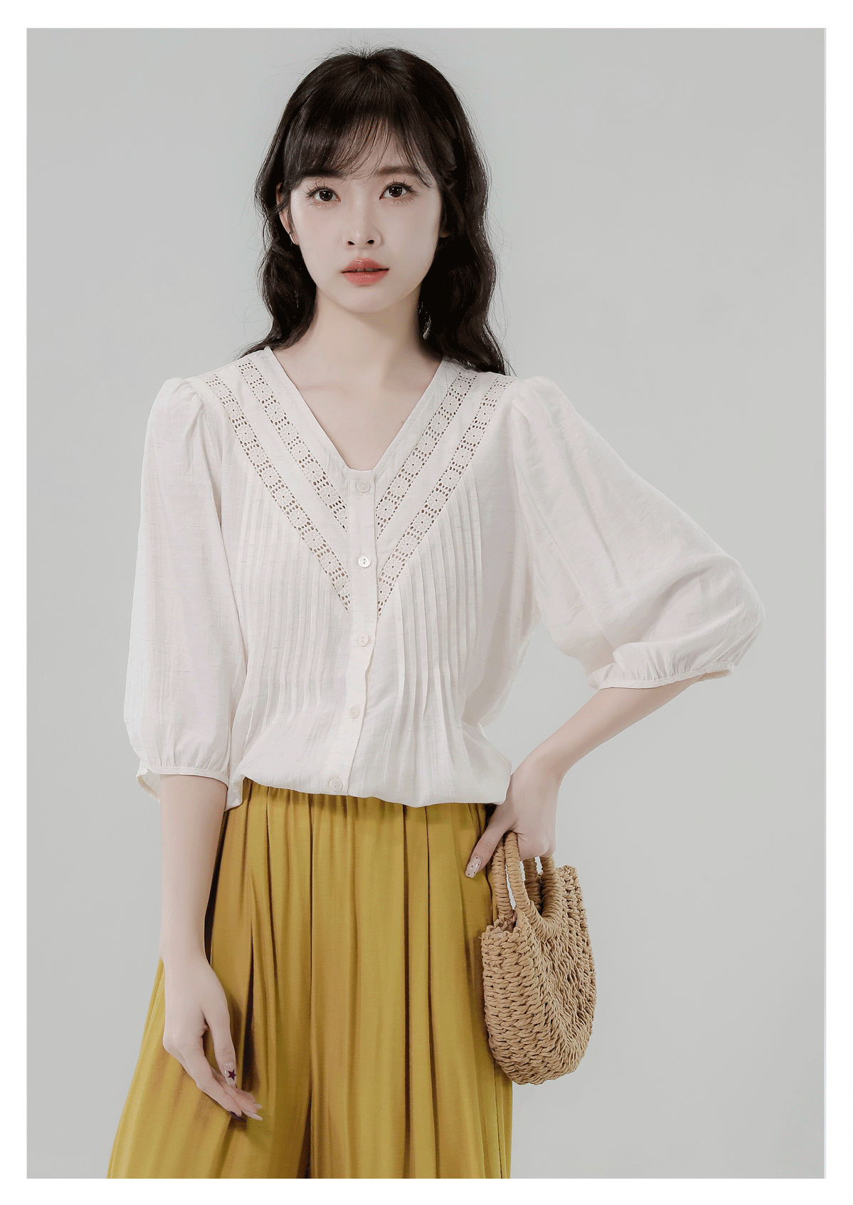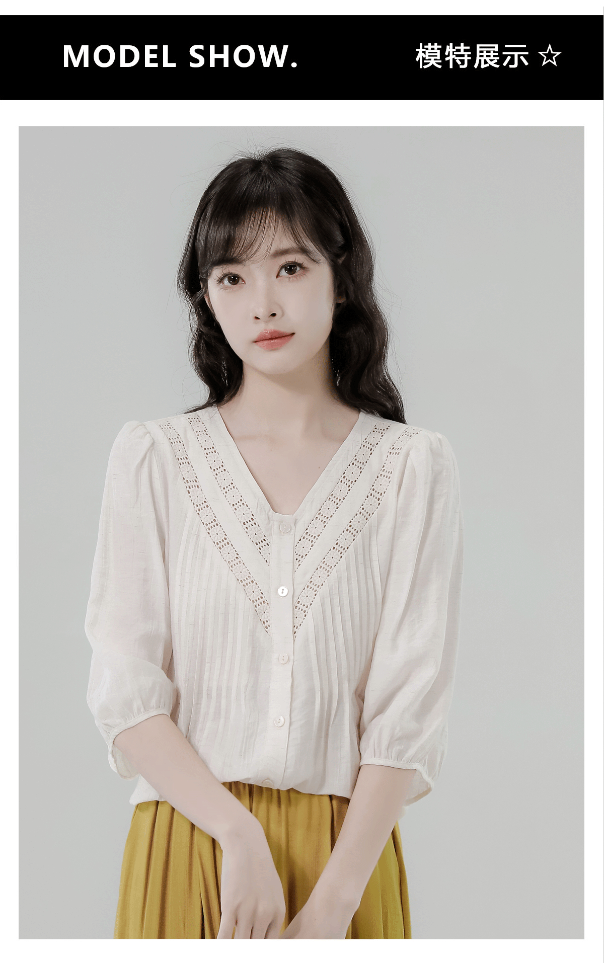 RY2496# 白色娃娃衫上衣女2026夏季新款含亚麻小衫淡人轻薄款v领衬衫