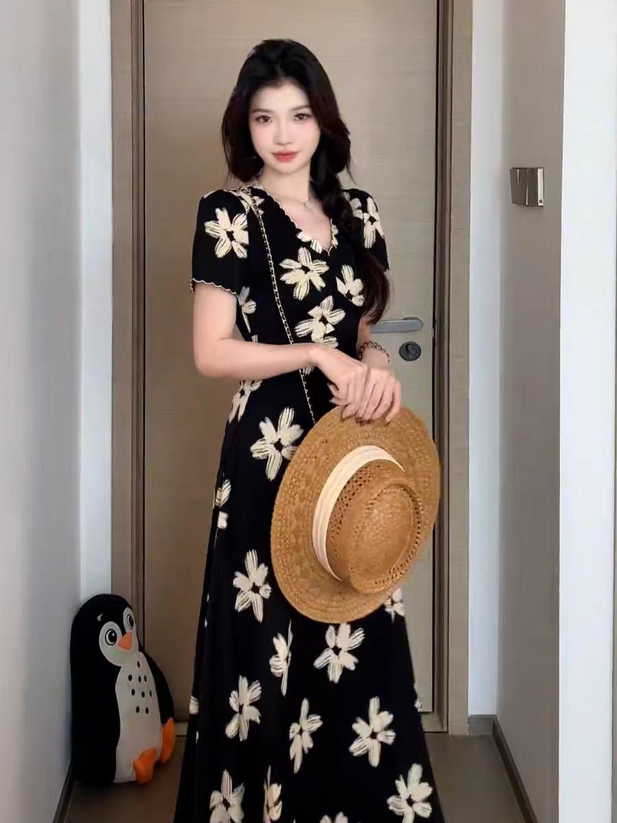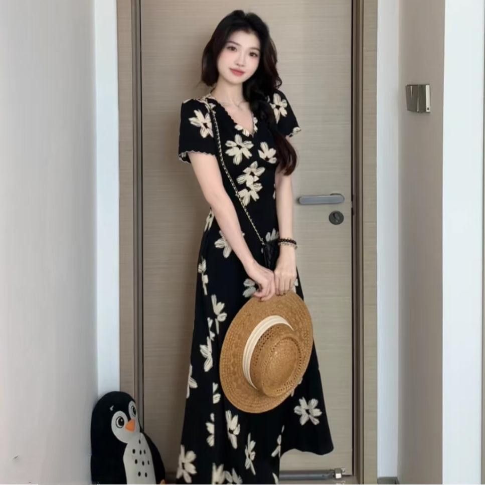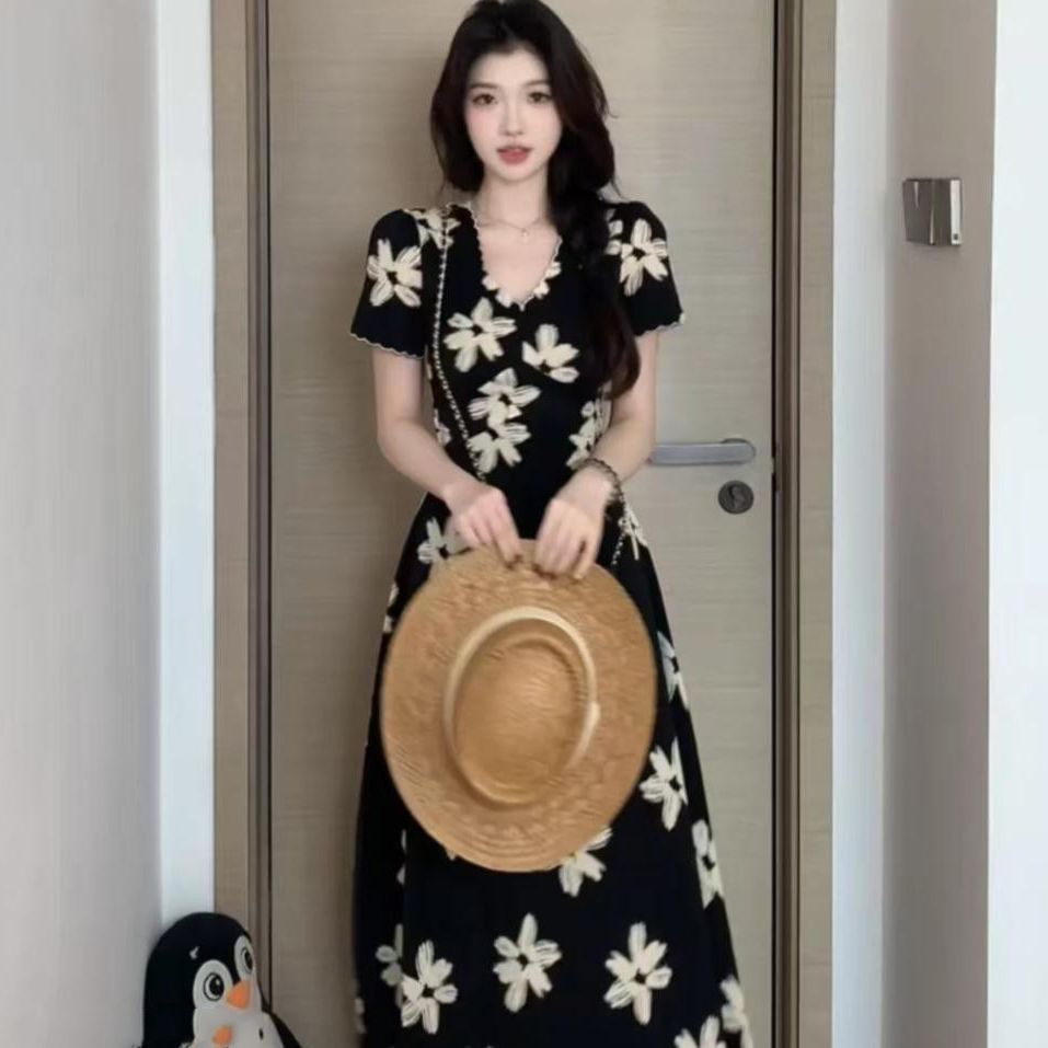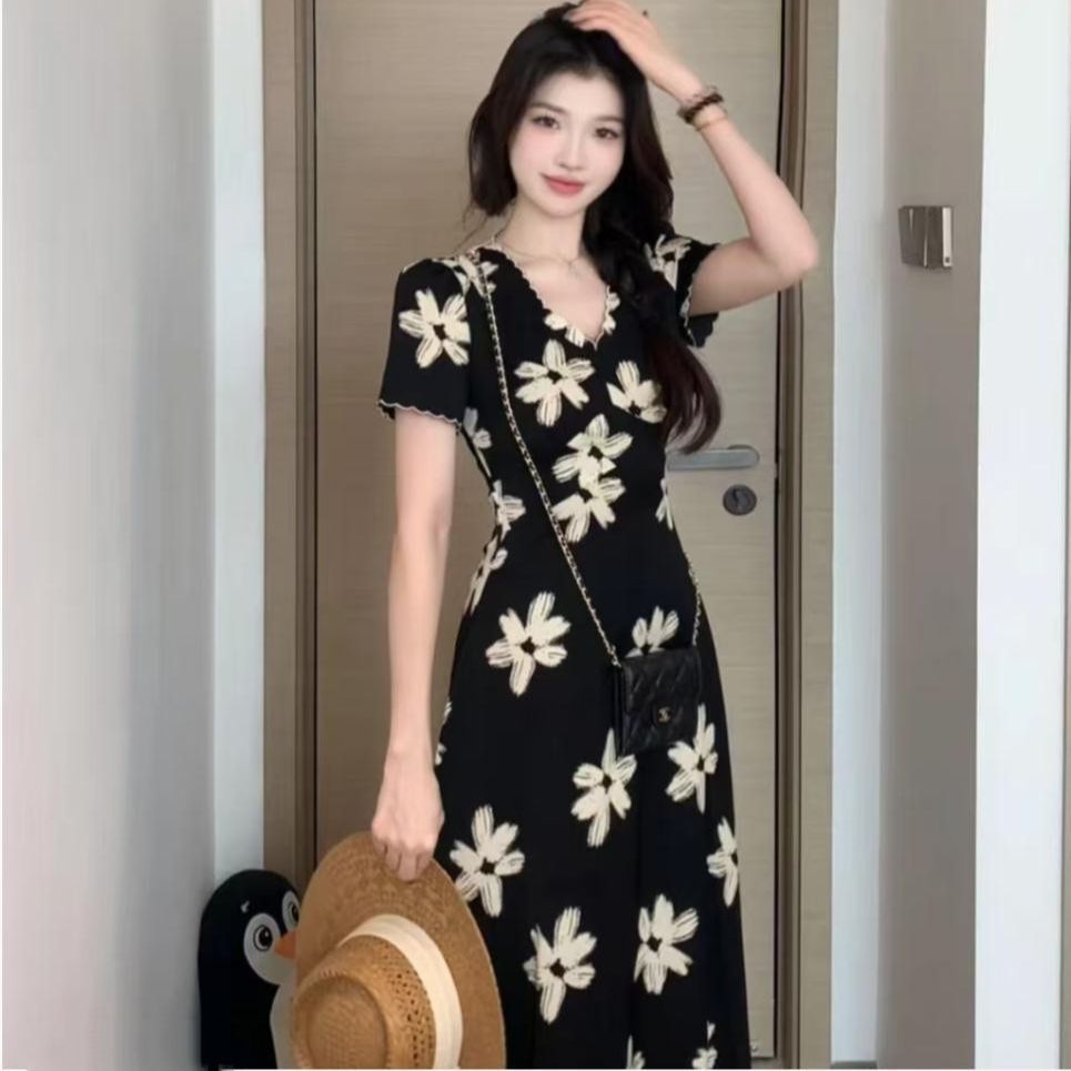 RY2509# 法式气质时尚气质V领收腰显瘦碎花连衣裙2026新款复古优雅潮