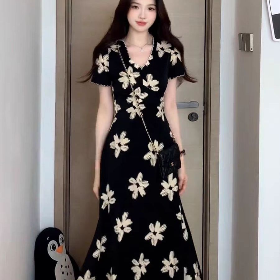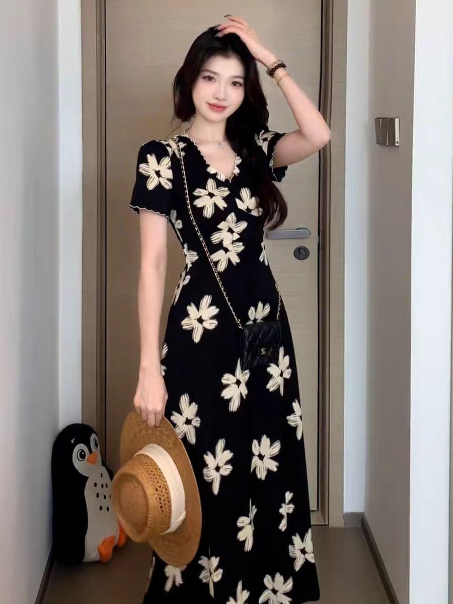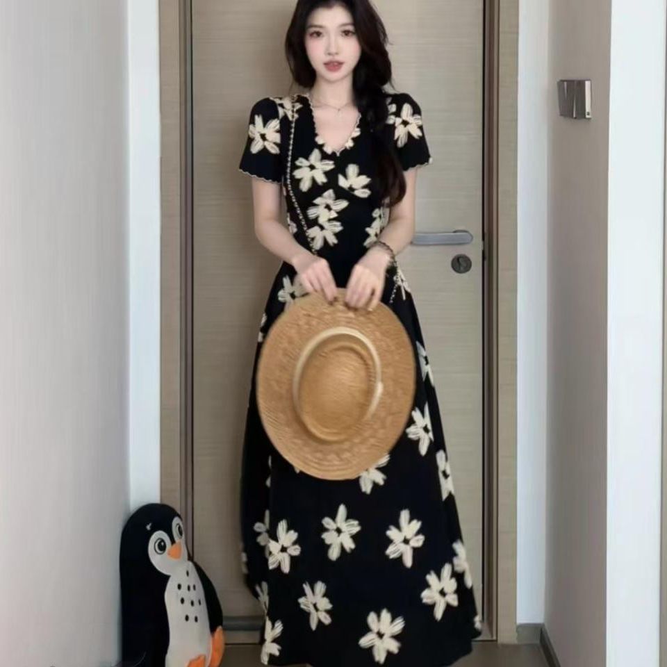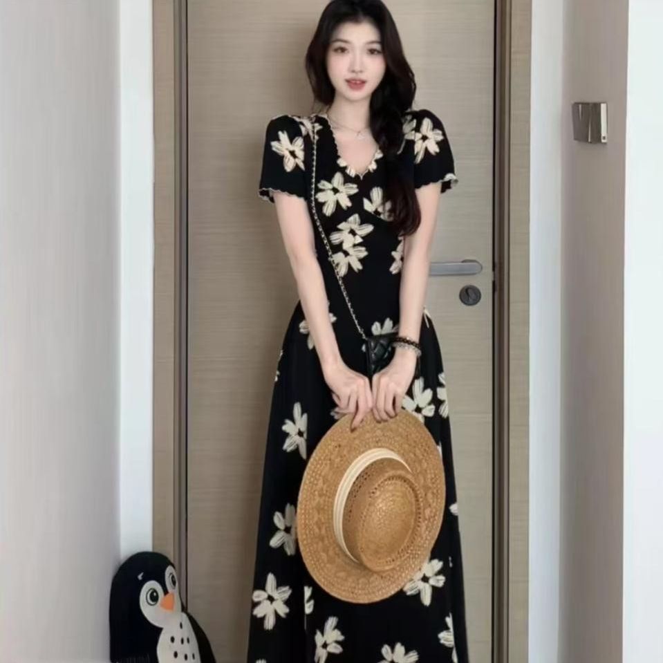RY2509# 法式气质时尚气质V领收腰显瘦碎花连衣裙2026新款复古优雅潮