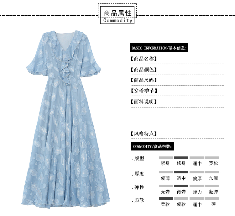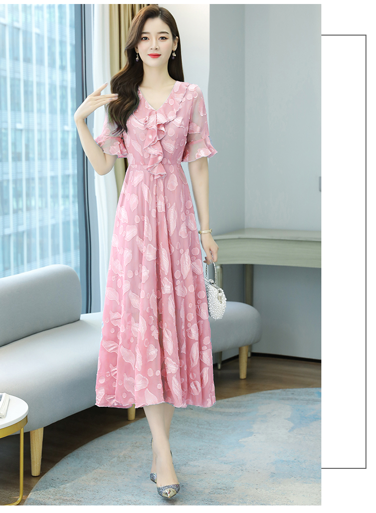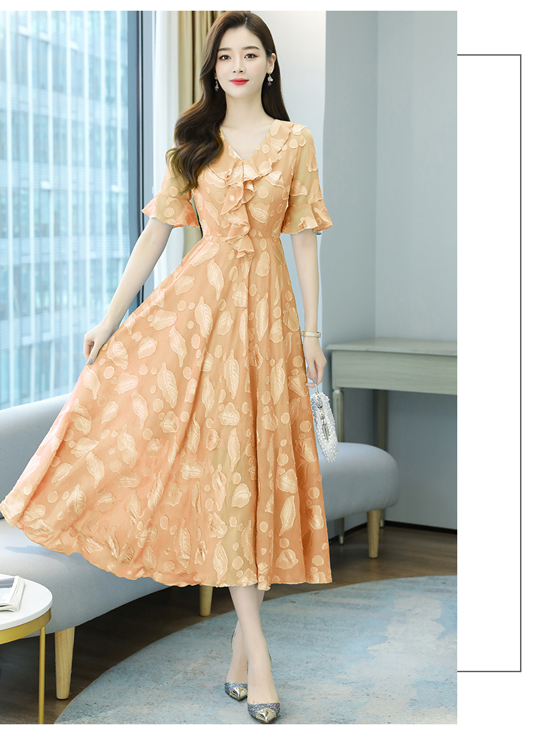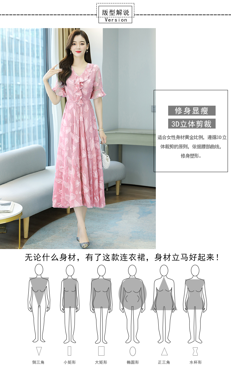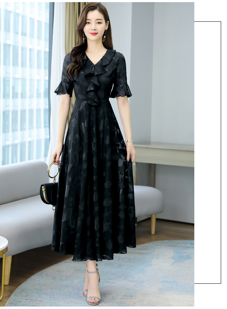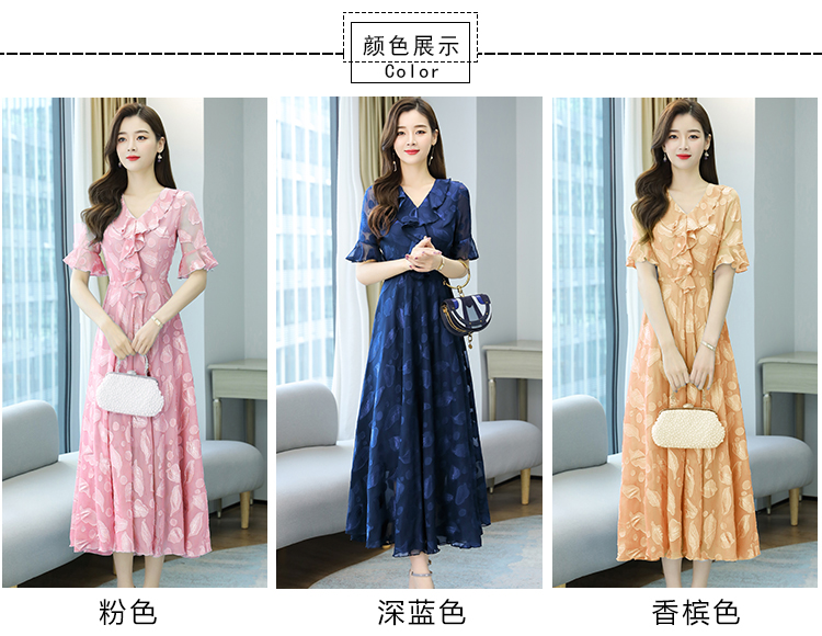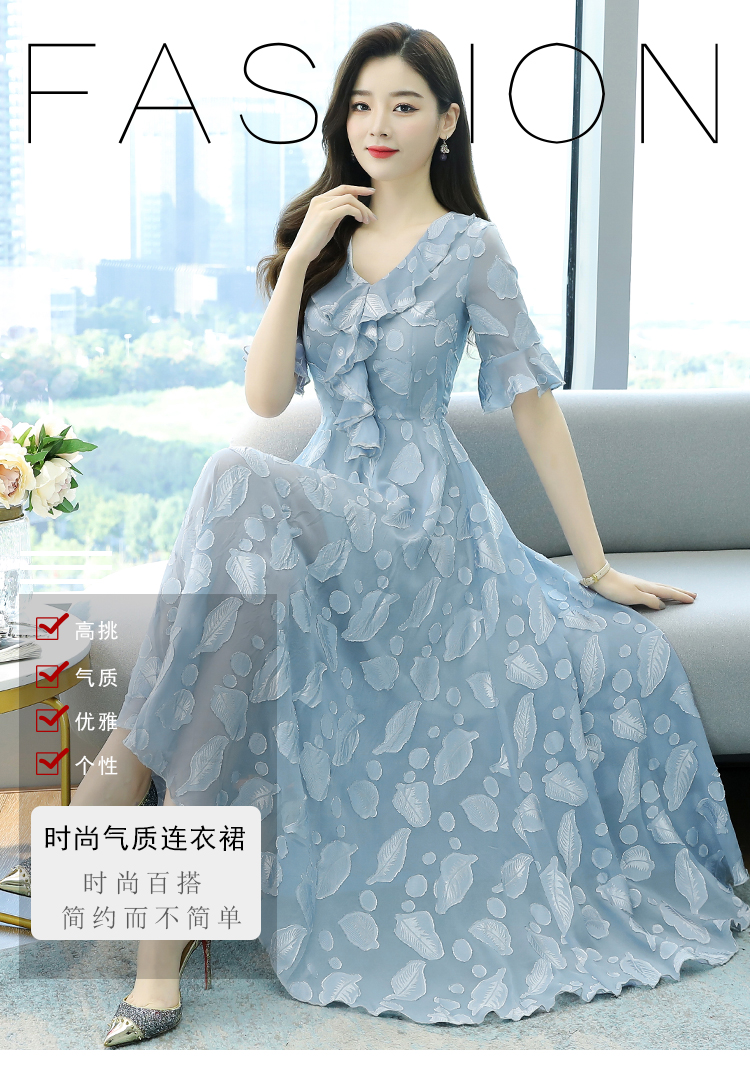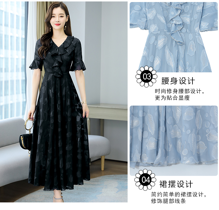 RY2521# 实拍2026夏新款修身七分袖提花雪纺连衣裙气质大摆长裙女