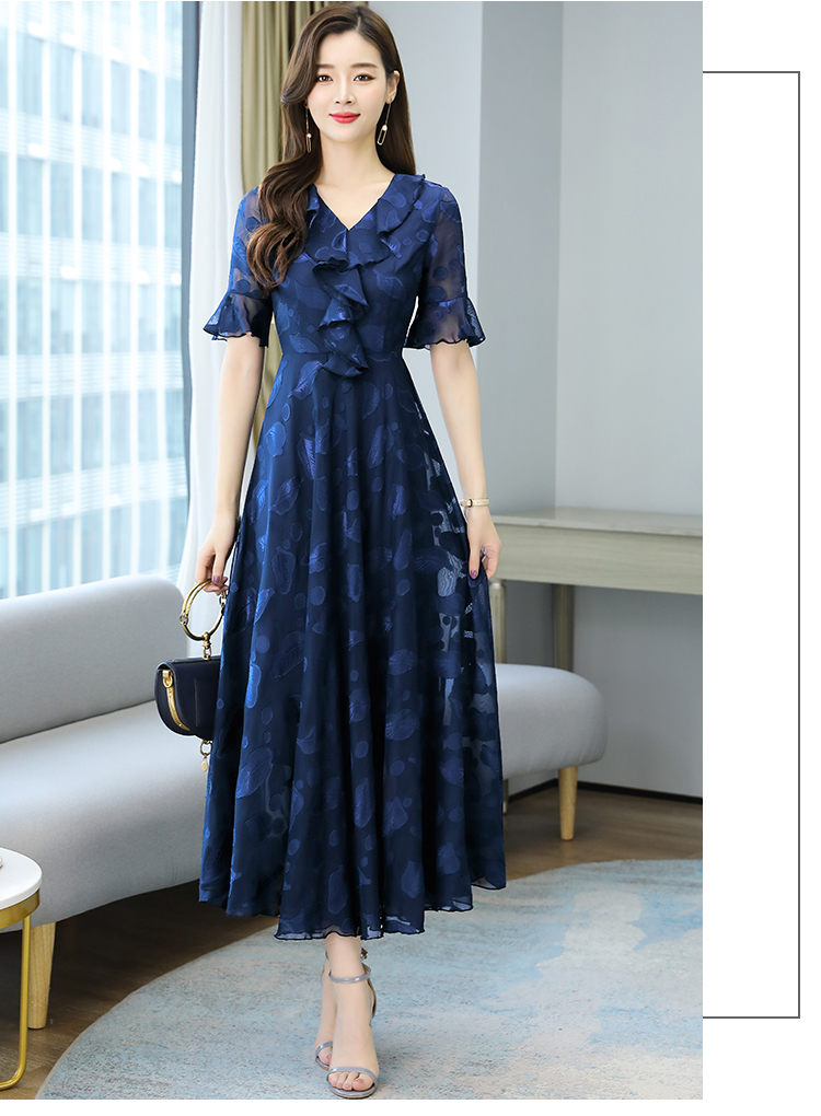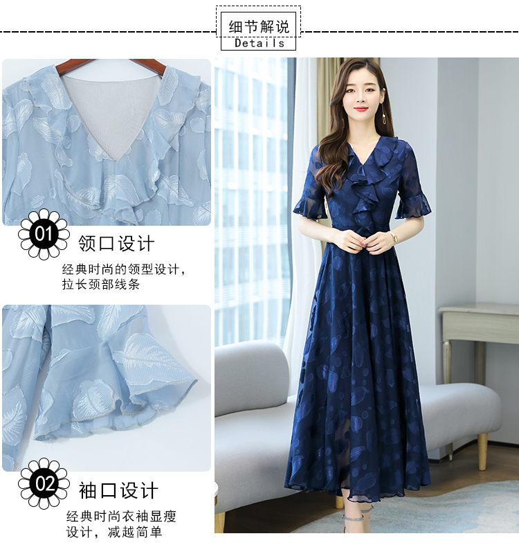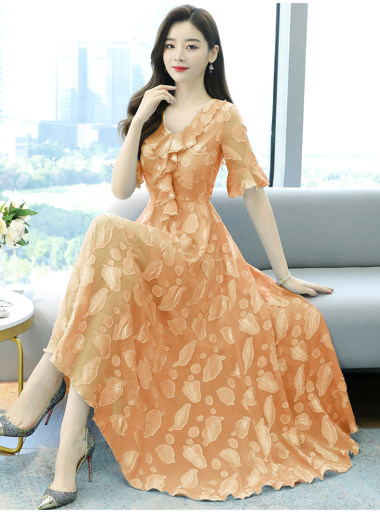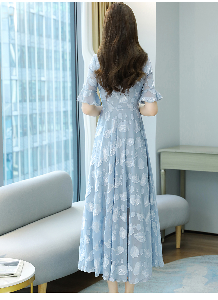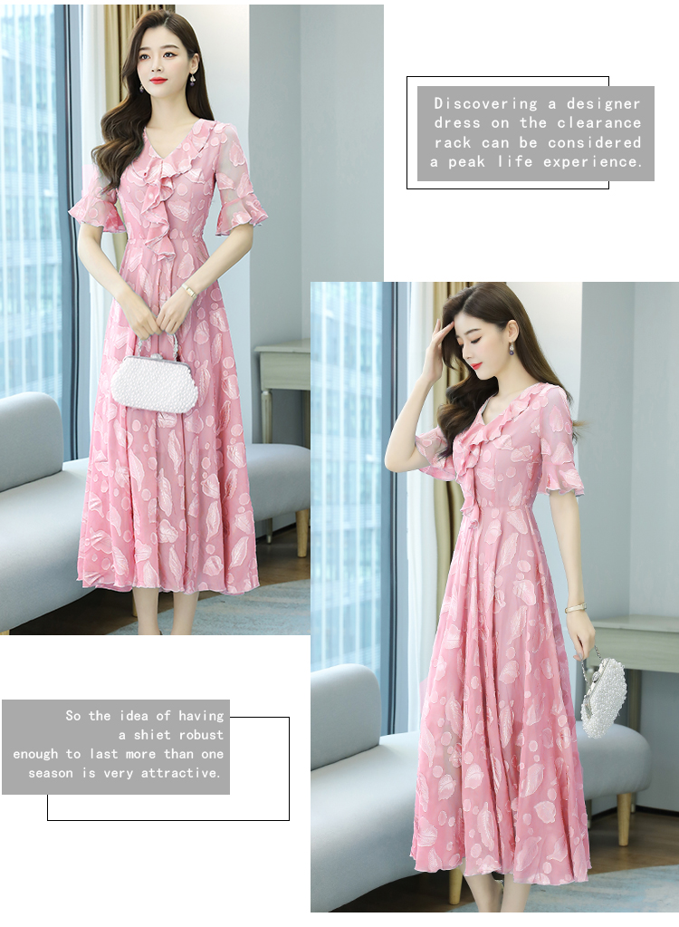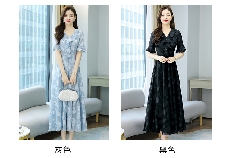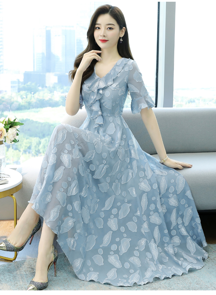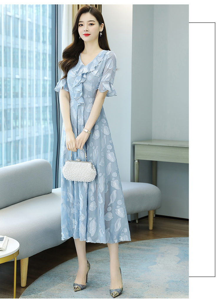 RY2521# 实拍2026夏新款修身七分袖提花雪纺连衣裙气质大摆长裙女