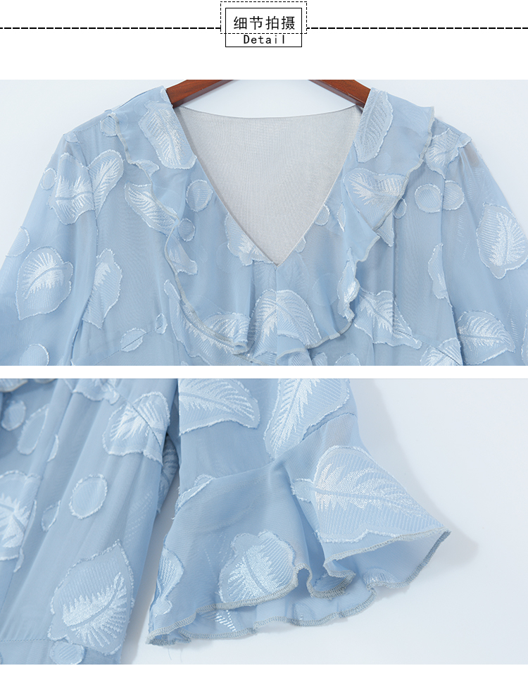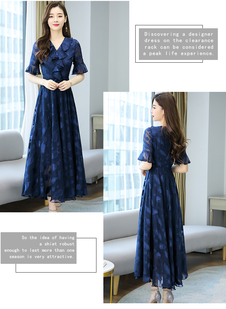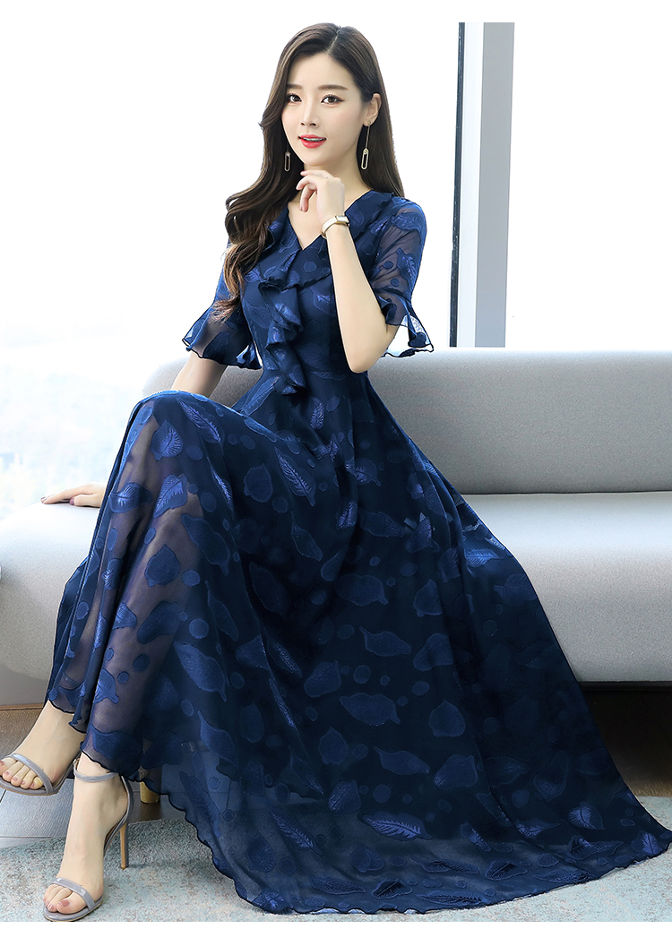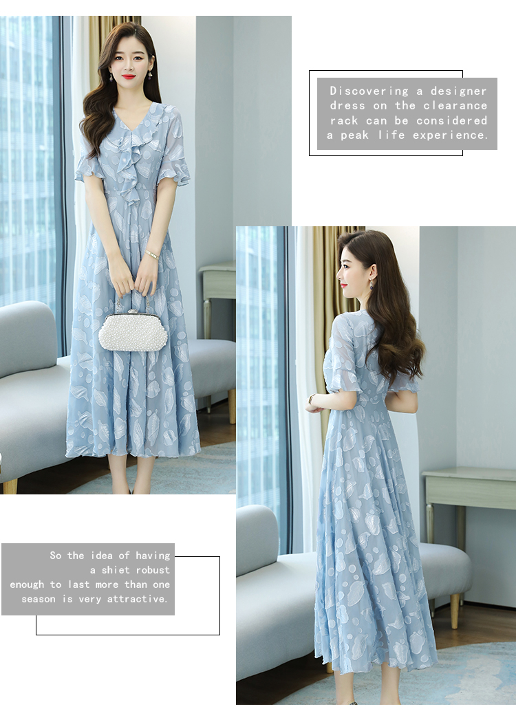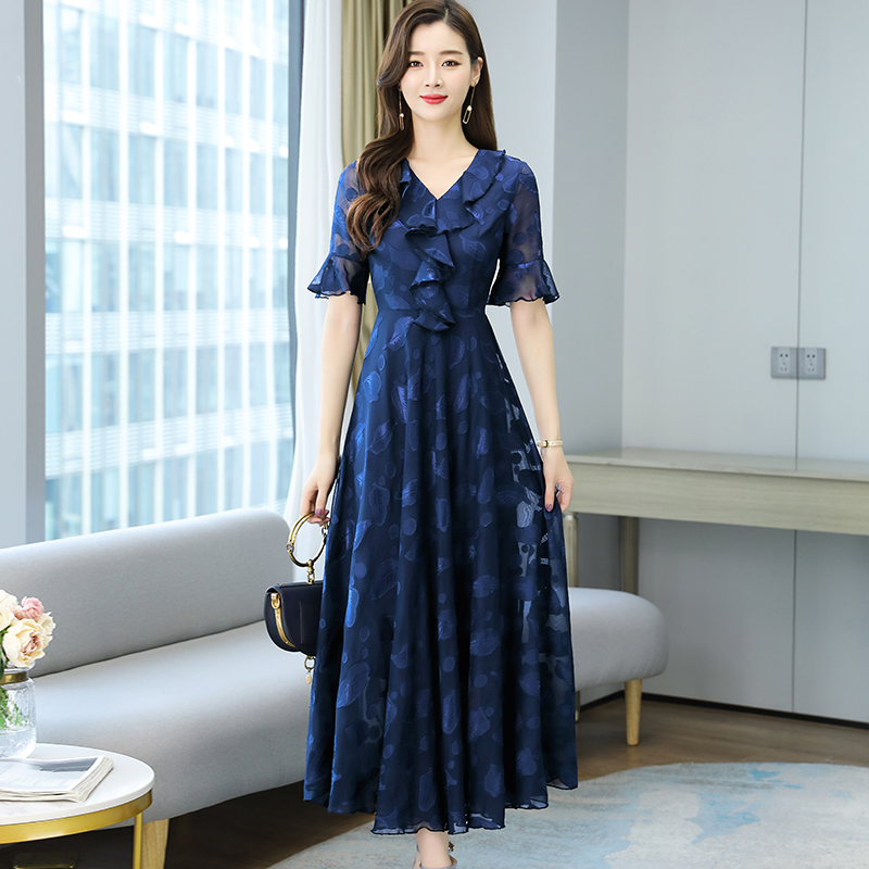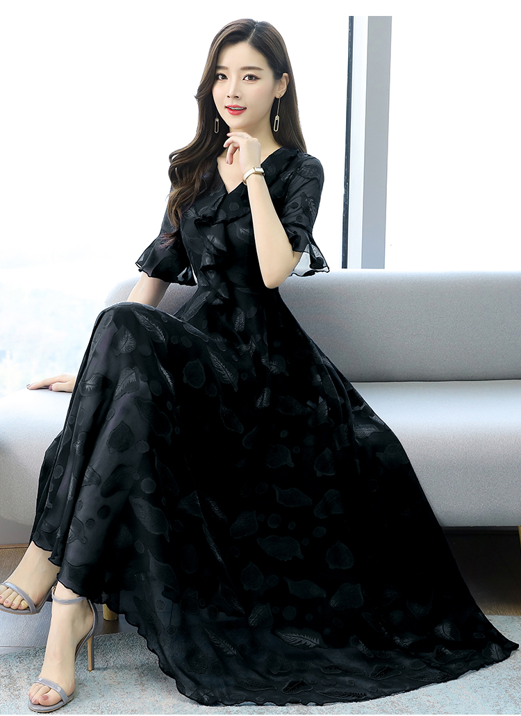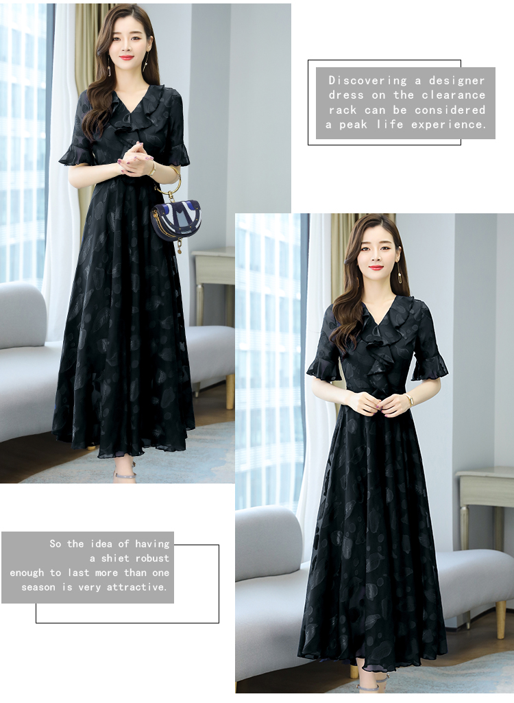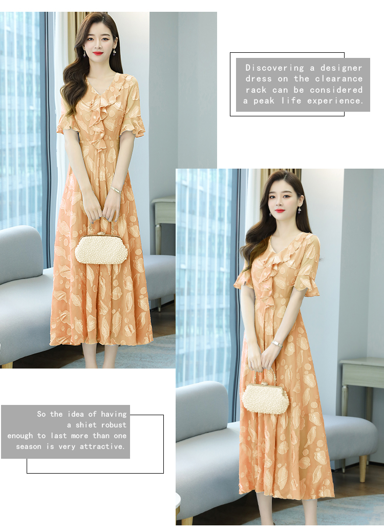 RY2521# 实拍2026夏新款修身七分袖提花雪纺连衣裙气质大摆长裙女