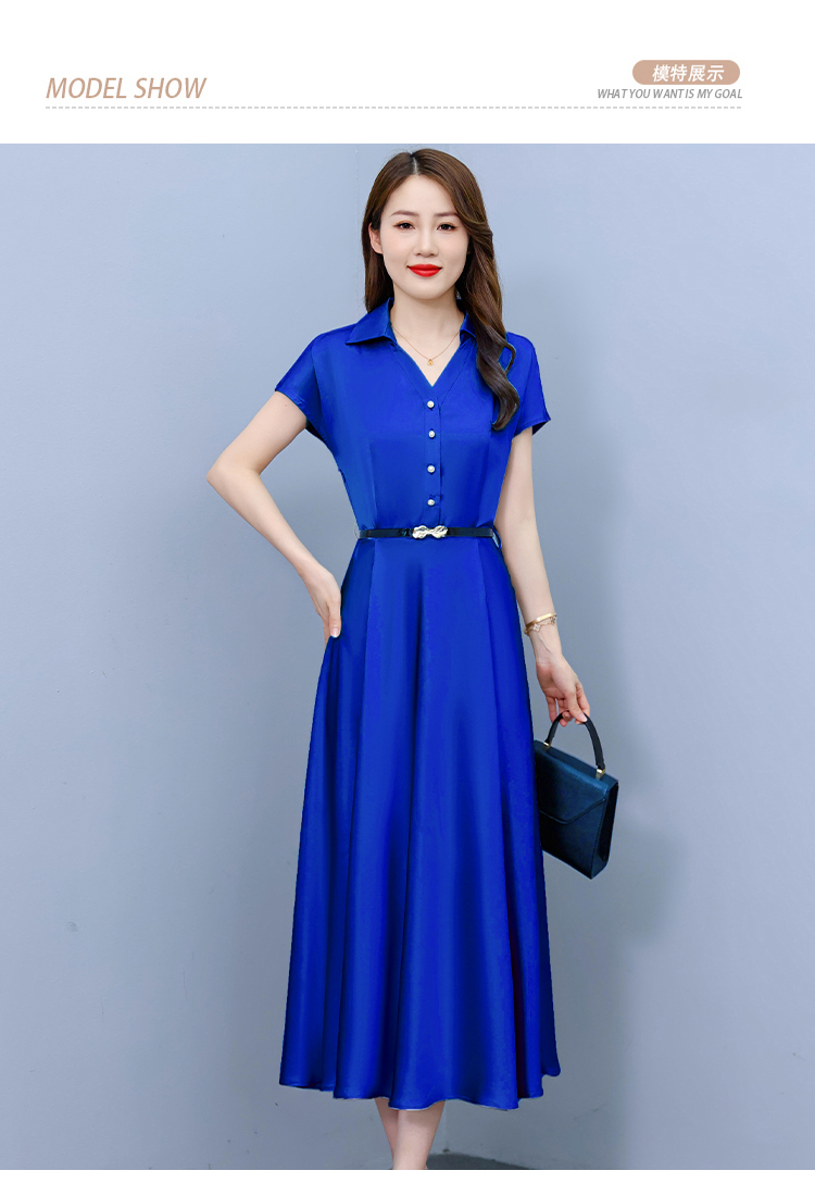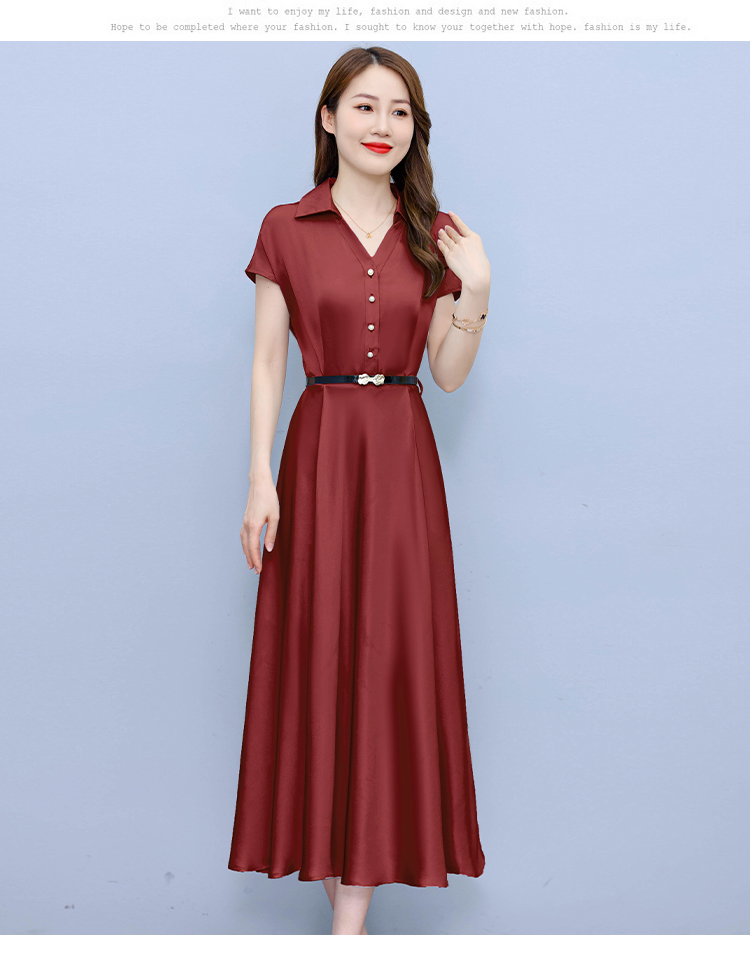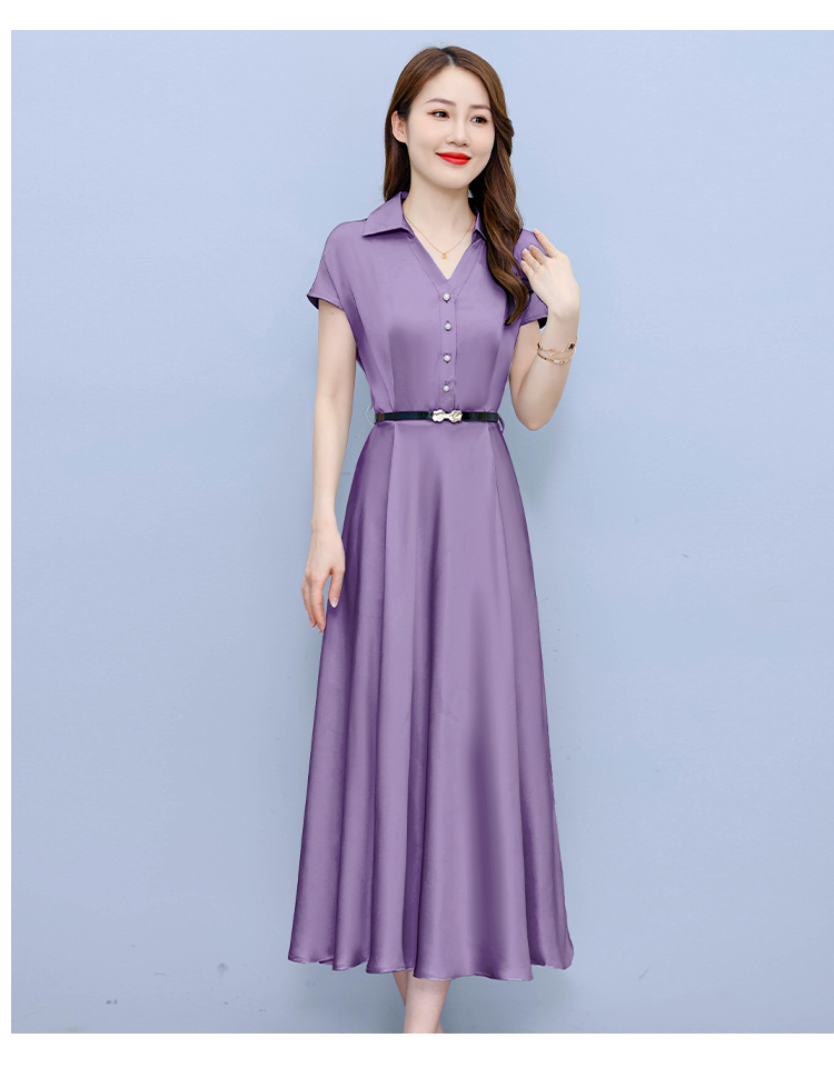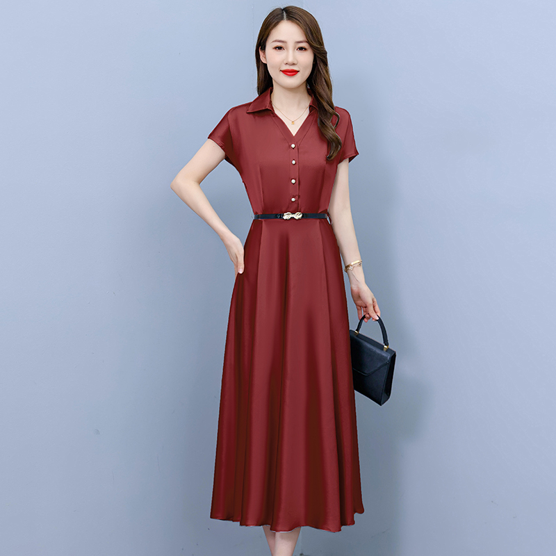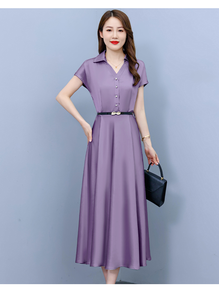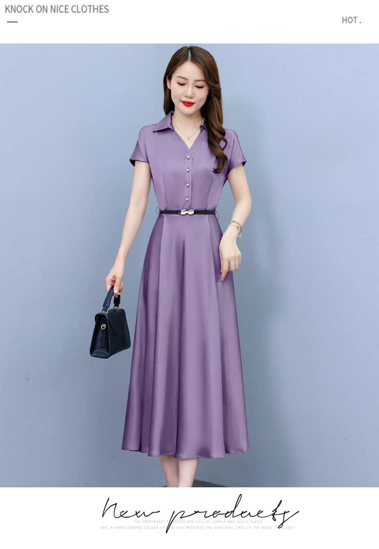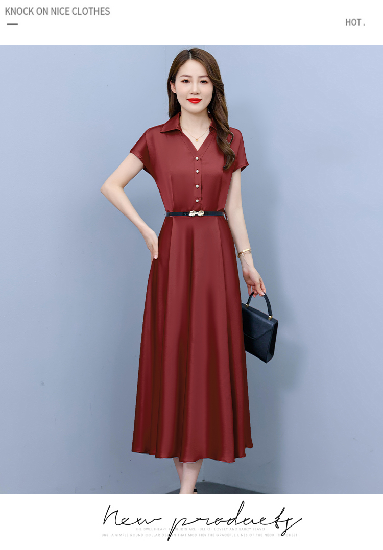 RY2524# 实拍醋酸缎面短袖连衣裙气质显瘦2026夏季洋气遮肚纯色女装